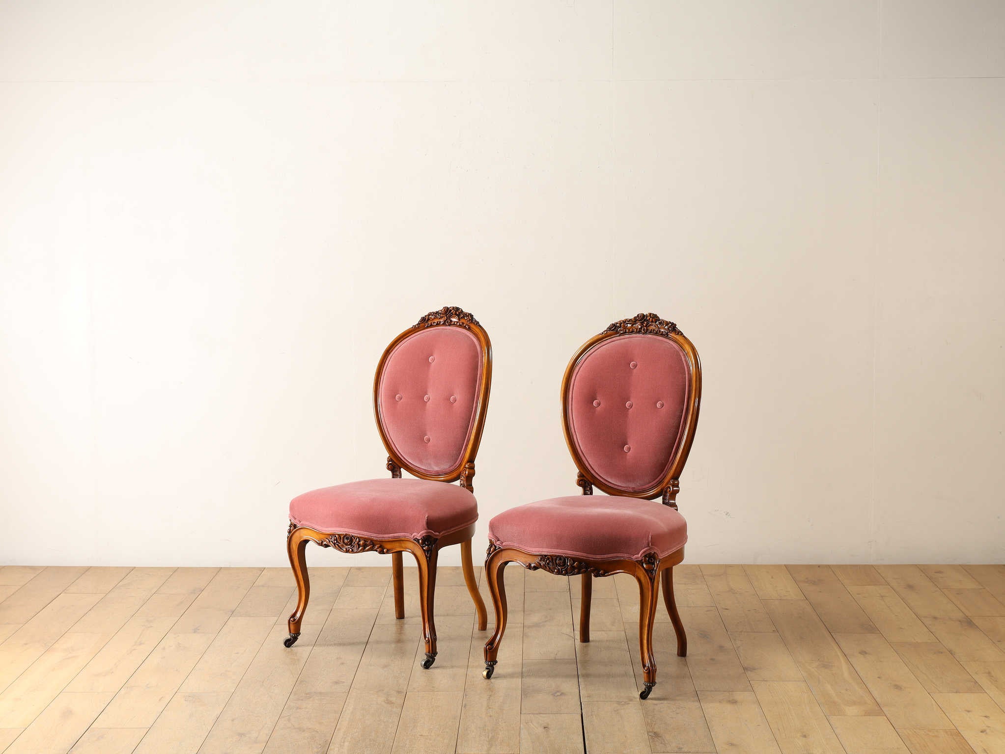 ボタン留めの優しいピンクの色合いはチェア全体に華やかな印象を与えています。