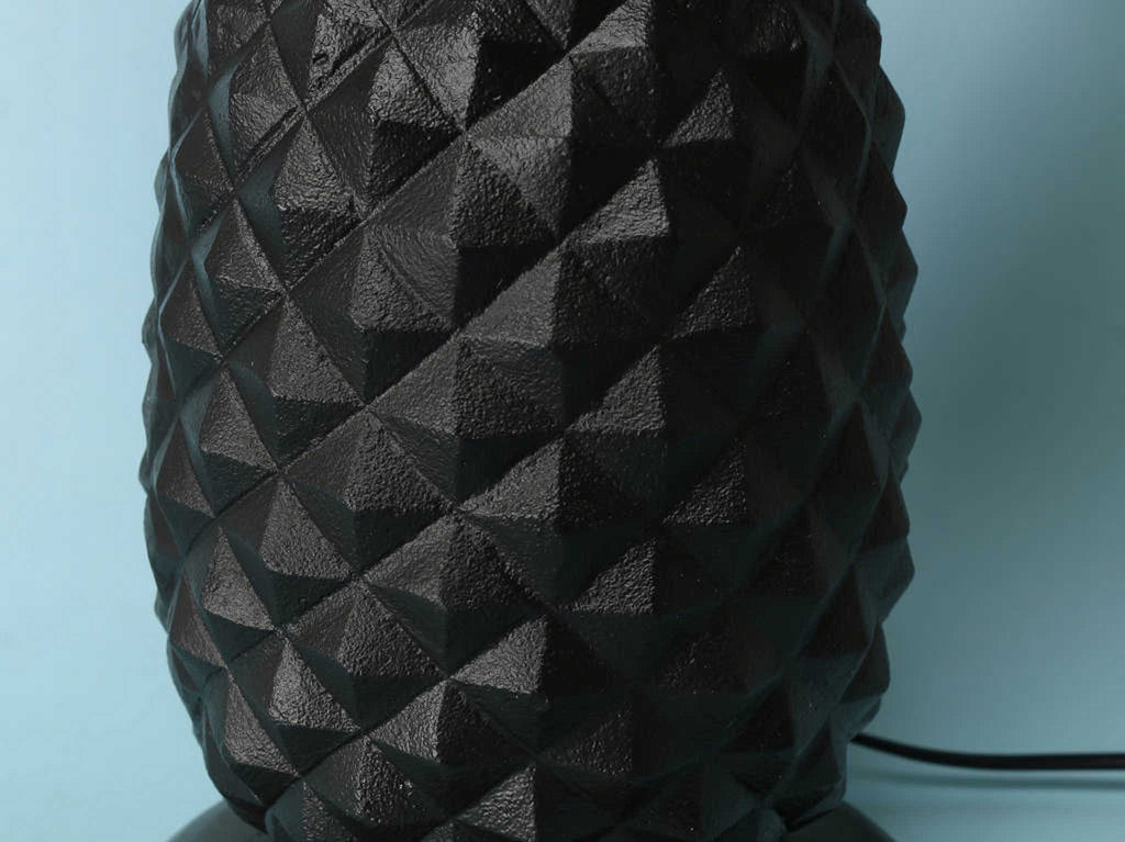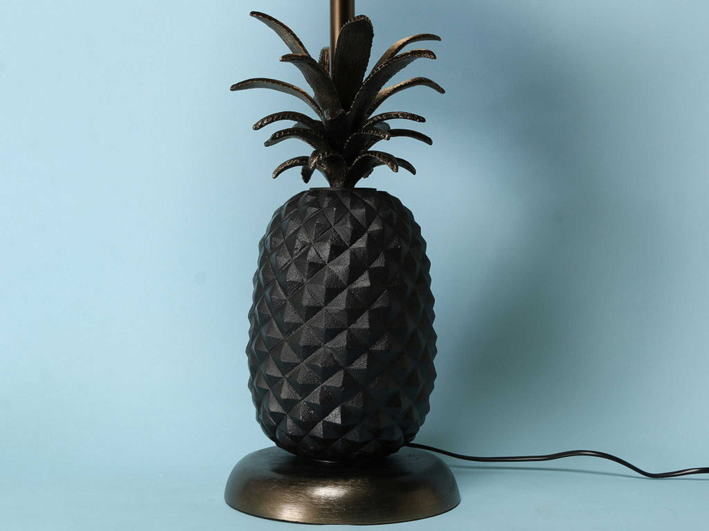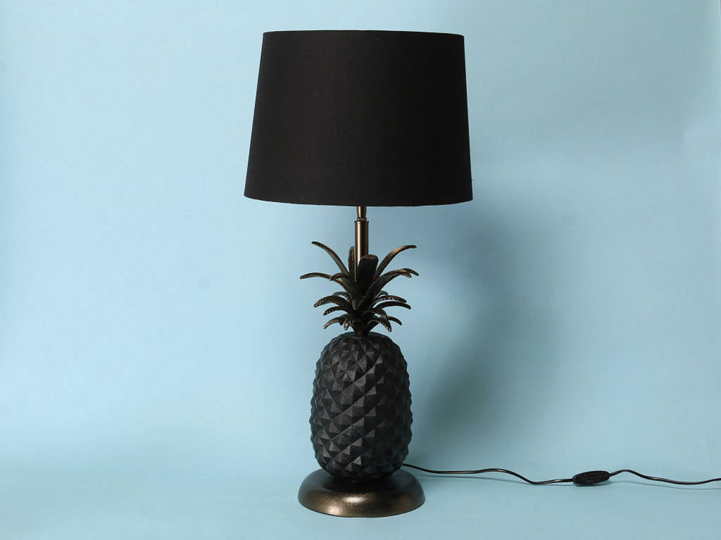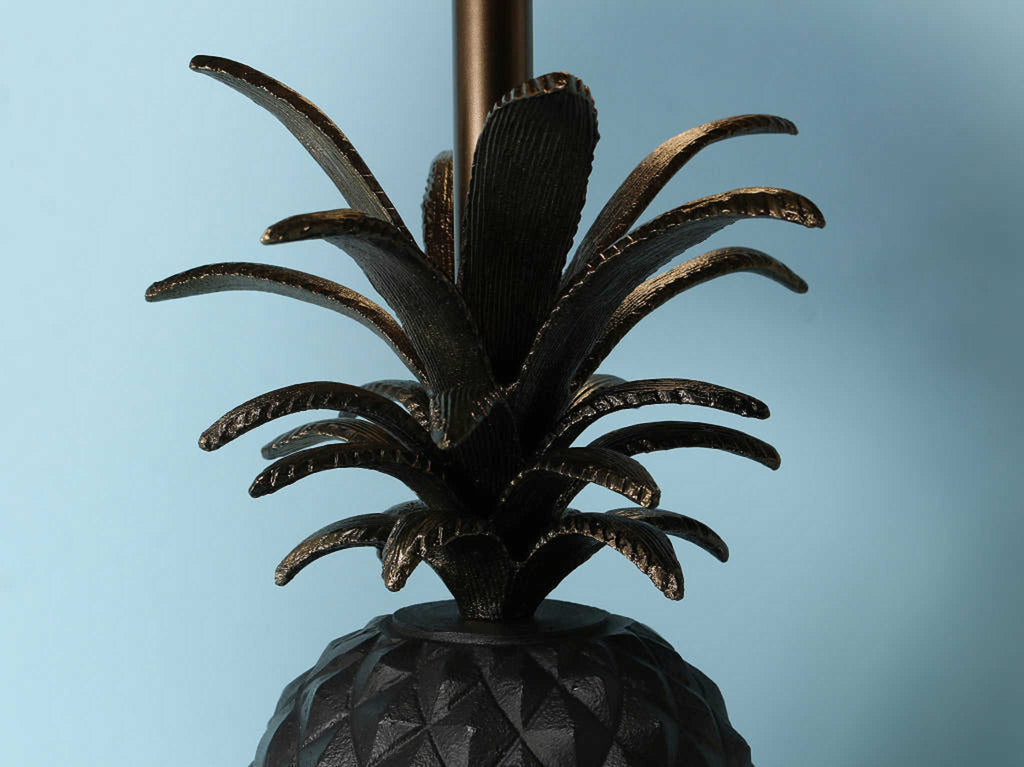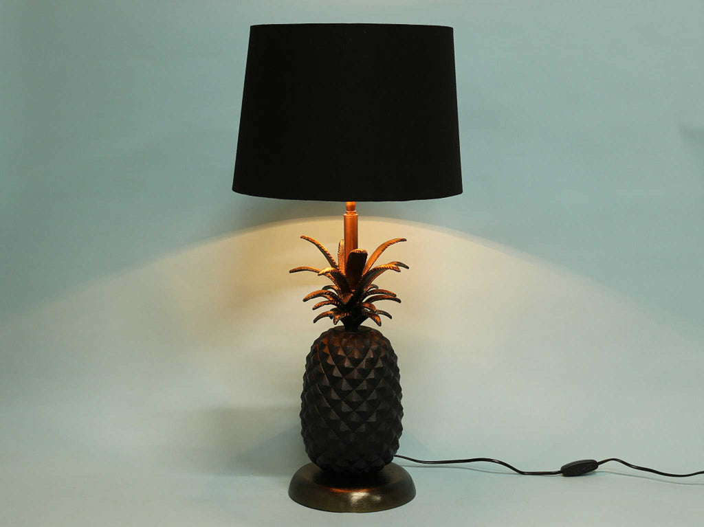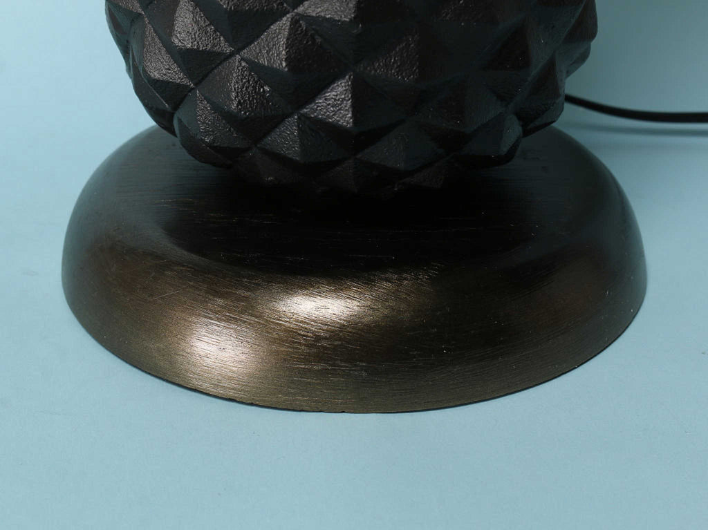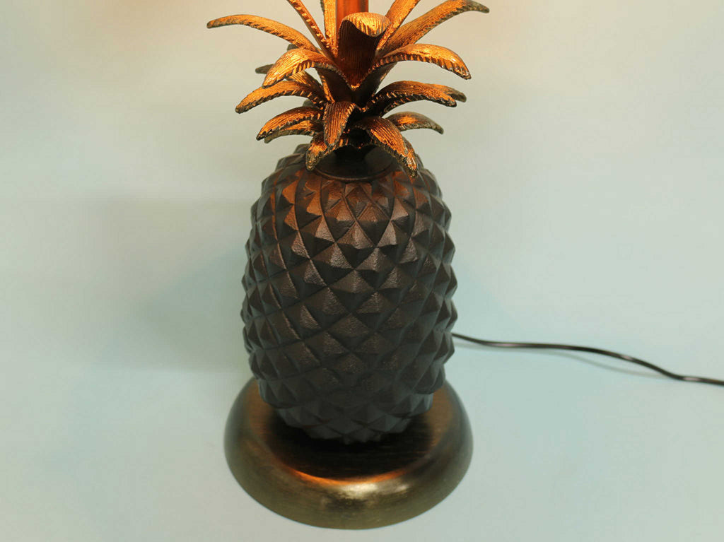 パイナップルの形に目を惹くパイナップルテーブルランプ。擦れたゴールド色と黒みあるベース部分が落ち着いた雰囲気をもち、光を灯していない状態でもインテリアを愉しめます。