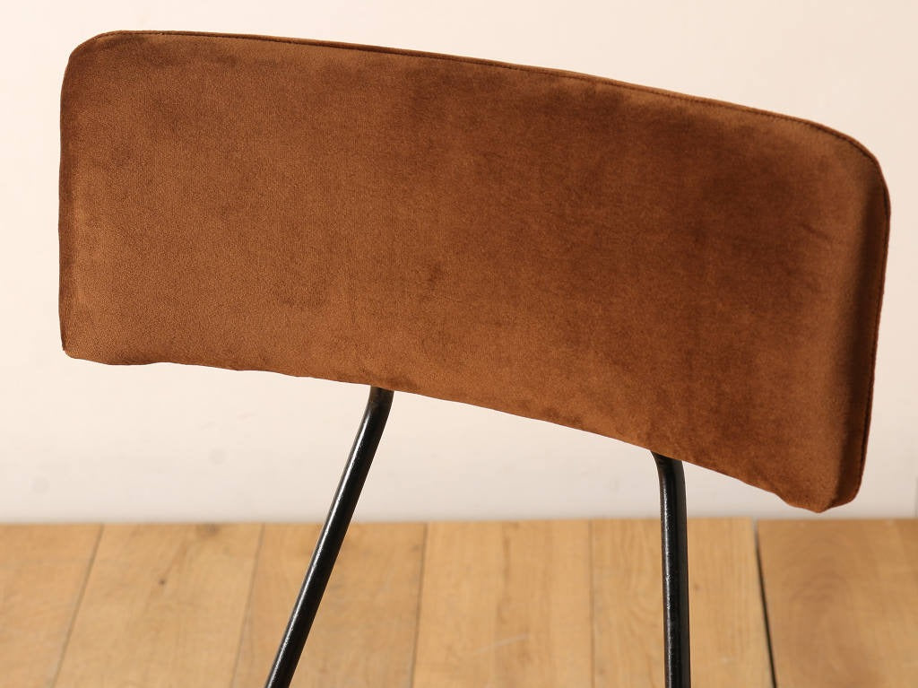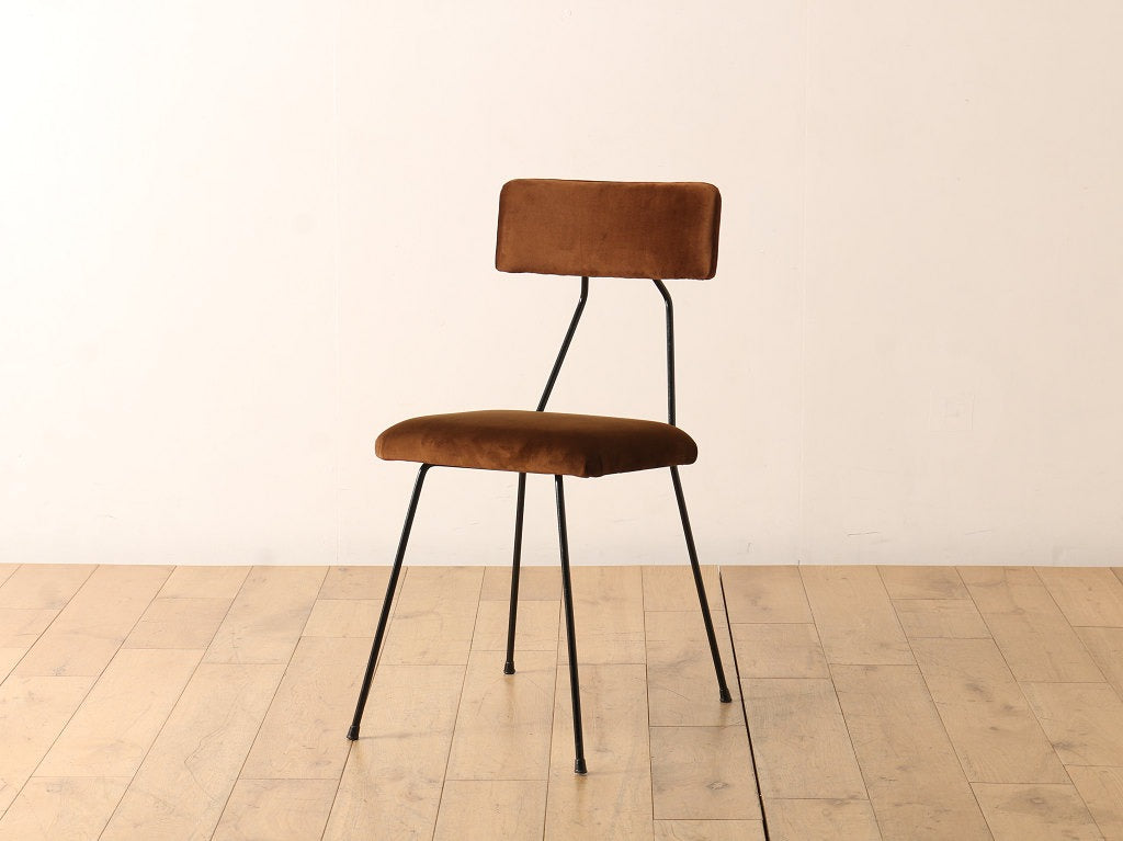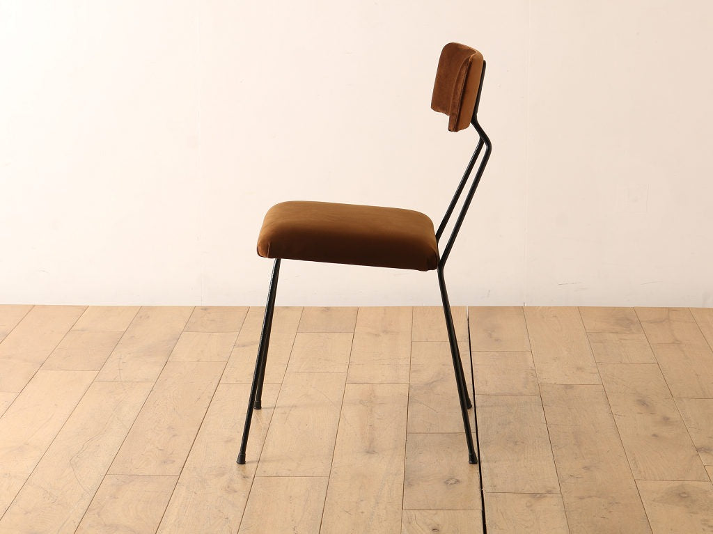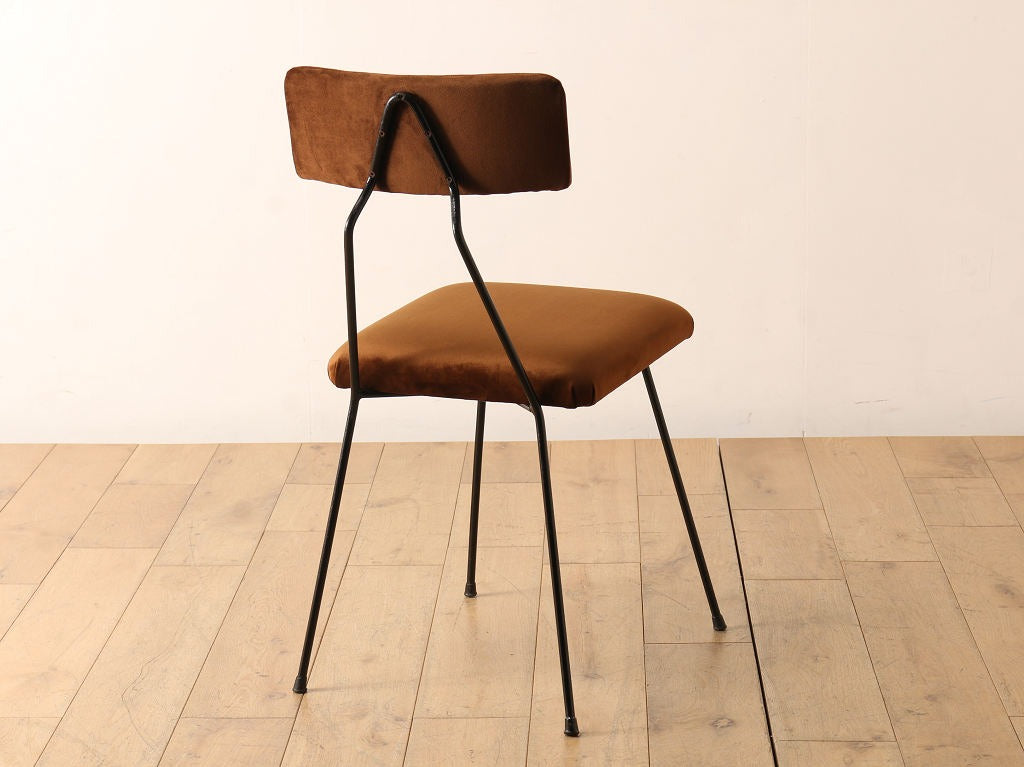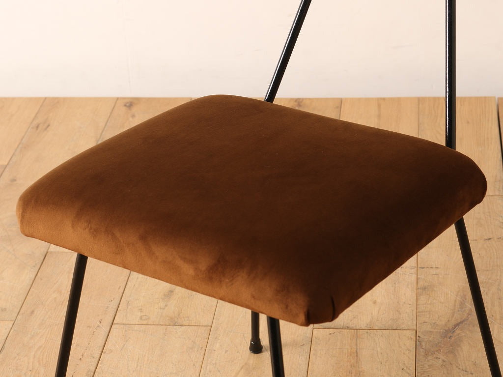 強い個性を持つチェアは空間のポイントとなり、インテリアでは外せないアイテム。特にこちらのチェアは極端なまでに華奢であり、なおかつ鋭角的なスタイルが見る人の目を奪います。ダークブラウンの生地もアイアンのフレームに溶け込んで存在感を解き放っています。テーブルに合わせるチェアとしてはもちろんのこと、空間にポツンと配置するだけでも様になることでしょう。長く使用する上で、座面・背面の中材を交換する際に、お好きなファブリックに張り替えることも楽しみの一つ。生地が変わるだけで印象が全く違うものとなります。イタリアヴィンテージならではの挑戦的なデザインを是非お楽しみ下さい。生地は国内で張替えしております。
