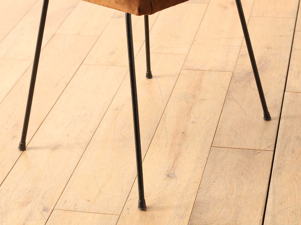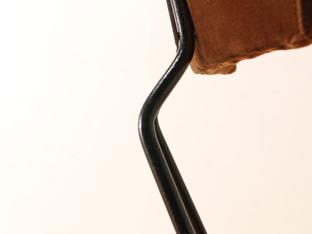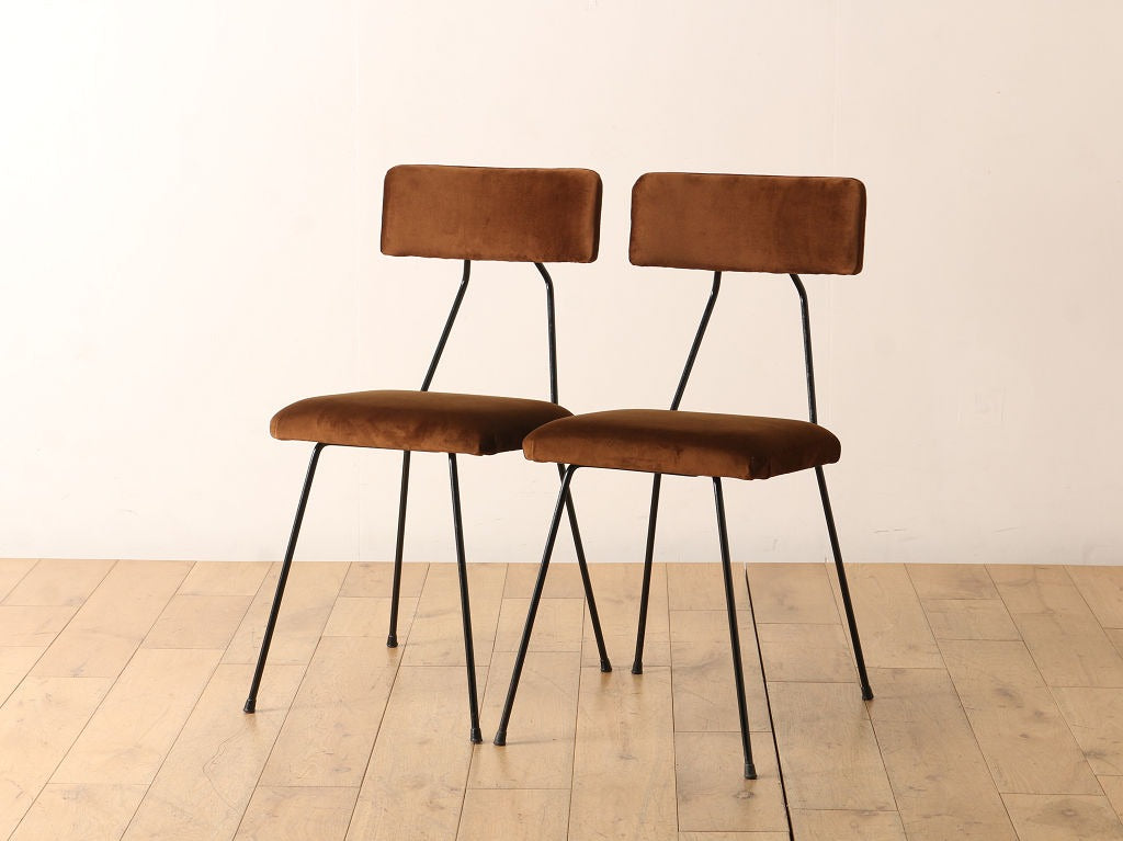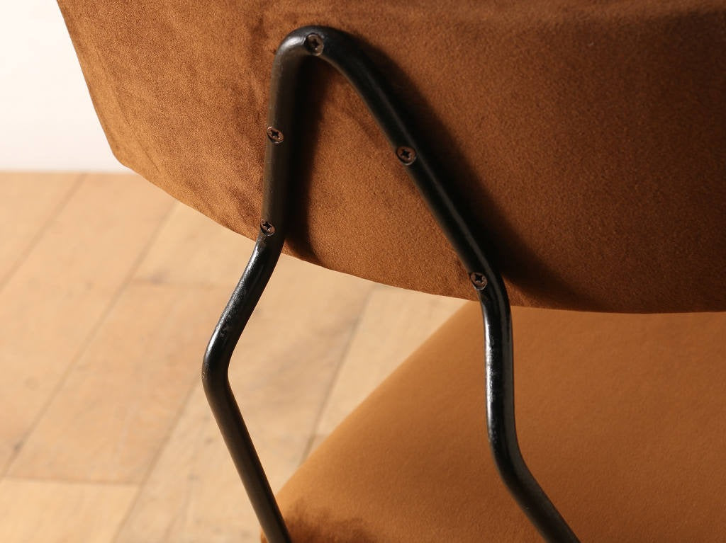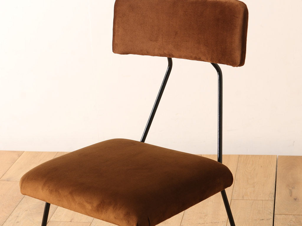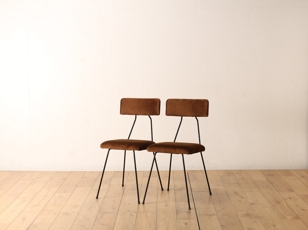 強い個性を持つチェアは空間のポイントとなり、インテリアでは外せないアイテム。特にこちらのチェアは極端なまでに華奢であり、なおかつ鋭角的なスタイルが見る人の目を奪います。ダークブラウンの生地もアイアンのフレームに溶け込んで存在感を解き放っています。テーブルに合わせるチェアとしてはもちろんのこと、空間にポツンと配置するだけでも様になることでしょう。長く使用する上で、座面・背面の中材を交換する際に、お好きなファブリックに張り替えることも楽しみの一つ。生地が変わるだけで印象が全く違うものとなります。イタリアヴィンテージならではの挑戦的なデザインを是非お楽しみ下さい。生地は国内で張替えしております。