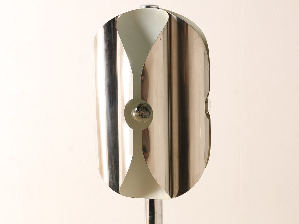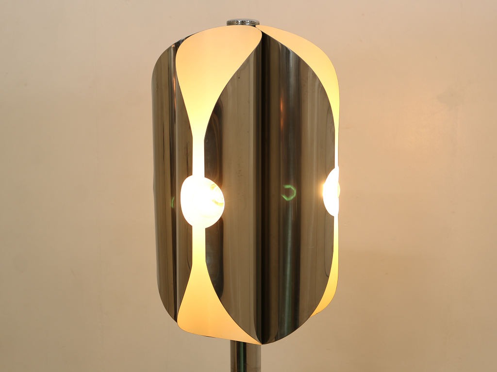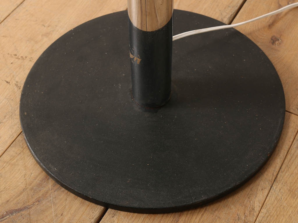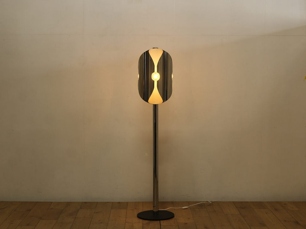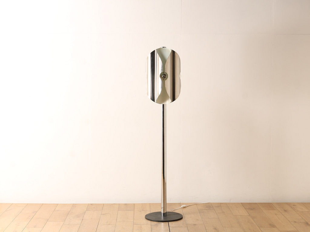 1970年代(推定)に作れらたフロアランプです。湾曲したメタルの中央から電球が光ります。非常に斬新なデザインの照明で、空間のオブジェとしての印象の方が強いかもしれません。また、明かりをつけた時に上下からぬけた光も楽しめます。部屋の角や壁に置いた時には、陰影も楽しめ、違った雰囲気を醸し出します。