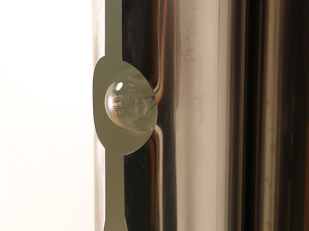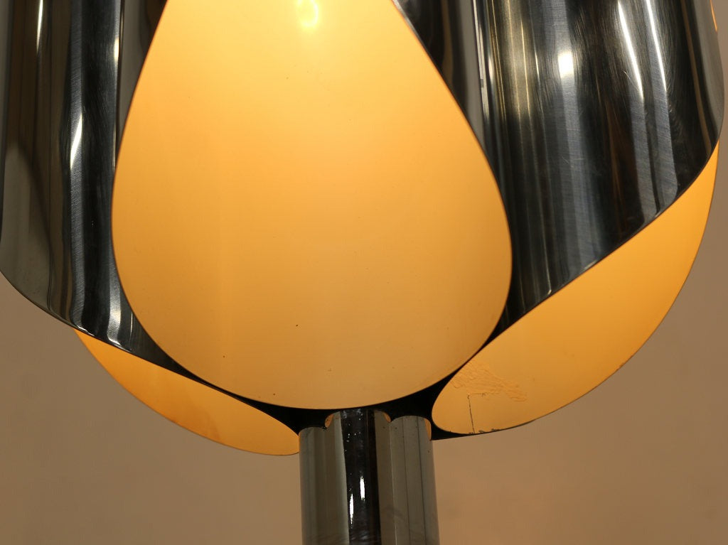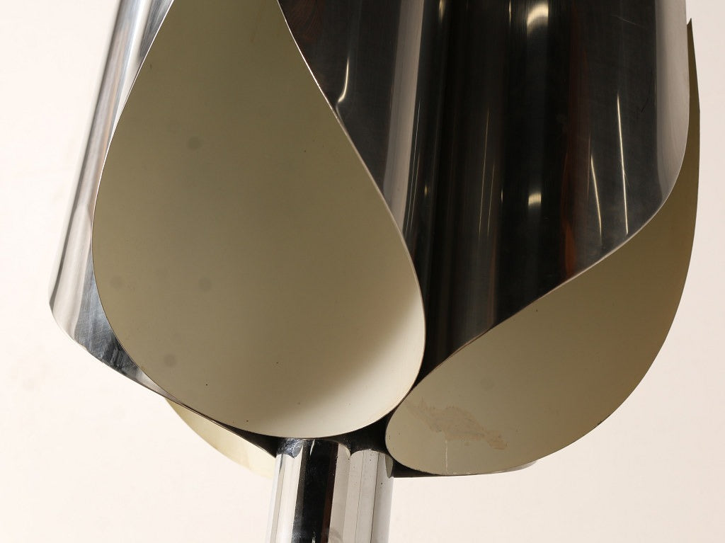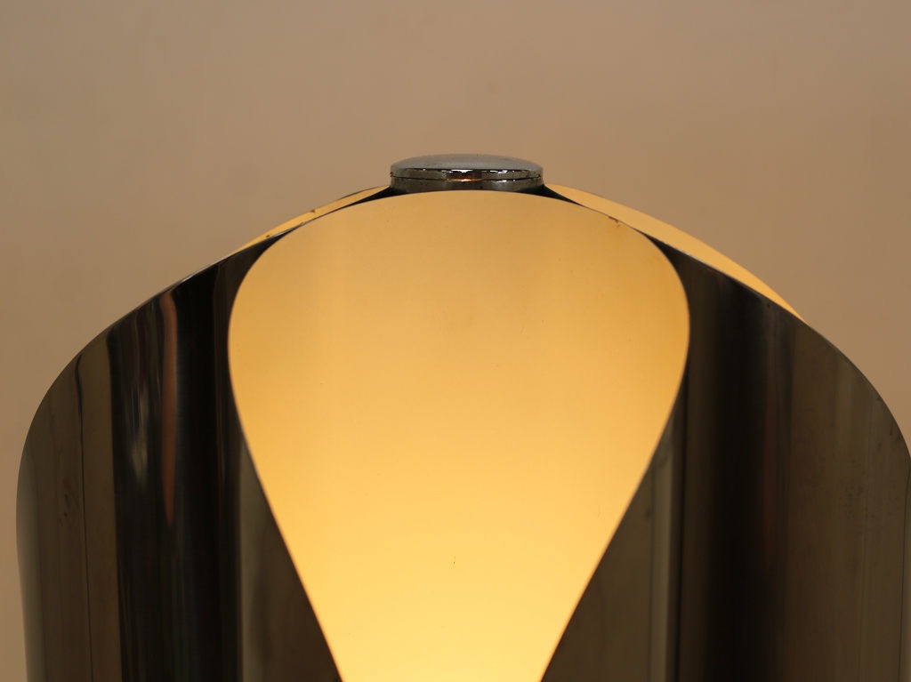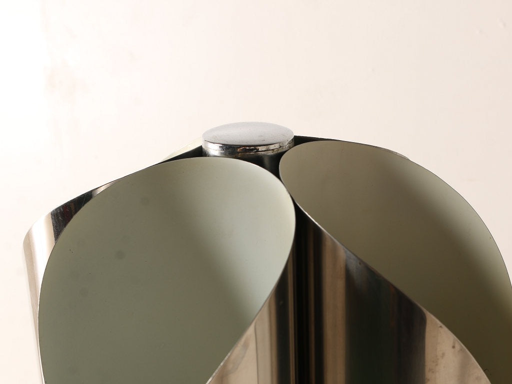 1970年代(推定)に作れらたフロアランプです。湾曲したメタルの中央から電球が光ります。非常に斬新なデザインの照明で、空間のオブジェとしての印象の方が強いかもしれません。また、明かりをつけた時に上下からぬけた光も楽しめます。部屋の角や壁に置いた時には、陰影も楽しめ、違った雰囲気を醸し出します。