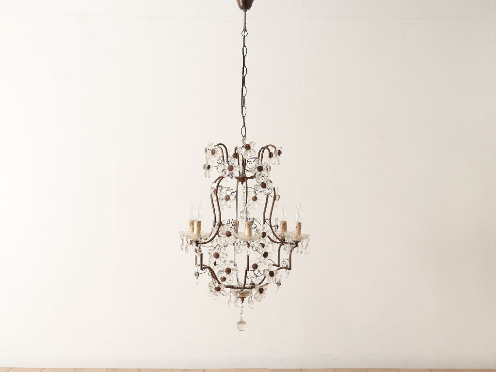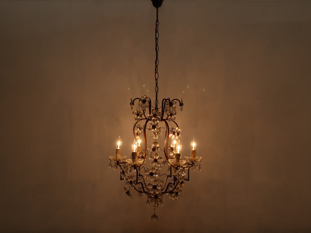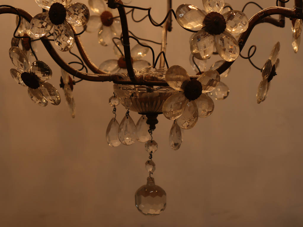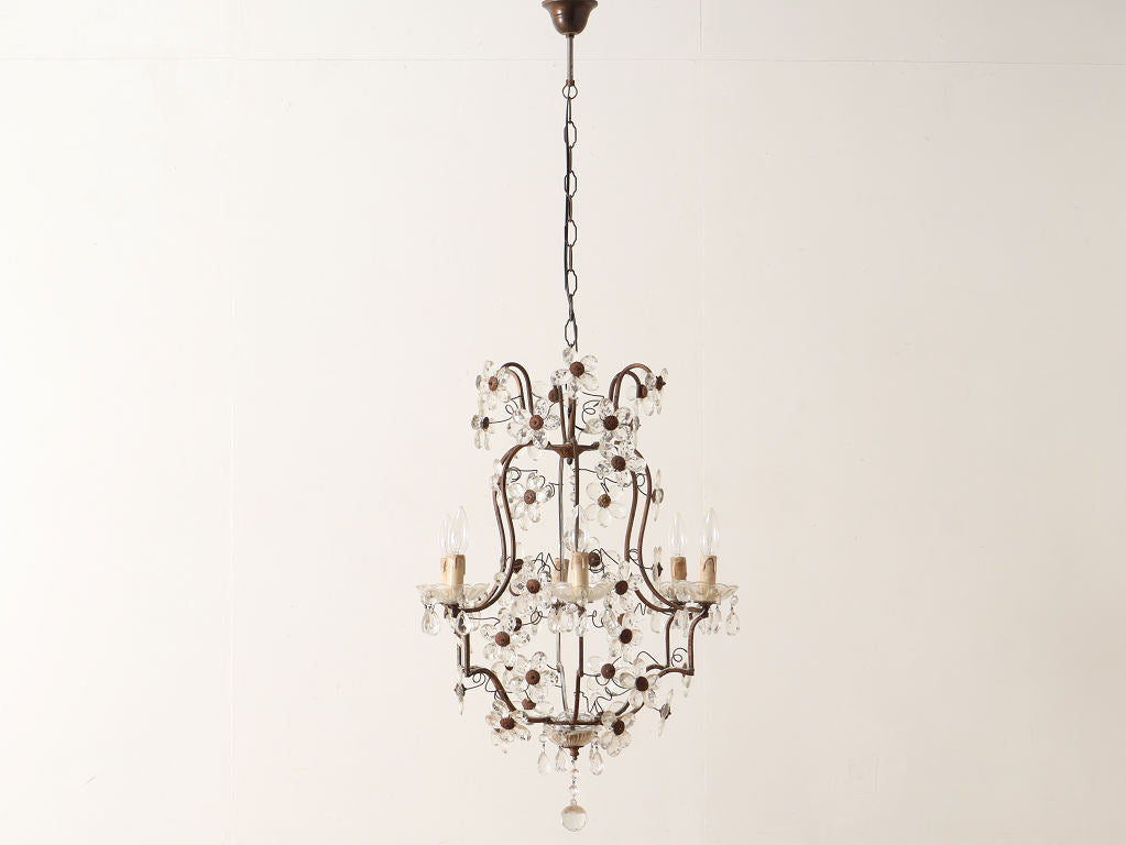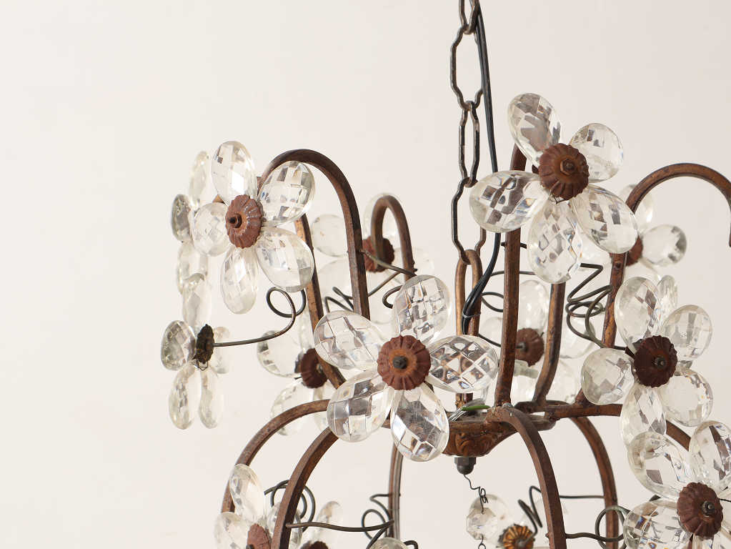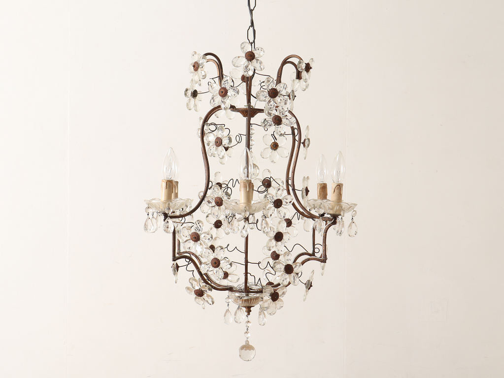 花びらがカットガラスのパーツで構成されている繊細なシャンデリア。クリア色でインテリアを邪魔せず、どんなスタイルにも合わせやすいのではないでしょうか。光を灯すと壁に映る美しい陰影も楽しめます。