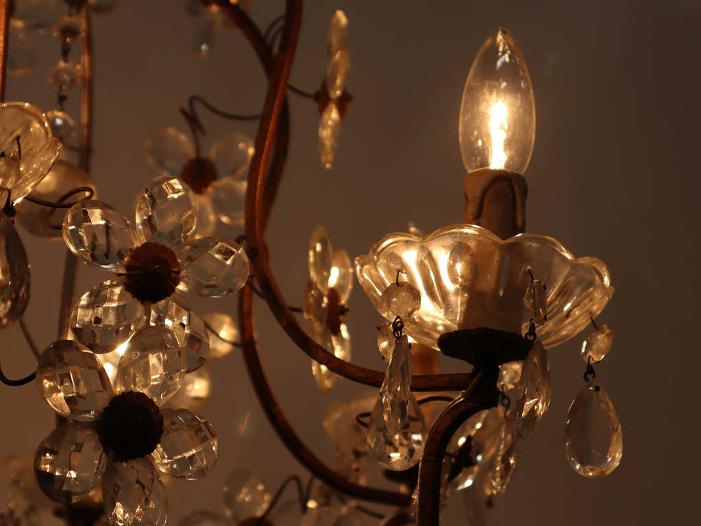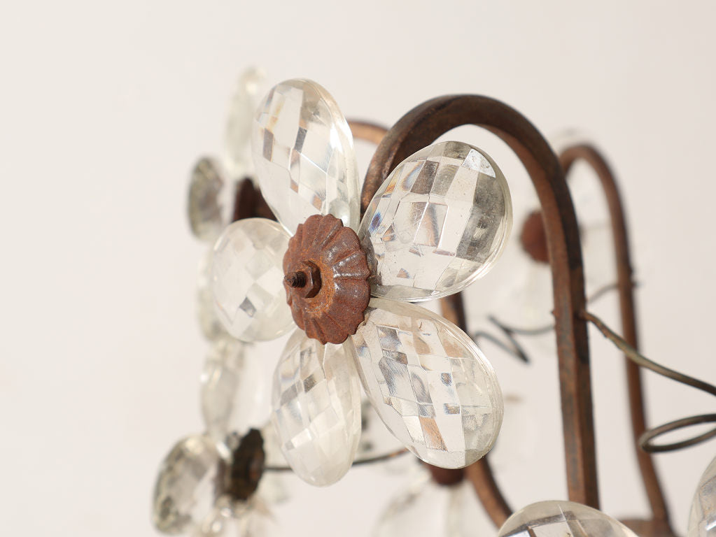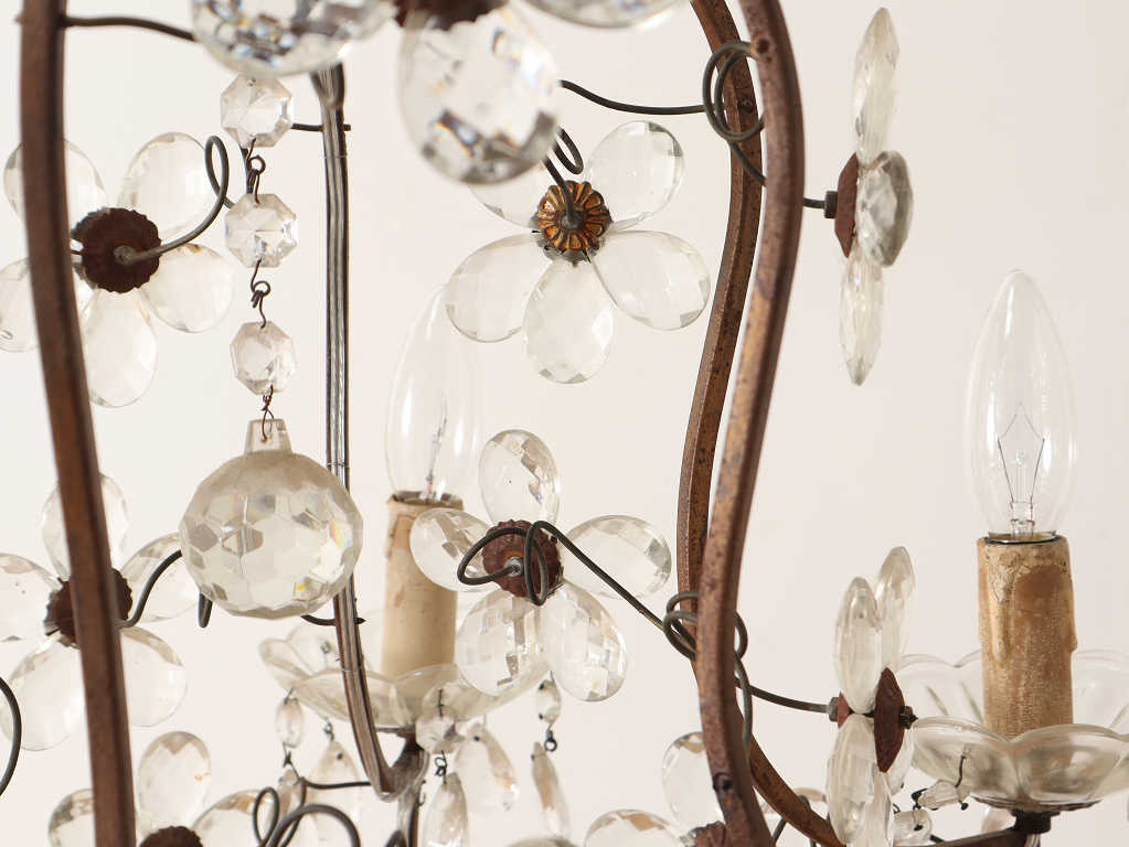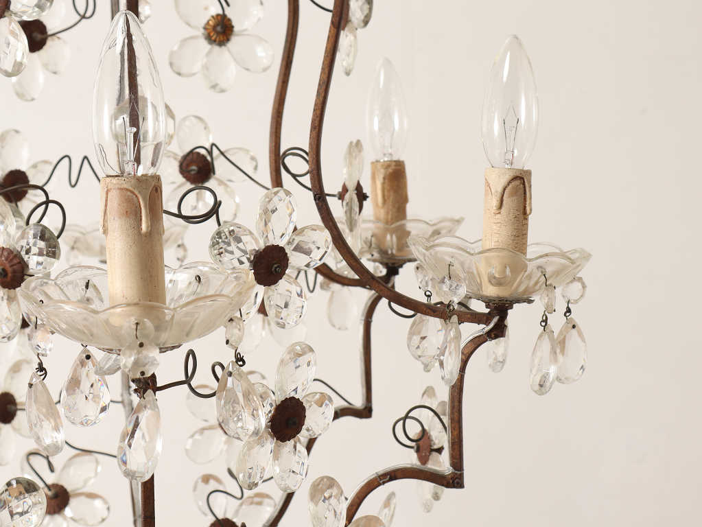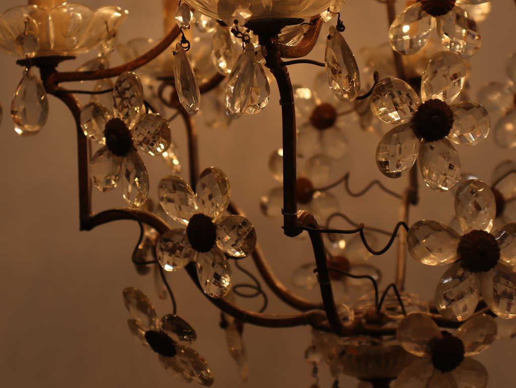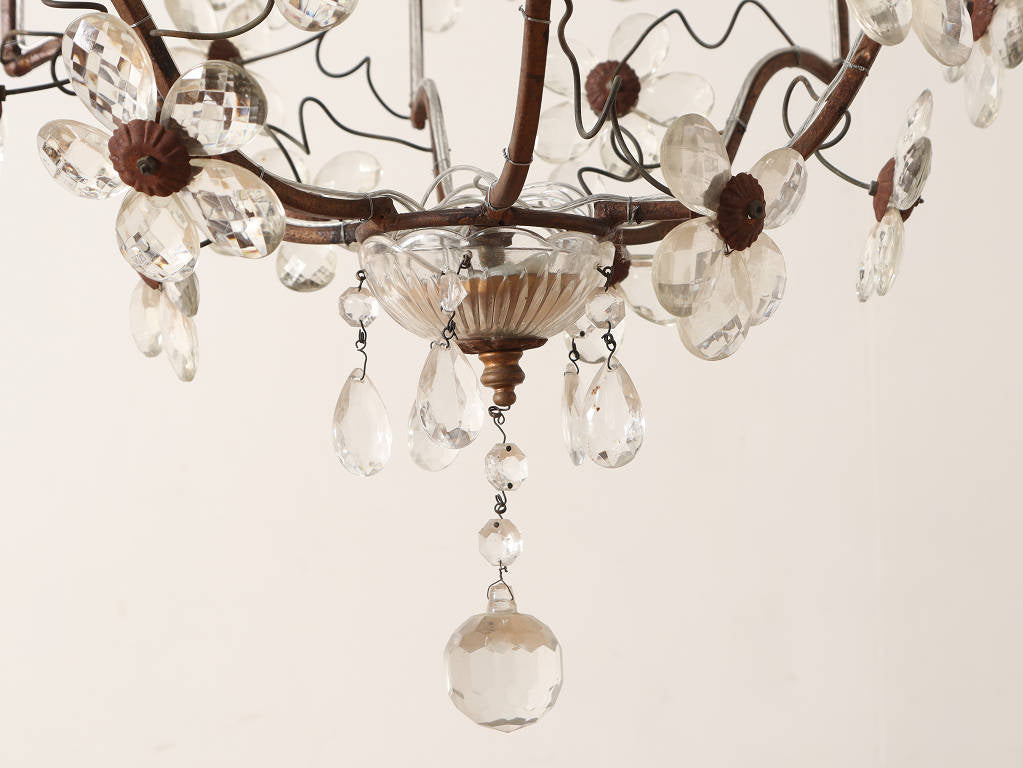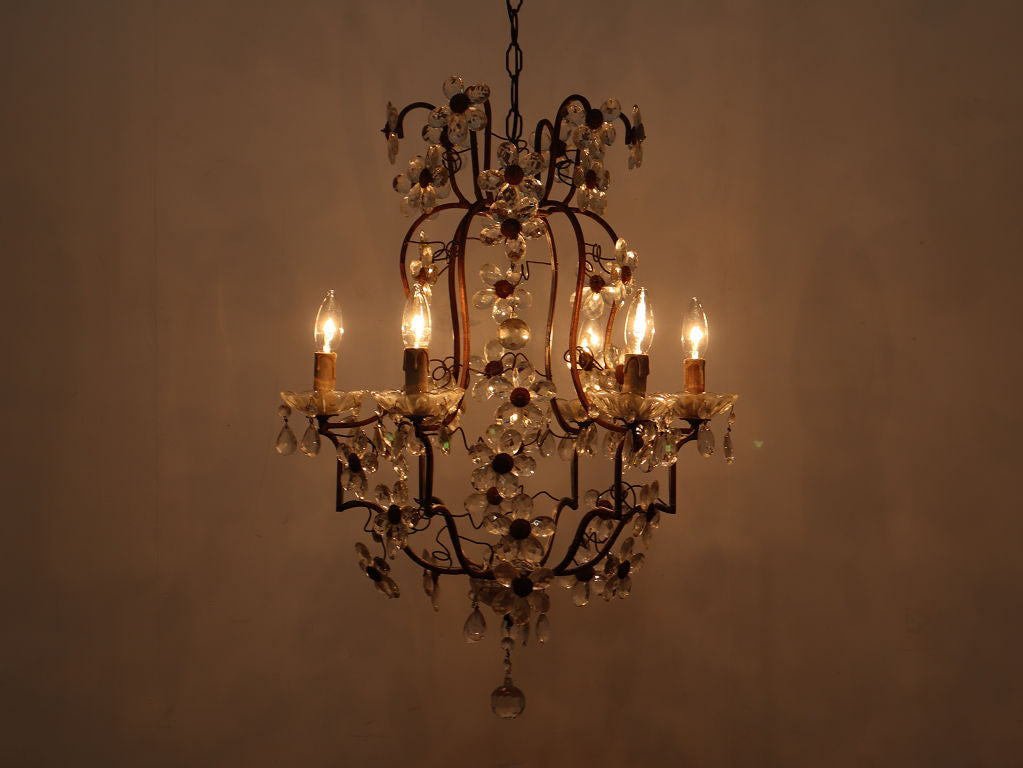 花びらがカットガラスのパーツで構成されている繊細なシャンデリア。クリア色でインテリアを邪魔せず、どんなスタイルにも合わせやすいのではないでしょうか。光を灯すと壁に映る美しい陰影も楽しめます。