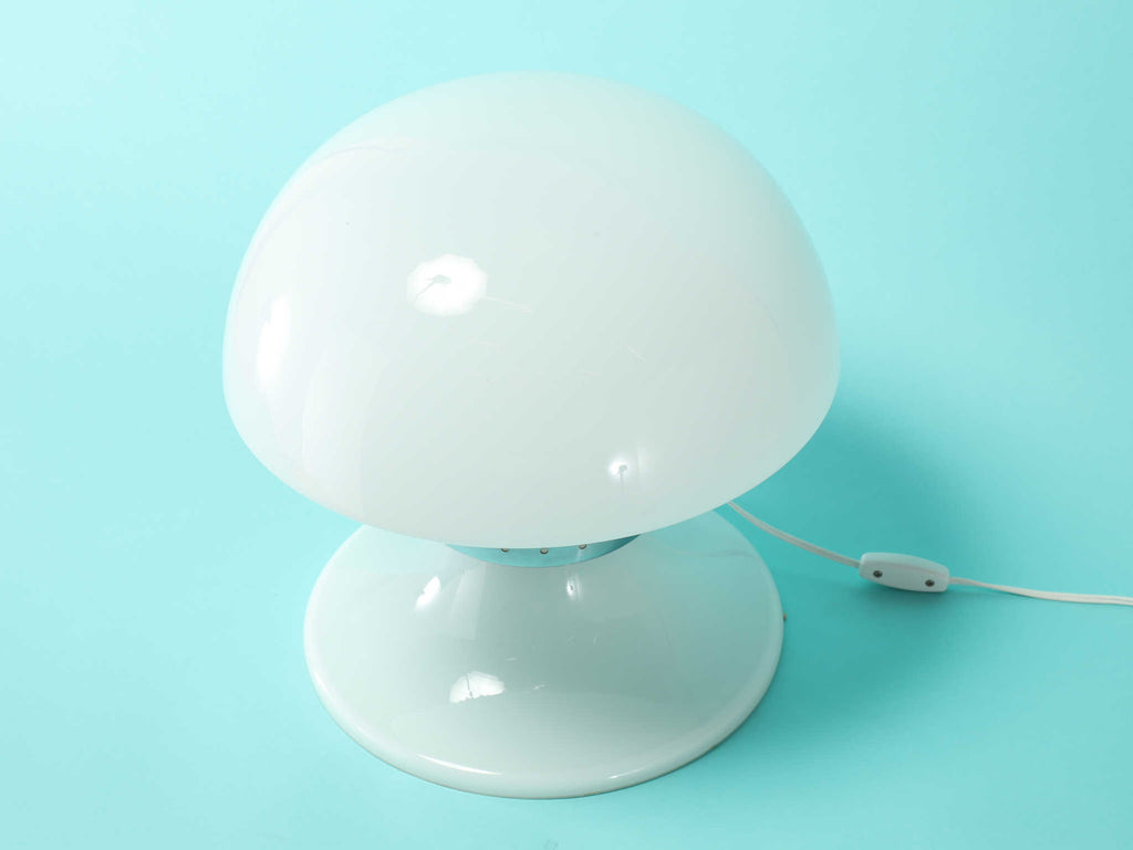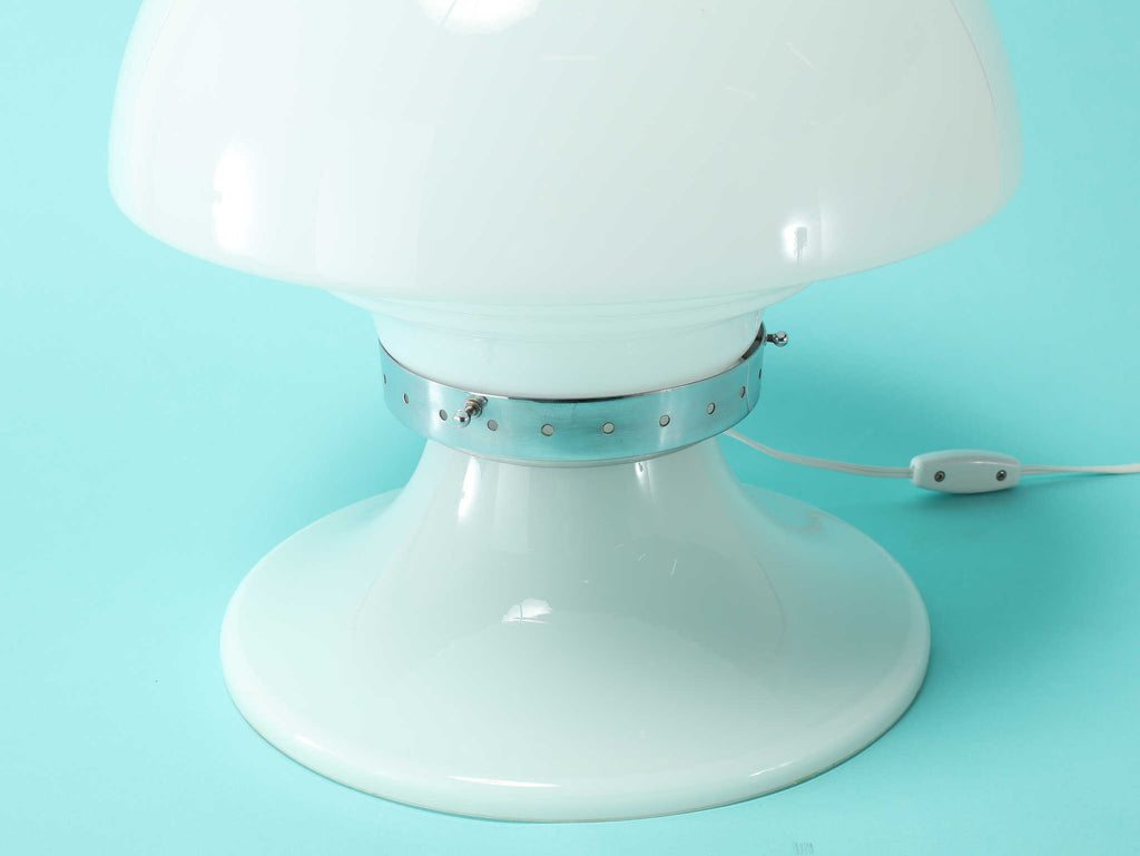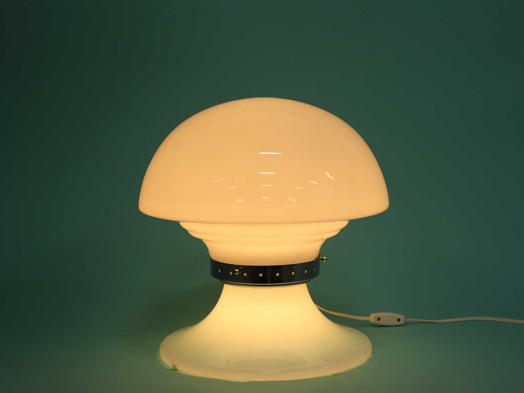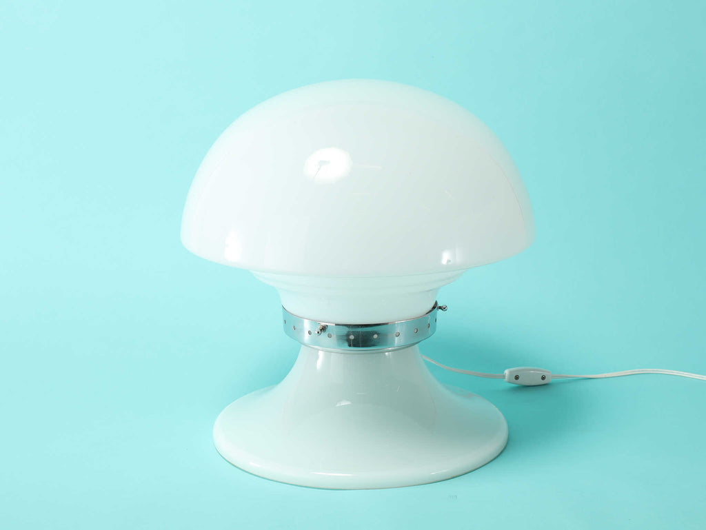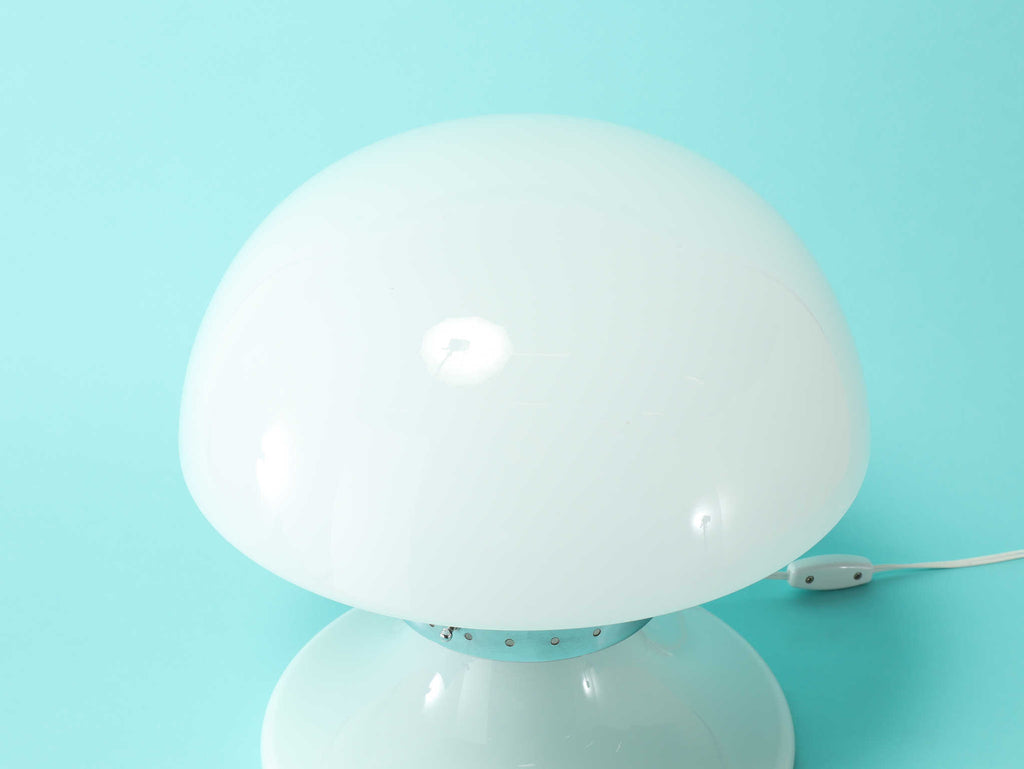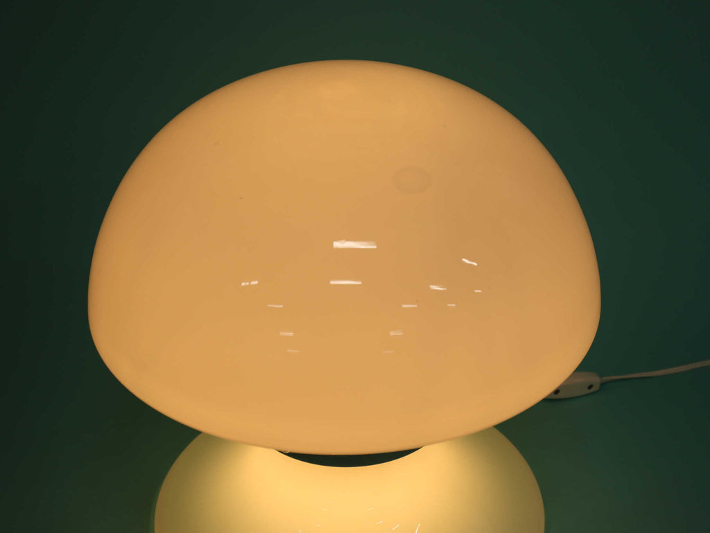 キノコのようなフォルムが特徴的なテーブルランプ。曲線を描いたフォルムは愛らしく、お部屋を優しく包み込みます。メタル部分がガラスのフォルムを程よく引き締め、スマートさを演出します。玄関先やリビング、ベットサイドなど様々なシーンで活躍する万能なランプです。灯りをともすとまた違った表情を楽しめるでしょう。
