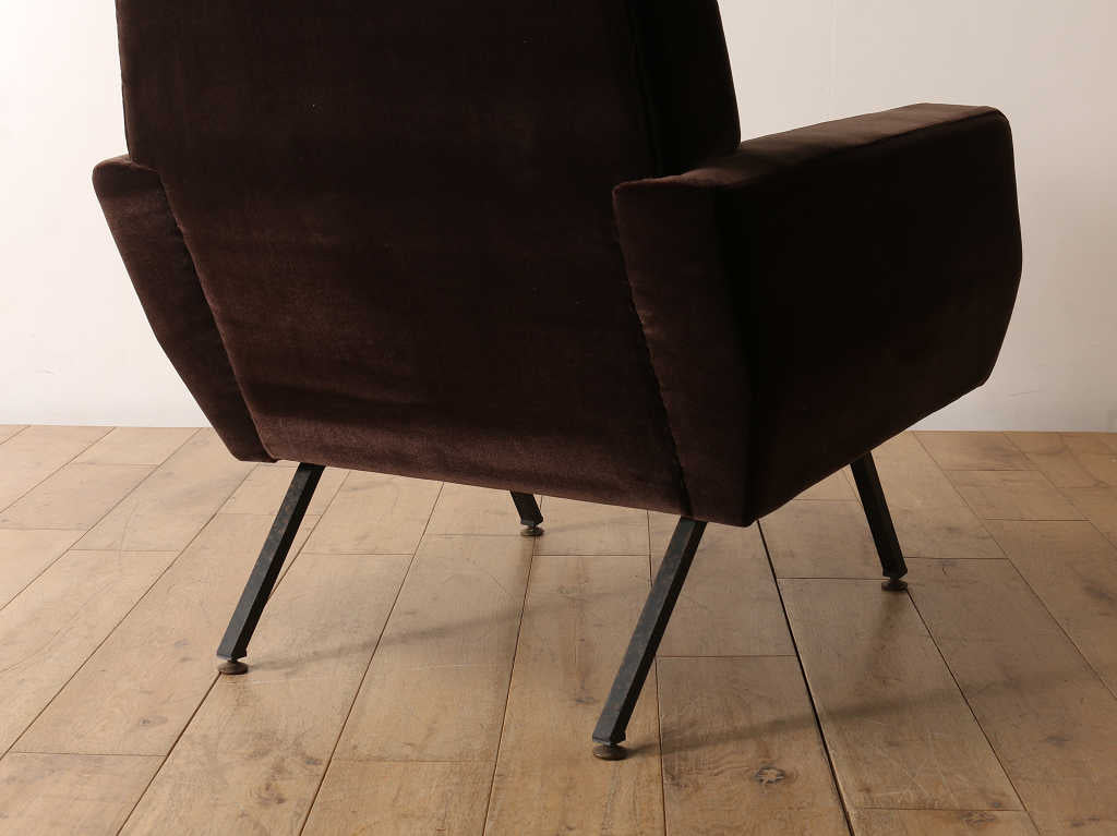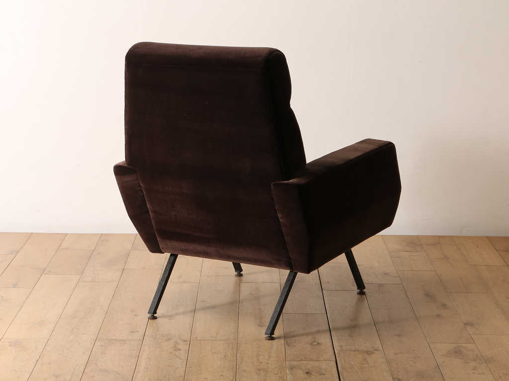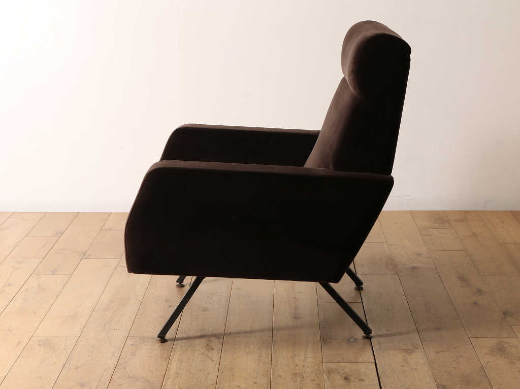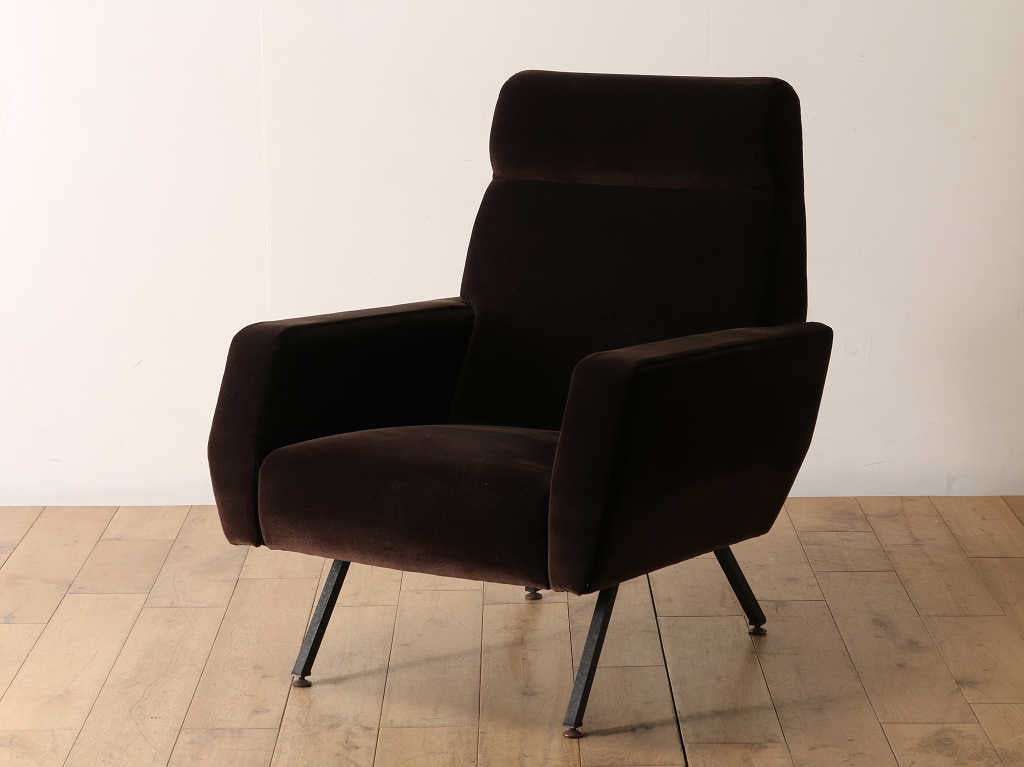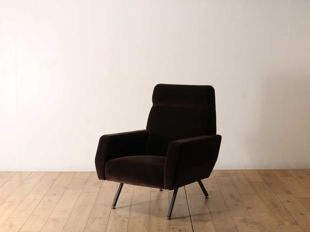 推定1950年代イタリア製のアームチェアです。生地は肌触りが良いダークブラウンのファブリックがシックな雰囲気を演出しています。ボリュームのあるファブリック部分と華奢な足元のバランスが美しく、イタリアデザインらしい洗練された印象です。背もたれはH910と高めの設計になっていますので、より安定した掛け心地を実感できるでしょう。マイチェアをお探しの方にもお勧めの一脚です。生地は国内で張り替えております。