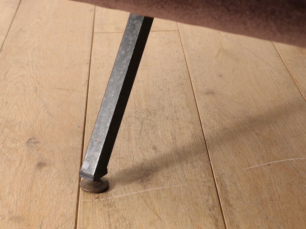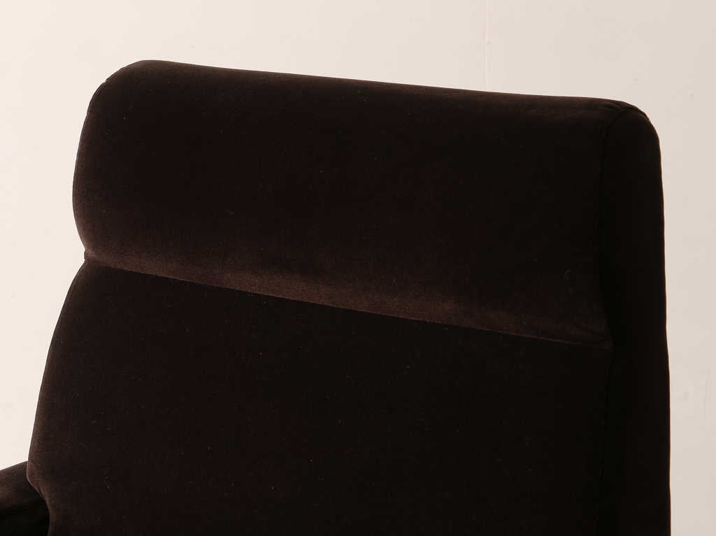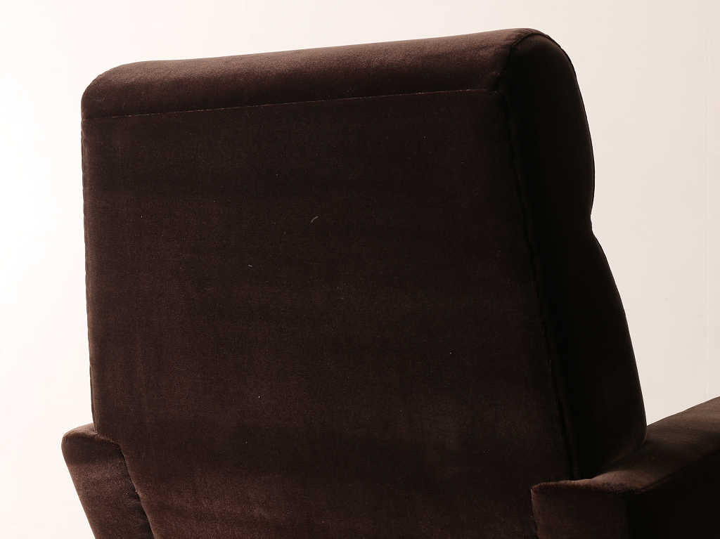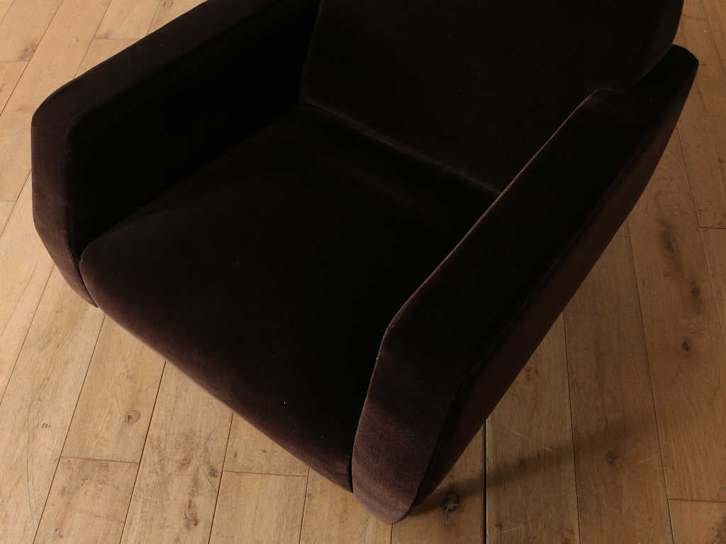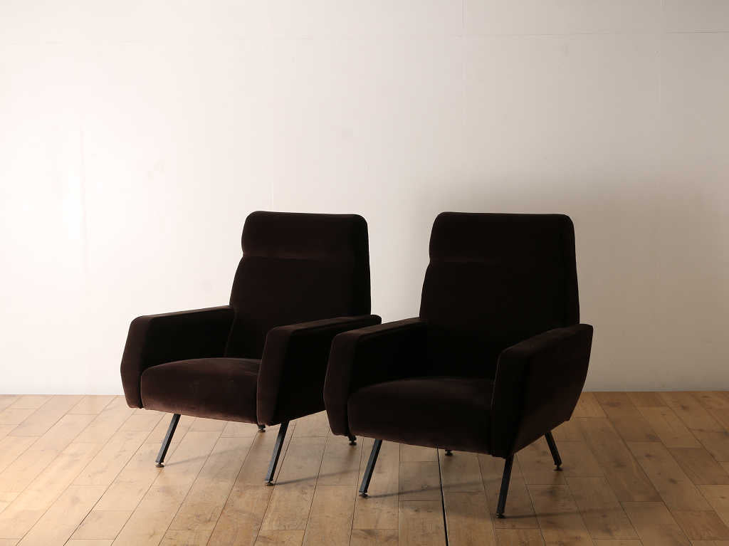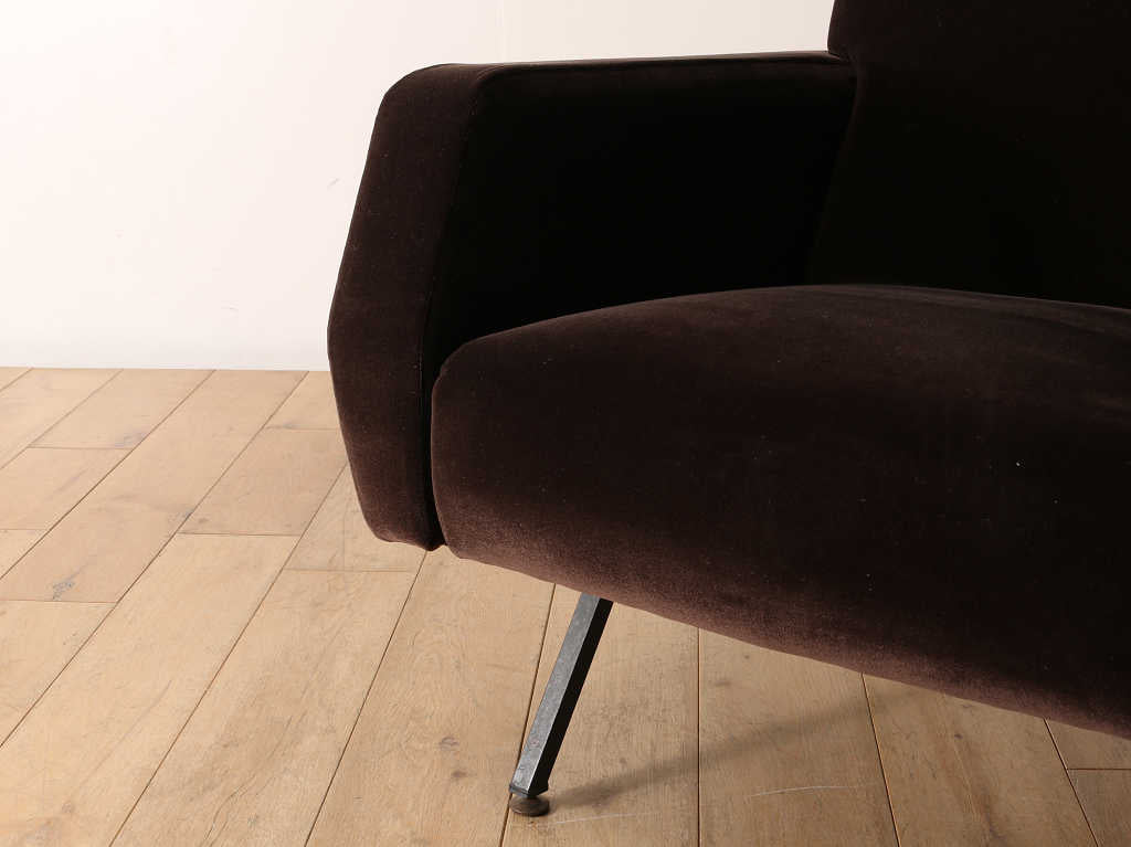 推定1950年代イタリア製のアームチェアです。生地は肌触りが良いダークブラウンのファブリックがシックな雰囲気を演出しています。ボリュームのあるファブリック部分と華奢な足元のバランスが美しく、イタリアデザインらしい洗練された印象です。背もたれはH910と高めの設計になっていますので、より安定した掛け心地を実感できるでしょう。マイチェアをお探しの方にもお勧めの一脚です。生地は国内で張り替えております。