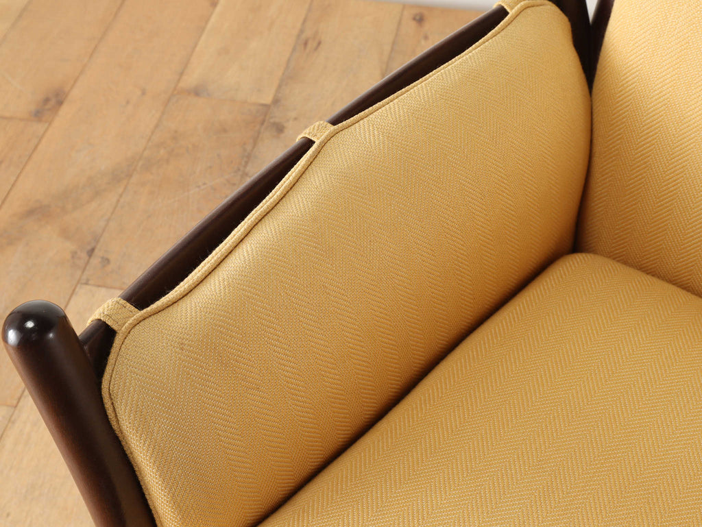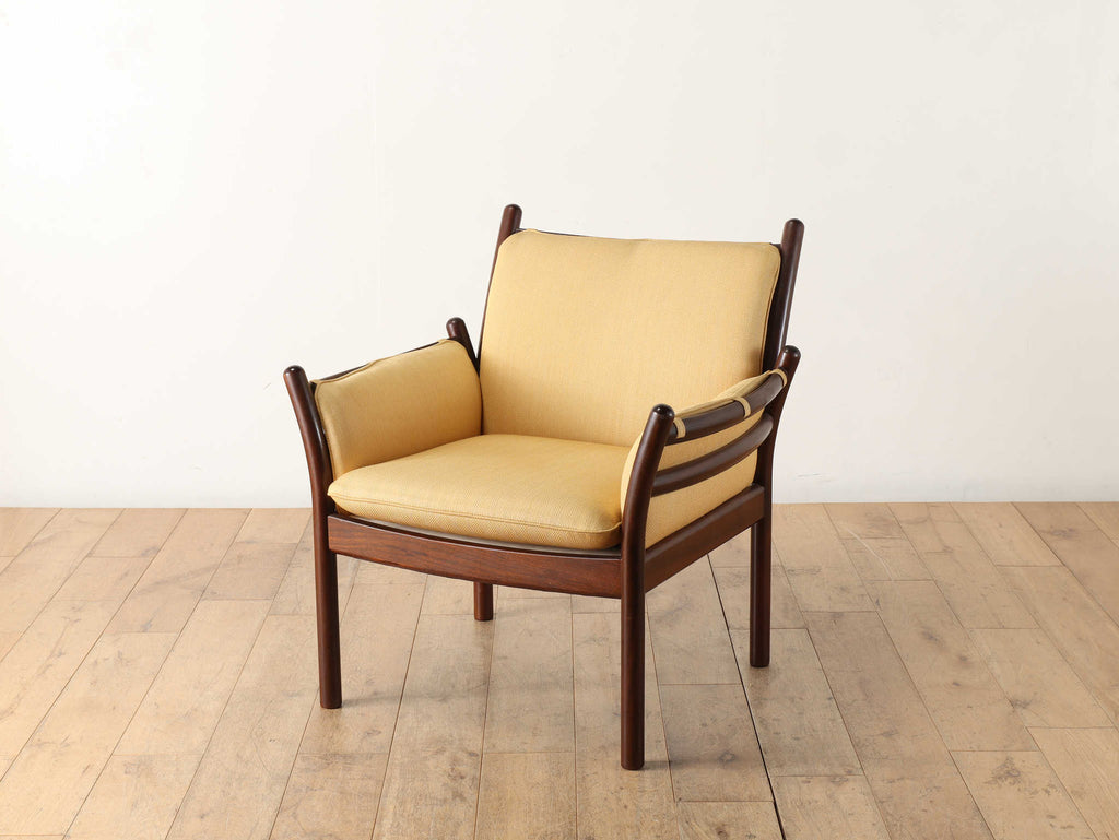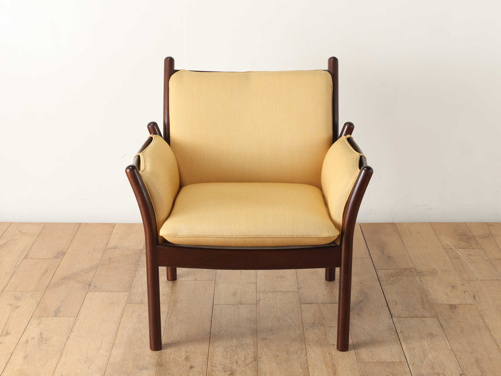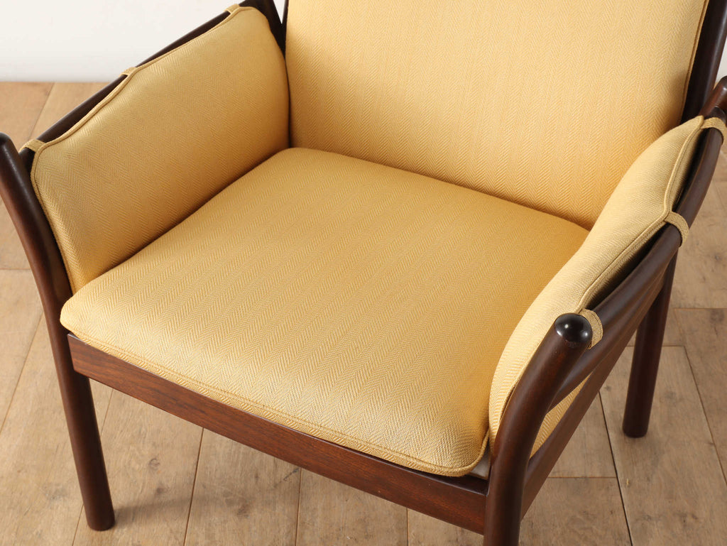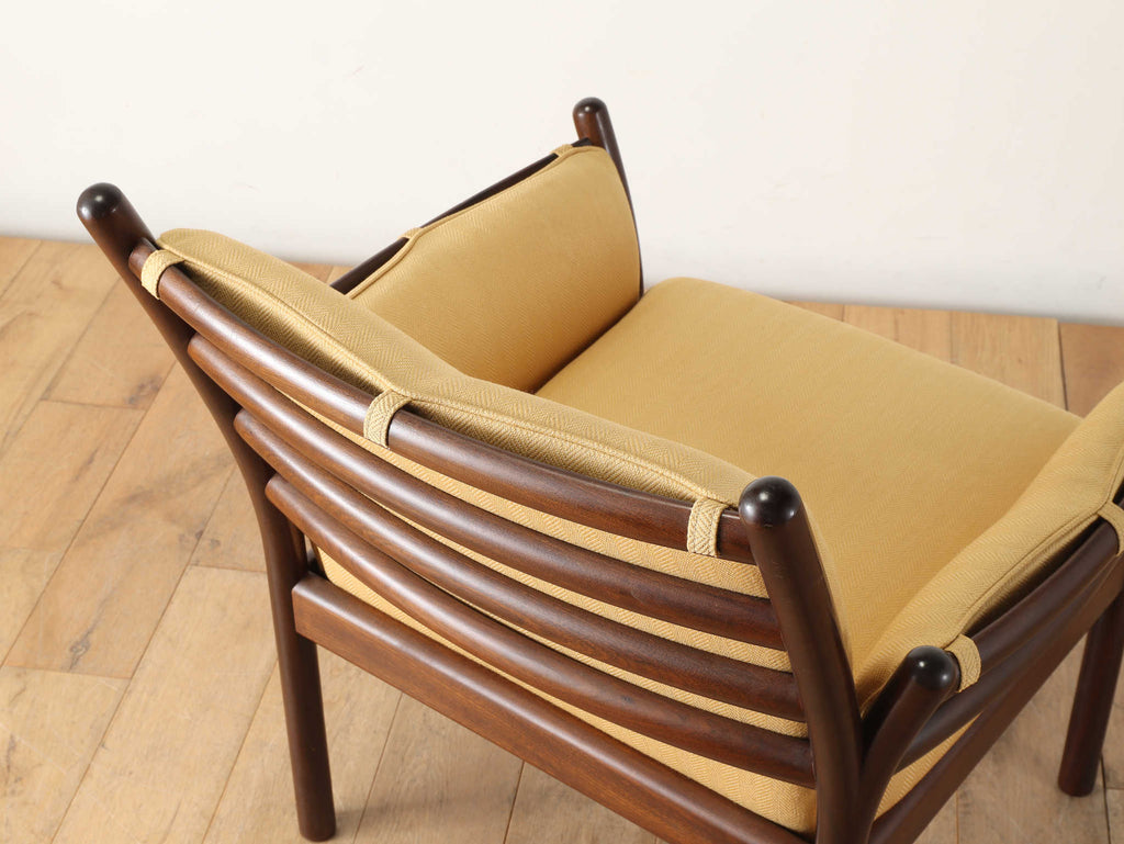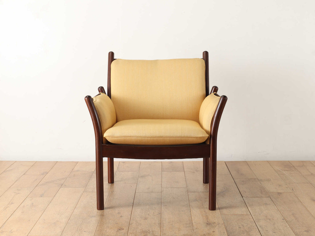 北欧モダンらしい、無駄のないデザインが魅力的なアームチェアです。フレームにクッションが取り付けてられている飾り気のないシンプルな構造でありながら、フレームに使用されたマホガニー材がどこか上品な雰囲気を与えてくれています。体をすっぽりと囲うようにクッションが張られているため、ソファのように包み込むような座り心地も魅力的です。読書などをお楽しみになるアームチェアとしてのご使用はもちろん、ダイニングチェアとしてご利用いただくのもおすすめです。