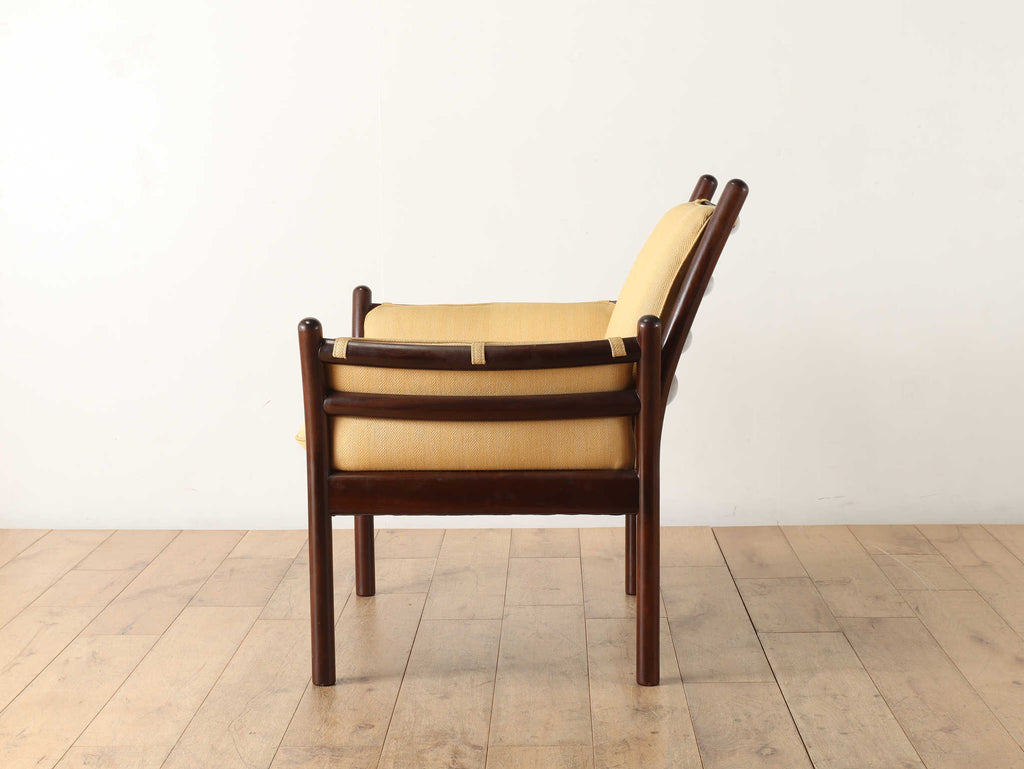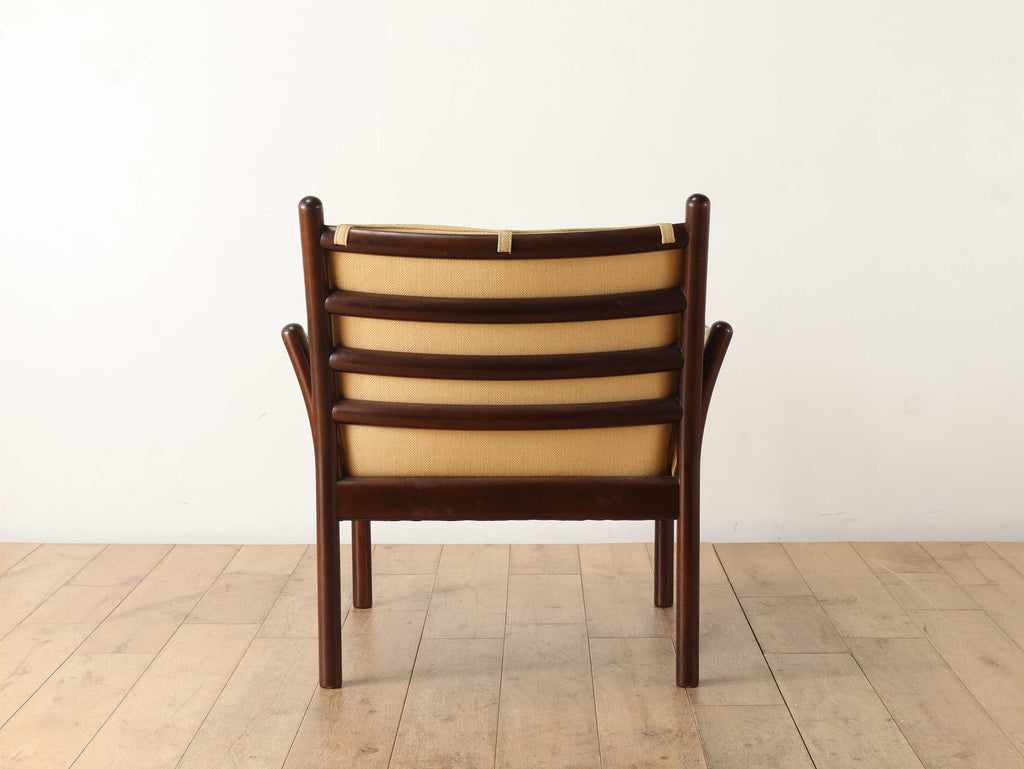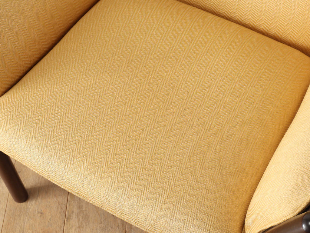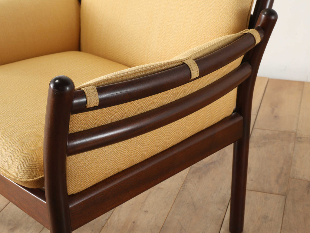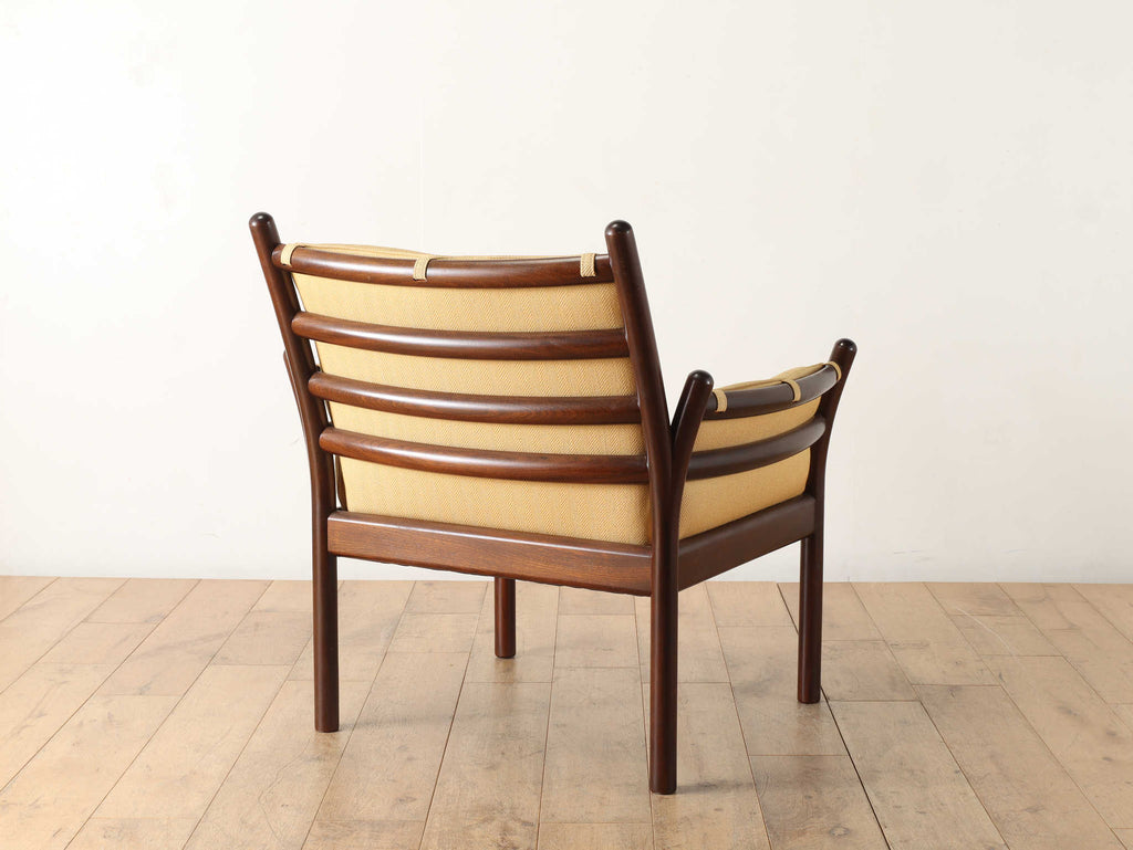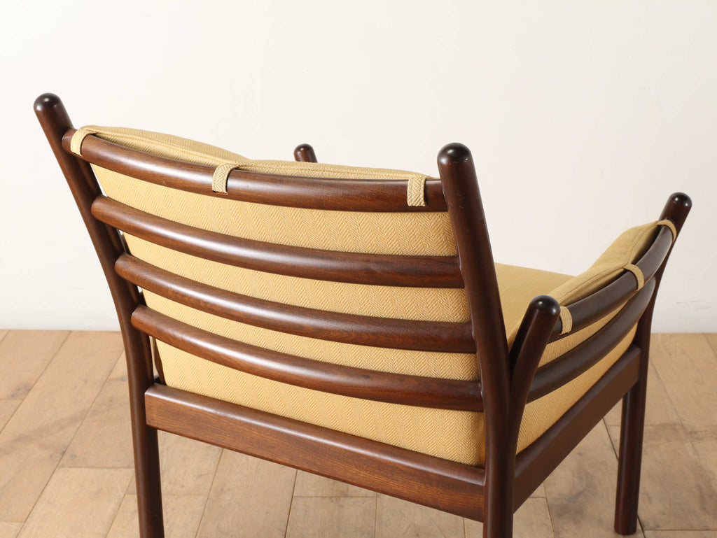 北欧モダンらしい、無駄のないデザインが魅力的なアームチェアです。フレームにクッションが取り付けてられている飾り気のないシンプルな構造でありながら、フレームに使用されたマホガニー材がどこか上品な雰囲気を与えてくれています。体をすっぽりと囲うようにクッションが張られているため、ソファのように包み込むような座り心地も魅力的です。読書などをお楽しみになるアームチェアとしてのご使用はもちろん、ダイニングチェアとしてご利用いただくのもおすすめです。