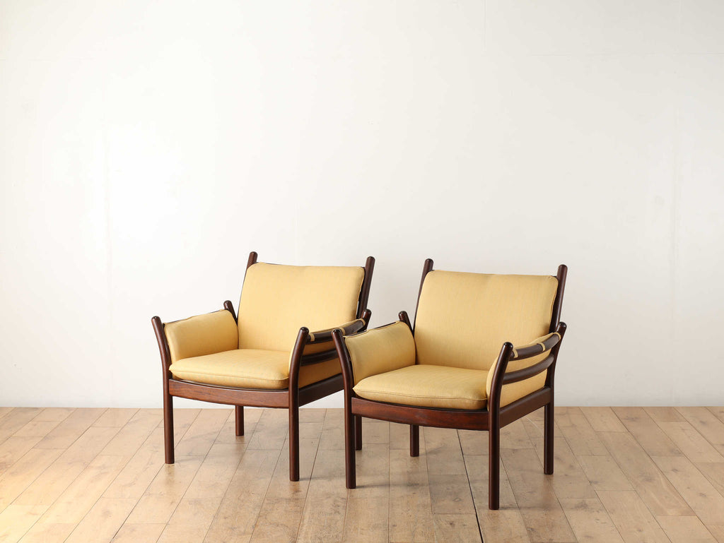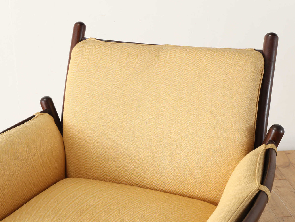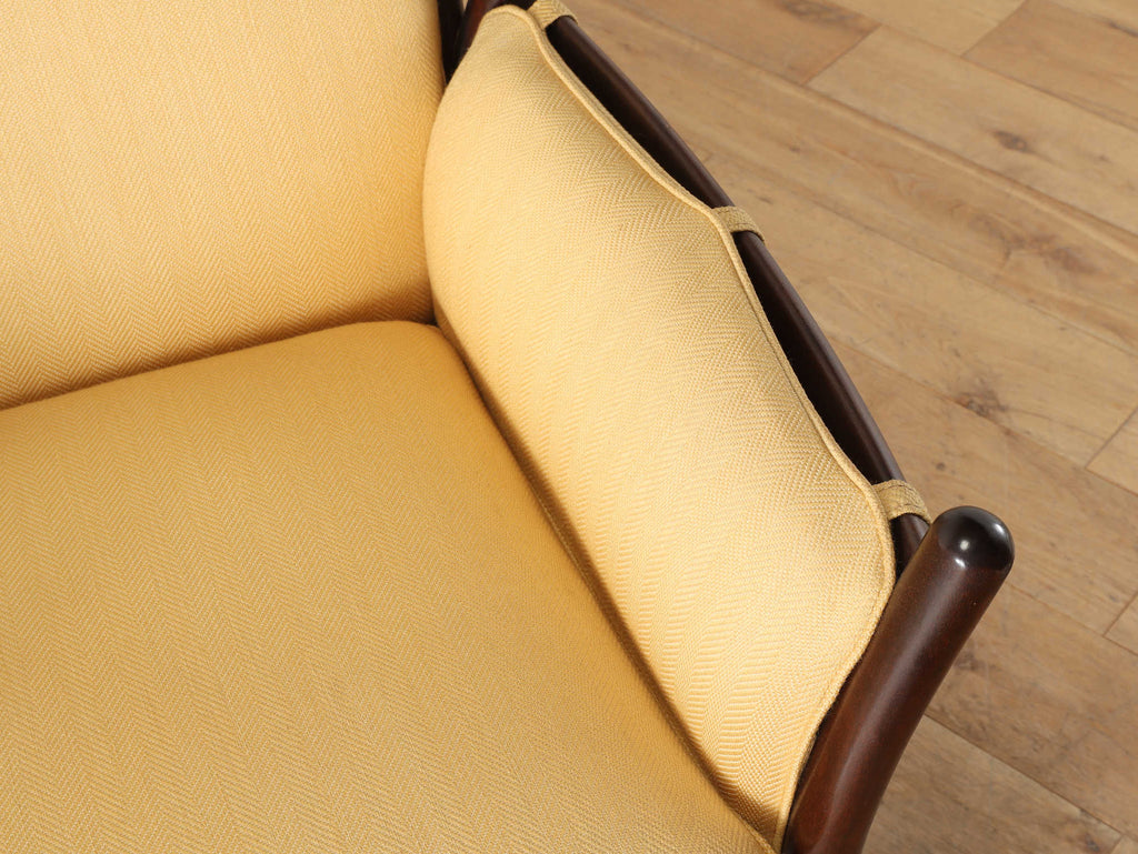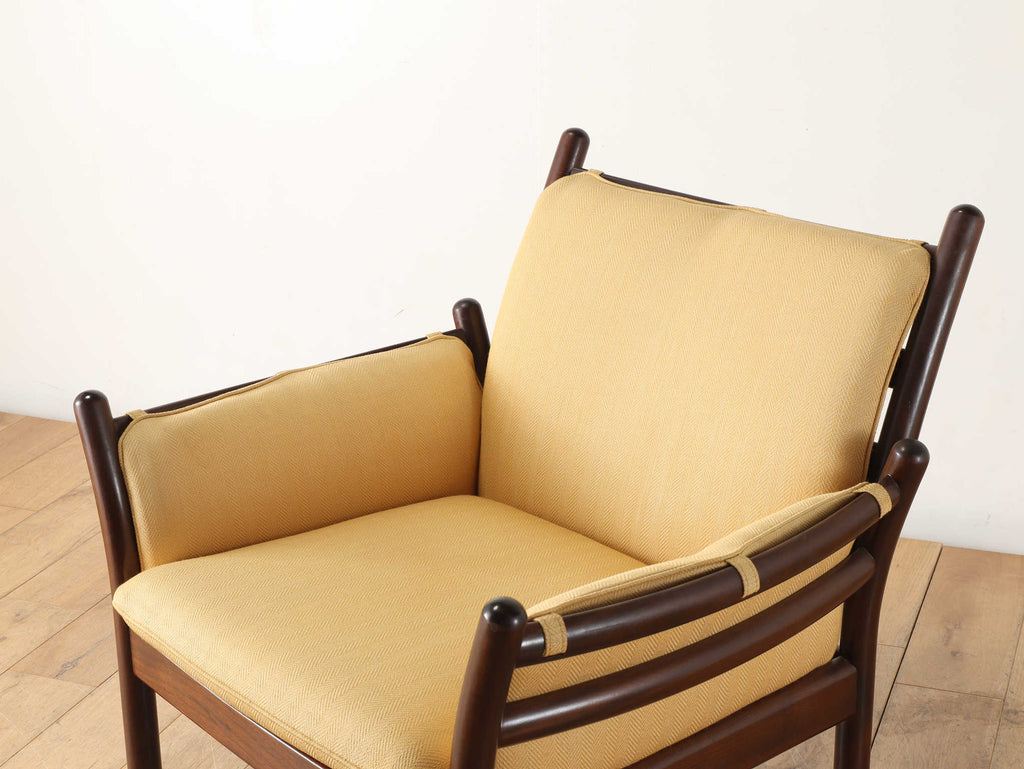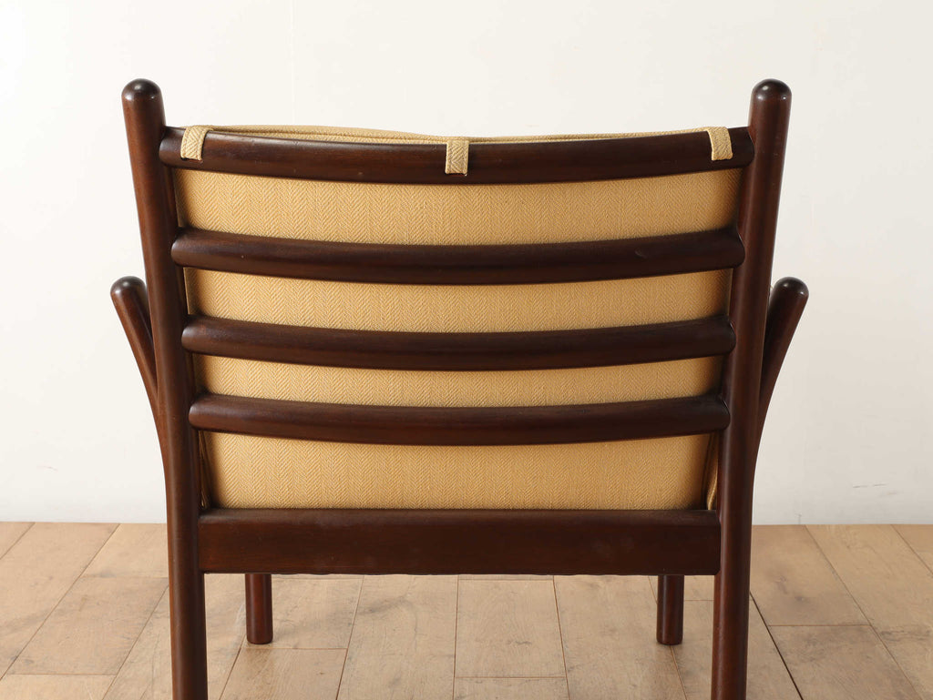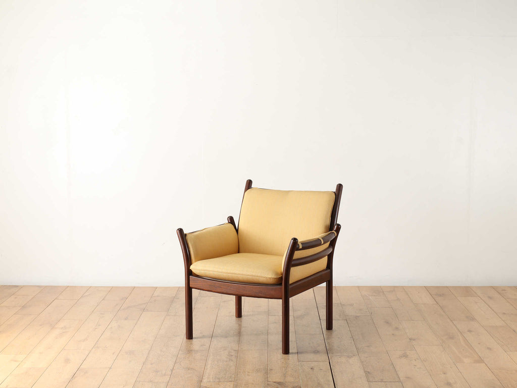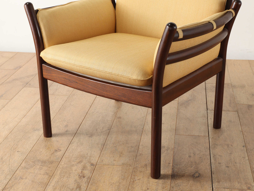 北欧モダンらしい、無駄のないデザインが魅力的なアームチェアです。フレームにクッションが取り付けてられている飾り気のないシンプルな構造でありながら、フレームに使用されたマホガニー材がどこか上品な雰囲気を与えてくれています。体をすっぽりと囲うようにクッションが張られているため、ソファのように包み込むような座り心地も魅力的です。読書などをお楽しみになるアームチェアとしてのご使用はもちろん、ダイニングチェアとしてご利用いただくのもおすすめです。
