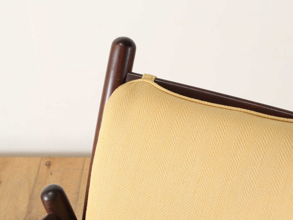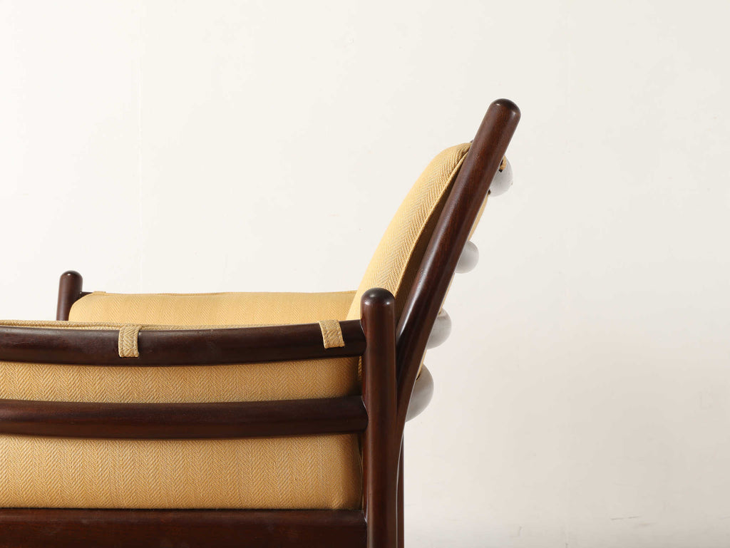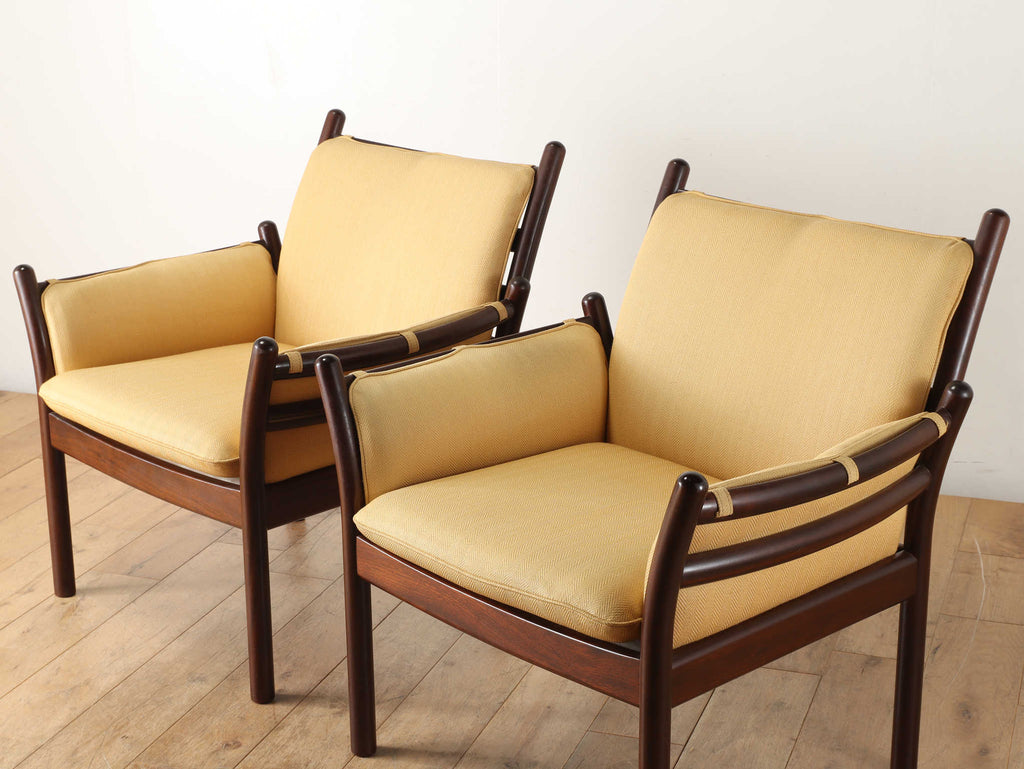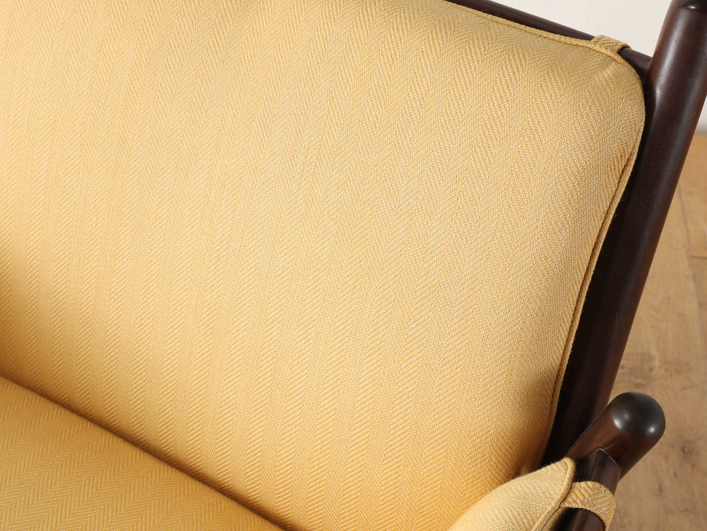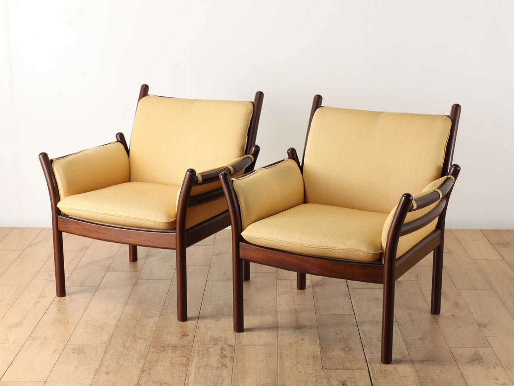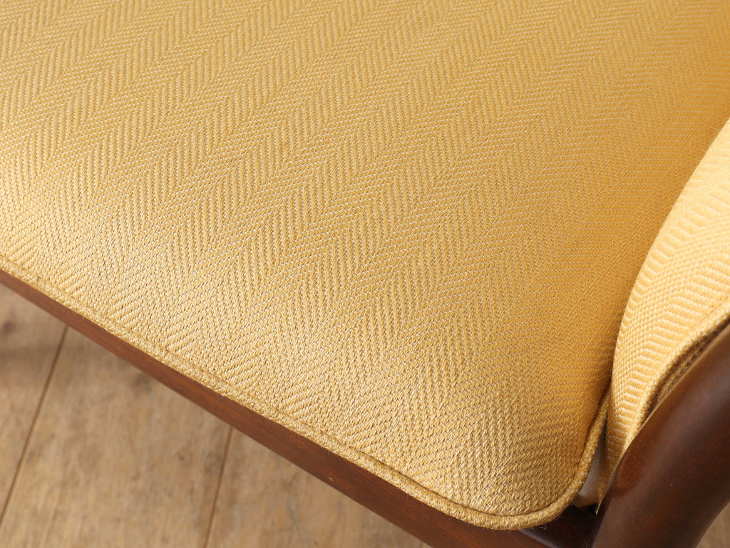 北欧モダンらしい、無駄のないデザインが魅力的なアームチェアです。フレームにクッションが取り付けてられている飾り気のないシンプルな構造でありながら、フレームに使用されたマホガニー材がどこか上品な雰囲気を与えてくれています。体をすっぽりと囲うようにクッションが張られているため、ソファのように包み込むような座り心地も魅力的です。読書などをお楽しみになるアームチェアとしてのご使用はもちろん、ダイニングチェアとしてご利用いただくのもおすすめです。