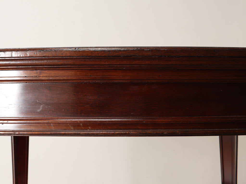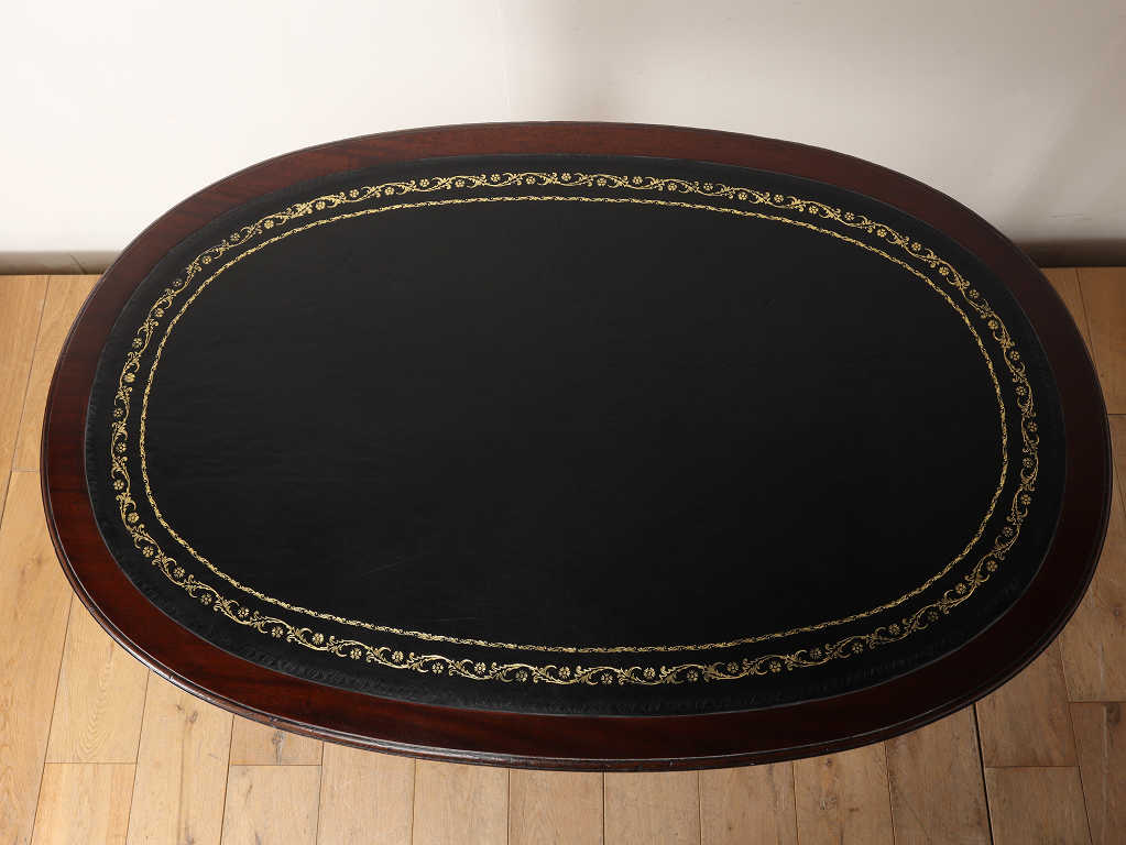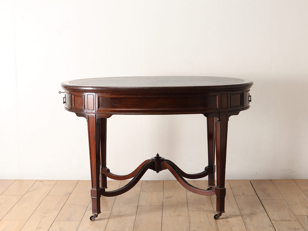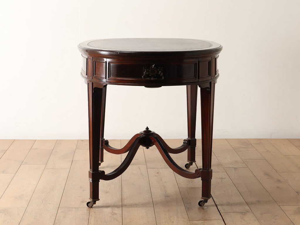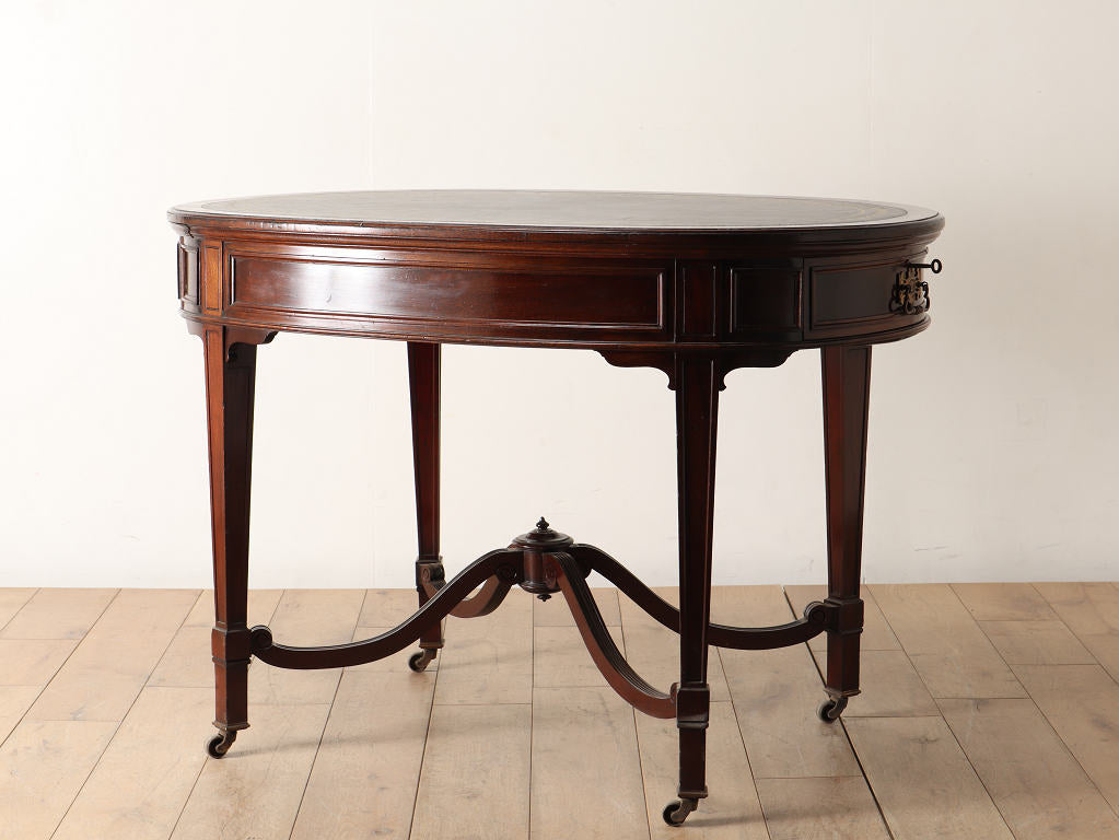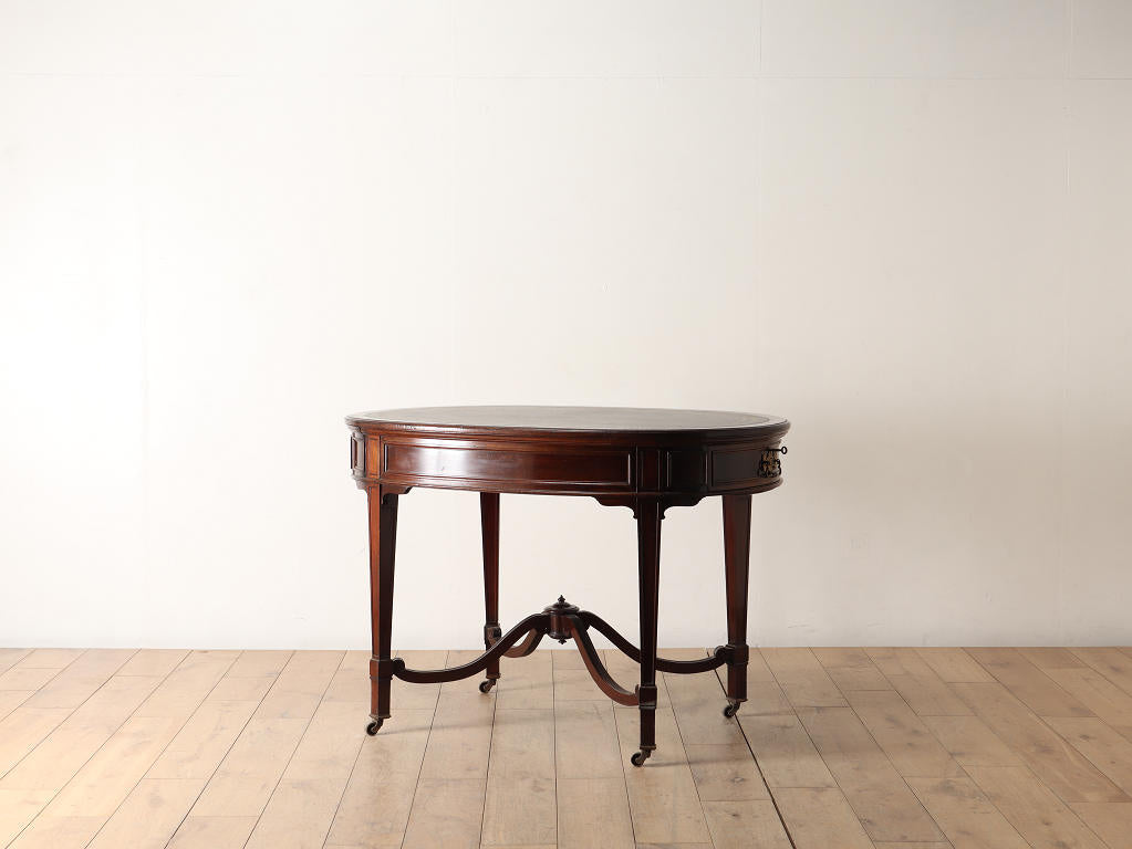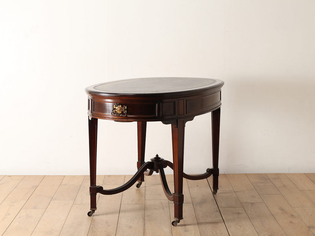 マホガニーの光沢が美しいこちらのオーバルテーブル。トップのレザーは英国でオーダーメイドしたものを張っており、艶めくレザーが高級感を漂わせます。また天板だけでなく、脚先にもこだわりの一面が。スラッと伸びた華奢なラインから細部に至るまでデザイン性が溢れた逸品です。サイドには抽斗が付いており、収納面もしっかりと兼ね備えております。横幅が1130mmと小さめのサイズ感のため多目的に使え、様々なシーンでご利用いただけるのでなないでしょうか。