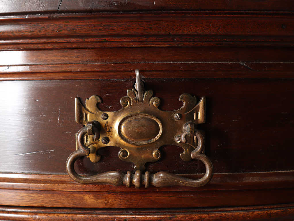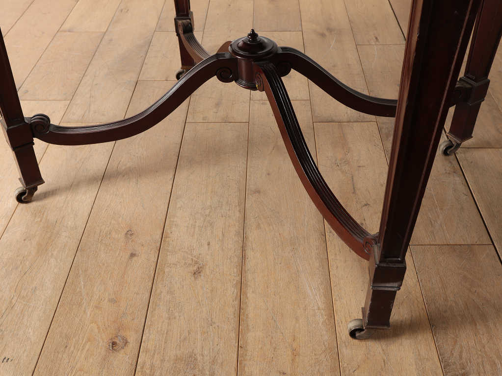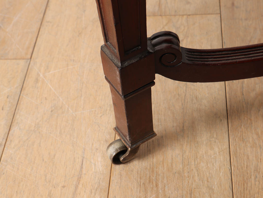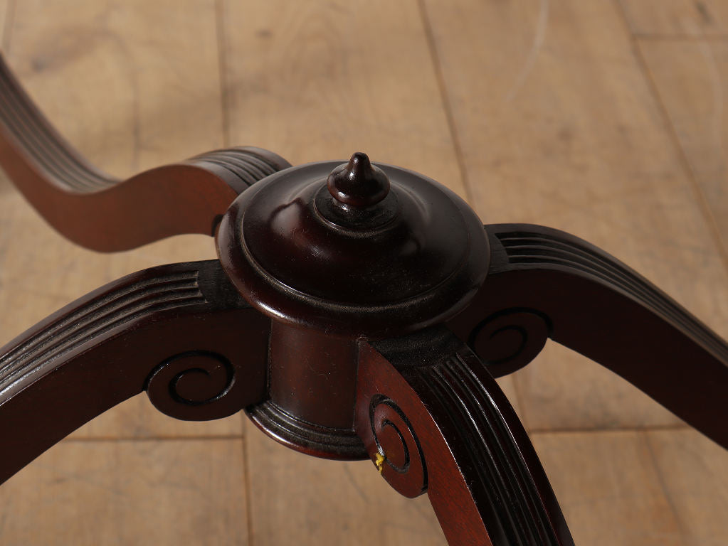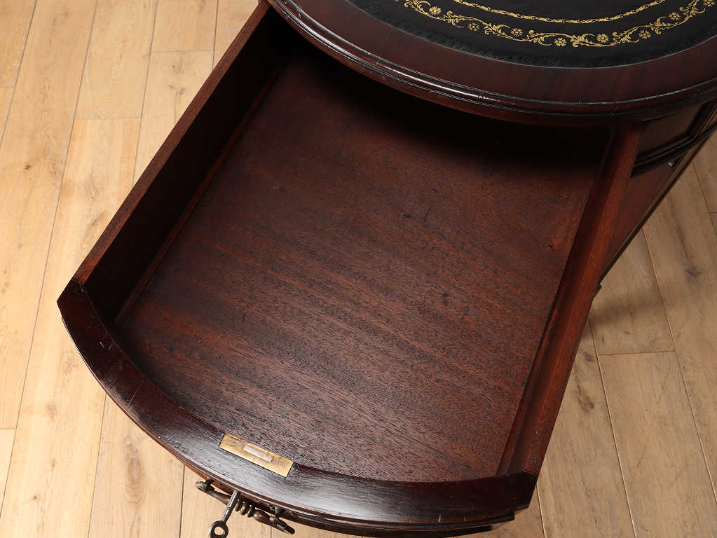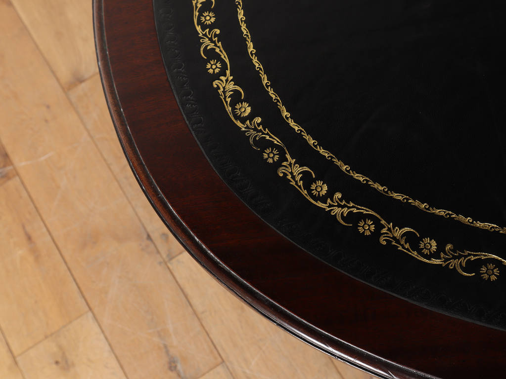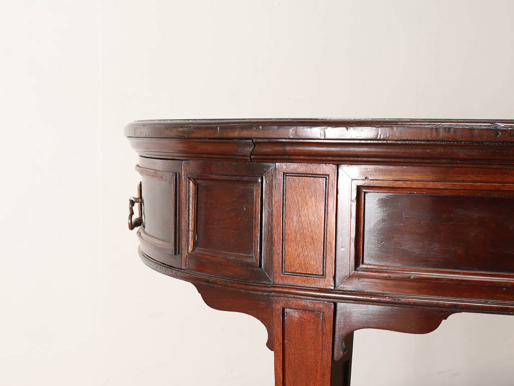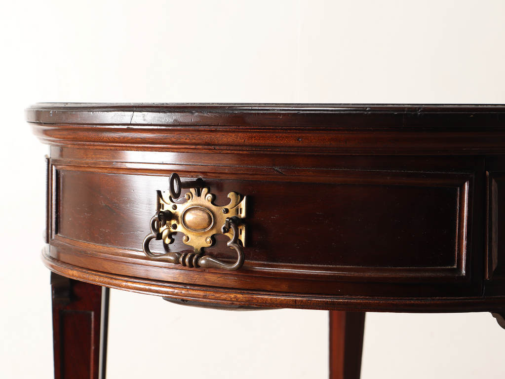 マホガニーの光沢が美しいこちらのオーバルテーブル。トップのレザーは英国でオーダーメイドしたものを張っており、艶めくレザーが高級感を漂わせます。また天板だけでなく、脚先にもこだわりの一面が。スラッと伸びた華奢なラインから細部に至るまでデザイン性が溢れた逸品です。サイドには抽斗が付いており、収納面もしっかりと兼ね備えております。横幅が1130mmと小さめのサイズ感のため多目的に使え、様々なシーンでご利用いただけるのでなないでしょうか。