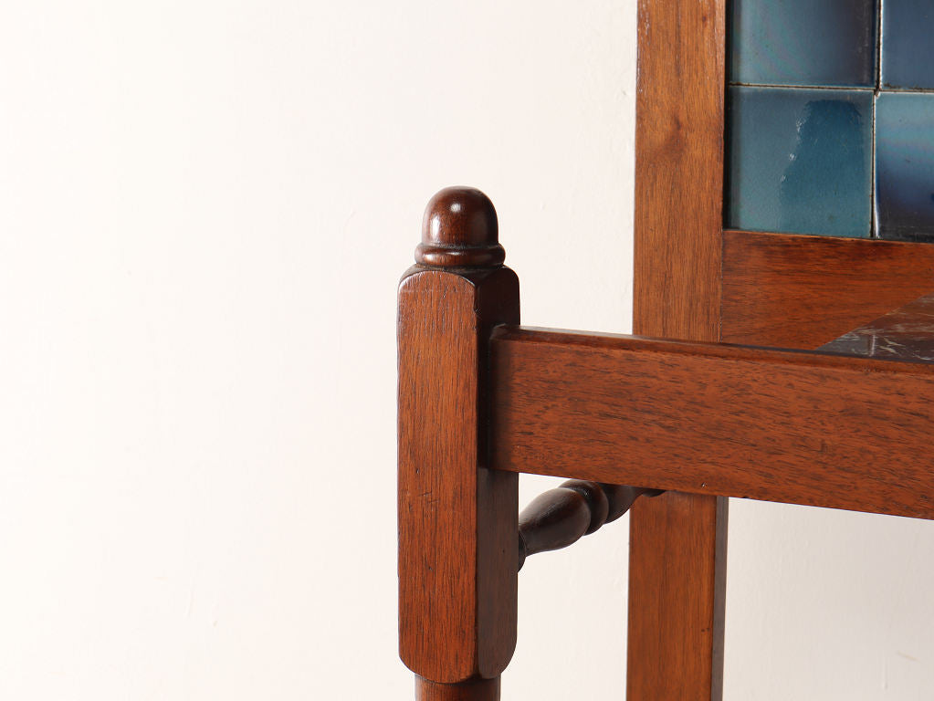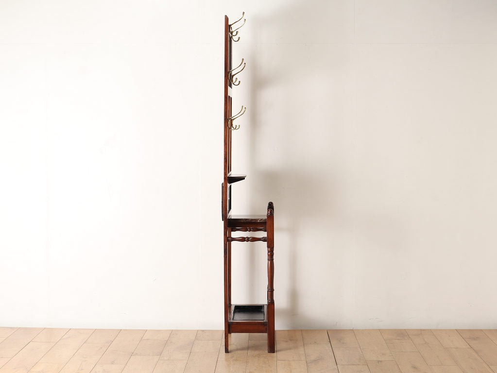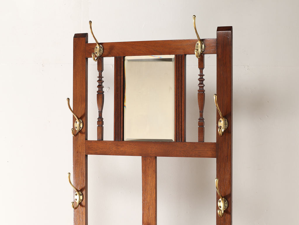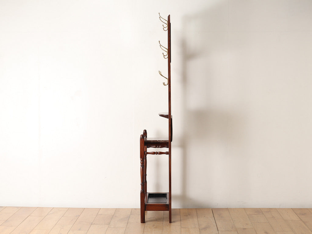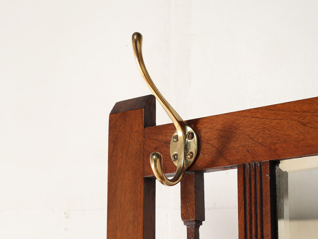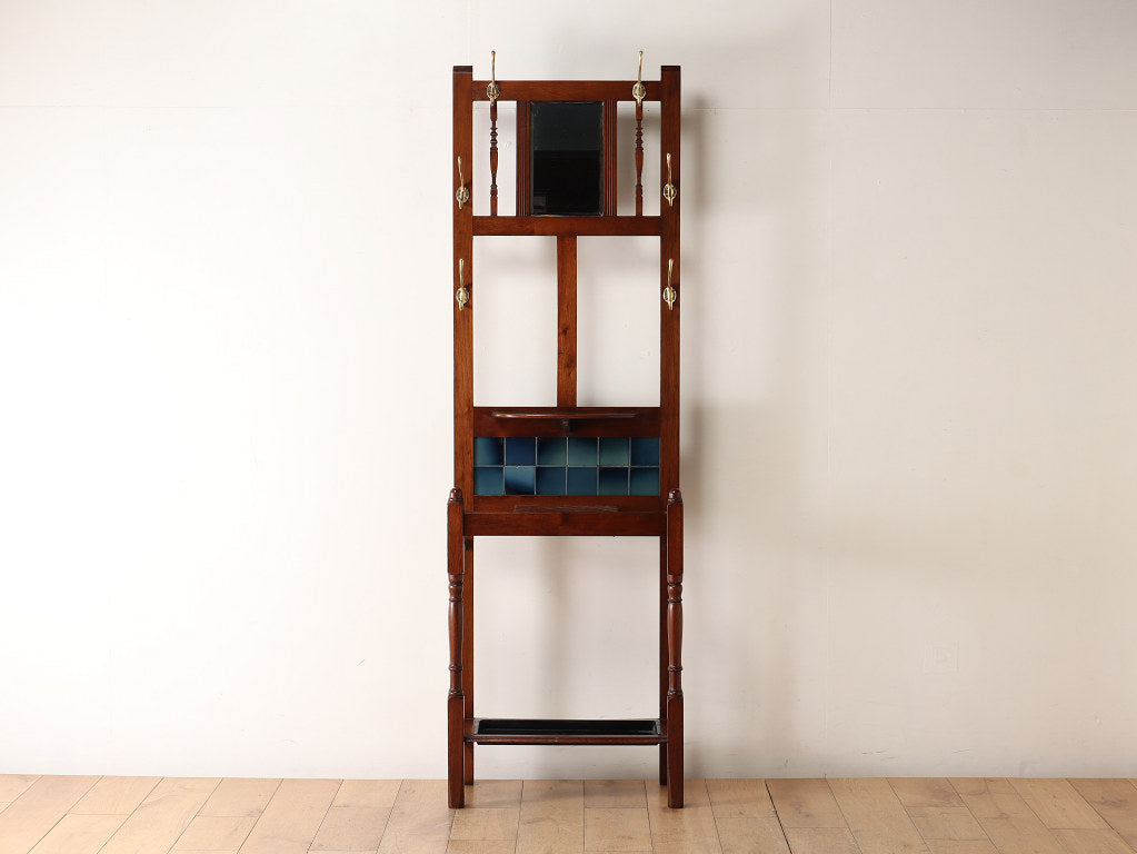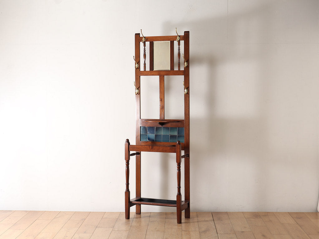 当時のイギリスでは玄関ホールの定番として置かれていたホールスタンド。様々なタイプがありますが、こちらは四角いミラーとブルーのタイルがアクセントとなっています。外出前に身支度をチェックできるだけでなく、フックが施されているため、帽子やコートを掛けたり、ディスプレイとしても活躍します。比較的奥行きが浅く、スペースの限られる玄関にぴったりの一台です。