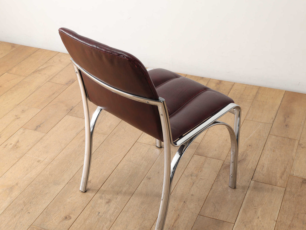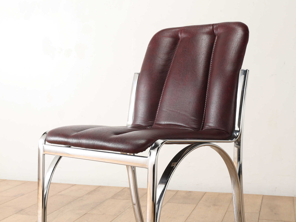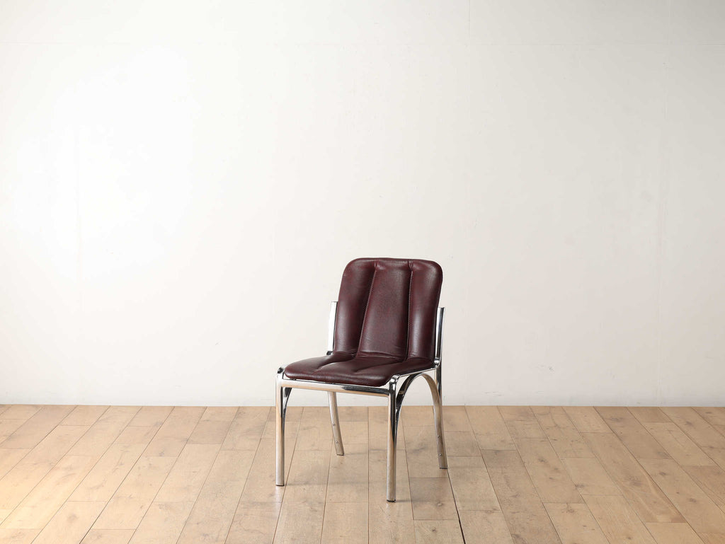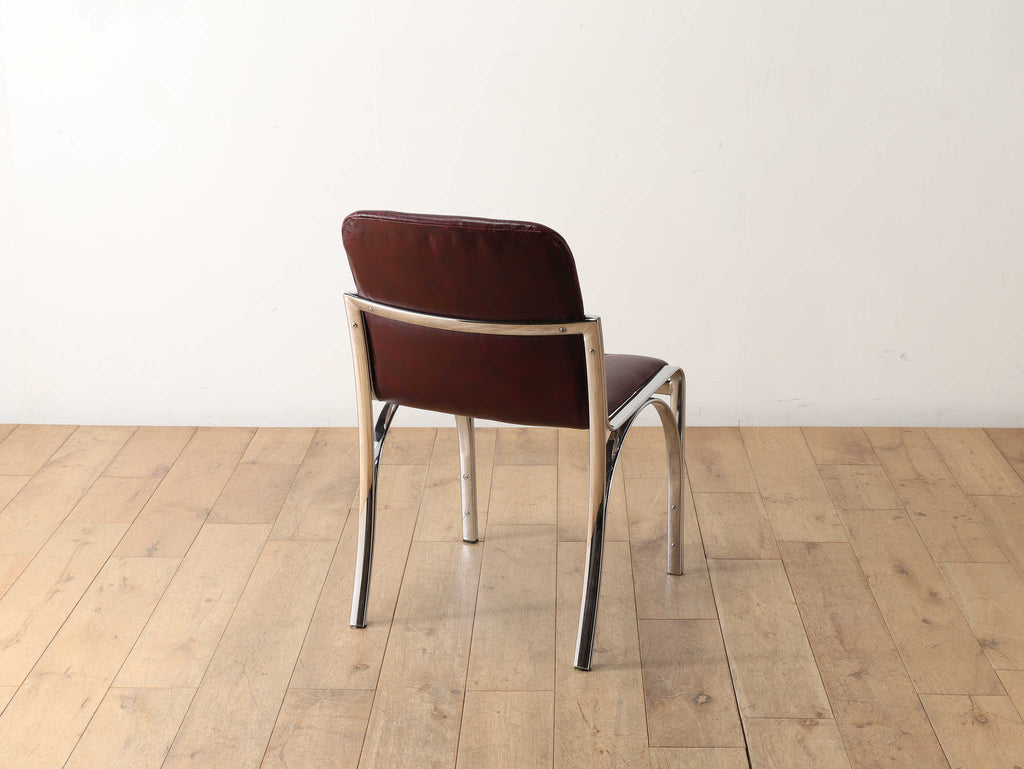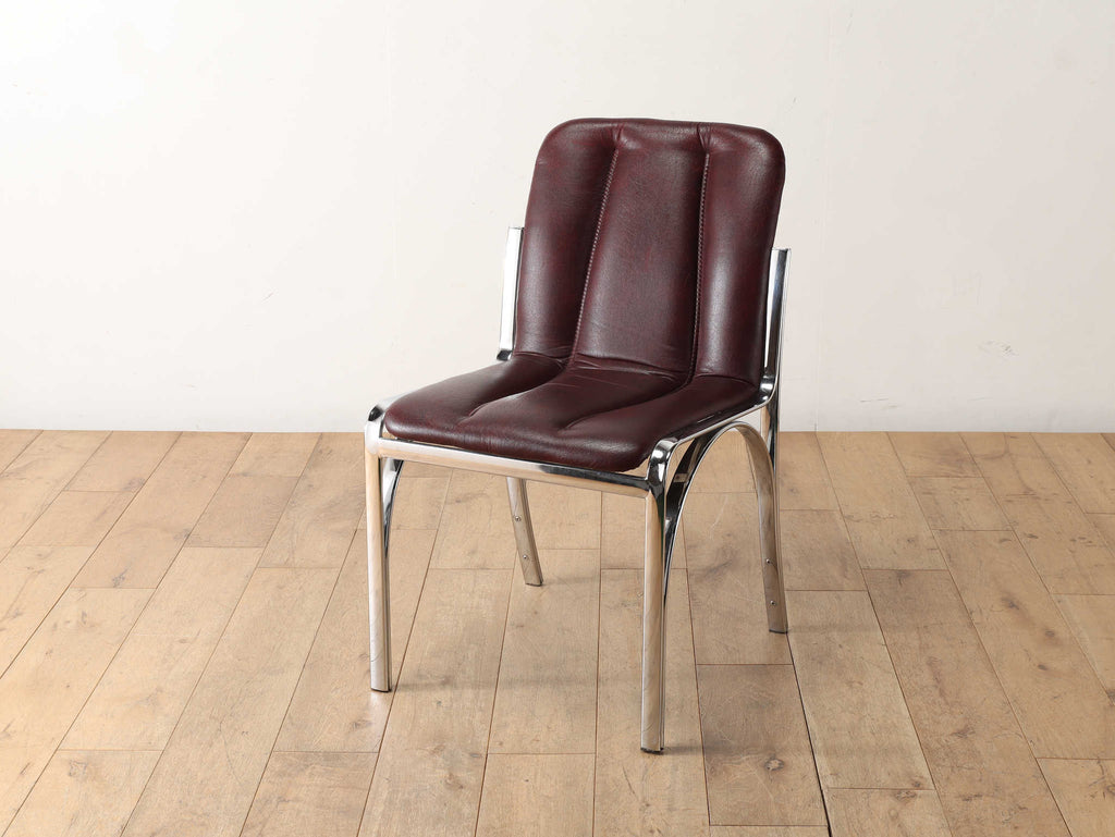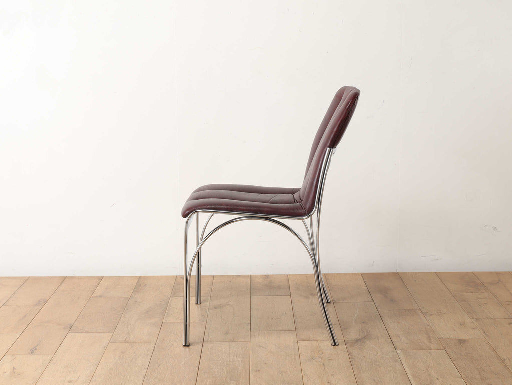 メタルフレームのダイニングチェアです。背と座のレザーの重厚な雰囲気の中に、サイドからみると足元のアーチ状のデザインが特徴的で、魅力的な一点です。クールな印象が強いメタル家具ですが、こちらのチェアは曲線が入っていることによって柔らかさがプラスされたアイテムです。ガラストップのテーブルはもちろん、ウッド天板のテーブルにこのような異素材を使用しているチェアを取り入れる事もおすすめです。