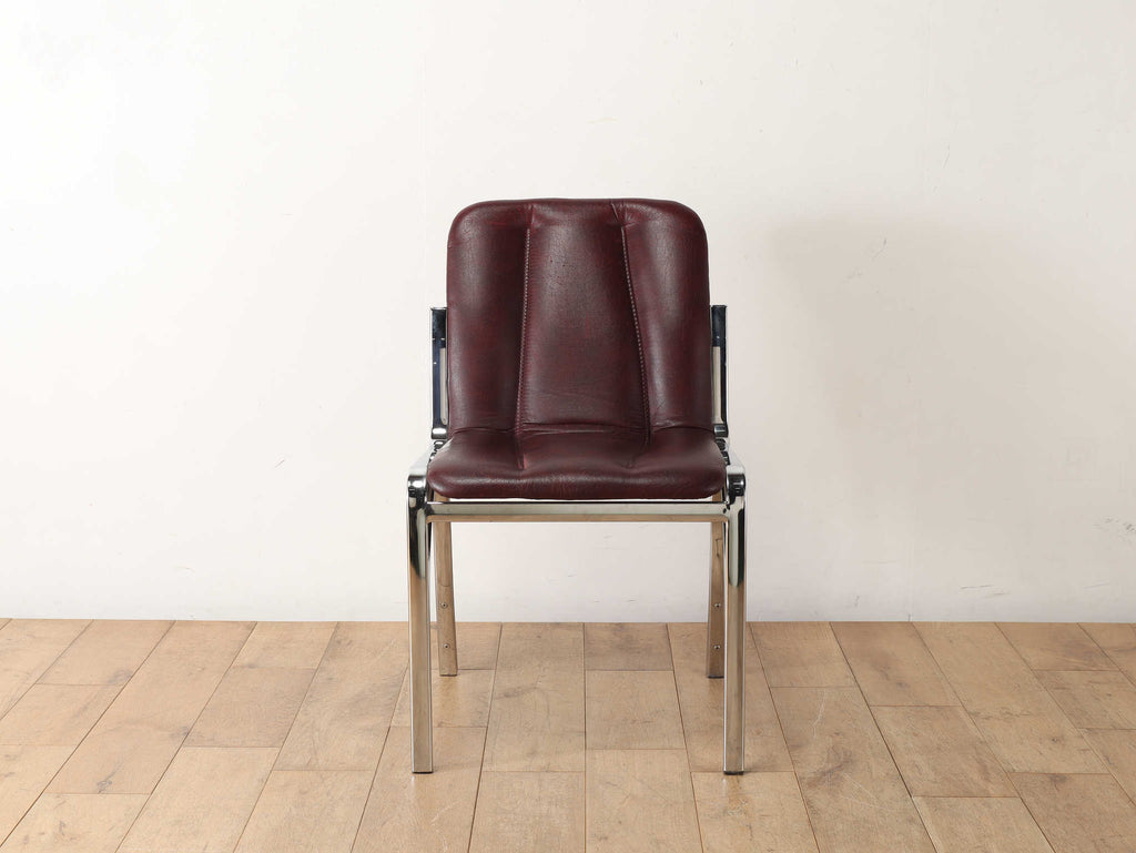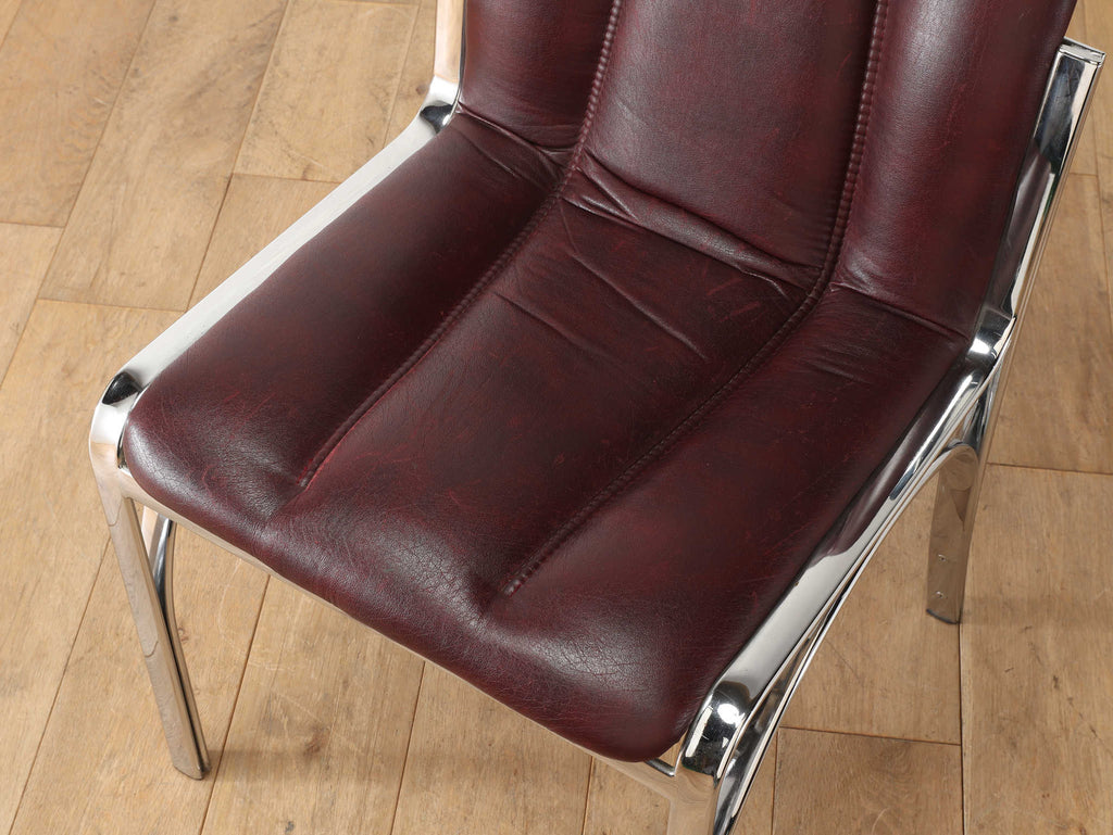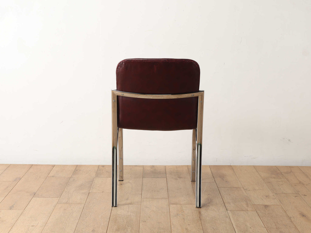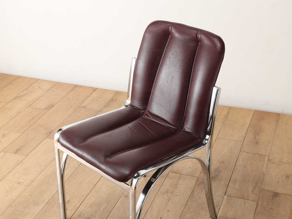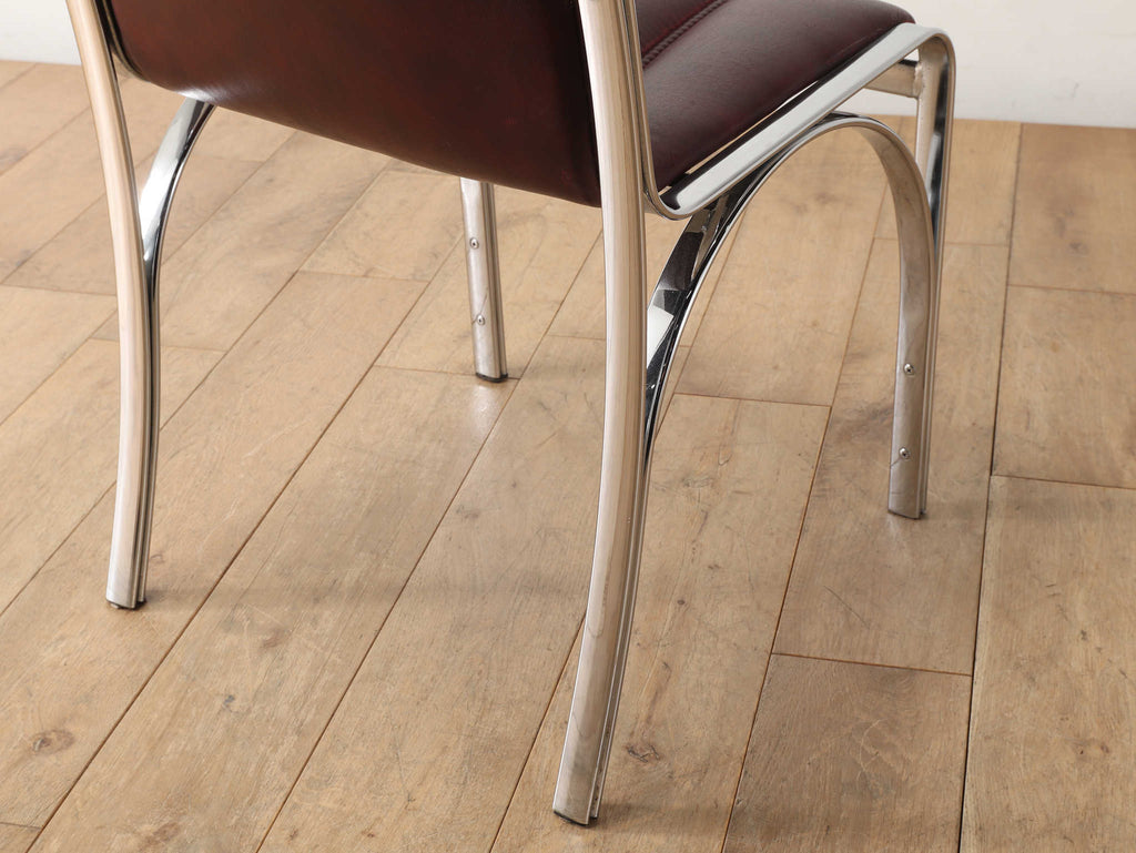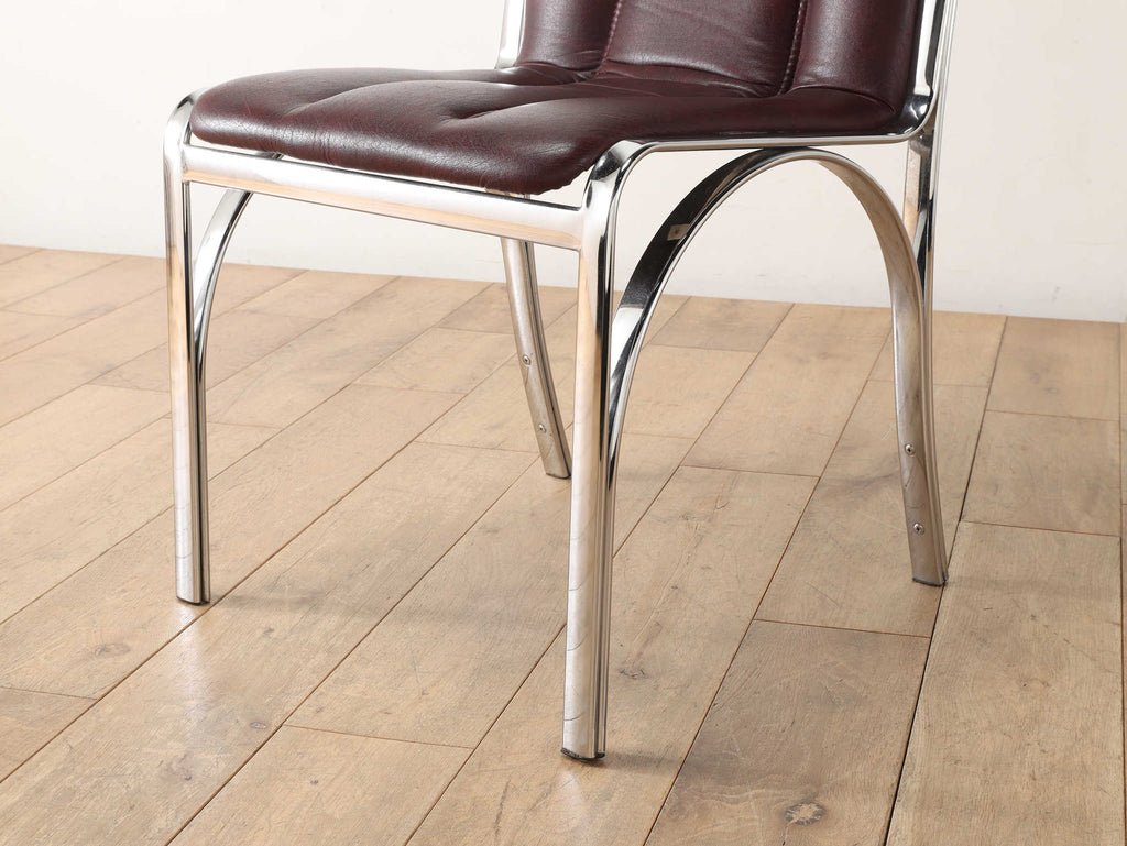 メタルフレームのダイニングチェアです。背と座のレザーの重厚な雰囲気の中に、サイドからみると足元のアーチ状のデザインが特徴的で、魅力的な一点です。クールな印象が強いメタル家具ですが、こちらのチェアは曲線が入っていることによって柔らかさがプラスされたアイテムです。ガラストップのテーブルはもちろん、ウッド天板のテーブルにこのような異素材を使用しているチェアを取り入れる事もおすすめです。