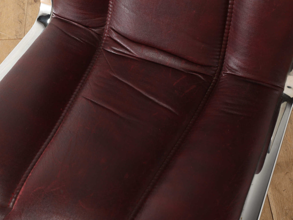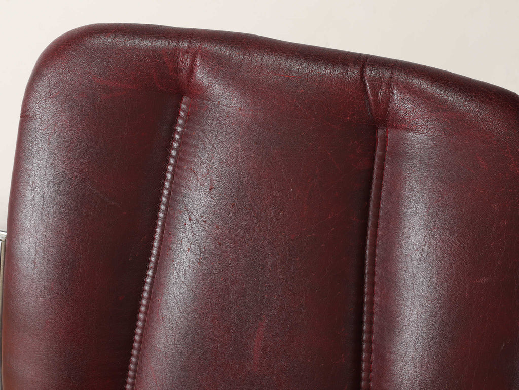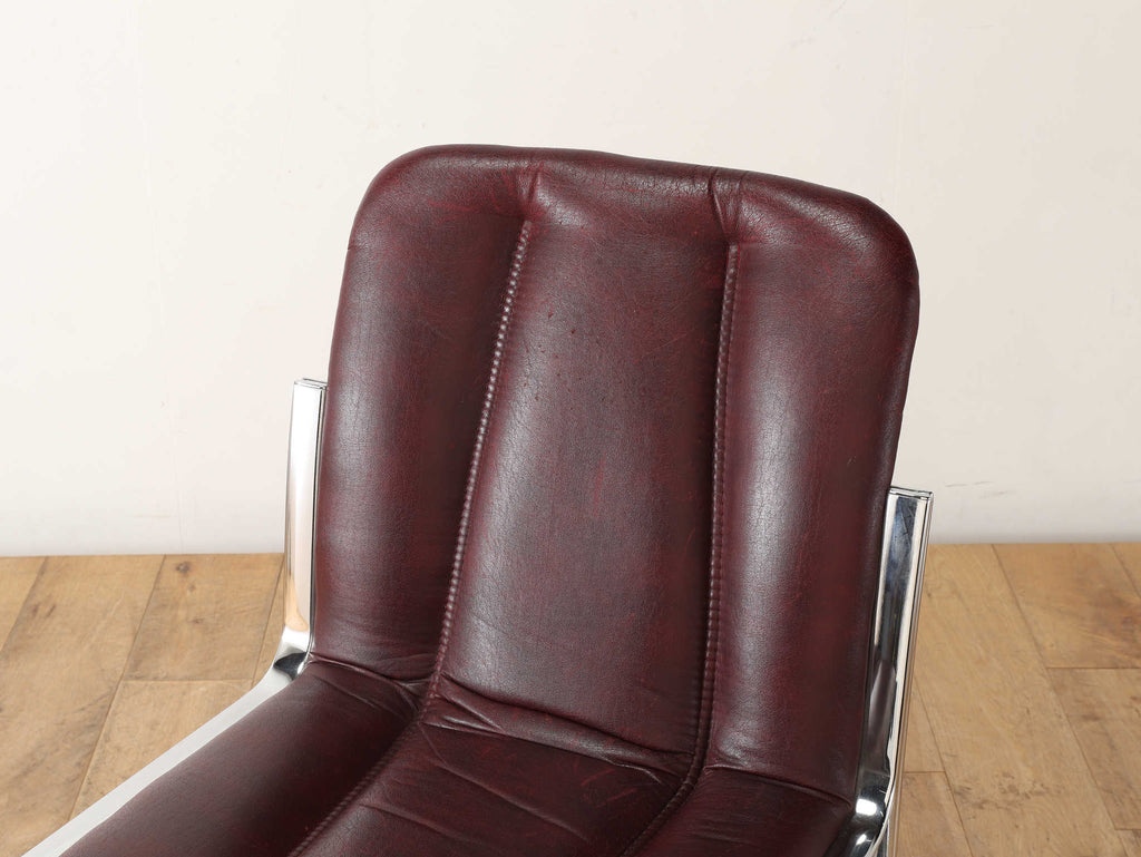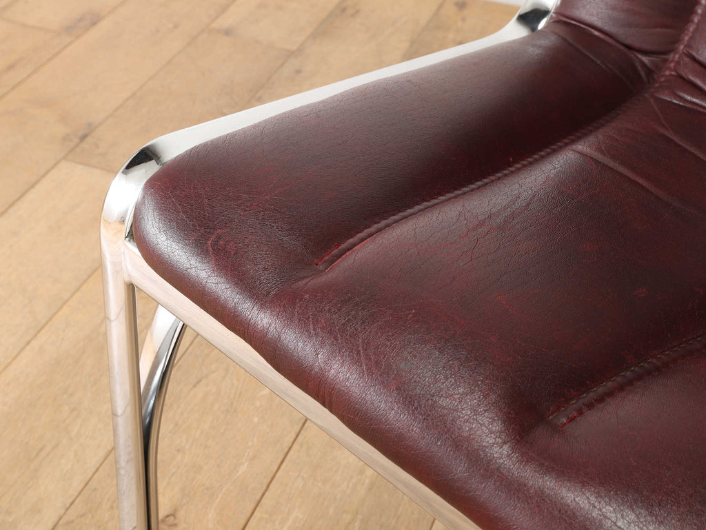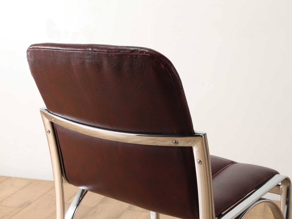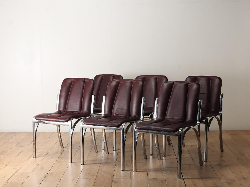 メタルフレームのダイニングチェアです。背と座のレザーの重厚な雰囲気の中に、サイドからみると足元のアーチ状のデザインが特徴的で、魅力的な一点です。クールな印象が強いメタル家具ですが、こちらのチェアは曲線が入っていることによって柔らかさがプラスされたアイテムです。ガラストップのテーブルはもちろん、ウッド天板のテーブルにこのような異素材を使用しているチェアを取り入れる事もおすすめです。