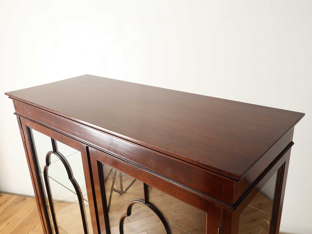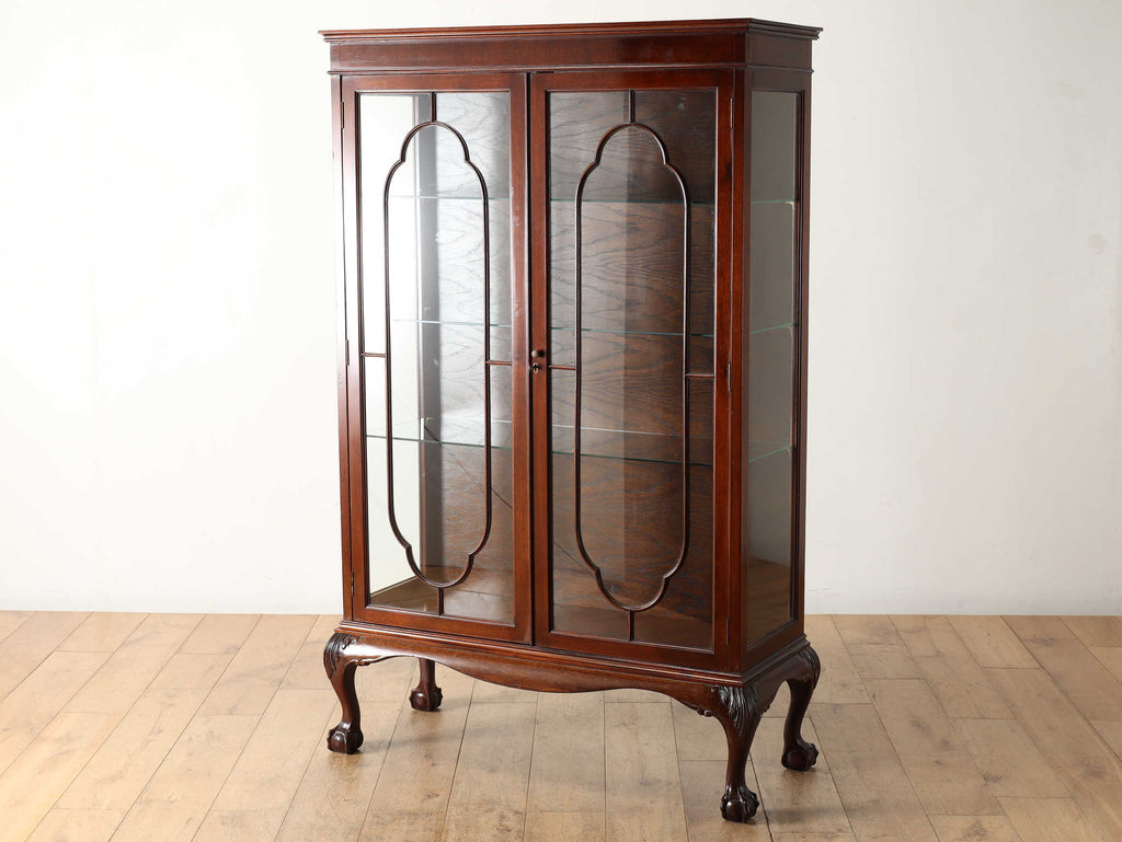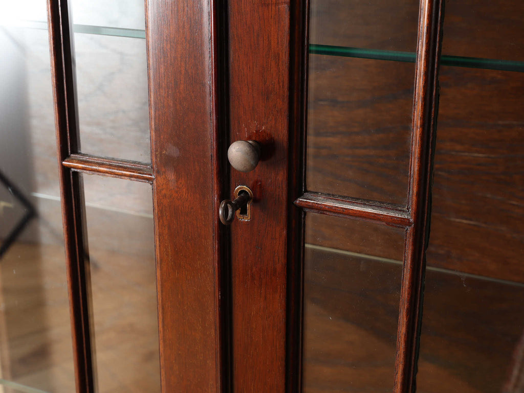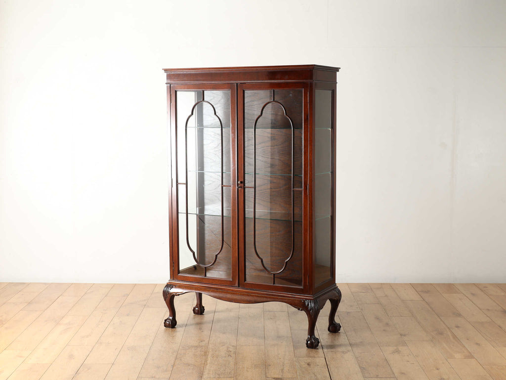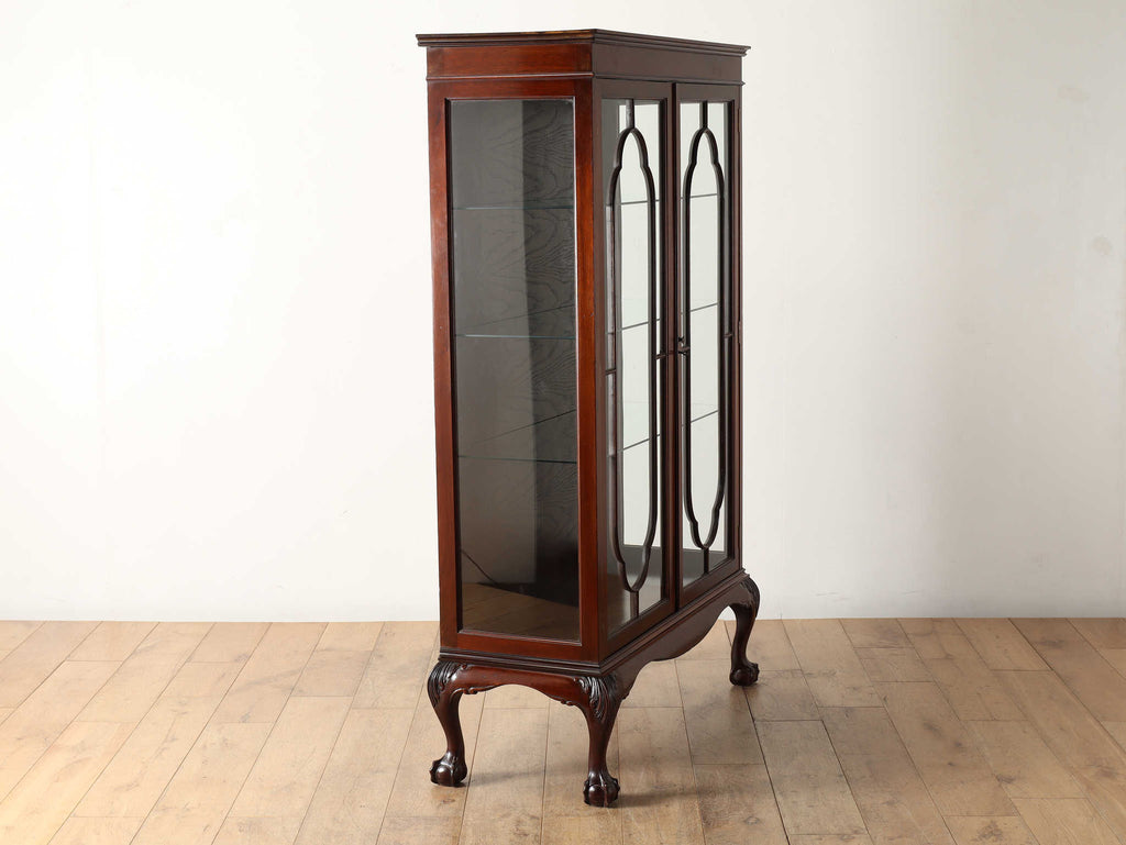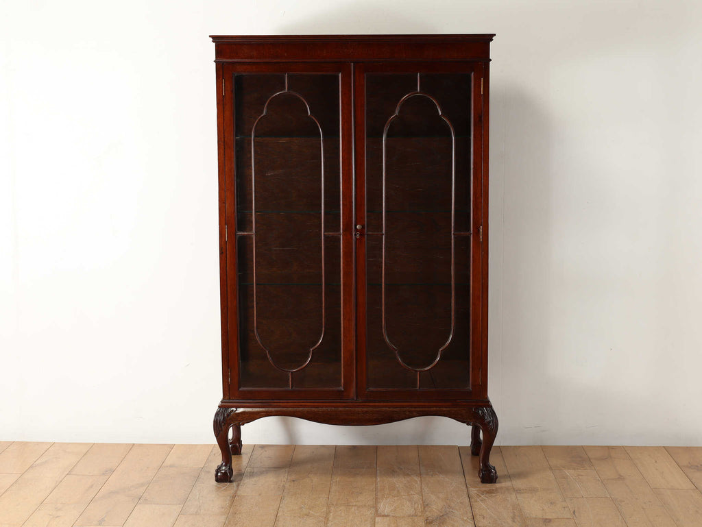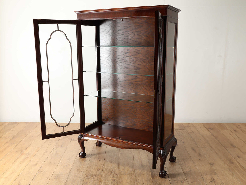 1910年頃のイギリスで製作されたディスプレイキャビネット。1910年代に、アールデコというシンプルで合理的な、幾何学図形をモチーフにした直線的な表現が特徴の装飾美術が流行しました。こちらのディスプレイキャビネットのガラス扉にも、直線的な装飾が施されています。力強いB/Cの脚元と、上品なアールデコの装飾が組み合わさり、当時の流行を1つに凝縮された逸品です。コレクションなどで、お好きなようにキャビネットをデコレーションしてみてはいかがでしょうか。