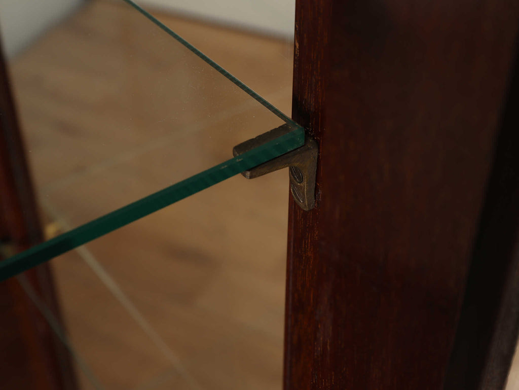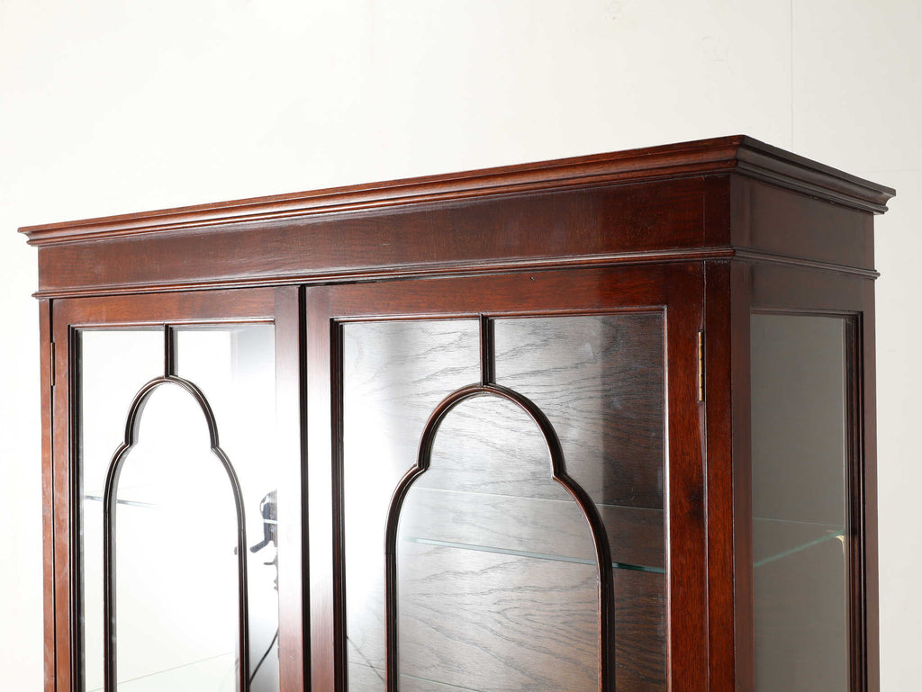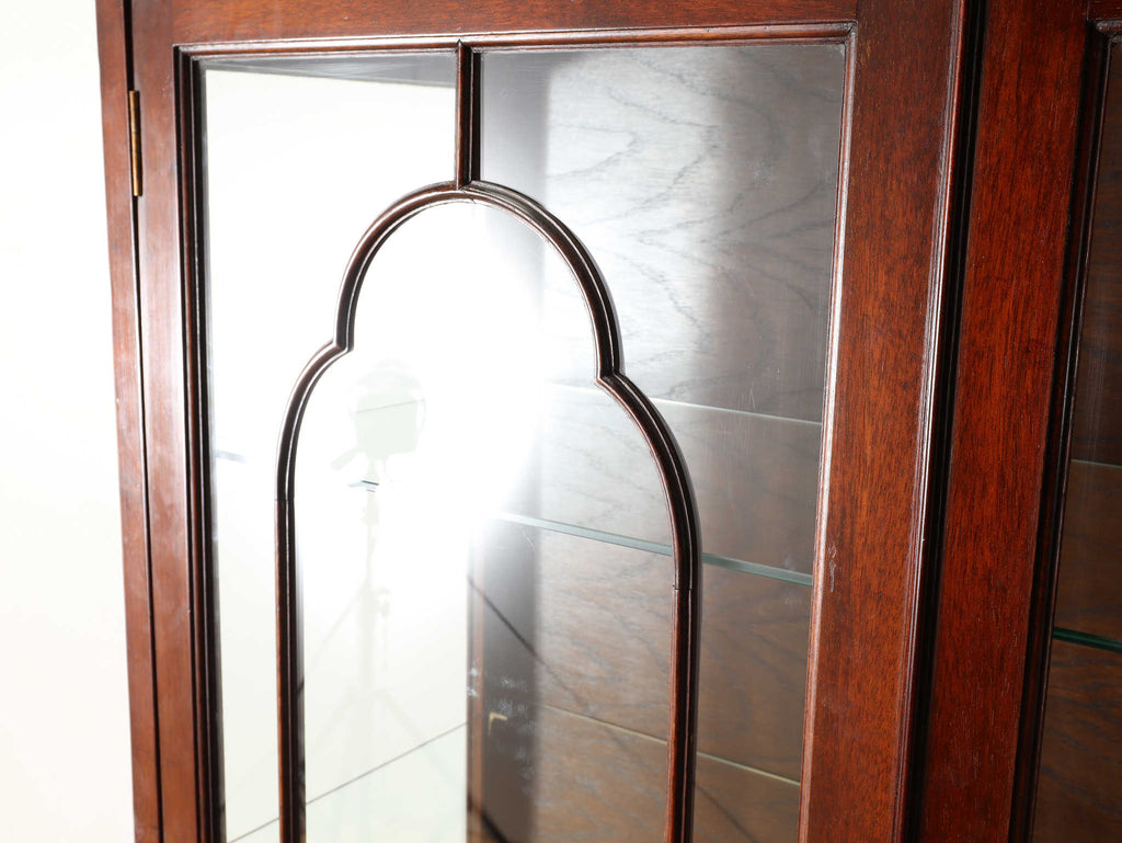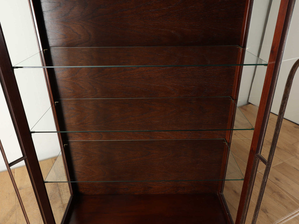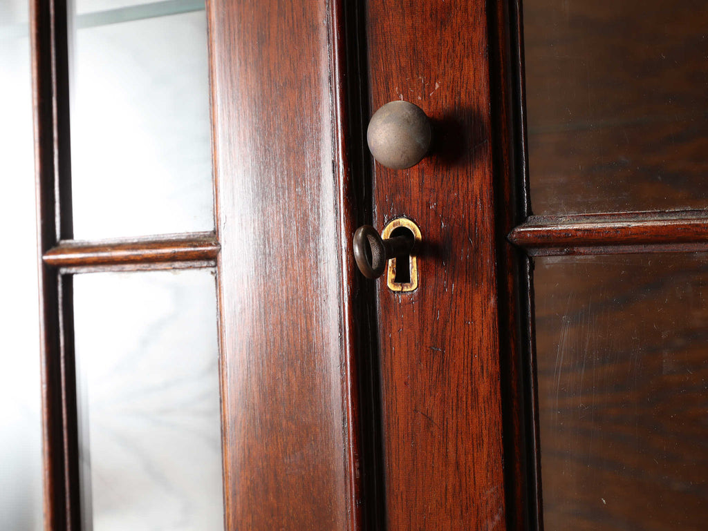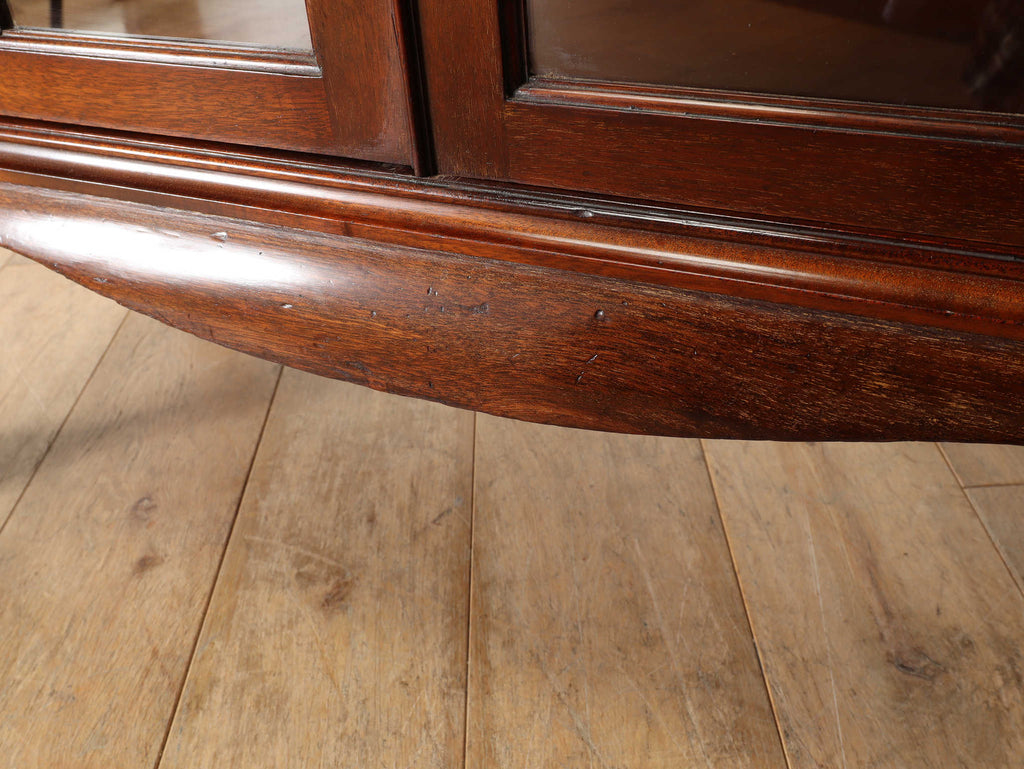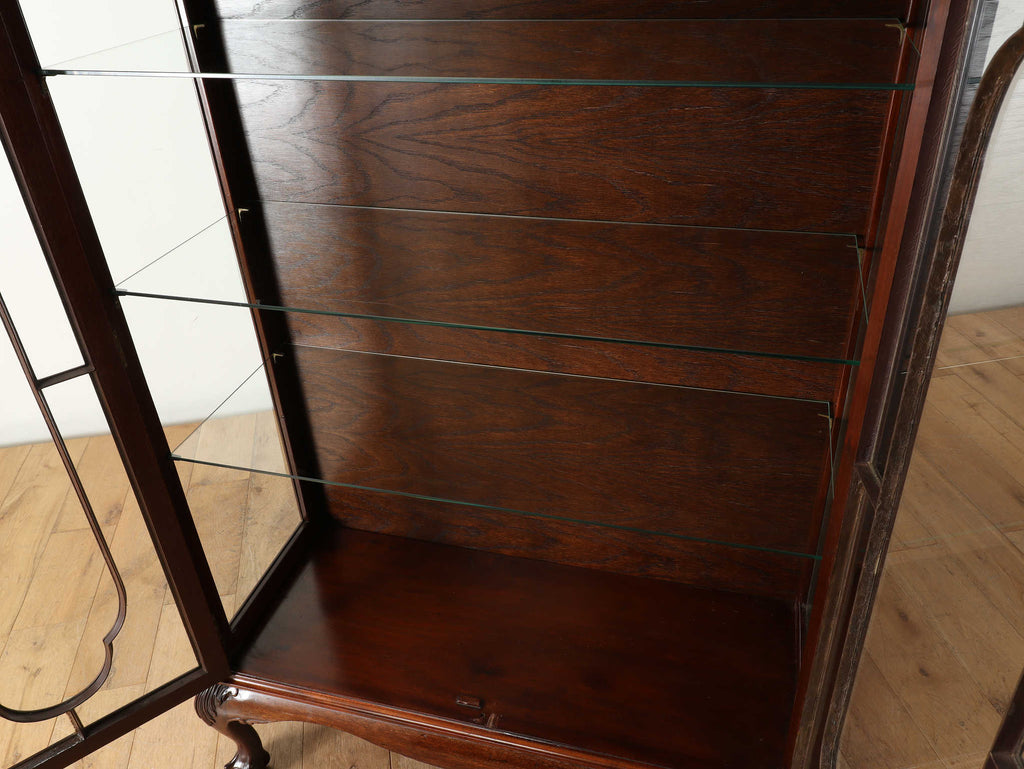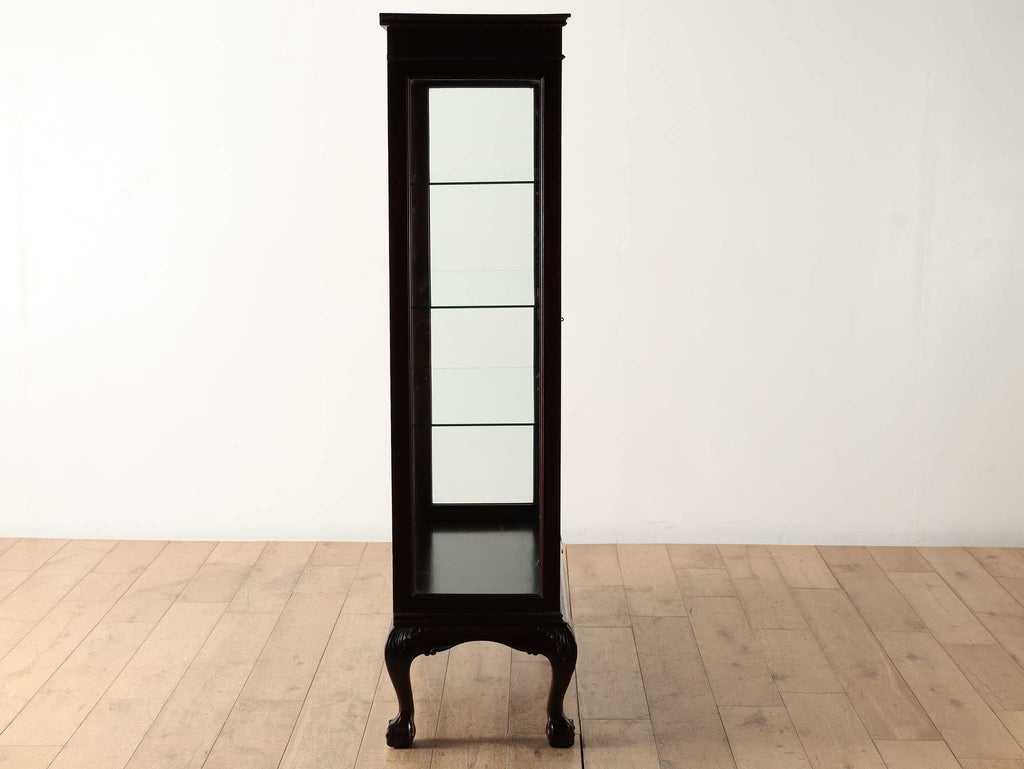 1910年頃のイギリスで製作されたディスプレイキャビネット。1910年代に、アールデコというシンプルで合理的な、幾何学図形をモチーフにした直線的な表現が特徴の装飾美術が流行しました。こちらのディスプレイキャビネットのガラス扉にも、直線的な装飾が施されています。力強いB/Cの脚元と、上品なアールデコの装飾が組み合わさり、当時の流行を1つに凝縮された逸品です。コレクションなどで、お好きなようにキャビネットをデコレーションしてみてはいかがでしょうか。