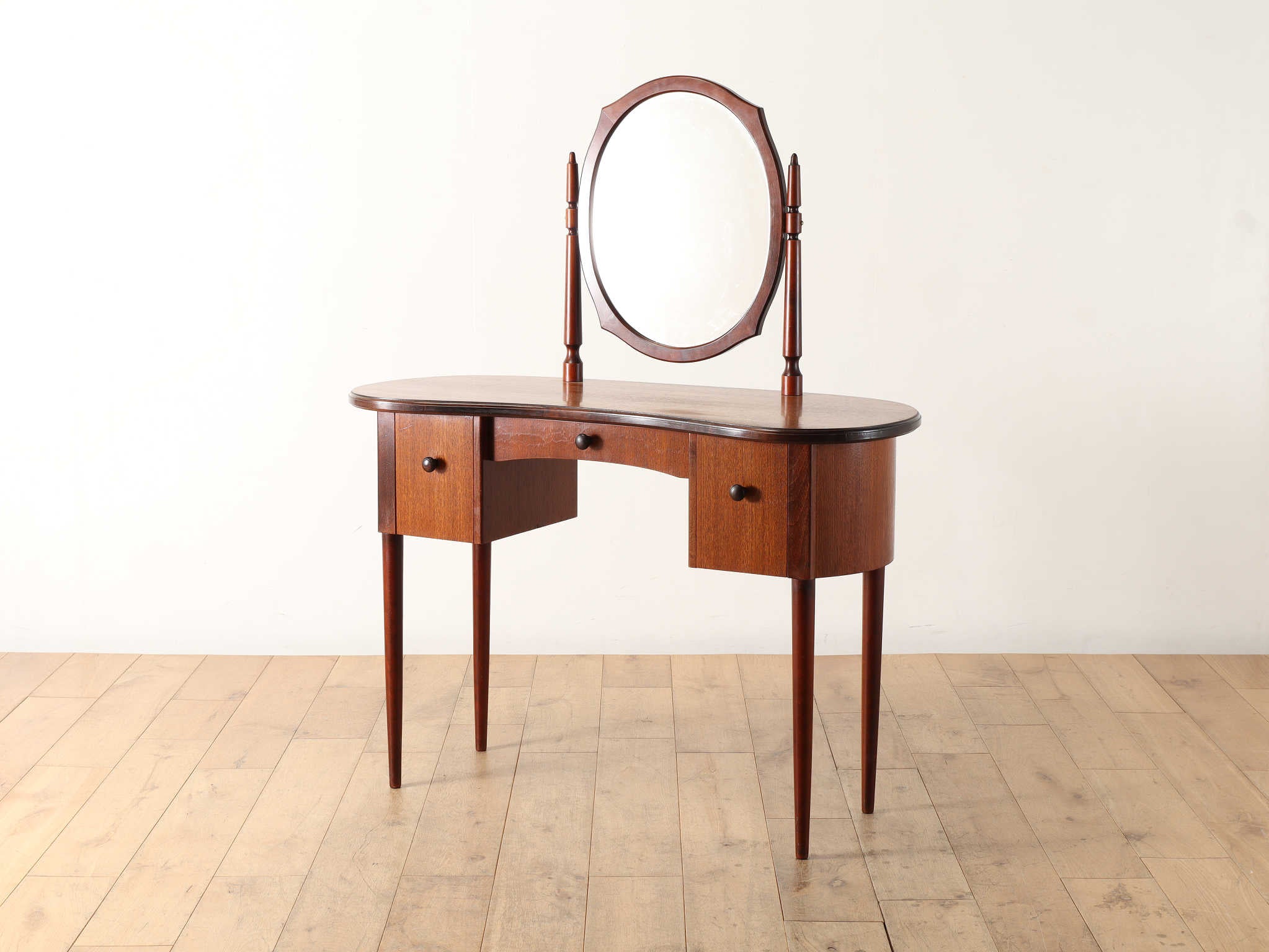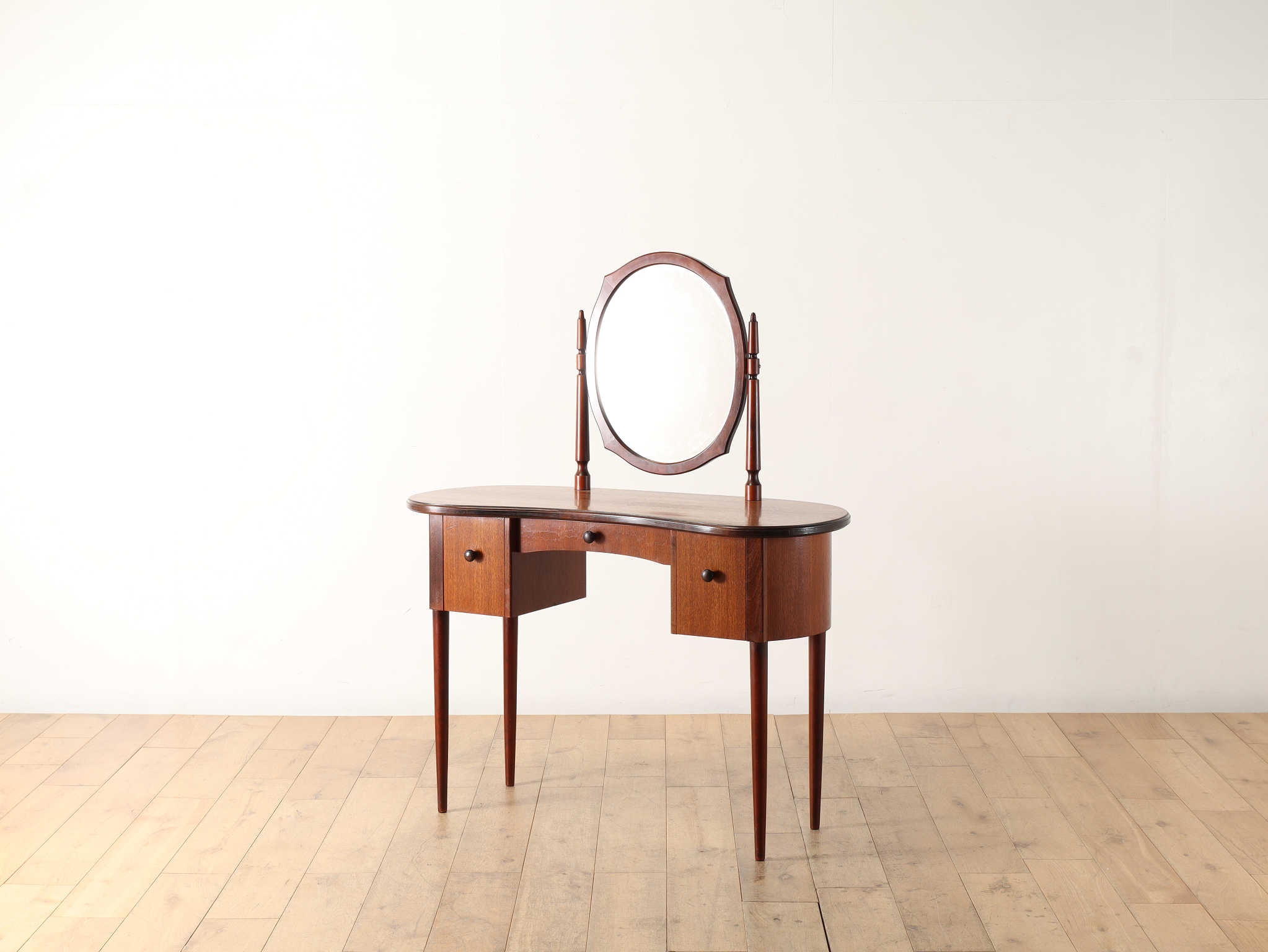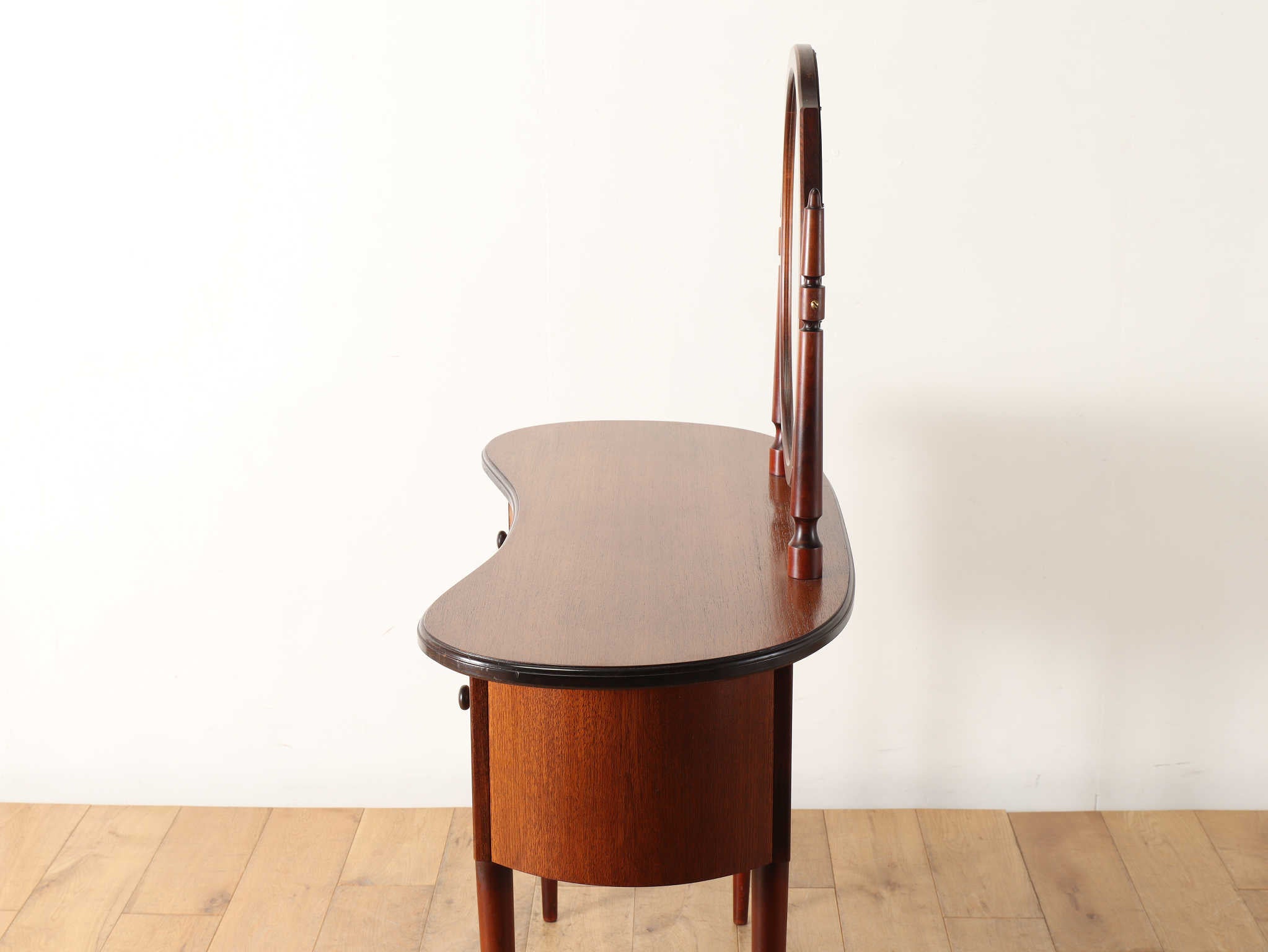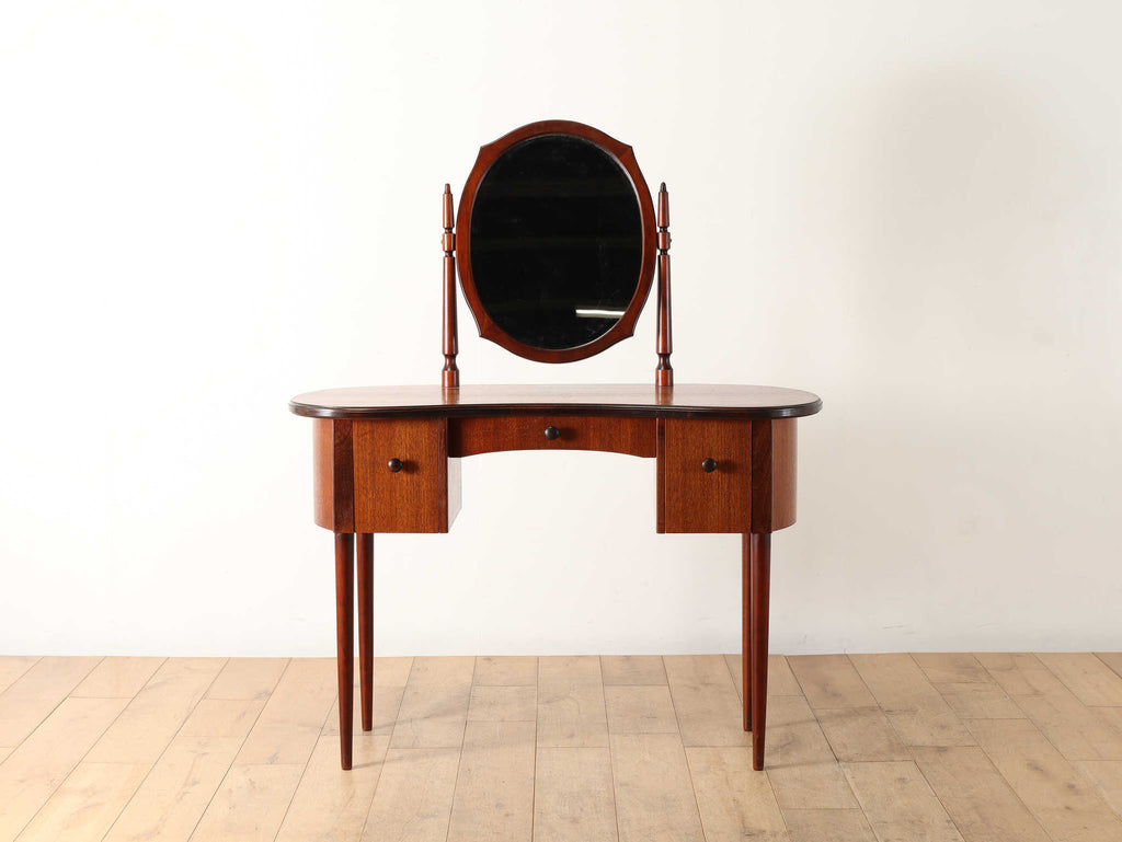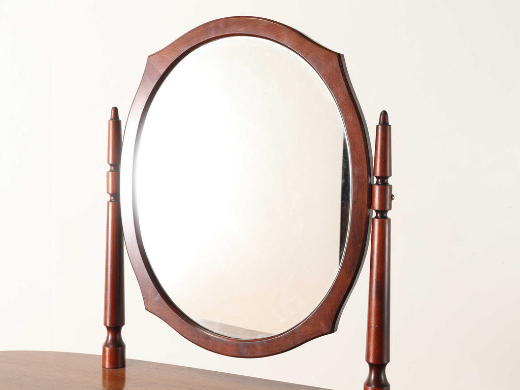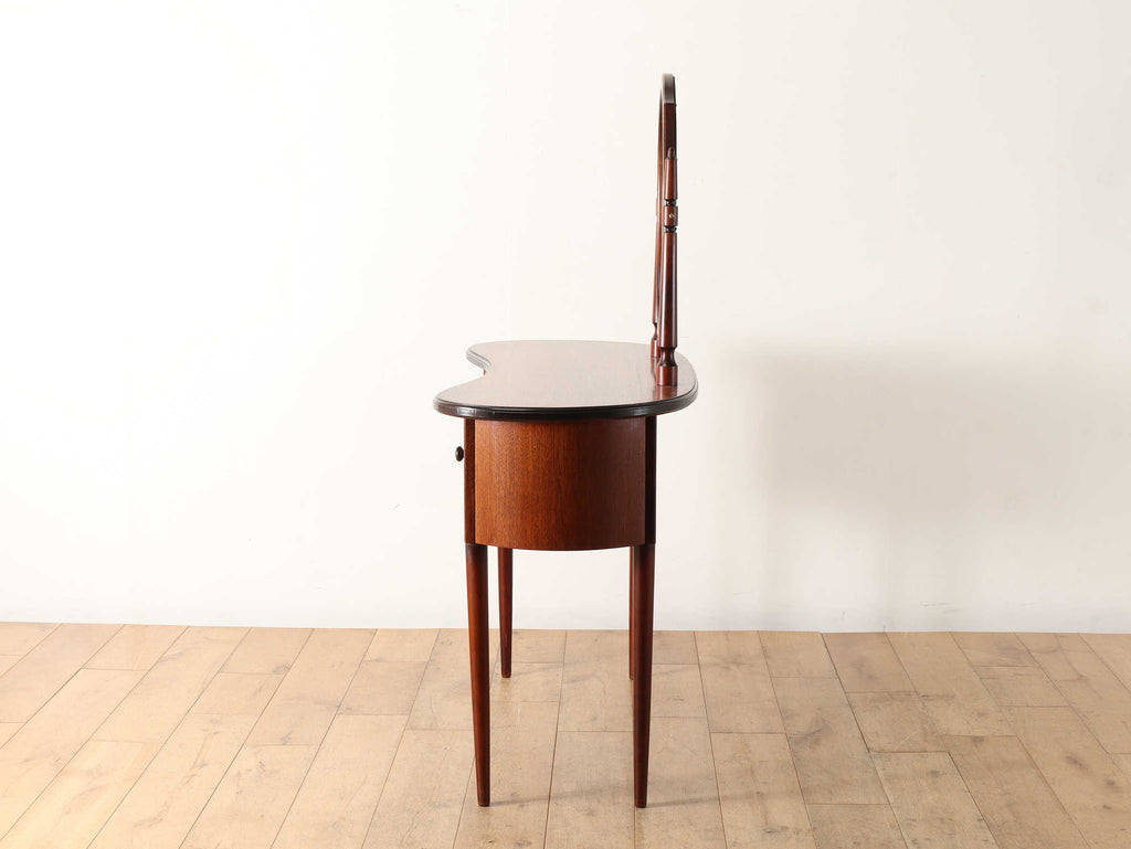 マホガニー材を使用したスウェーデン製(推定)のドレッサーです。北欧アイテムでマホガニー材を使用したアイテムは珍しく、北欧らしいシンプルなデザインの中に、深みのあるマホガニーの色味が奥深さを感じさせてくれる逸品です。鏡部分の特徴的なデザインは寝室だけではなくリビングに置いていただいても遜色ないデザイン性の高さが伺えます。