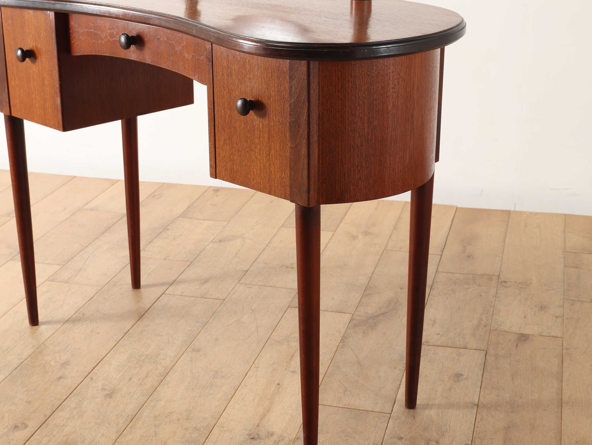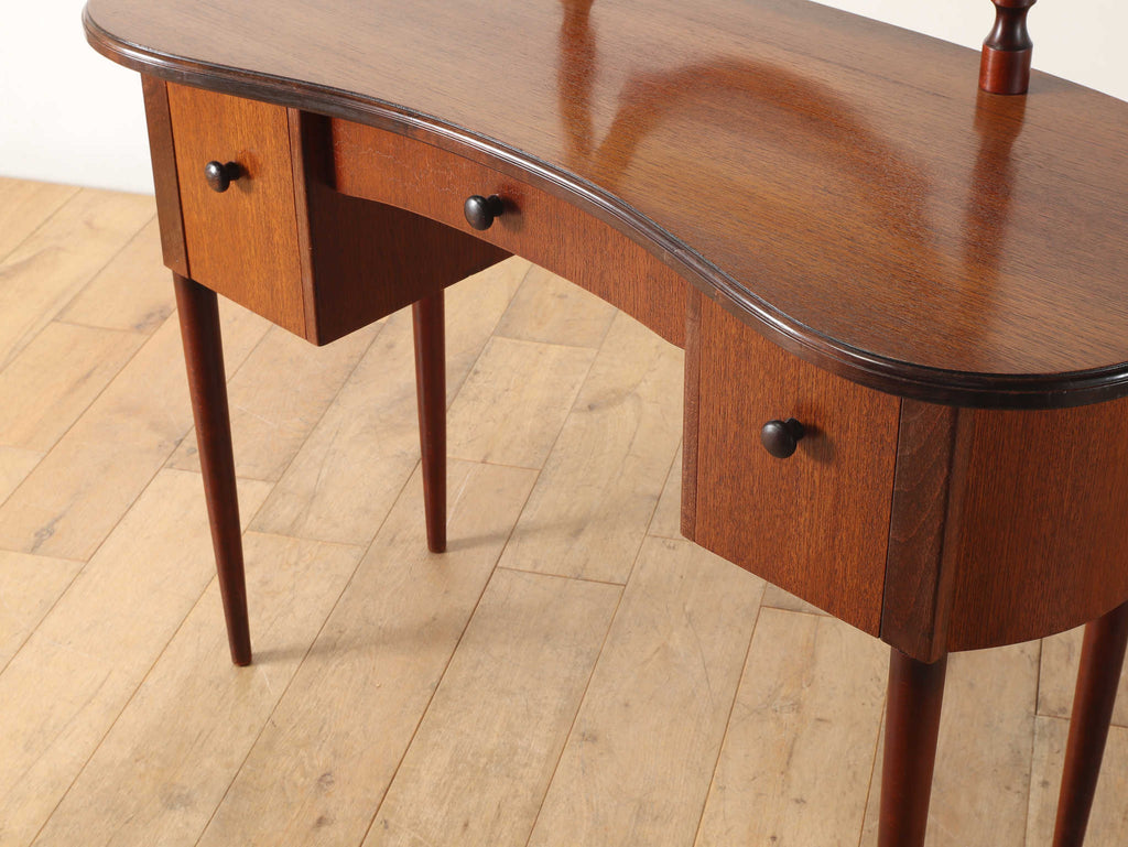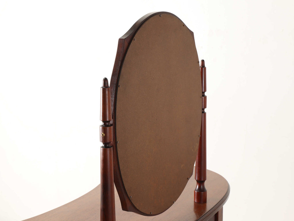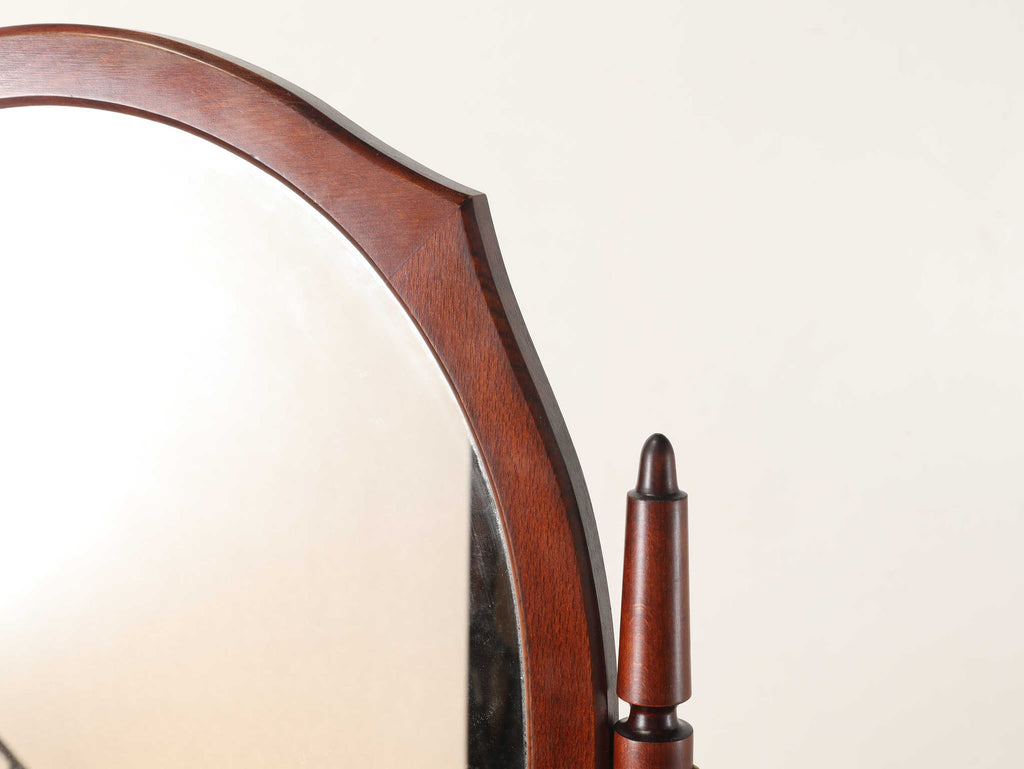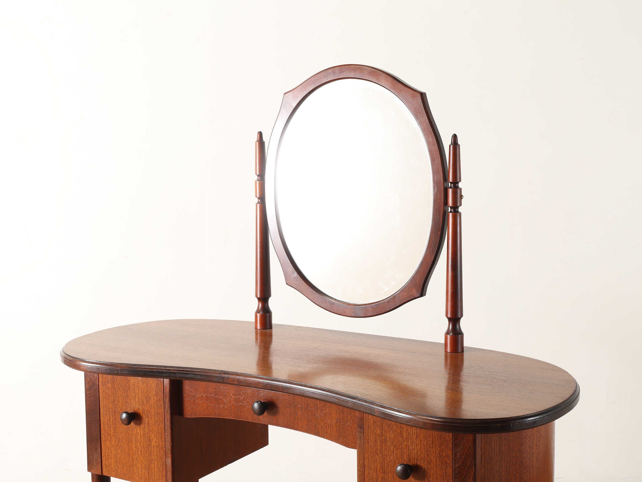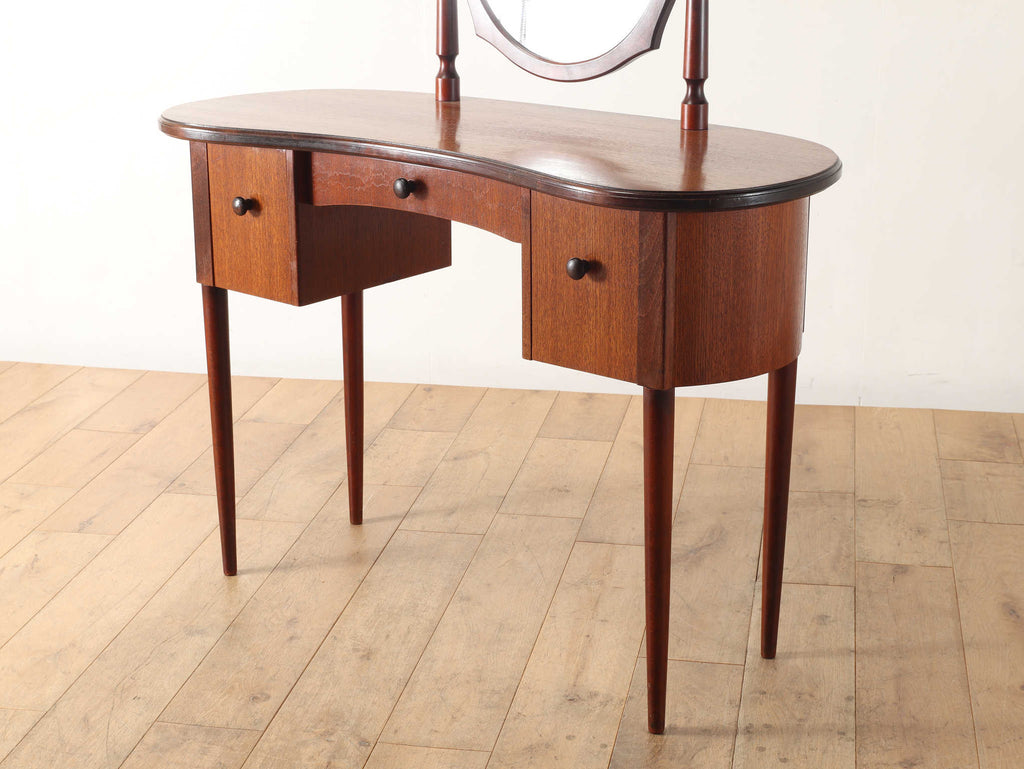マホガニー材を使用したスウェーデン製(推定)のドレッサーです。北欧アイテムでマホガニー材を使用したアイテムは珍しく、北欧らしいシンプルなデザインの中に、深みのあるマホガニーの色味が奥深さを感じさせてくれる逸品です。鏡部分の特徴的なデザインは寝室だけではなくリビングに置いていただいても遜色ないデザイン性の高さが伺えます。