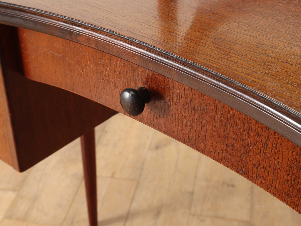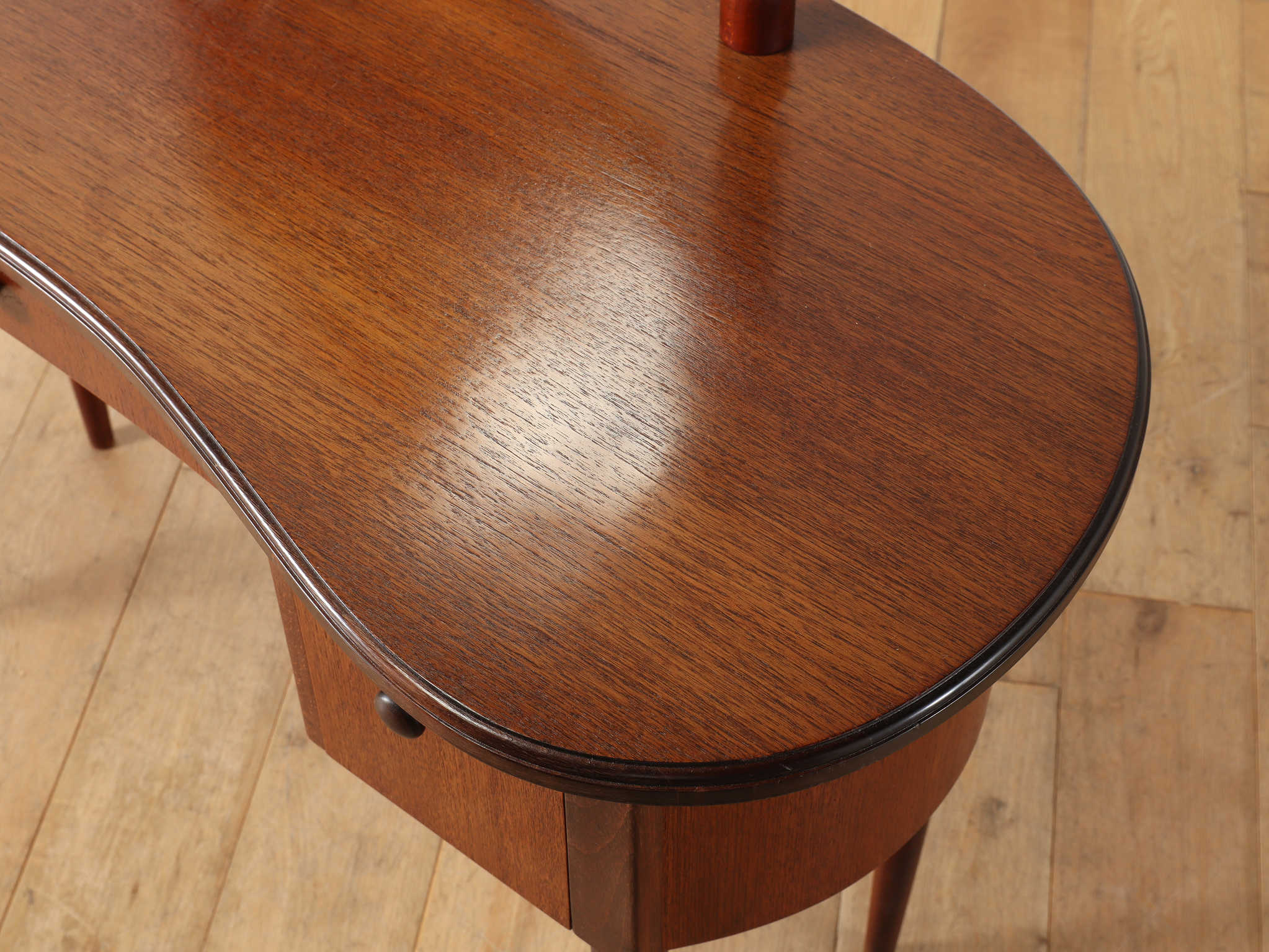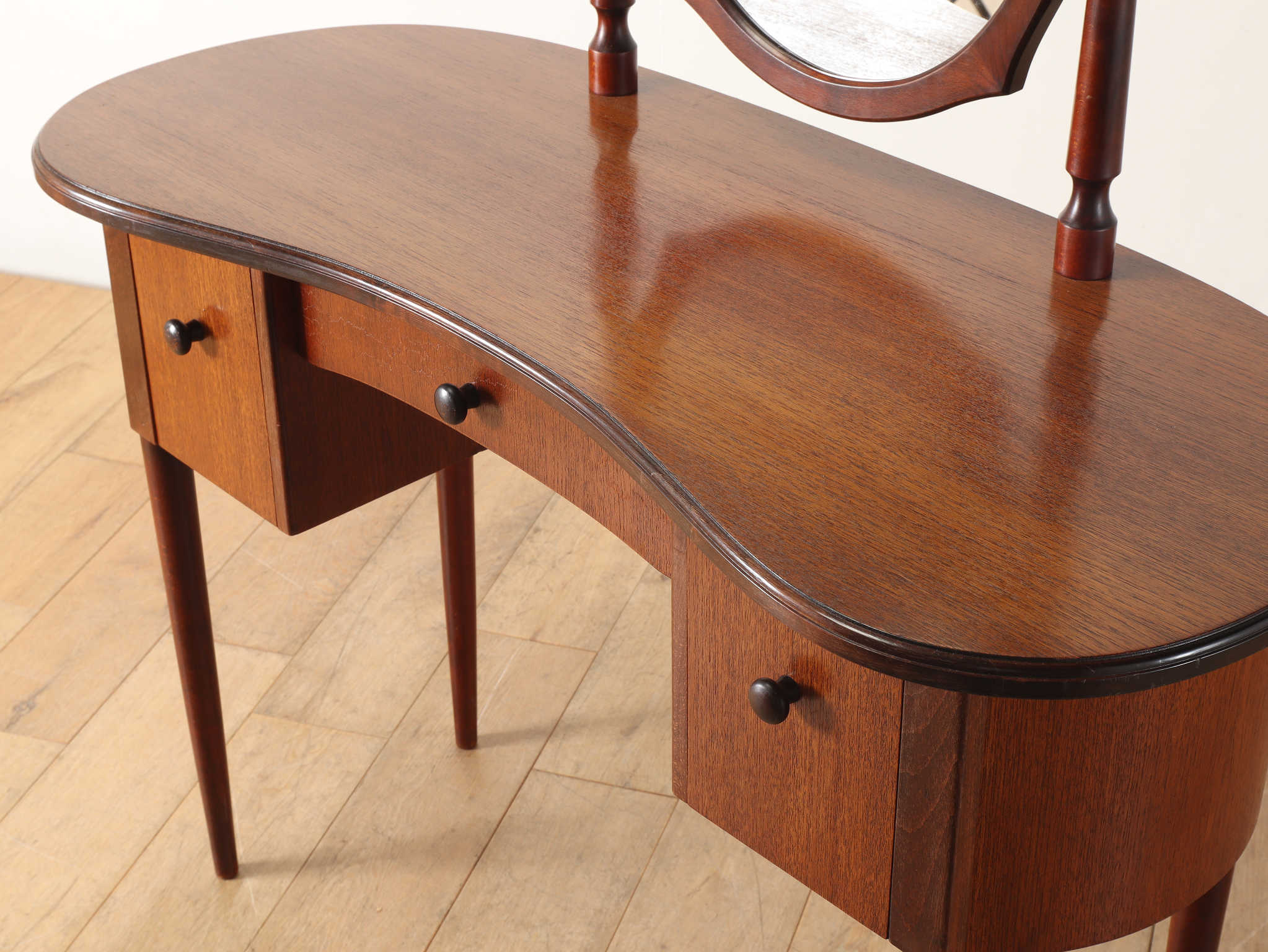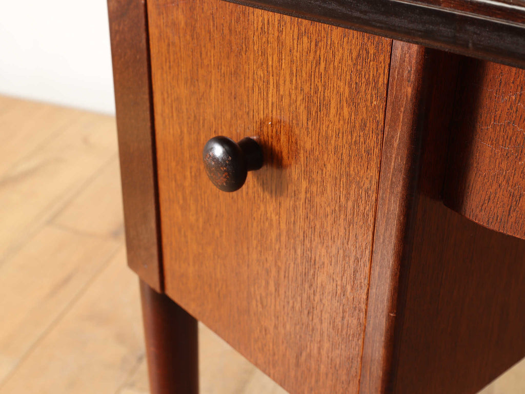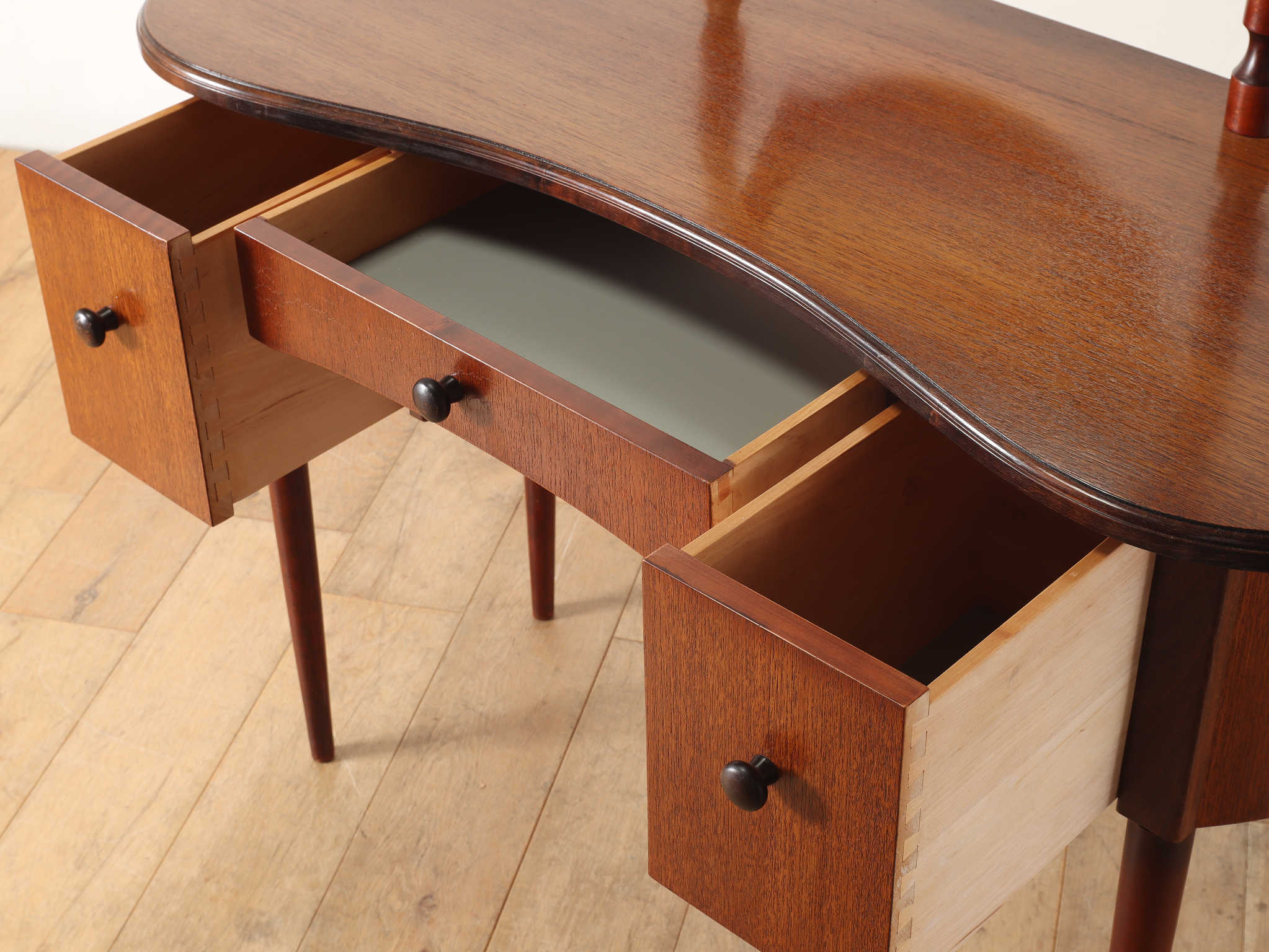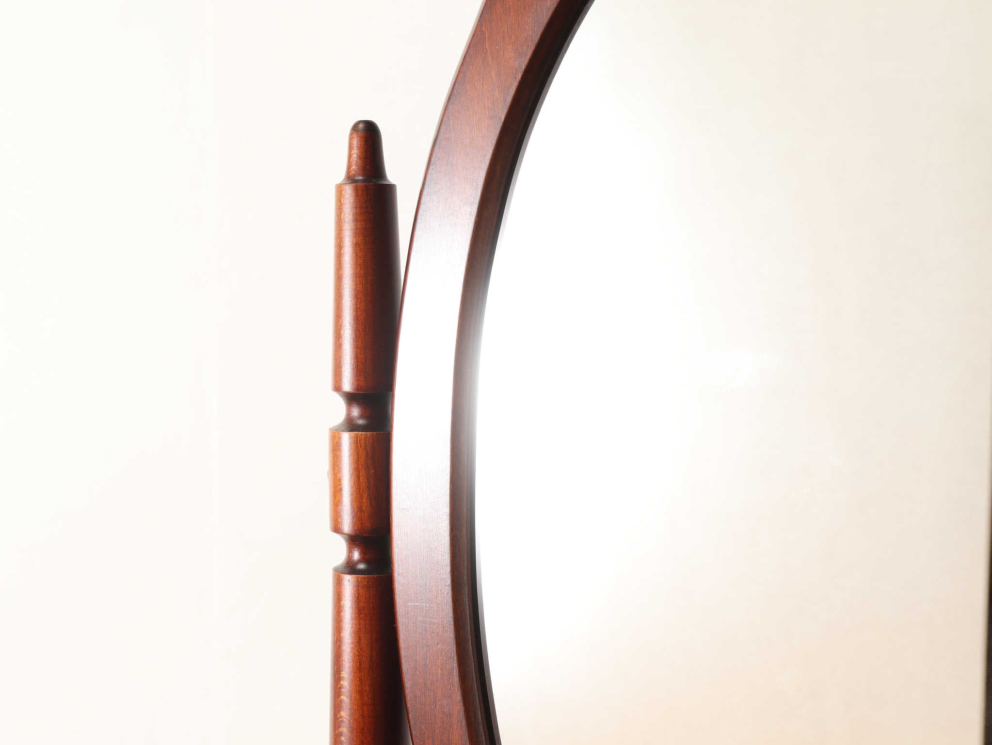 マホガニー材を使用したスウェーデン製(推定)のドレッサーです。北欧アイテムでマホガニー材を使用したアイテムは珍しく、北欧らしいシンプルなデザインの中に、深みのあるマホガニーの色味が奥深さを感じさせてくれる逸品です。鏡部分の特徴的なデザインは寝室だけではなくリビングに置いていただいても遜色ないデザイン性の高さが伺えます。