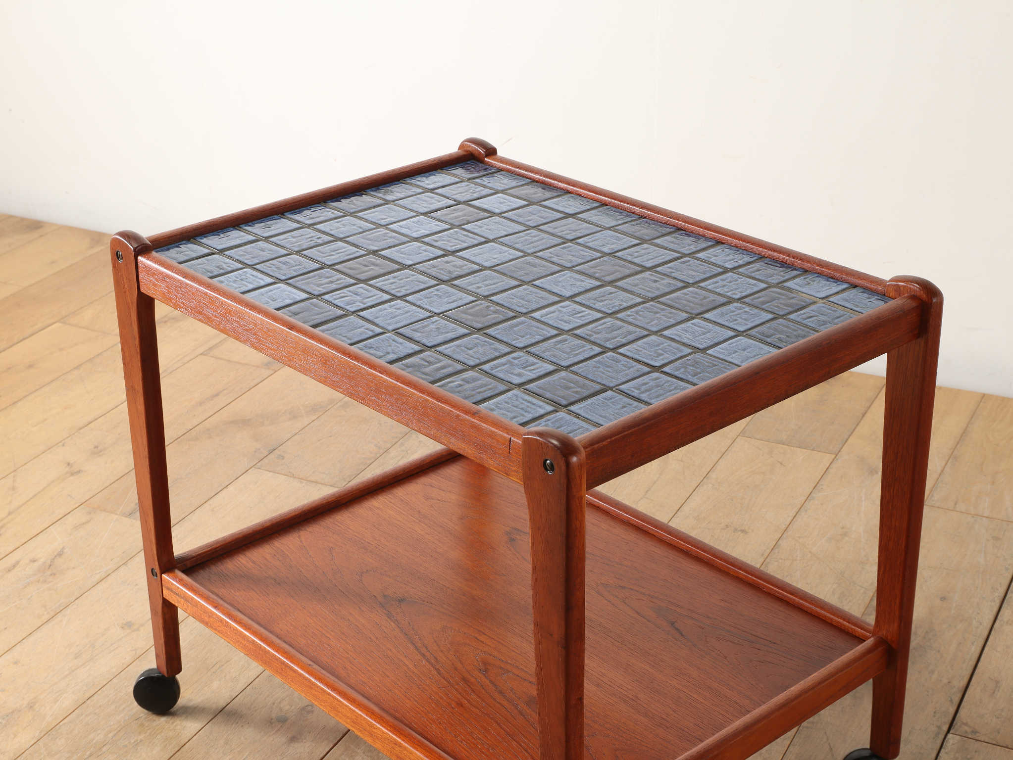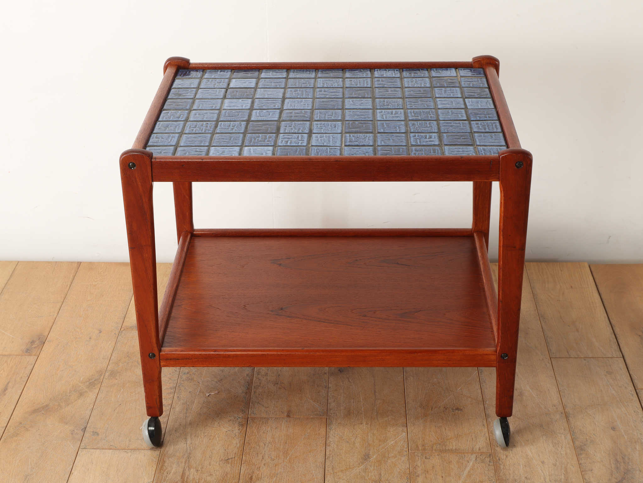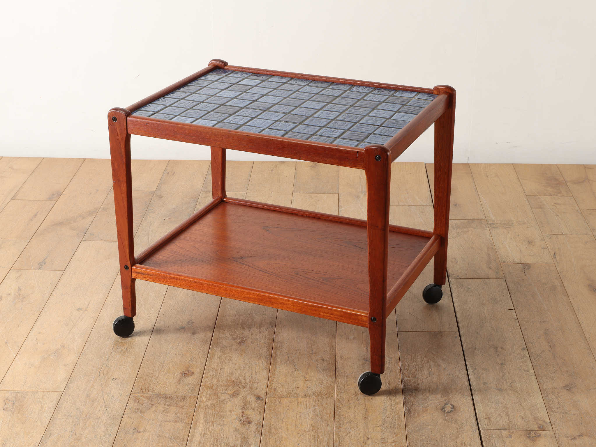 天板に濃淡が美しいブルータイルが敷き詰められたティーカート。実際にお料理やティーセットを運ぶだけでなく、シェルフとしてディスプレイを楽しんだり、サイドテーブルとしてもお使いいただけます。天板のタイルは、アンティークには大敵の水や熱を気にせずに使えるので、初めてアンティークを購入される方におすすめのアイテムです。