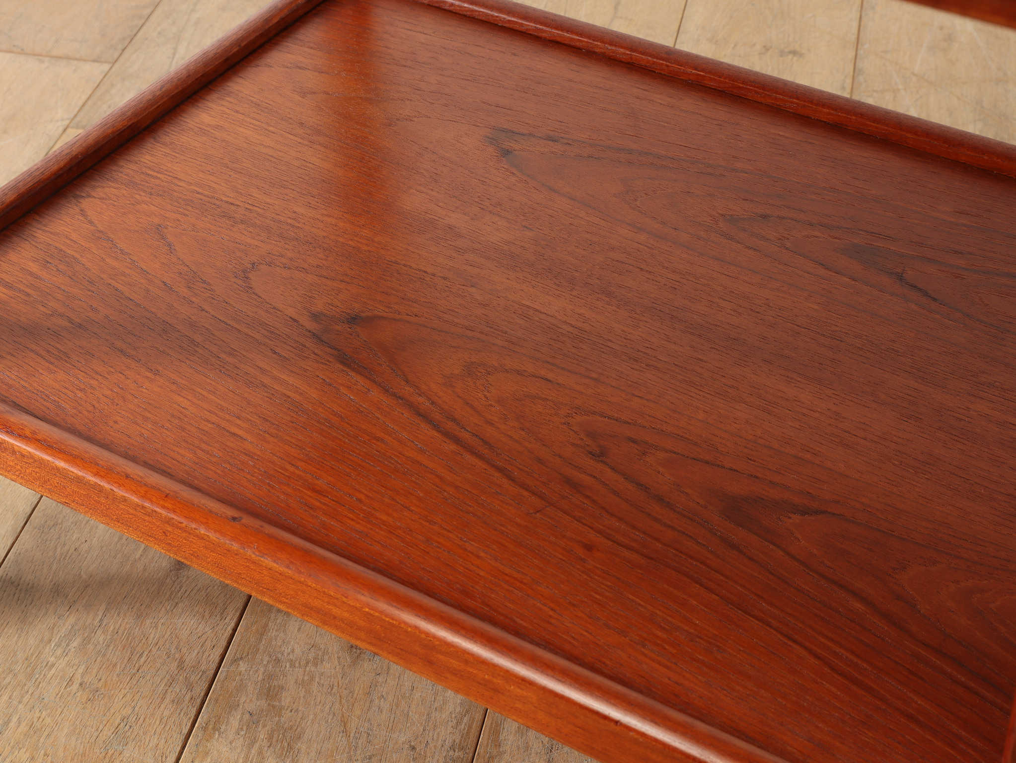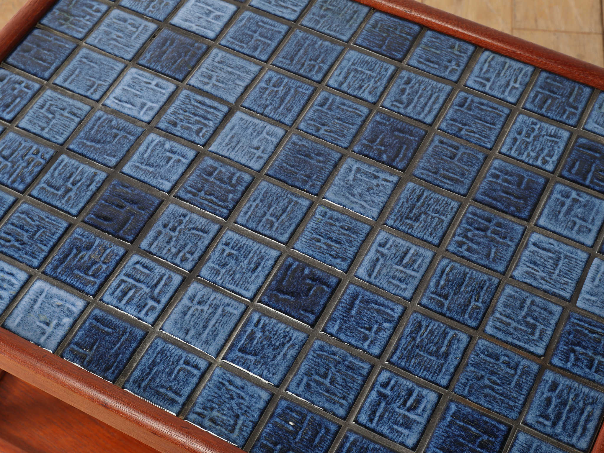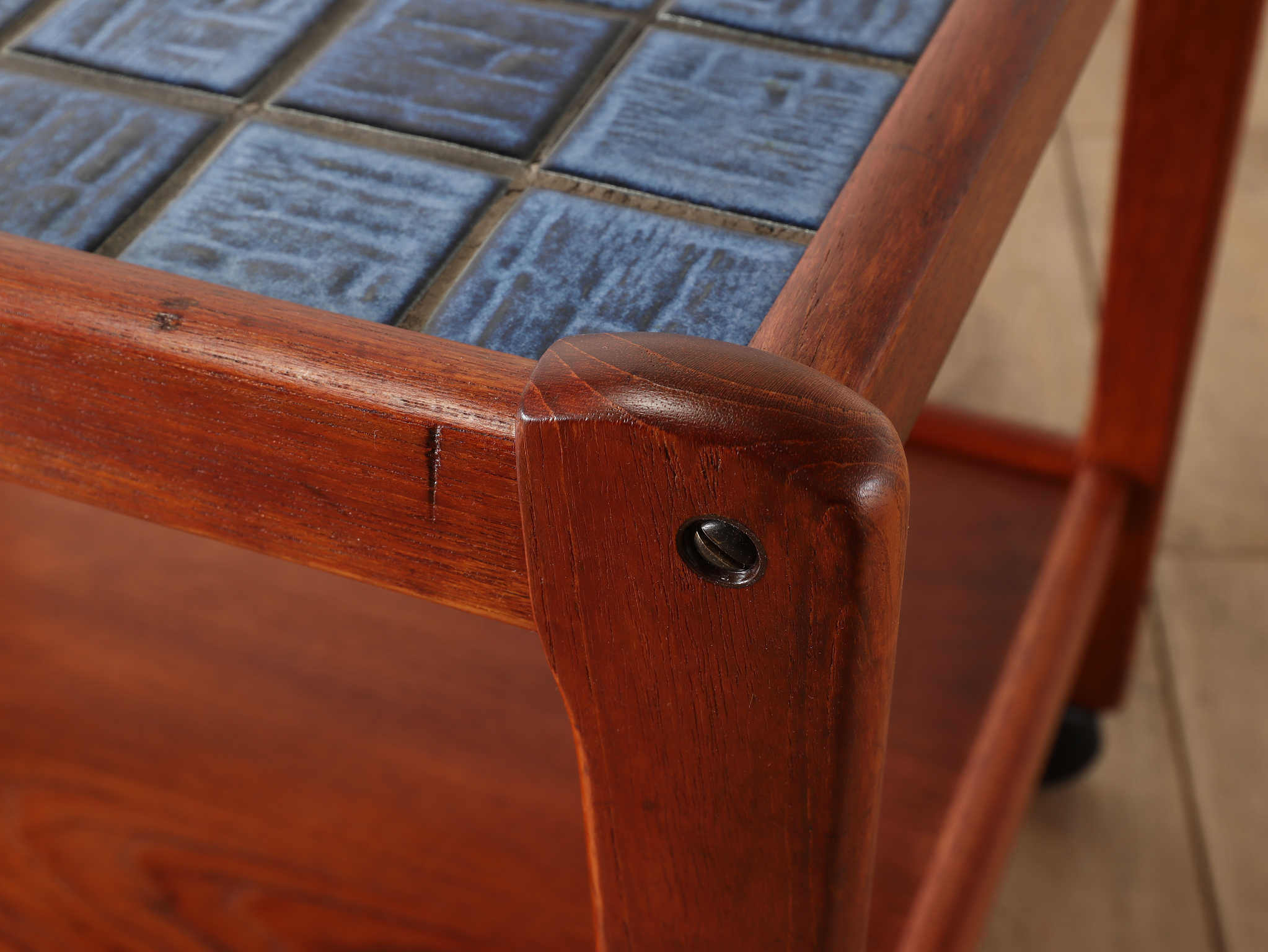 天板に濃淡が美しいブルータイルが敷き詰められたティーカート。実際にお料理やティーセットを運ぶだけでなく、シェルフとしてディスプレイを楽しんだり、サイドテーブルとしてもお使いいただけます。天板のタイルは、アンティークには大敵の水や熱を気にせずに使えるので、初めてアンティークを購入される方におすすめのアイテムです。