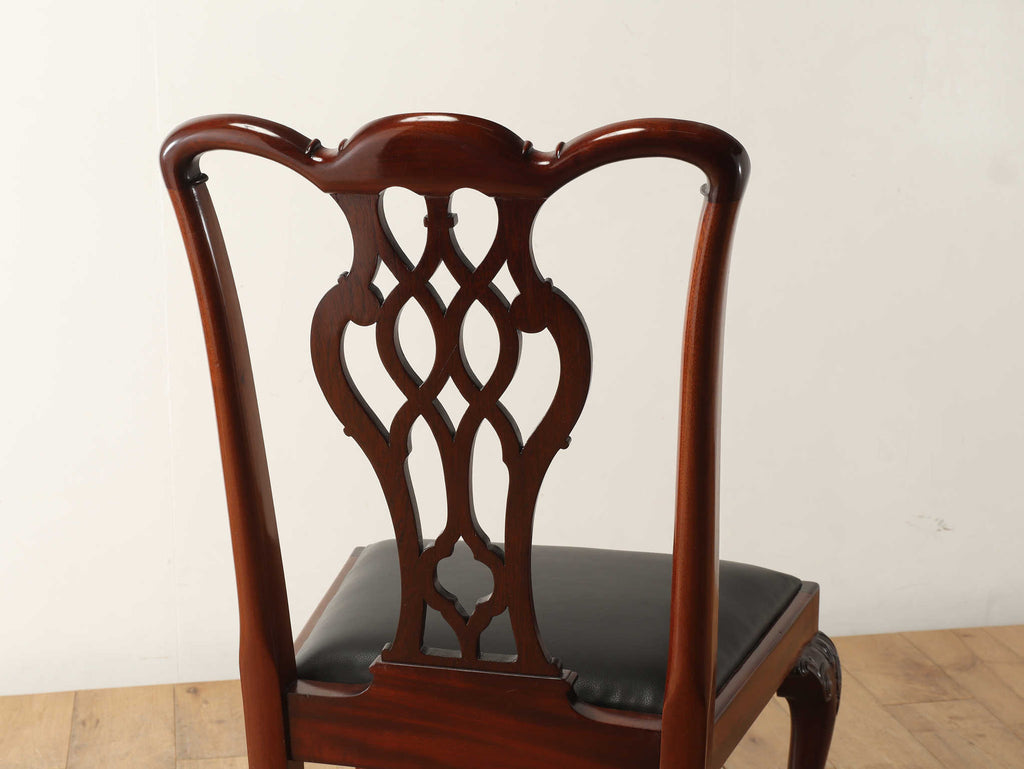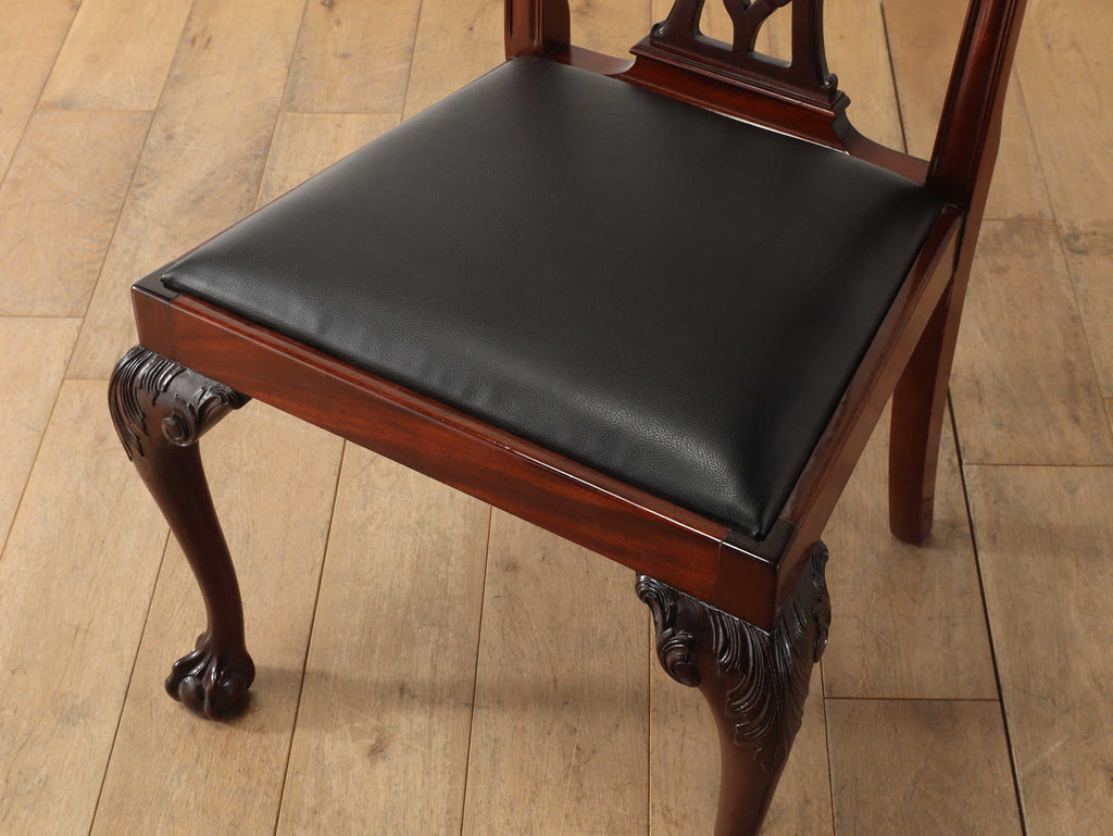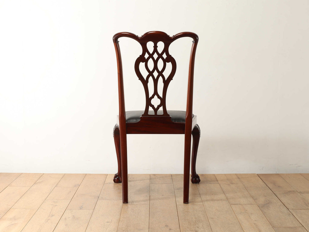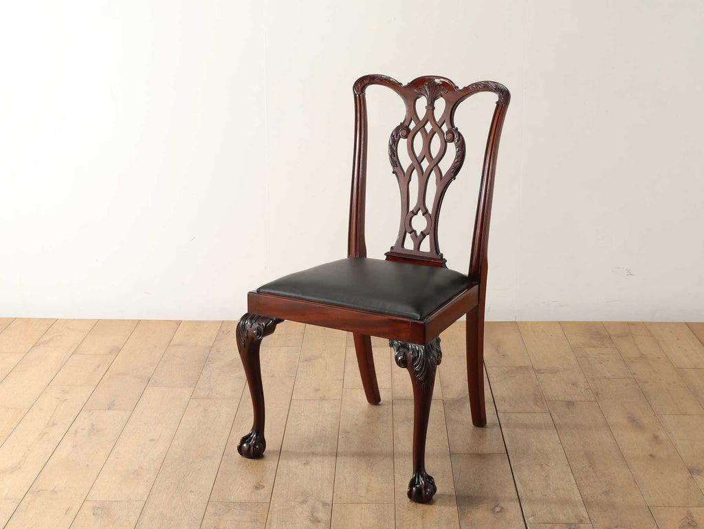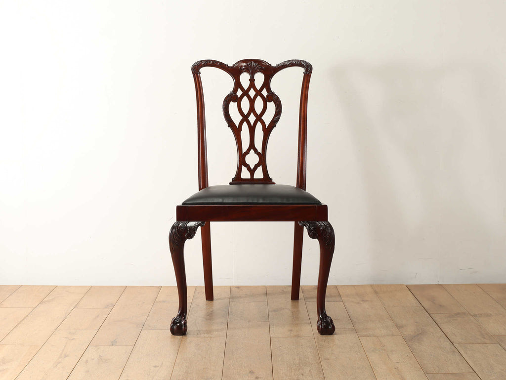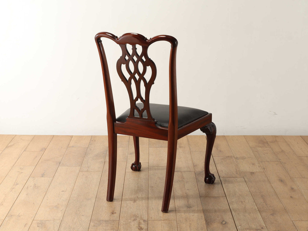 比較的座面と背もたれが広く、ゆったりと座っていただけるチッペンデールチェア。背中の透彫が美しく、壁際に置くと、くっきりとフレームが美しく浮かび上がります。座面は落とし込み式で取り外しが可能なため、簡単に張り替えのレストアを行うことができます。脚元は、幸せを掴むという意味でも用いられるB&C(ボールアンドクロウ)。東インド会社が中国と貿易するようになり、ヨーロッパで取り入れられるようになったとされています。当時の職人が手間隙と時間をかけて造りあげた芸術品のような装飾をお楽しみ下さい。