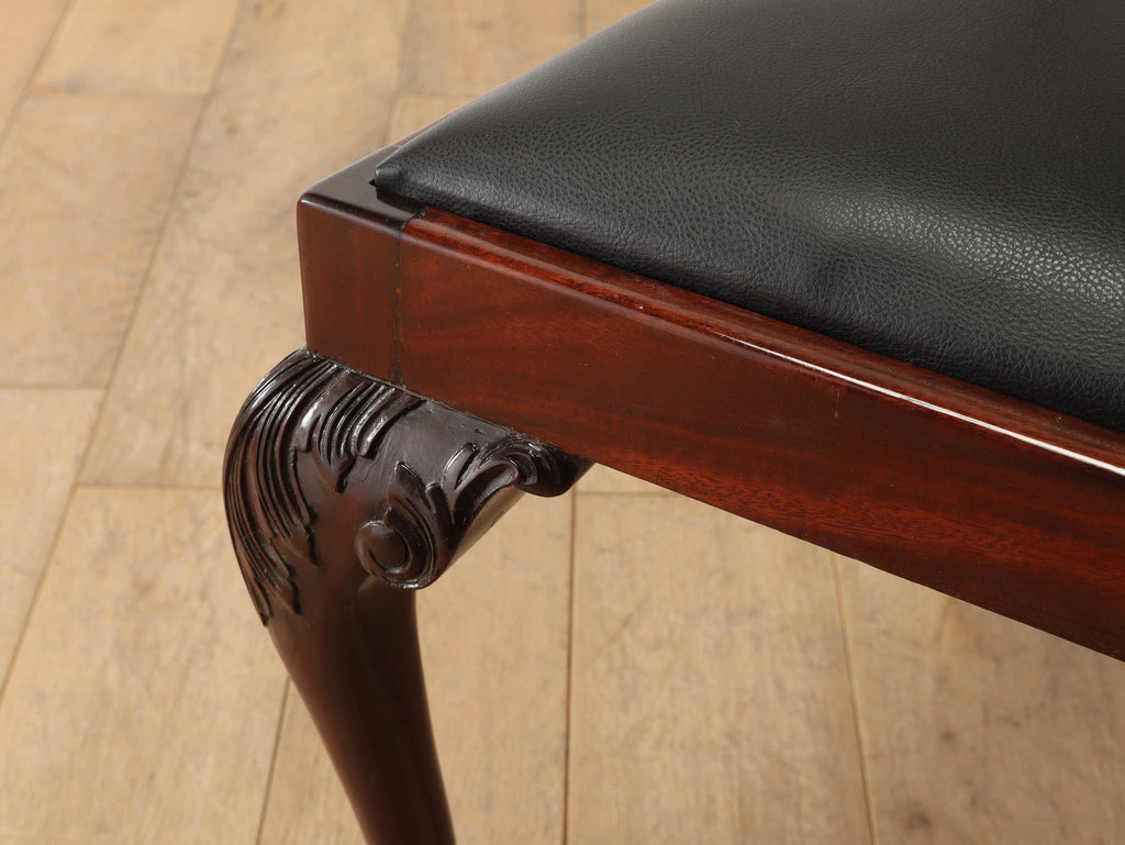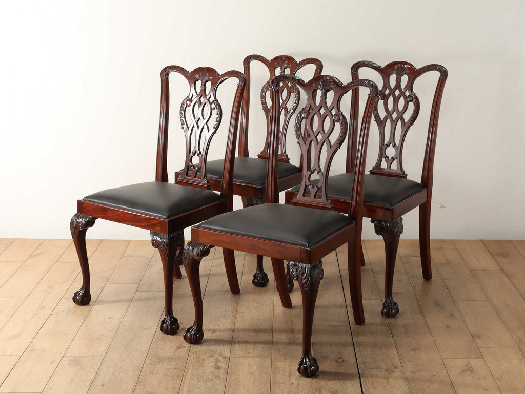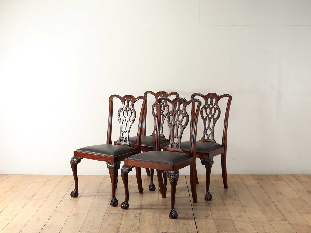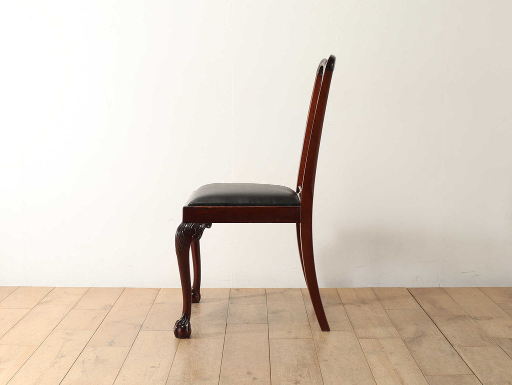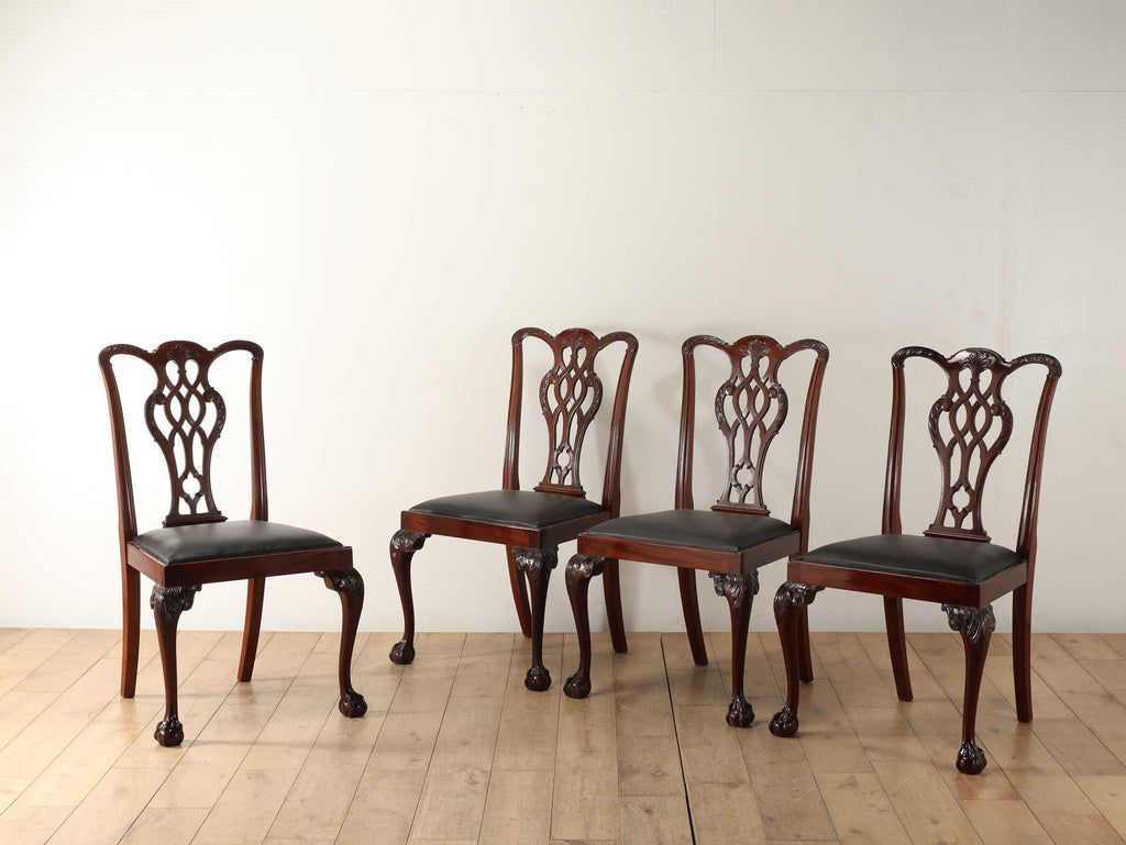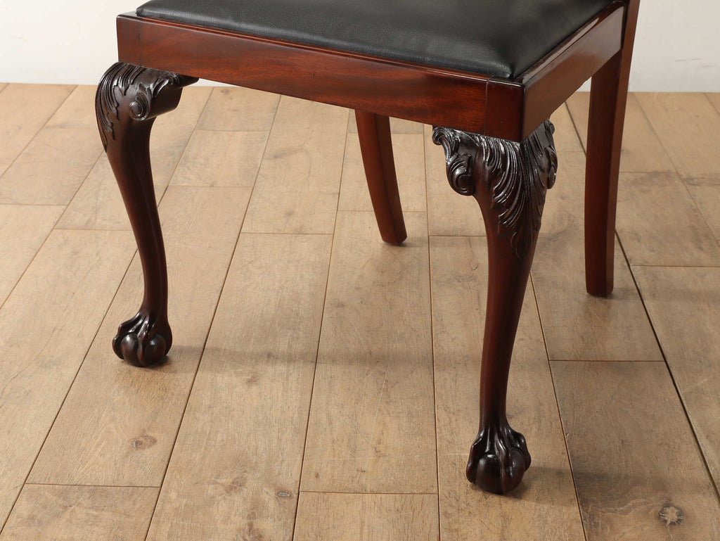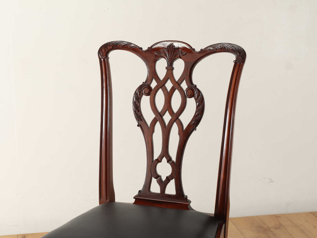 比較的座面と背もたれが広く、ゆったりと座っていただけるチッペンデールチェア。背中の透彫が美しく、壁際に置くと、くっきりとフレームが美しく浮かび上がります。座面は落とし込み式で取り外しが可能なため、簡単に張り替えのレストアを行うことができます。脚元は、幸せを掴むという意味でも用いられるB&C(ボールアンドクロウ)。東インド会社が中国と貿易するようになり、ヨーロッパで取り入れられるようになったとされています。当時の職人が手間隙と時間をかけて造りあげた芸術品のような装飾をお楽しみ下さい。