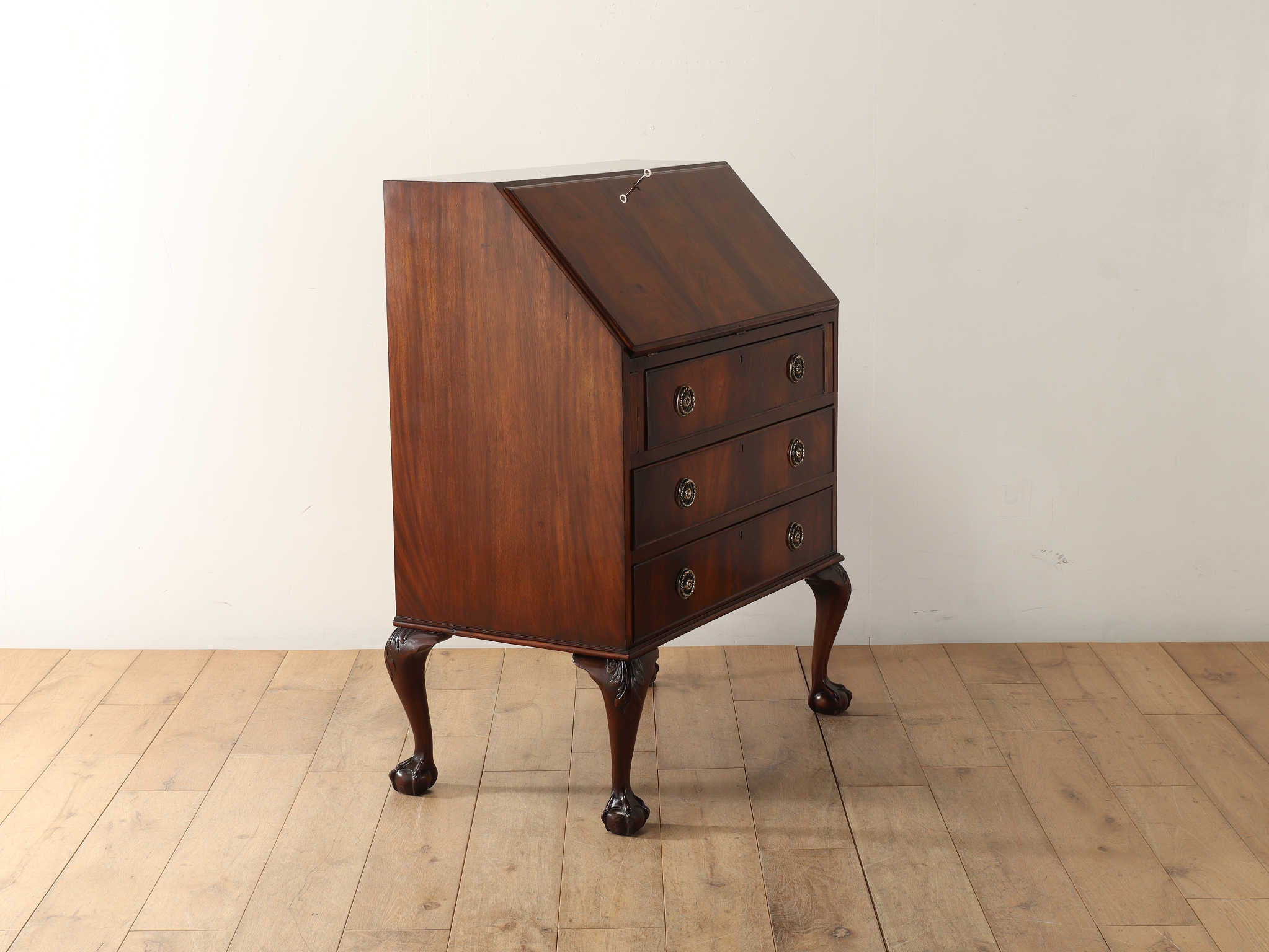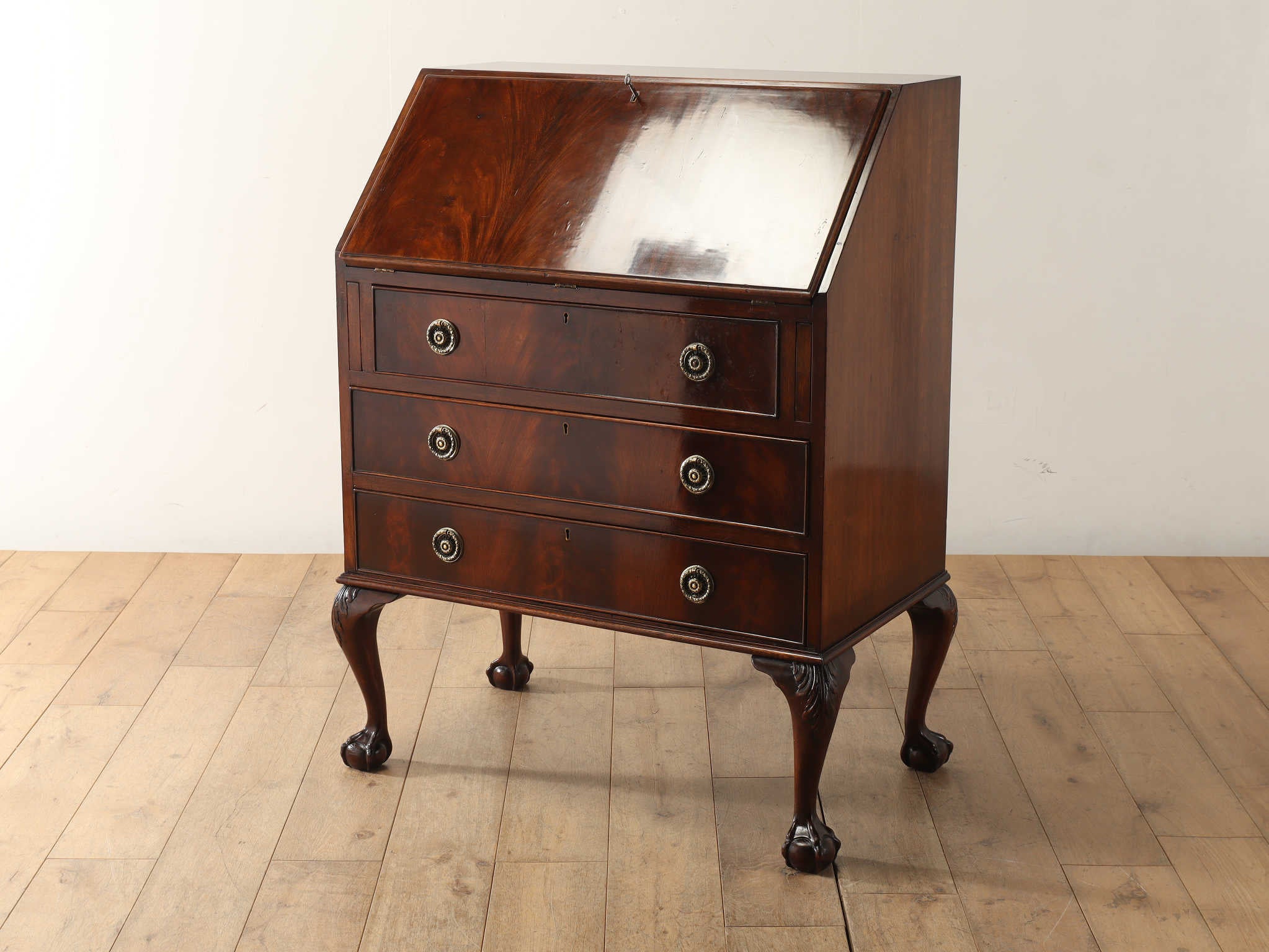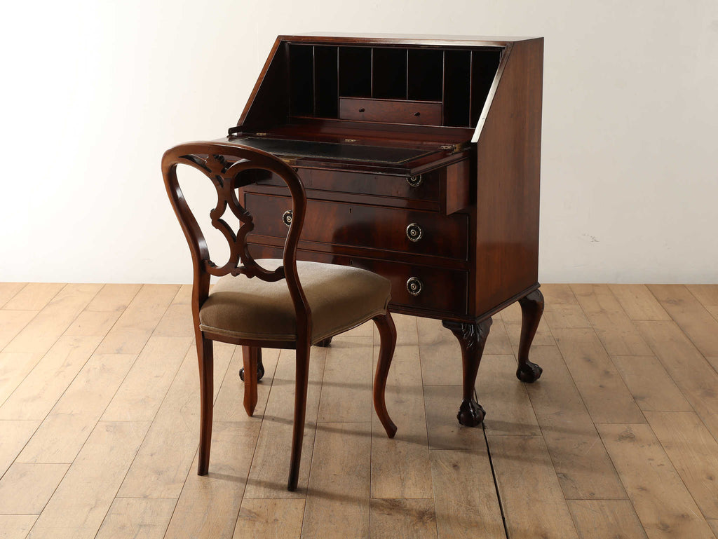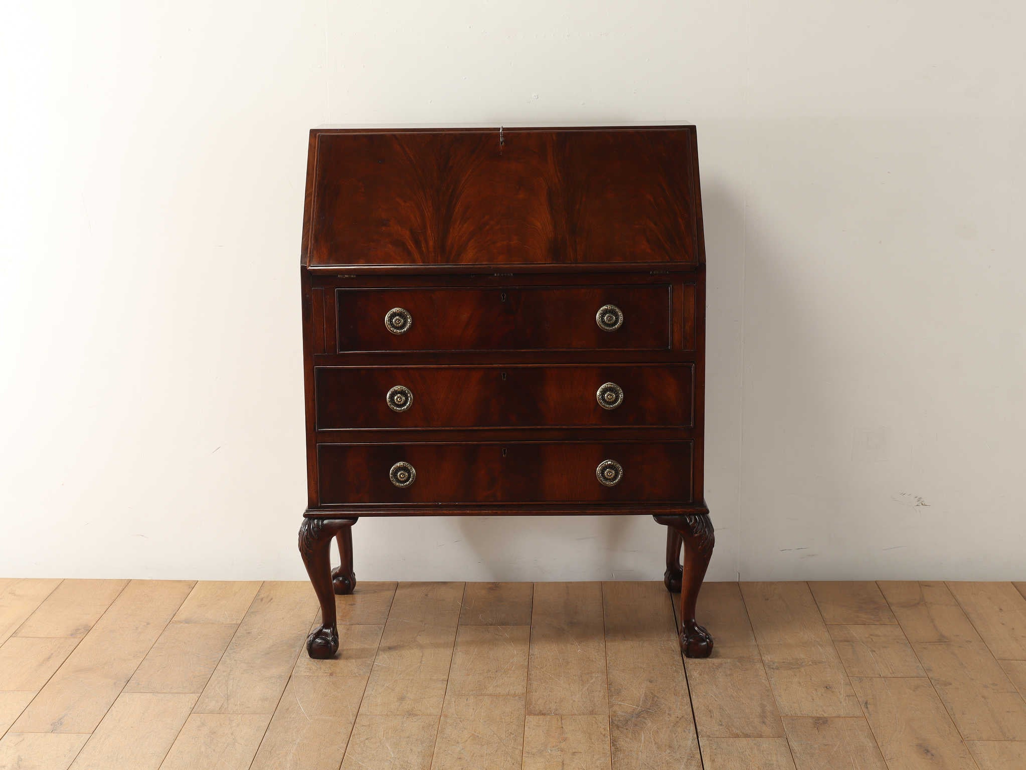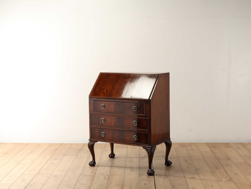 マホガニーの木目が美しいMAPLE & COのビューロー。MAPLE & CO は19世紀初頭にジョンメープルによって設立され、イギリスの貴族と王族の家具の主要メーカーとして人気を博しました。脚元はB&C(ボールアンドクロー)のデザインとなっておりエレガントな印象を一層引き立ててくれています。使うときだけフラップを開いて広く使え、使わない時は閉じてコンパクトにでき実用的。ピジョンホールと呼ばれる内部の戸棚には文庫本や手紙、小物入れ等十分に収納しながらお使いいただけます。