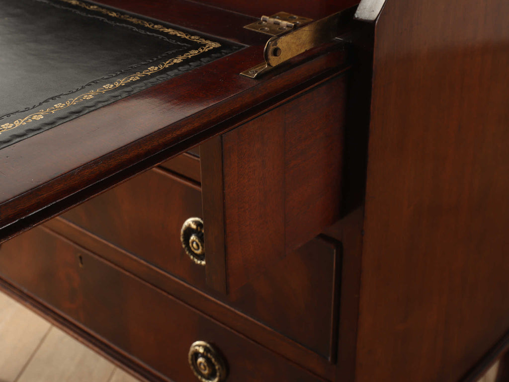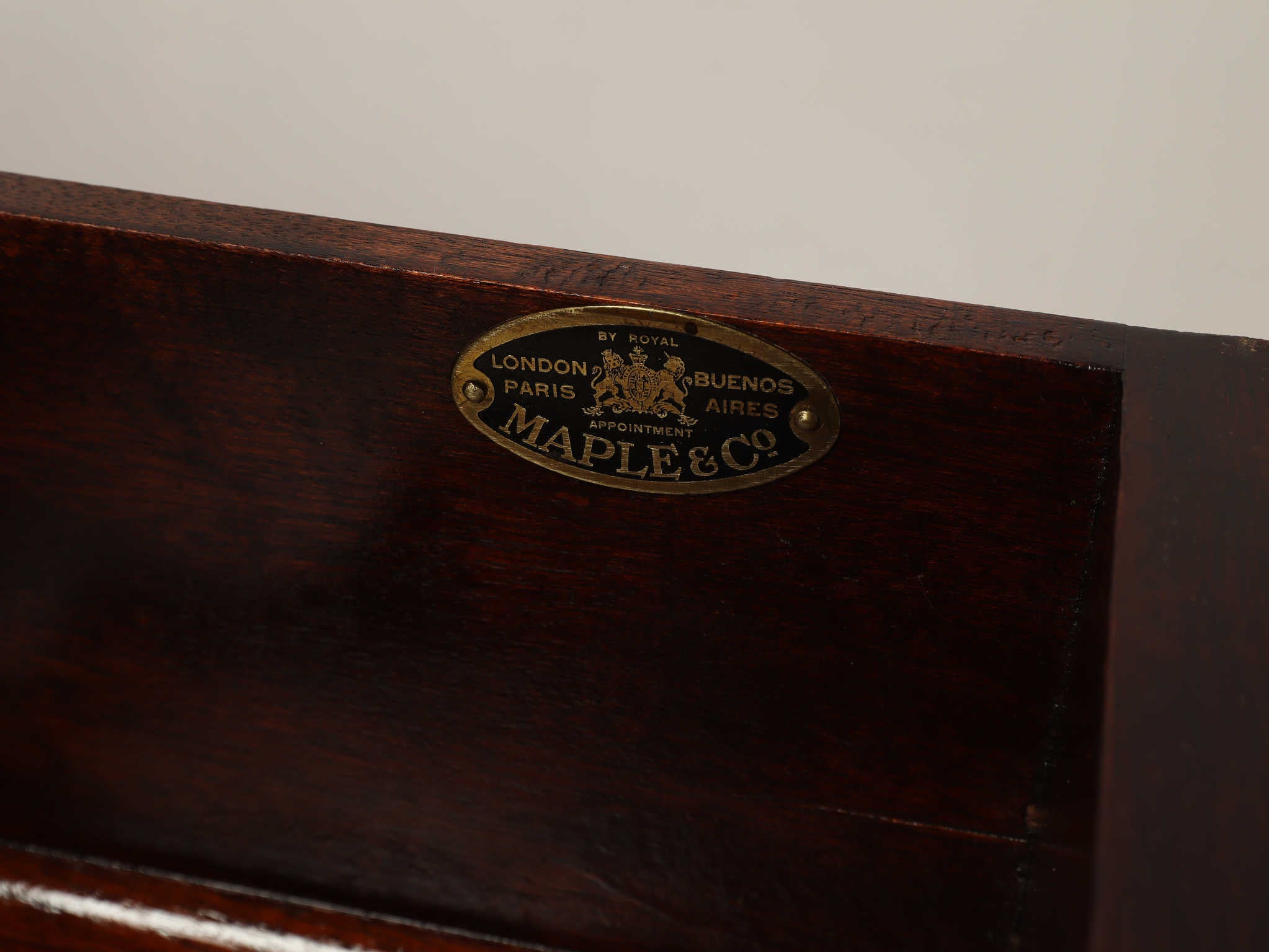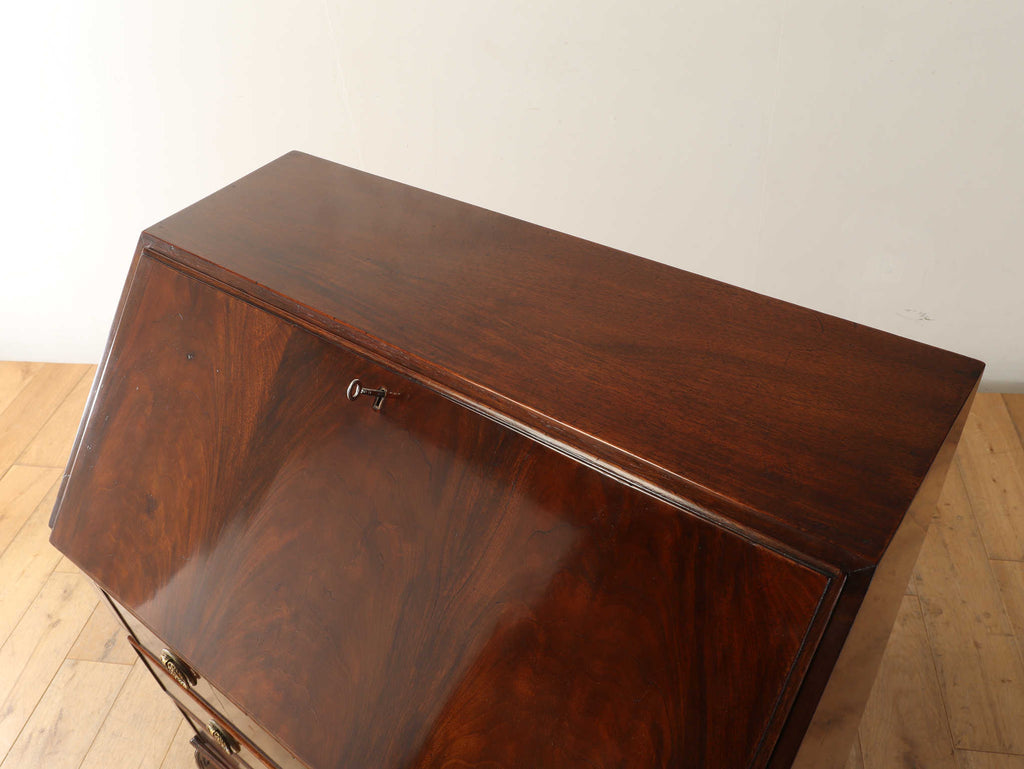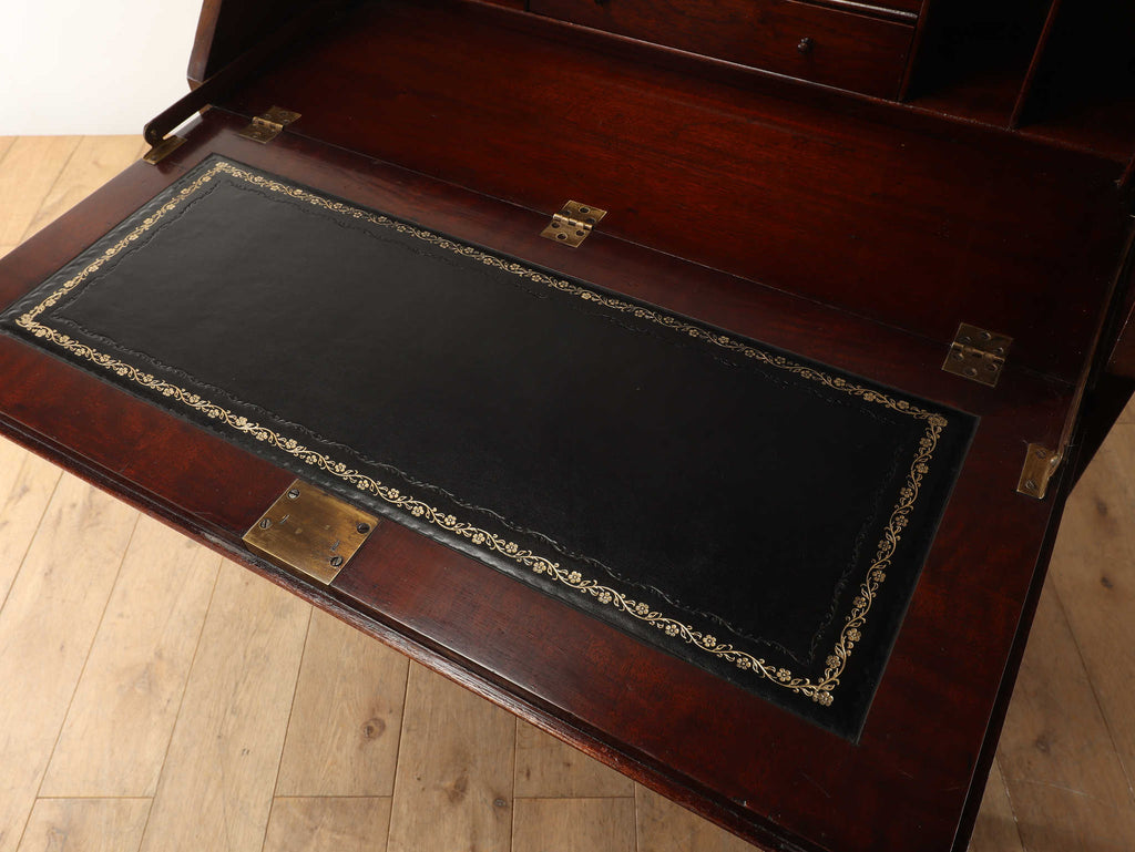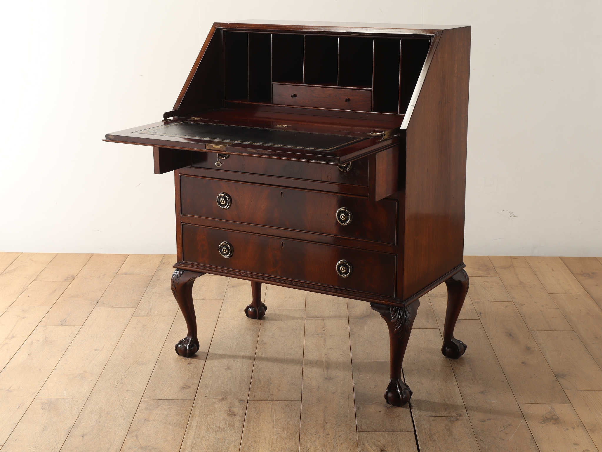 マホガニーの木目が美しいMAPLE & COのビューロー。MAPLE & CO は19世紀初頭にジョンメープルによって設立され、イギリスの貴族と王族の家具の主要メーカーとして人気を博しました。脚元はB&C(ボールアンドクロー)のデザインとなっておりエレガントな印象を一層引き立ててくれています。使うときだけフラップを開いて広く使え、使わない時は閉じてコンパクトにでき実用的。ピジョンホールと呼ばれる内部の戸棚には文庫本や手紙、小物入れ等十分に収納しながらお使いいただけます。