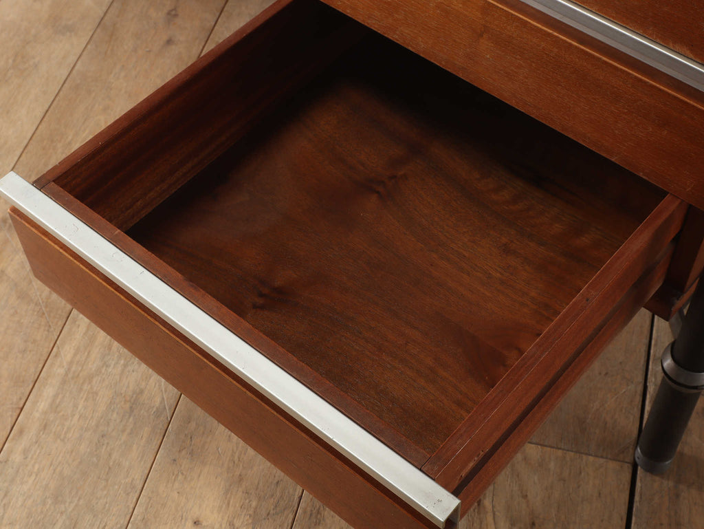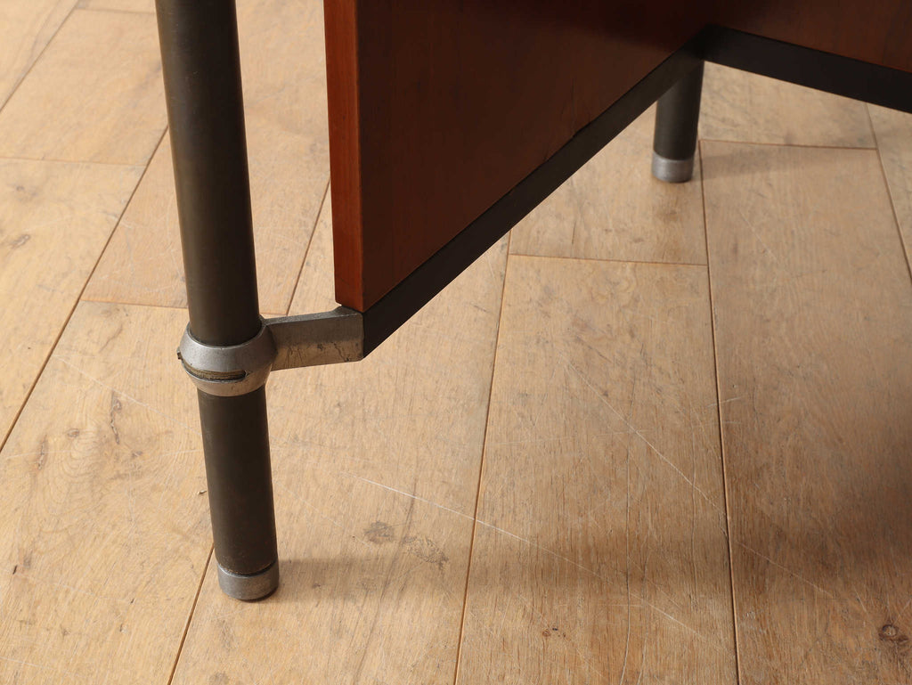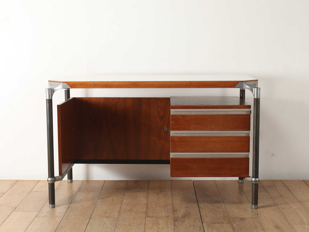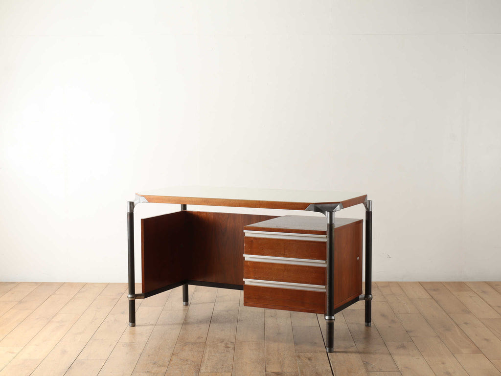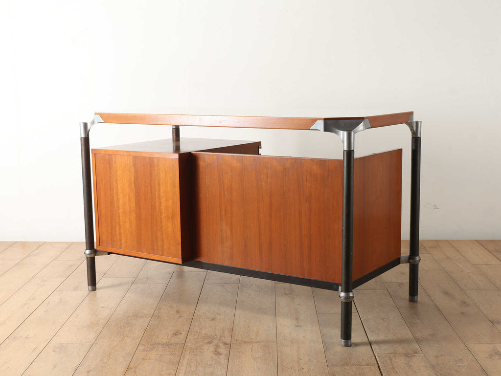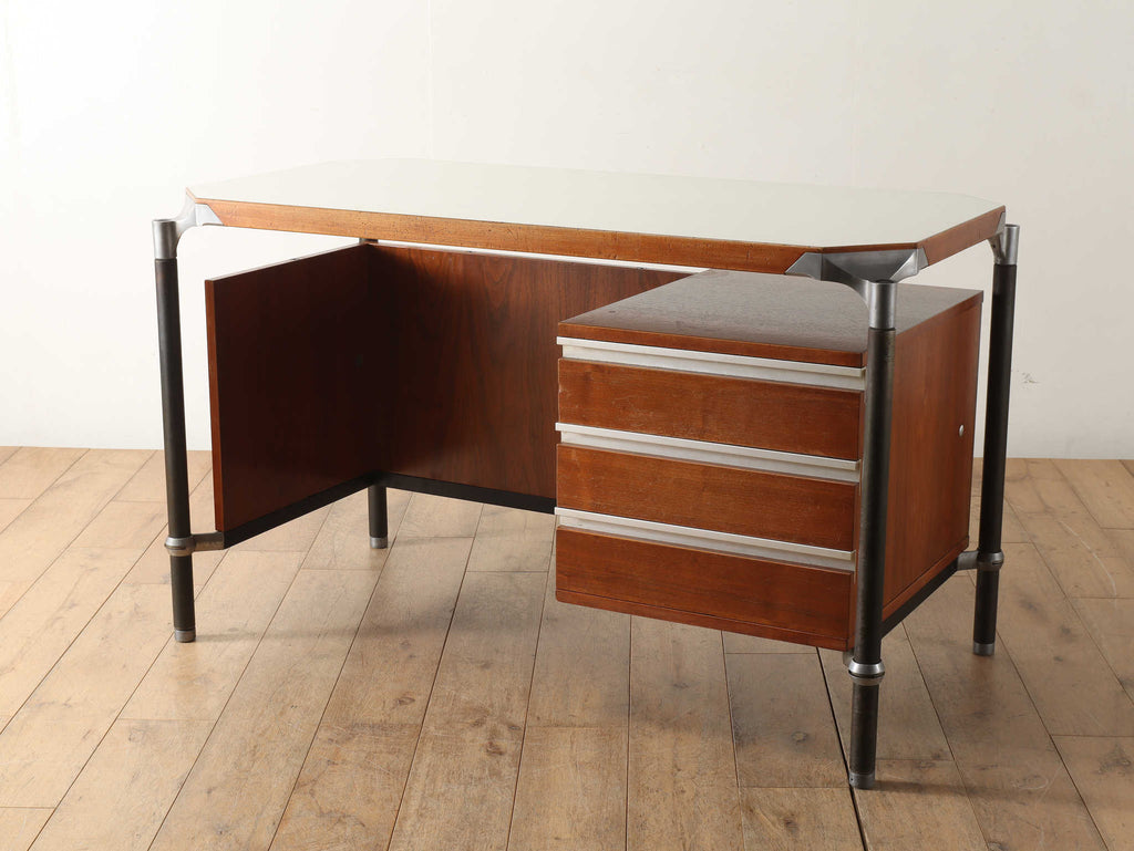 イタリアの建築家兼デザイナーであるIco Parisiは映画製作や、ガラスとジュエリーのデザイナーとしても活躍していました。1945年に家具のデザインを始め、ミッドセンチュリーデザインの最も影響力のある人物の一人となりました。彼の作る家具はブーメランのようなフォルムに金属のアクセント、大胆な色遣いが特徴です。こちらはローマのMIM (Mobili Italiani Moderni) のためにデザインしたスタイリッシュなシルエットを持つデスク。黒いメタルをフレームに、温かみのある木で構成されたこちらは、異素材を見事に組み合わせたデザインが見事です。天板と引き出しの取手、そして支柱となる箇所に、落ち着いたトーンのシルバーの金属が使用されています。片袖型のアシンメトリーなシルエットも魅力的ですね。自分らしさを表現できるデスクで、他とは違うあなただけの空間を作ってみませんか。