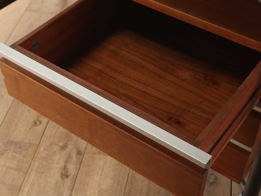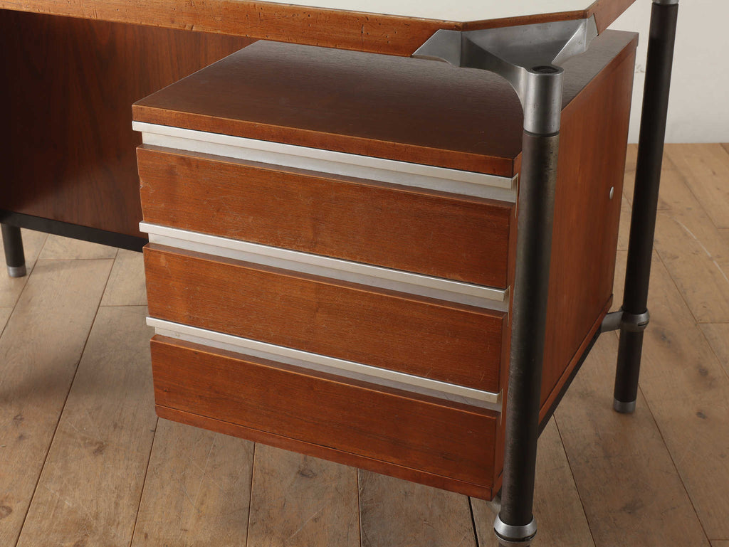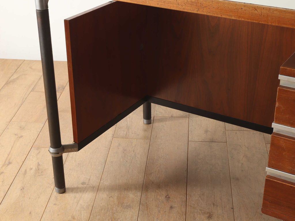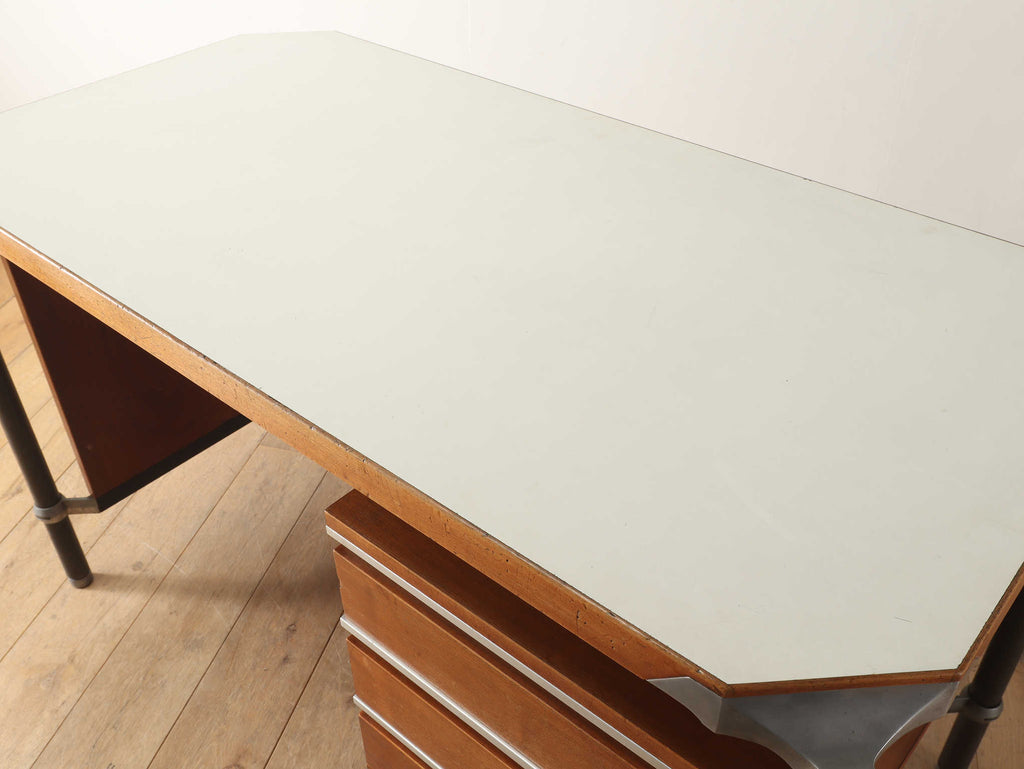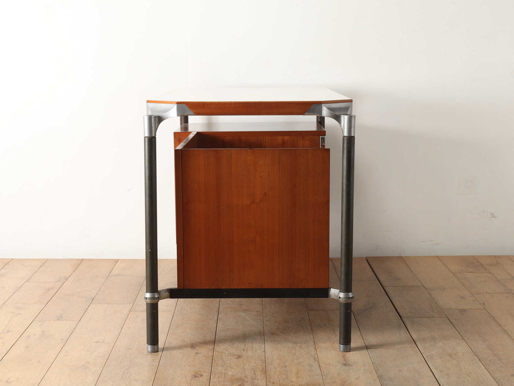 イタリアの建築家兼デザイナーであるIco Parisiは映画製作や、ガラスとジュエリーのデザイナーとしても活躍していました。1945年に家具のデザインを始め、ミッドセンチュリーデザインの最も影響力のある人物の一人となりました。彼の作る家具はブーメランのようなフォルムに金属のアクセント、大胆な色遣いが特徴です。こちらはローマのMIM (Mobili Italiani Moderni) のためにデザインしたスタイリッシュなシルエットを持つデスク。黒いメタルをフレームに、温かみのある木で構成されたこちらは、異素材を見事に組み合わせたデザインが見事です。天板と引き出しの取手、そして支柱となる箇所に、落ち着いたトーンのシルバーの金属が使用されています。片袖型のアシンメトリーなシルエットも魅力的ですね。自分らしさを表現できるデスクで、他とは違うあなただけの空間を作ってみませんか。