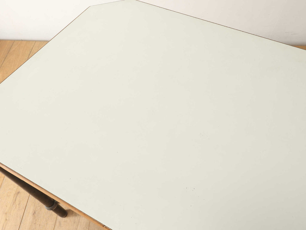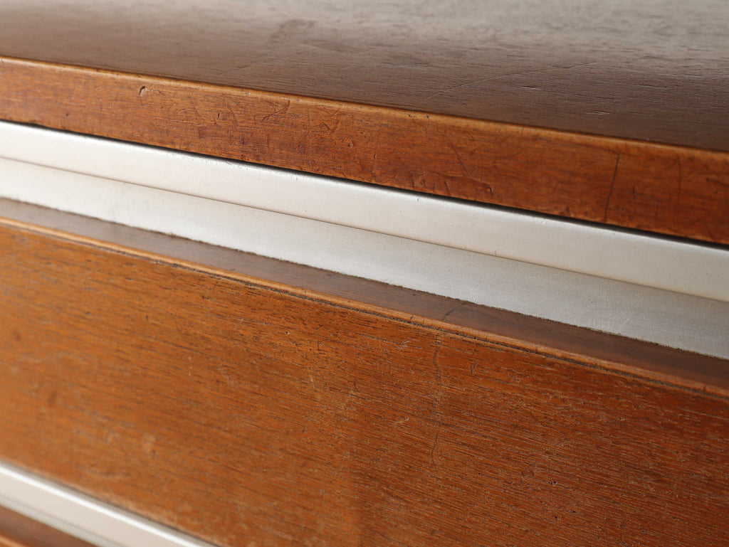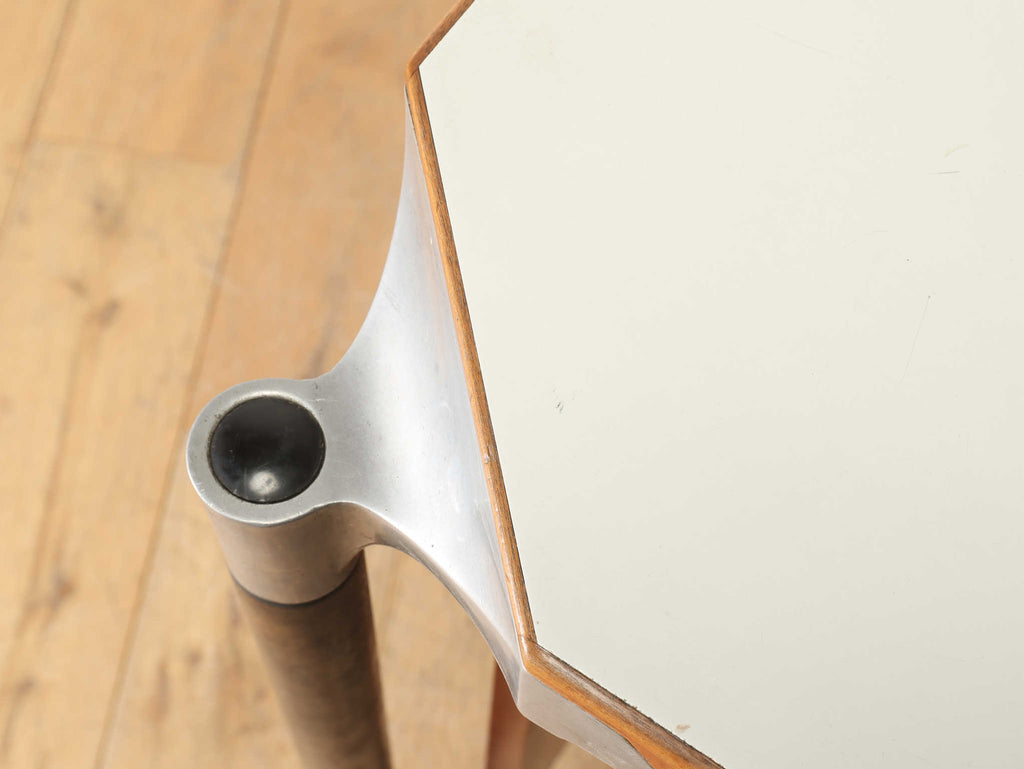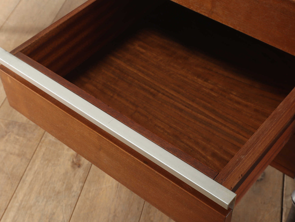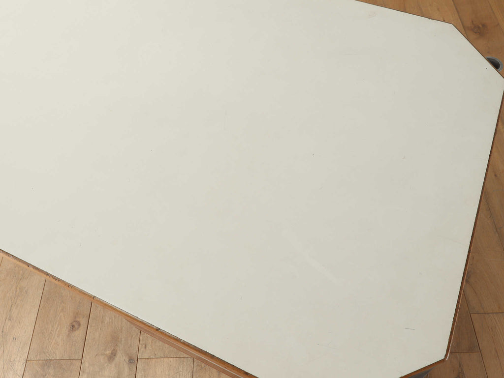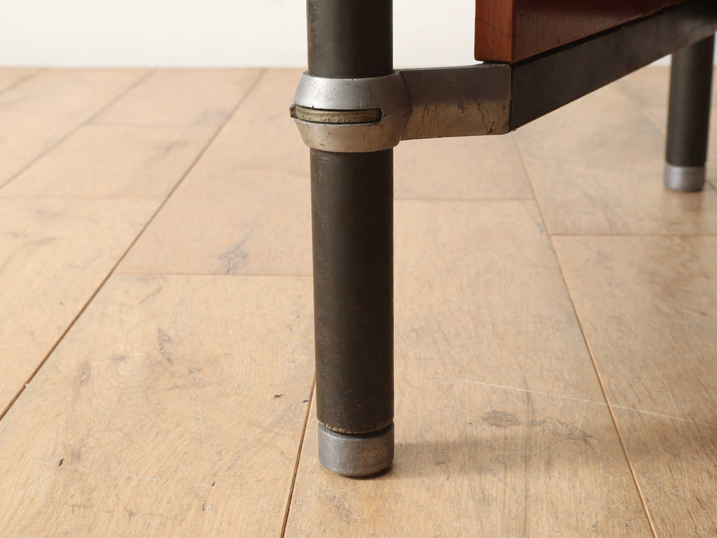 イタリアの建築家兼デザイナーであるIco Parisiは映画製作や、ガラスとジュエリーのデザイナーとしても活躍していました。1945年に家具のデザインを始め、ミッドセンチュリーデザインの最も影響力のある人物の一人となりました。彼の作る家具はブーメランのようなフォルムに金属のアクセント、大胆な色遣いが特徴です。こちらはローマのMIM (Mobili Italiani Moderni) のためにデザインしたスタイリッシュなシルエットを持つデスク。黒いメタルをフレームに、温かみのある木で構成されたこちらは、異素材を見事に組み合わせたデザインが見事です。天板と引き出しの取手、そして支柱となる箇所に、落ち着いたトーンのシルバーの金属が使用されています。片袖型のアシンメトリーなシルエットも魅力的ですね。自分らしさを表現できるデスクで、他とは違うあなただけの空間を作ってみませんか。