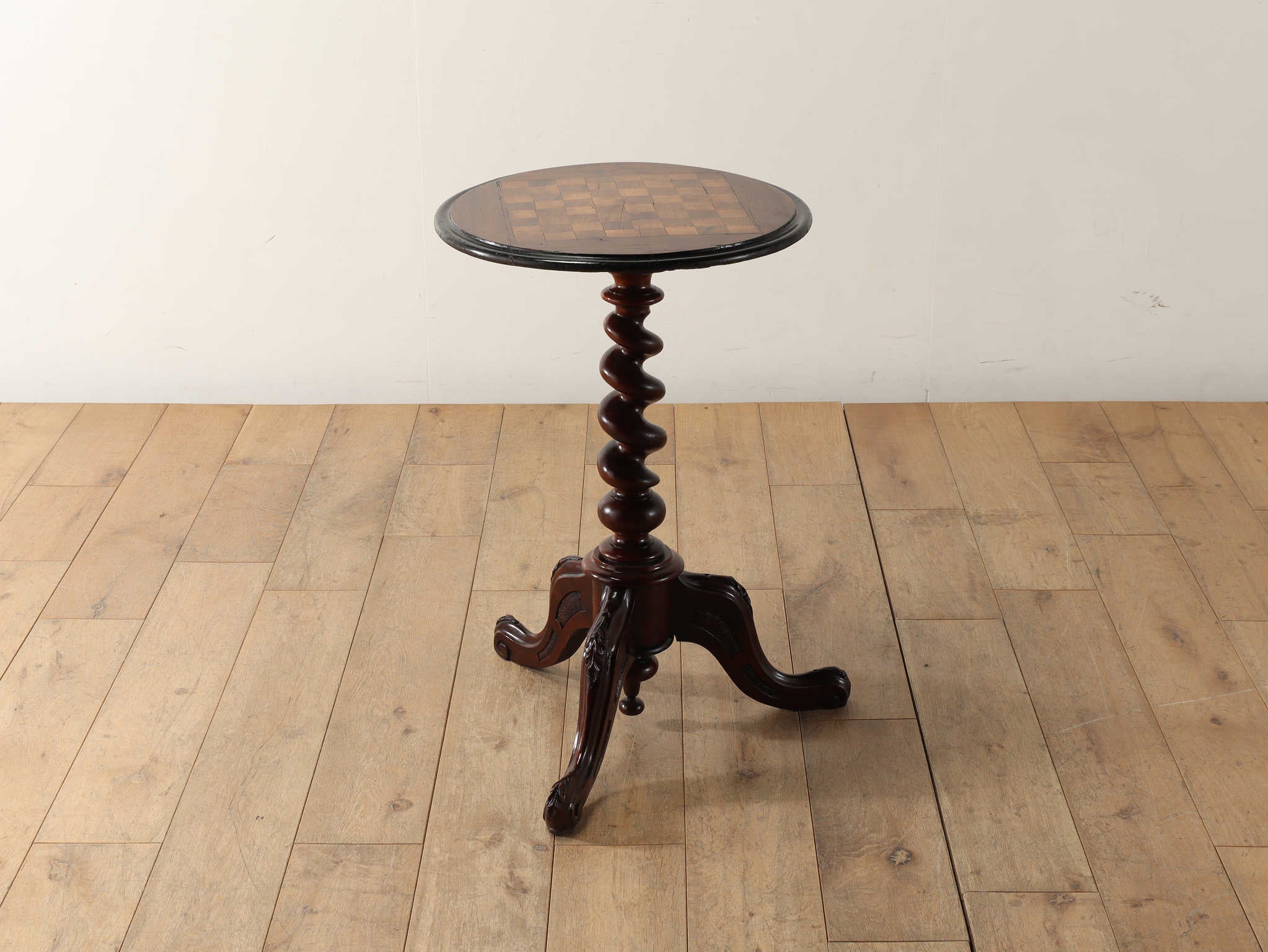 推定1880年代のチェステーブル。天板がチェス盤を模したユニークなつくりとなっており、チェスを楽しむことはもちろん、見た目にも市松模様が楽しいデザインとなっております。ただ現代の一般的なチェス盤とサイズが異なる可能性がありますのでご注意ください。色味の異なる木材を交互に貼り付けたインレイ(象嵌細工)や、艶のあるマホガニー材はアンティークのチェステーブルならでは。意匠をぜひご堪能ください。