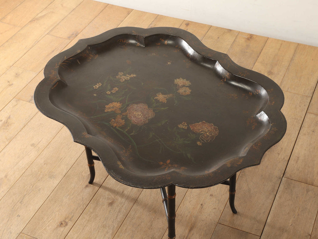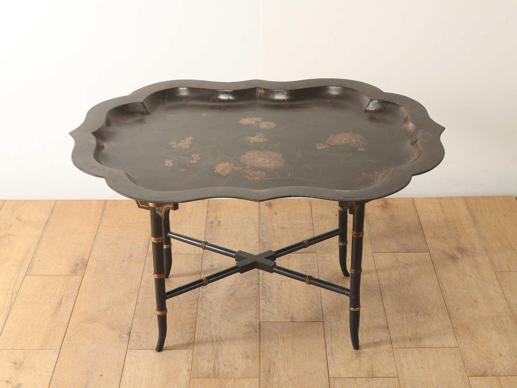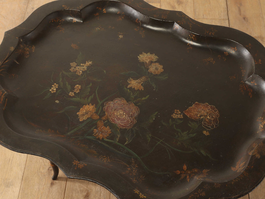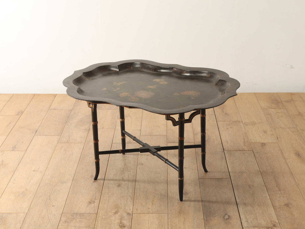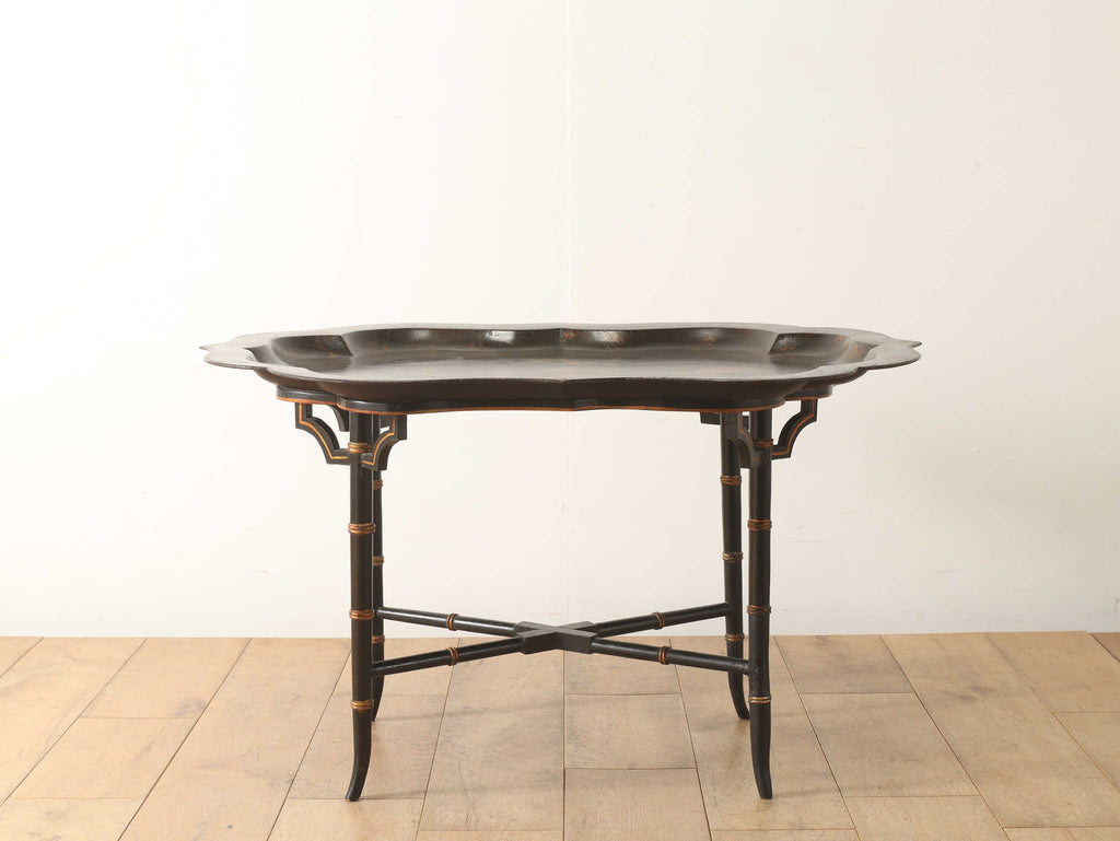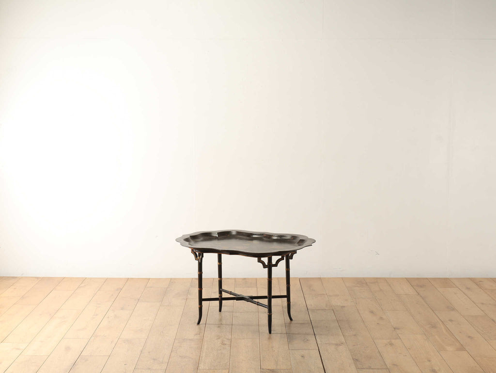1900年代推定、イギリスのトレイ型テーブル。シノワズリのデザインが美しいアイテムです。トレイ部分のメタル素材の特徴を活かした繊細なデザインがとても魅力的です。