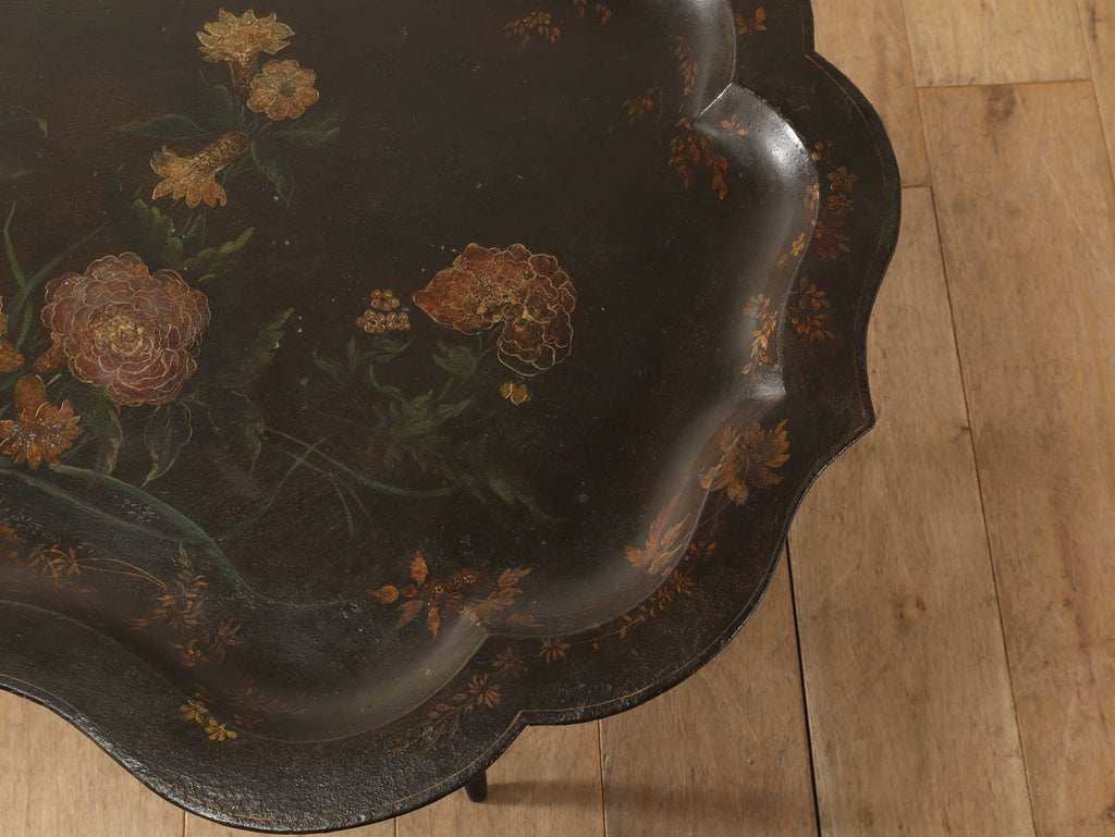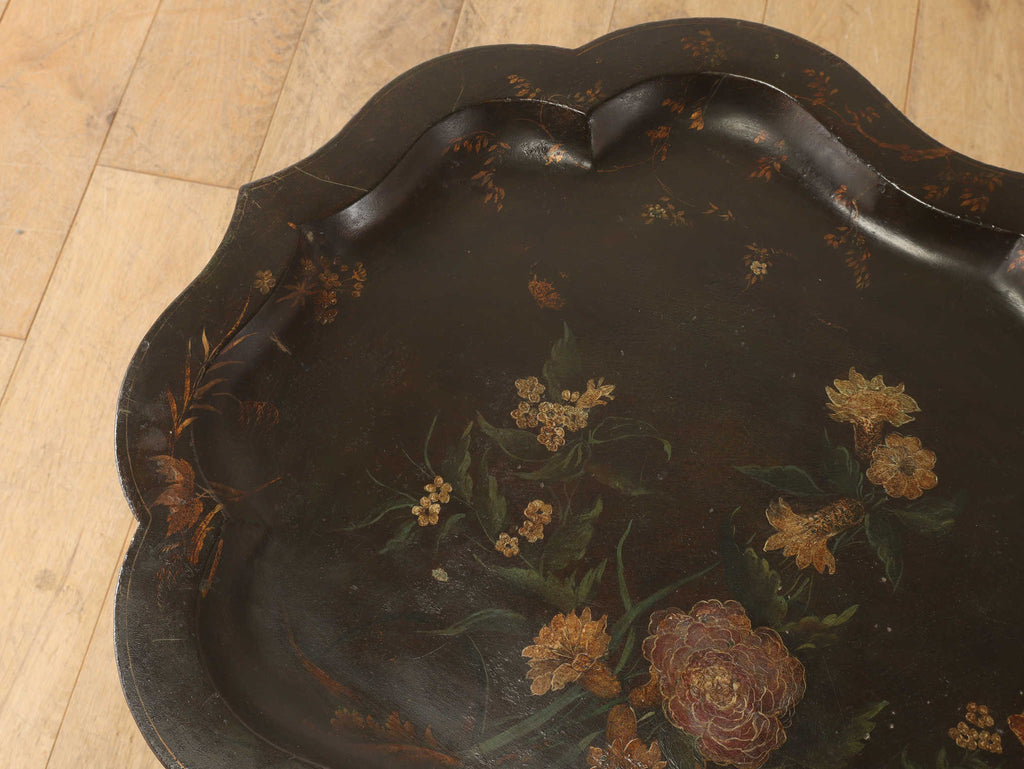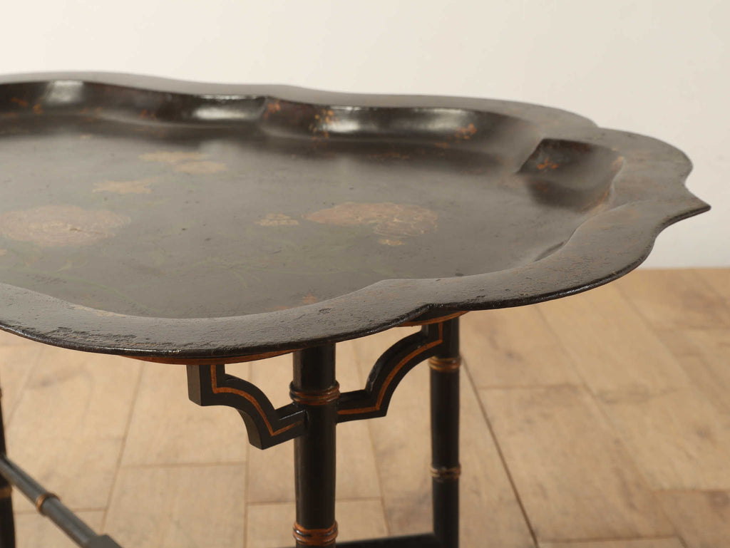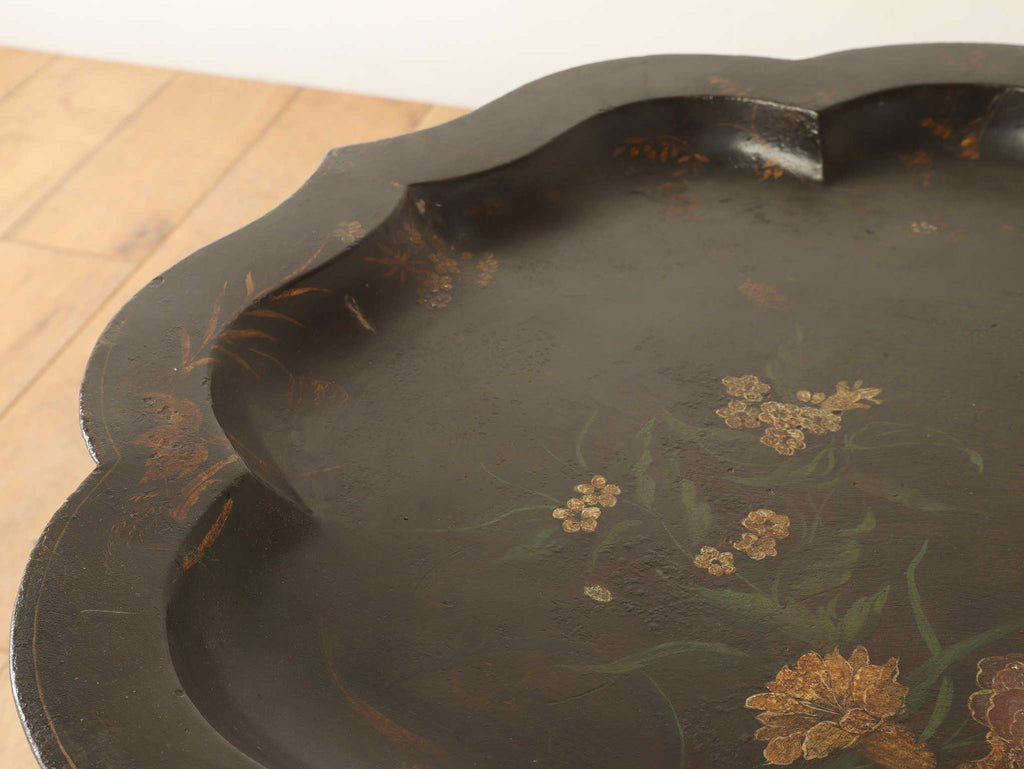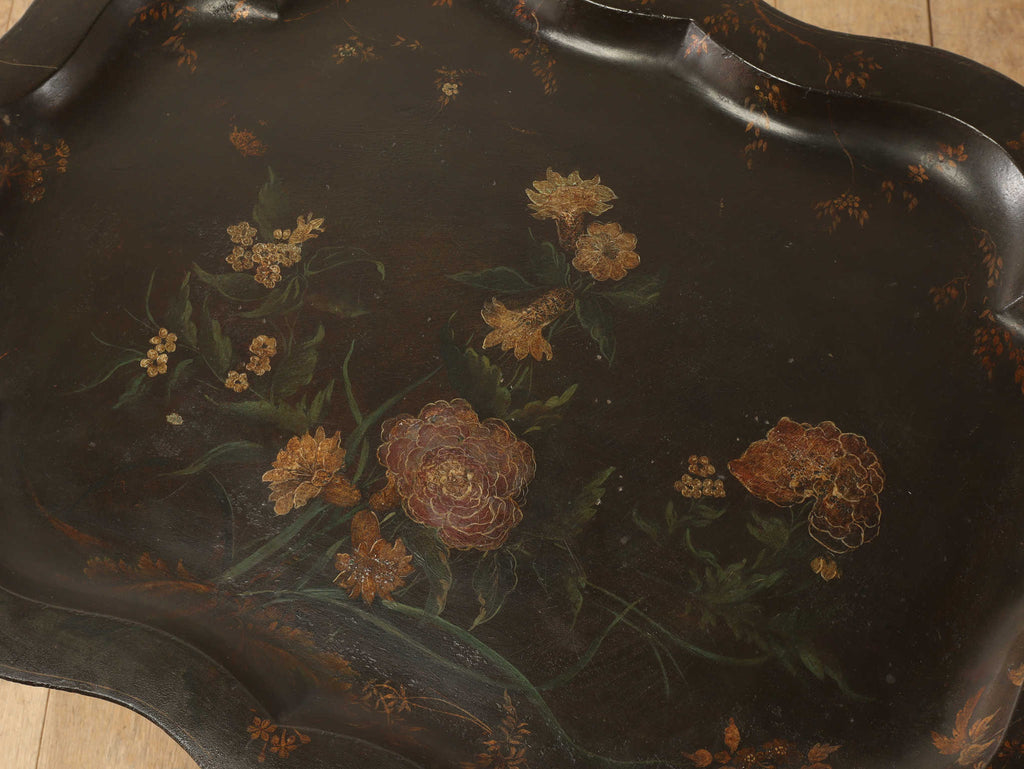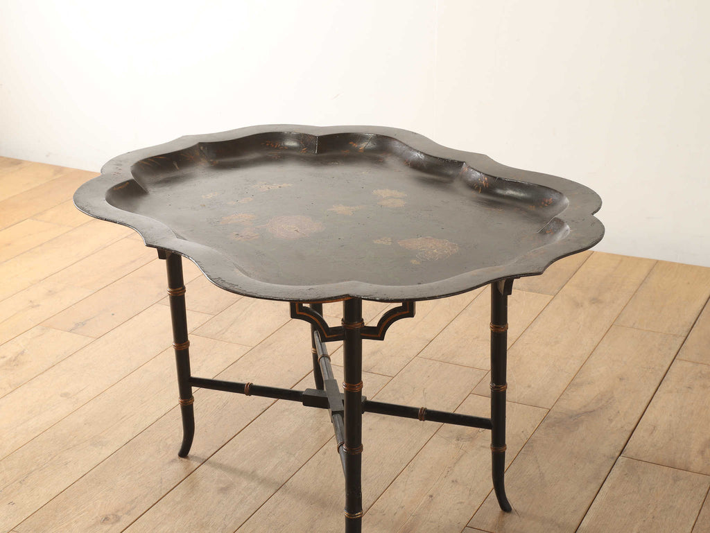 1900年代推定、イギリスのトレイ型テーブル。シノワズリのデザインが美しいアイテムです。トレイ部分のメタル素材の特徴を活かした繊細なデザインがとても魅力的です。