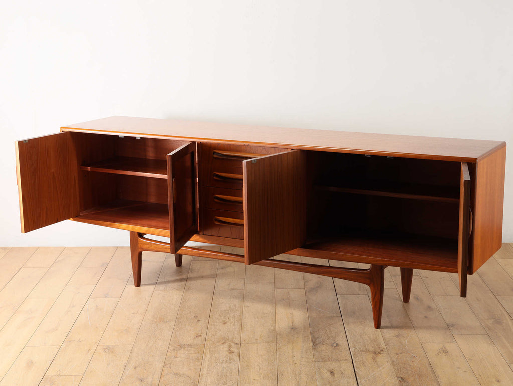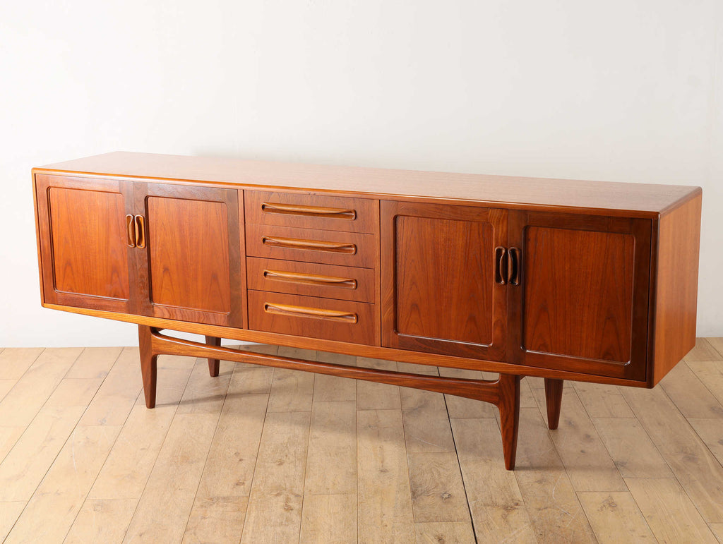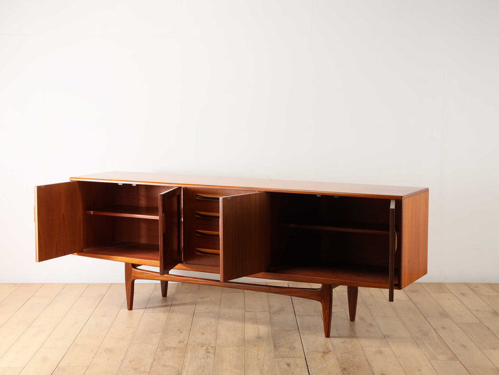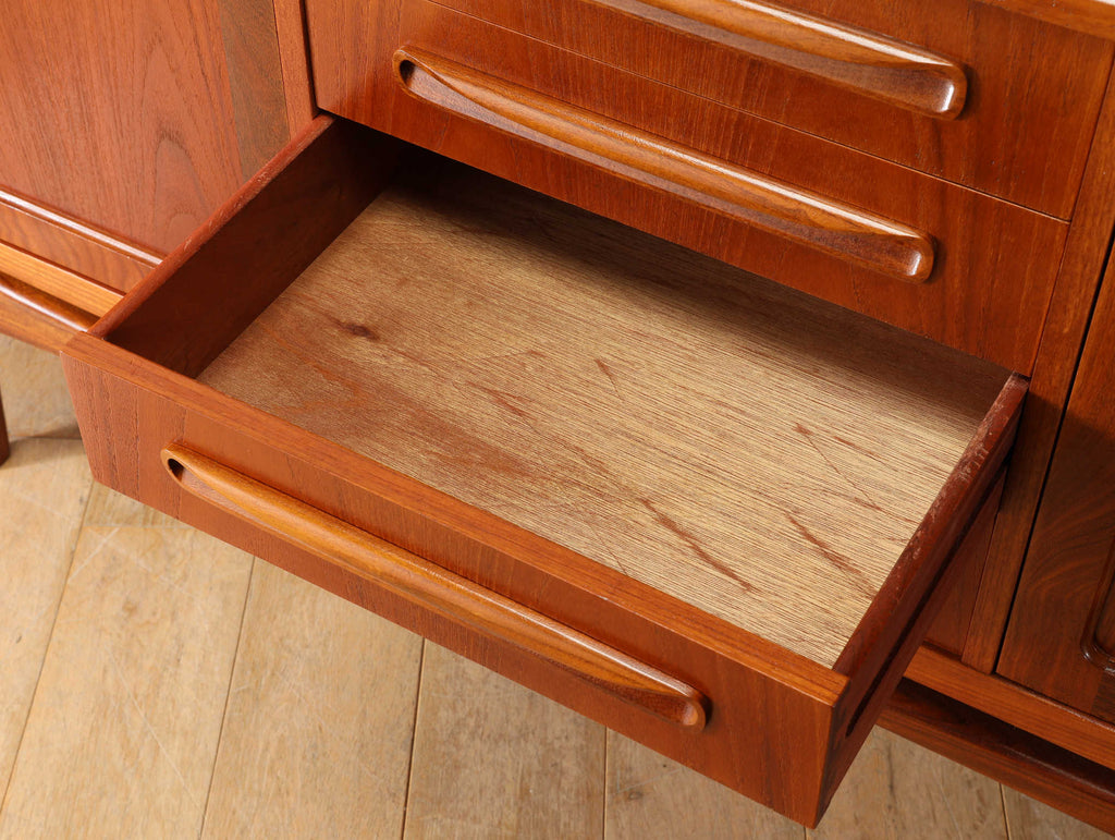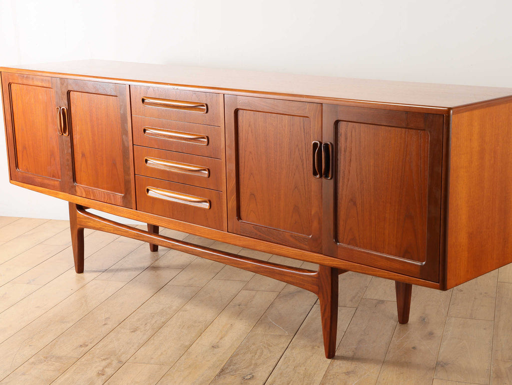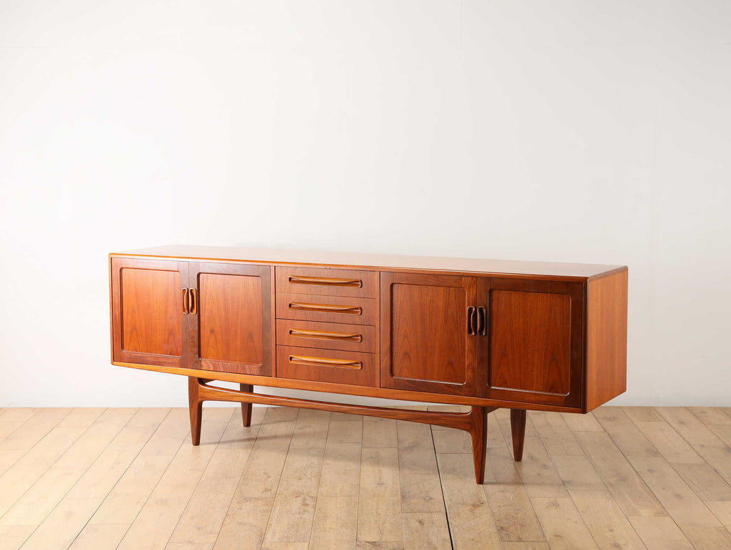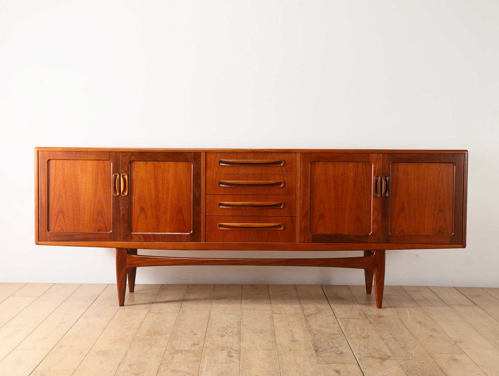 英国老舗家具メーカーである、G-PLANのサイドボードです。流線型を描く脚部にのった収納部分。その伸びやかなディテールは実にスマートで美しい佇まいです。2トーンのチーク材が用いられ、メリハリのある印象になると共に、質感の奥深さといった、雰囲気も大いに感じる事が出来ます。杢目までシンメトリーに配置された観音扉はこのモデルのアイコン的な存在。いつの時代も色褪せない名作の素晴らしさがポイントです。