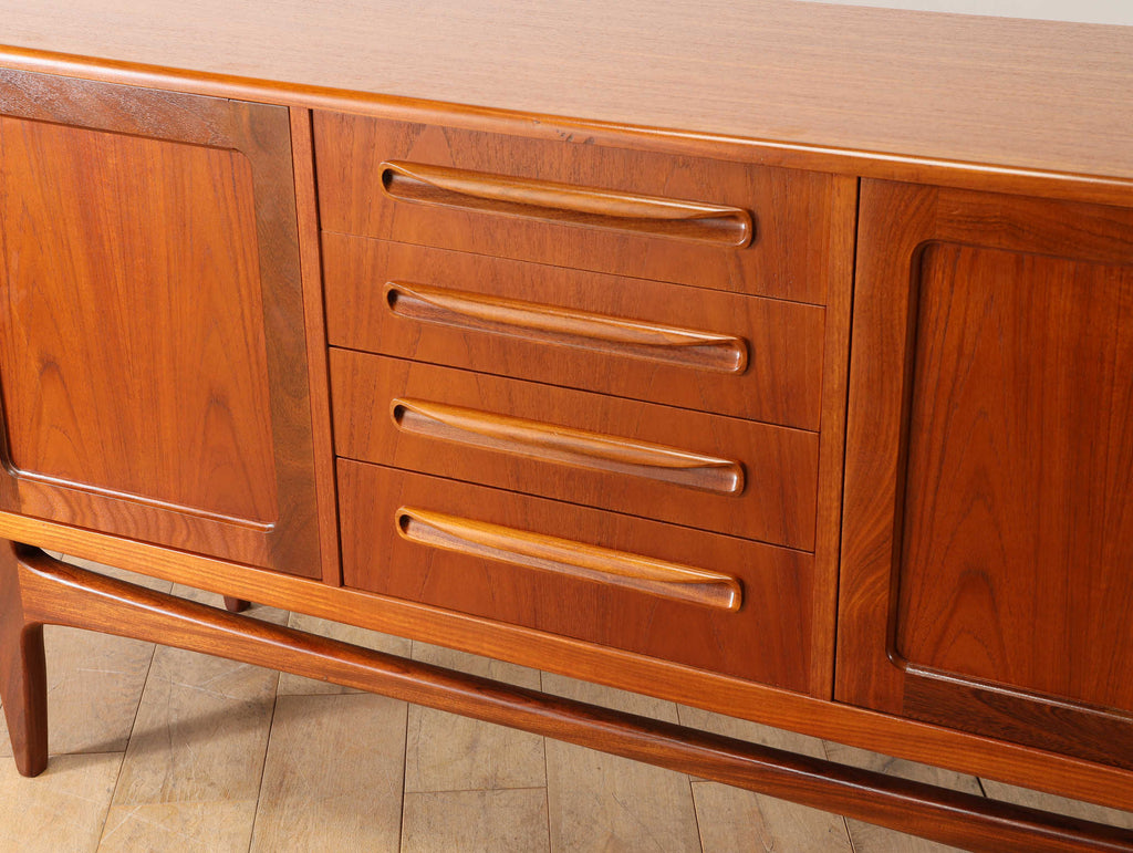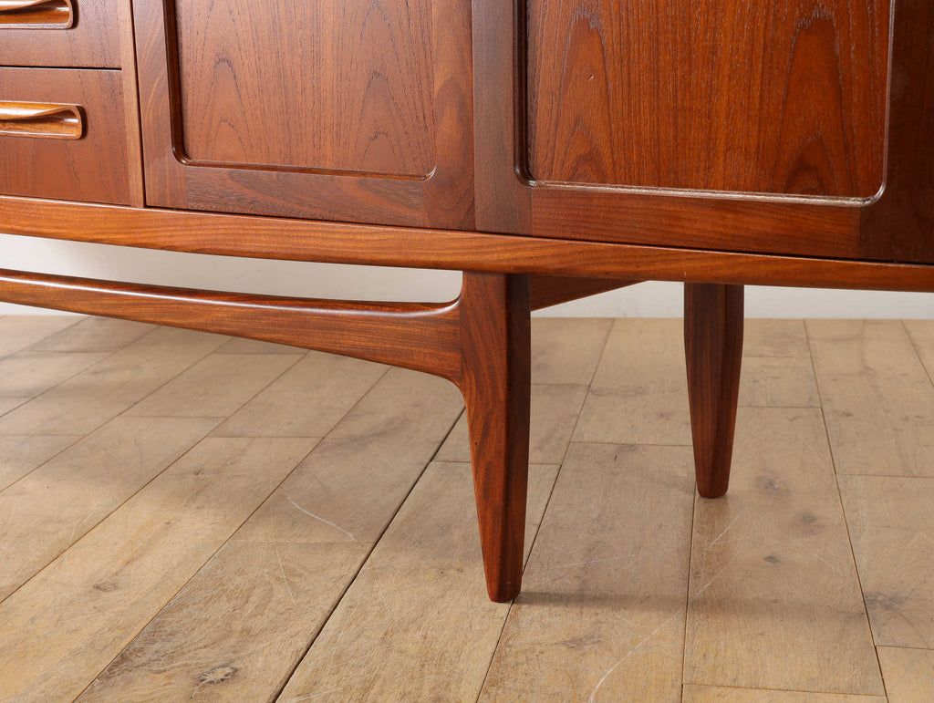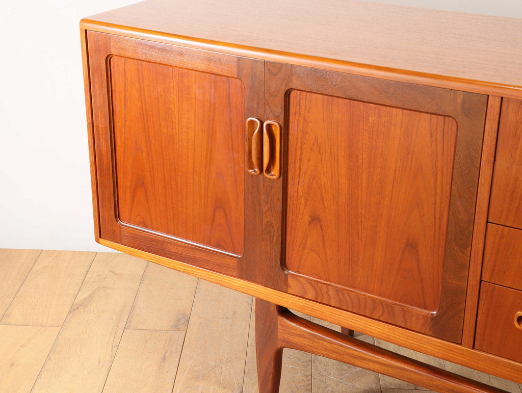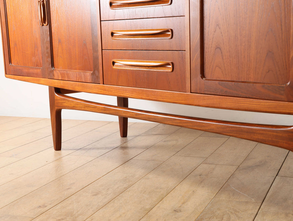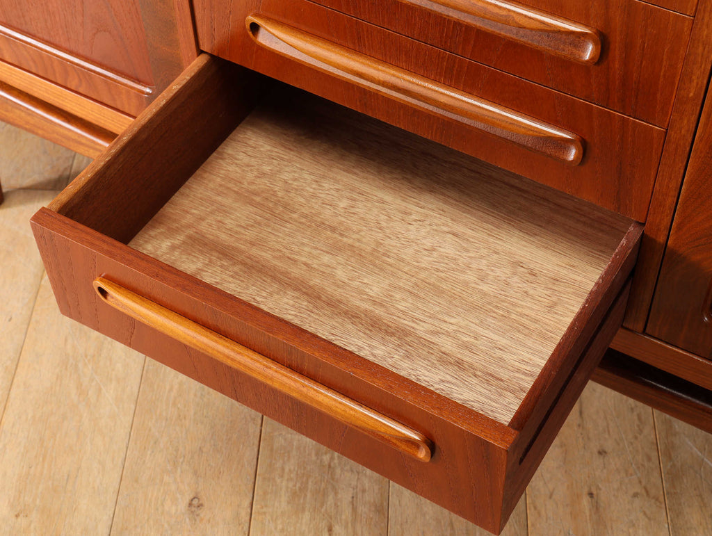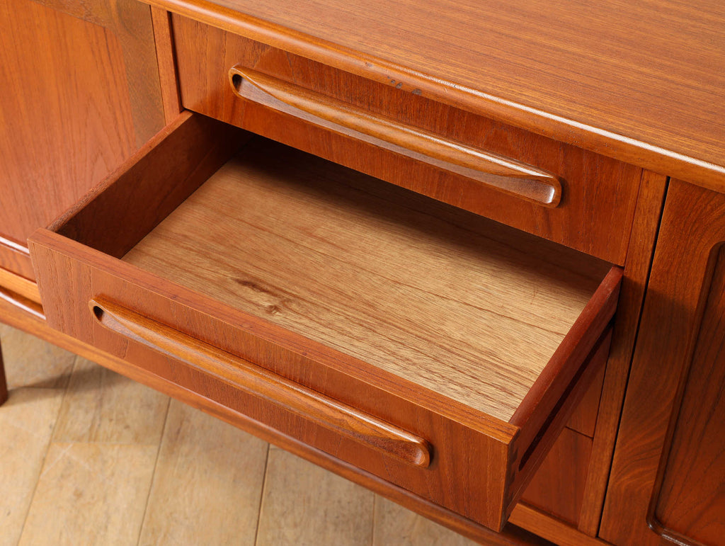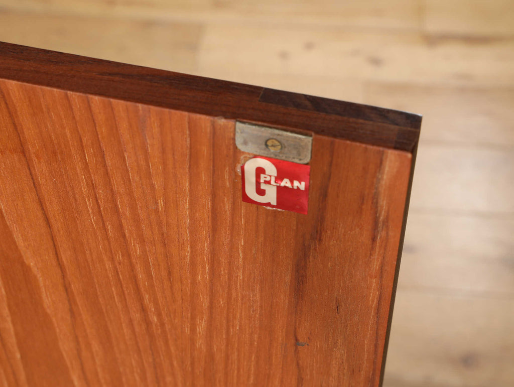 英国老舗家具メーカーである、G-PLANのサイドボードです。流線型を描く脚部にのった収納部分。その伸びやかなディテールは実にスマートで美しい佇まいです。2トーンのチーク材が用いられ、メリハリのある印象になると共に、質感の奥深さといった、雰囲気も大いに感じる事が出来ます。杢目までシンメトリーに配置された観音扉はこのモデルのアイコン的な存在。いつの時代も色褪せない名作の素晴らしさがポイントです。