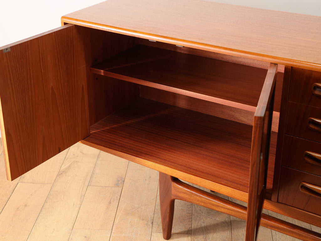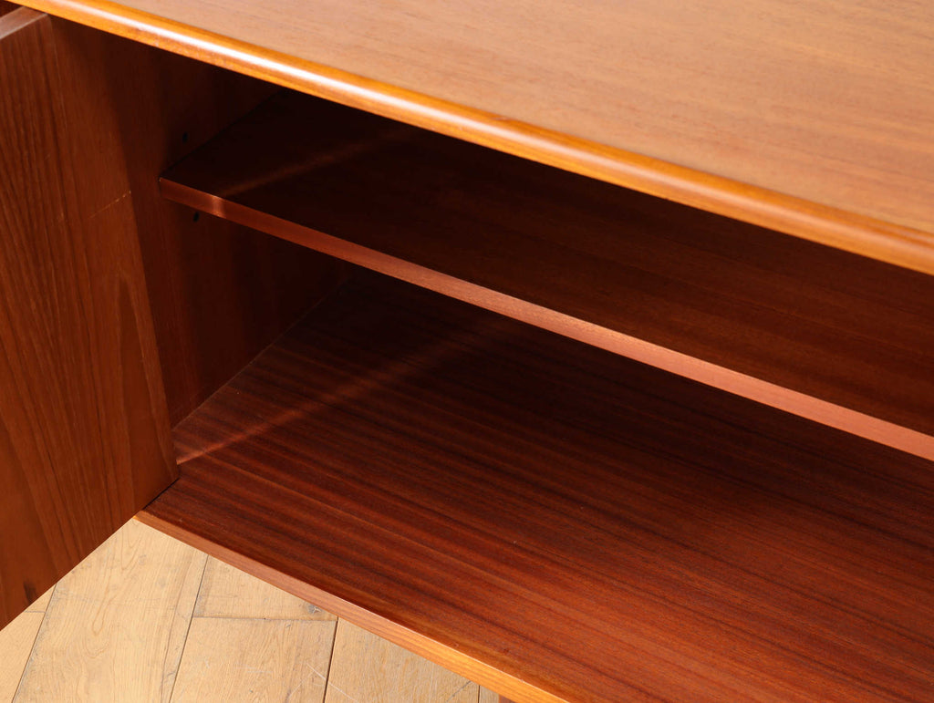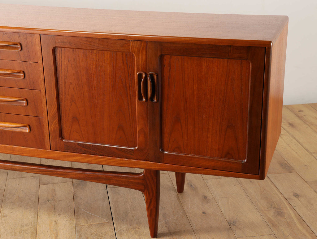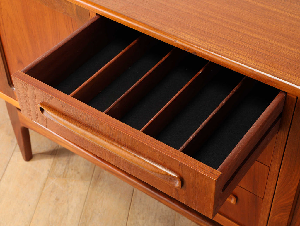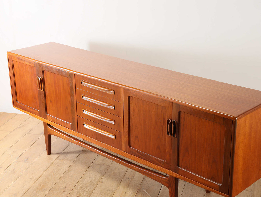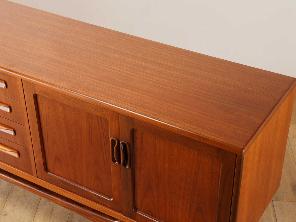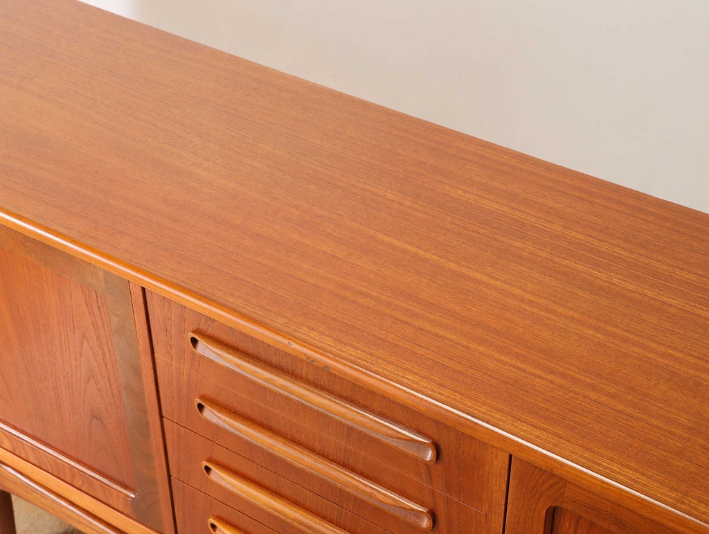 英国老舗家具メーカーである、G-PLANのサイドボードです。流線型を描く脚部にのった収納部分。その伸びやかなディテールは実にスマートで美しい佇まいです。2トーンのチーク材が用いられ、メリハリのある印象になると共に、質感の奥深さといった、雰囲気も大いに感じる事が出来ます。杢目までシンメトリーに配置された観音扉はこのモデルのアイコン的な存在。いつの時代も色褪せない名作の素晴らしさがポイントです。