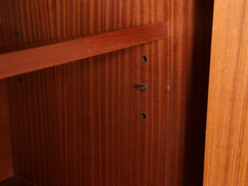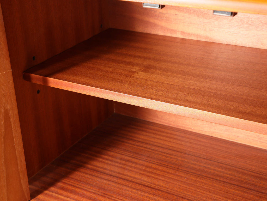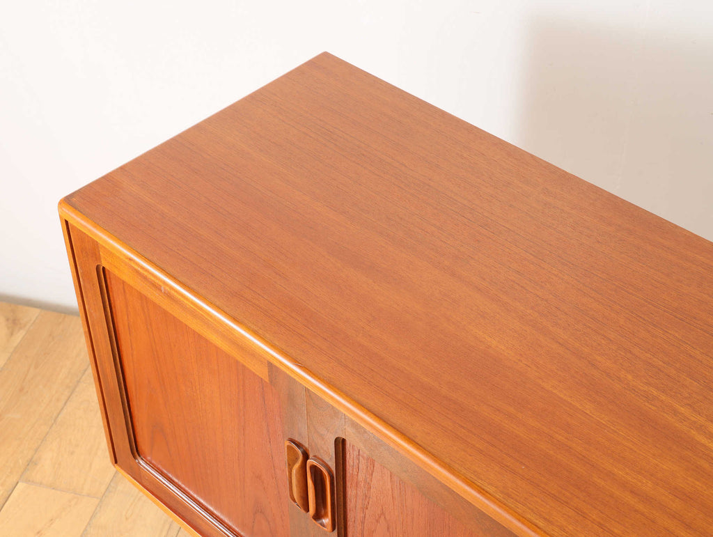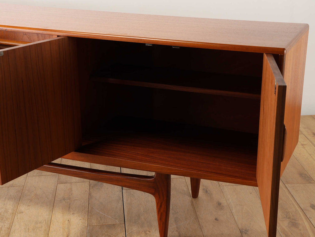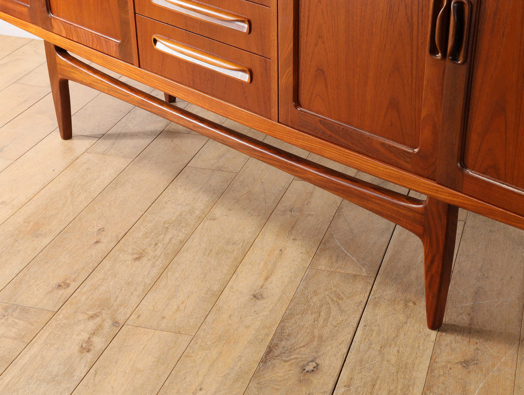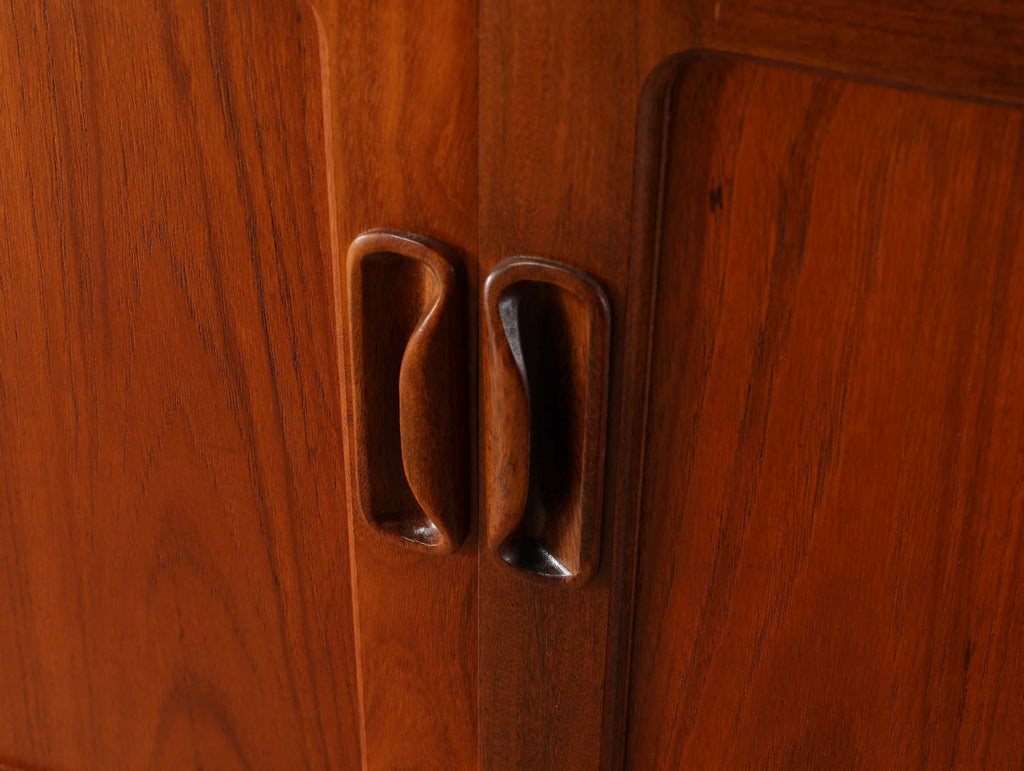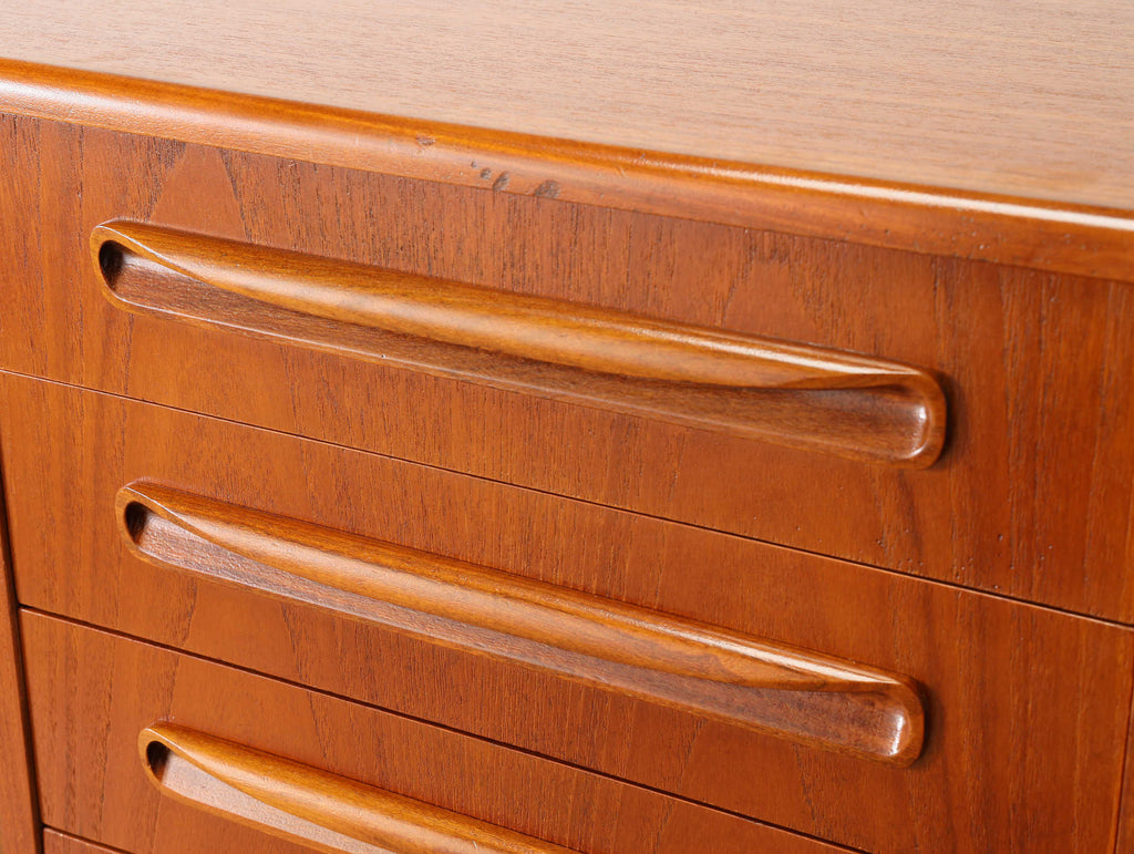 英国老舗家具メーカーである、G-PLANのサイドボードです。流線型を描く脚部にのった収納部分。その伸びやかなディテールは実にスマートで美しい佇まいです。2トーンのチーク材が用いられ、メリハリのある印象になると共に、質感の奥深さといった、雰囲気も大いに感じる事が出来ます。杢目までシンメトリーに配置された観音扉はこのモデルのアイコン的な存在。いつの時代も色褪せない名作の素晴らしさがポイントです。