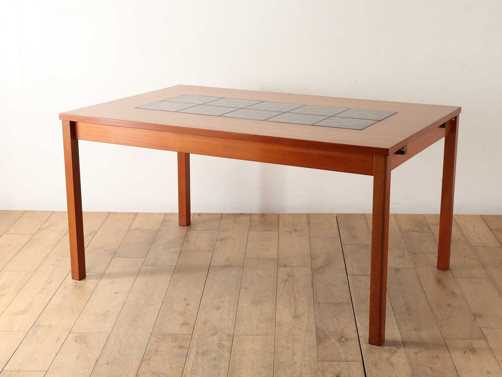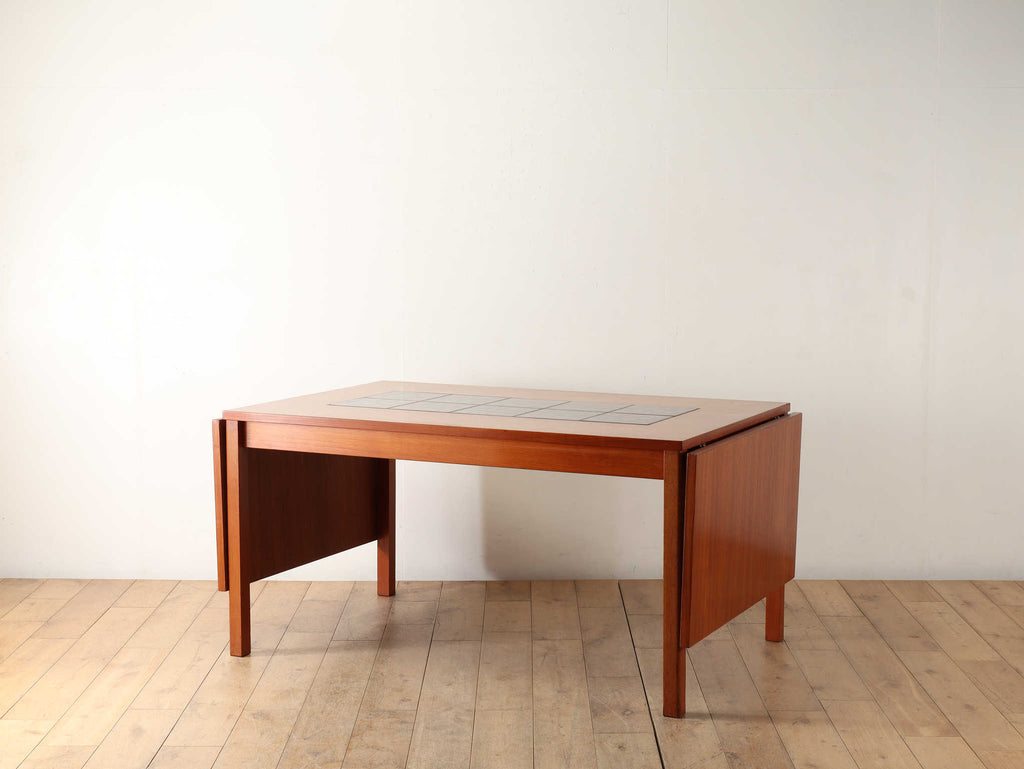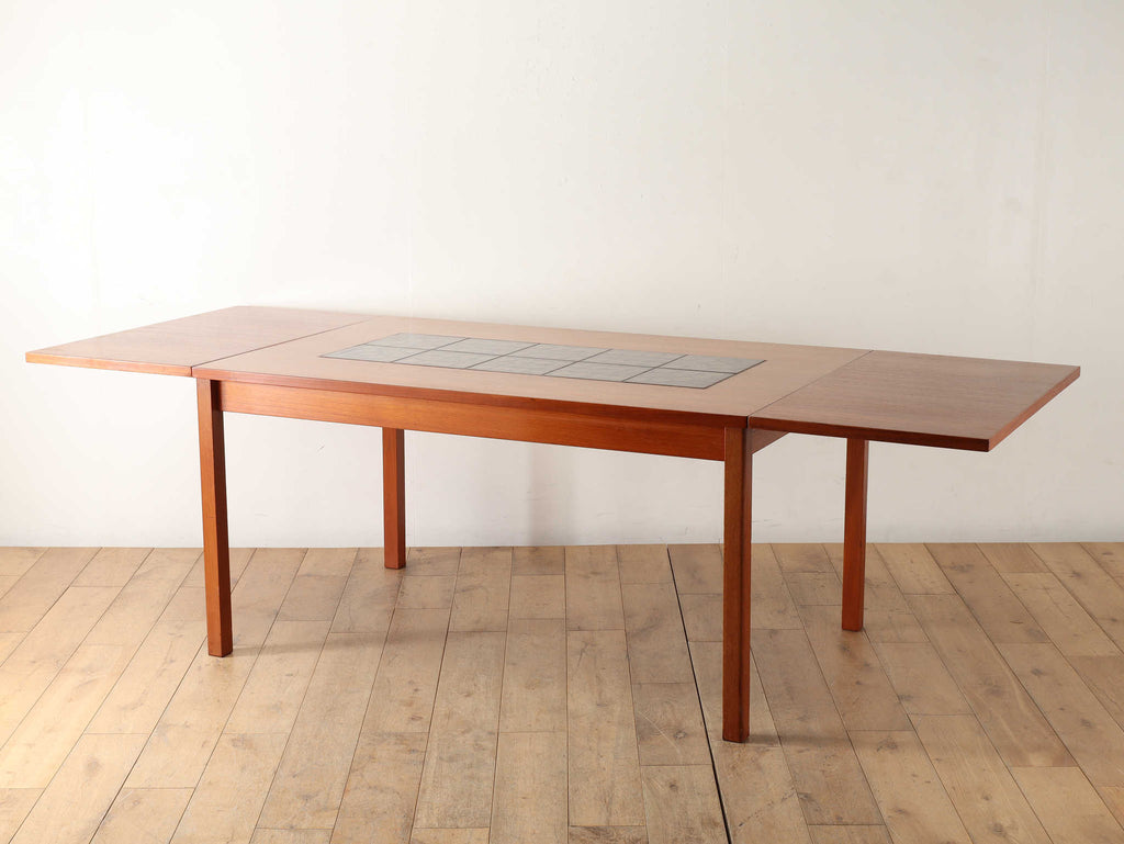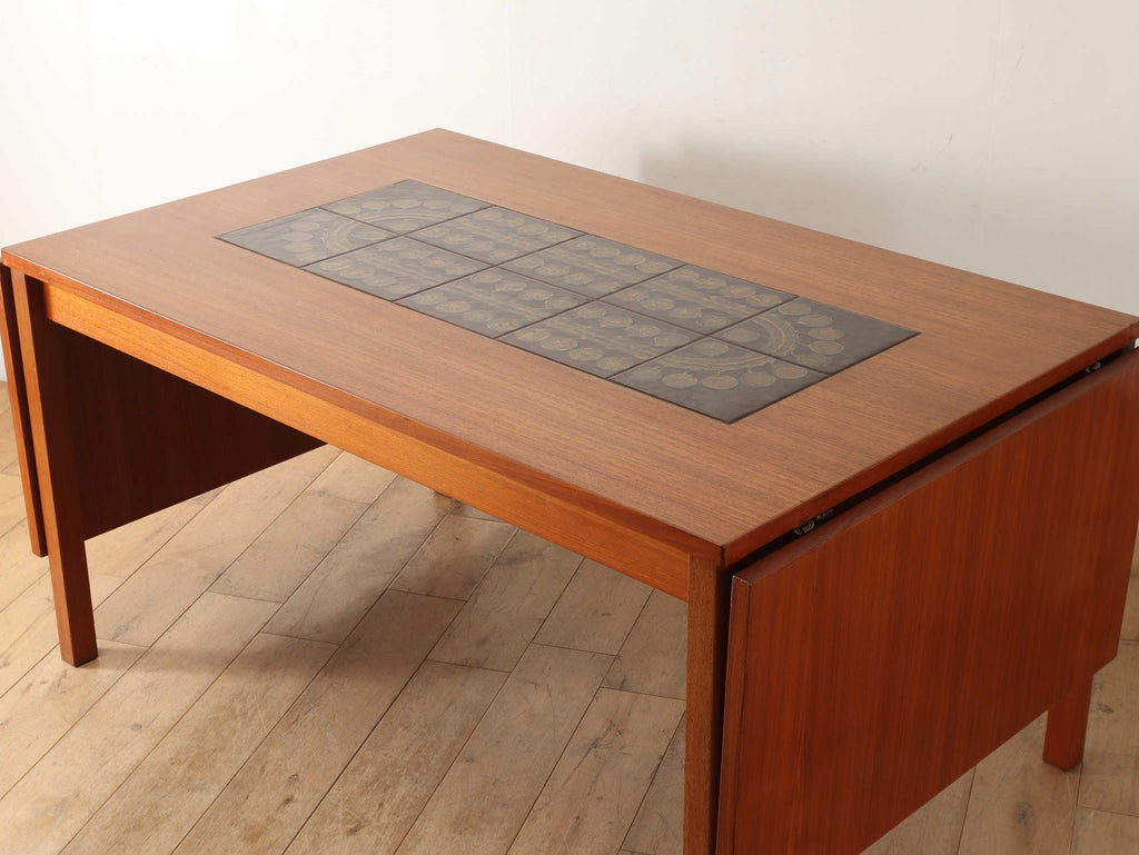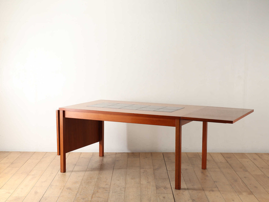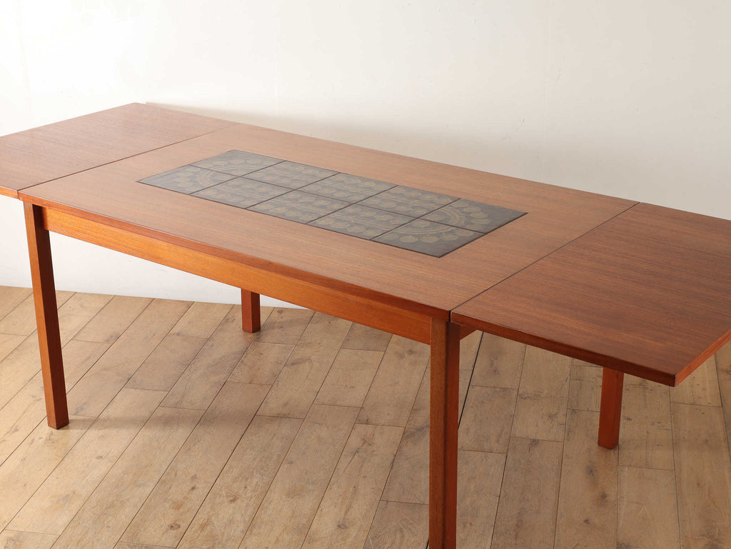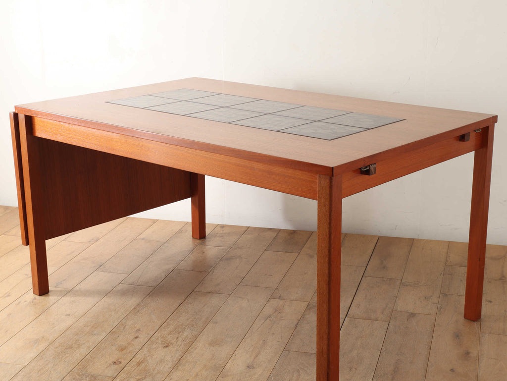 1960年代(推定)のデンマークで作られたタイルトップダイニングテーブル。特徴的なタイルの絵柄に、思わず目を奪われる逸品です。タイル部分は、コップや花瓶など水物を気にせず置くことができ、扱いやすいといったメリットがあります。こちらのテーブルは天板を折りたたむことがき、開くと2400mm、折りたたむと1480mmと人数に合わせちょうどよい大きさでお使いいただけます。タイルトップダイニングテーブルで、食卓を彩ってみてはいかがでしょうか。