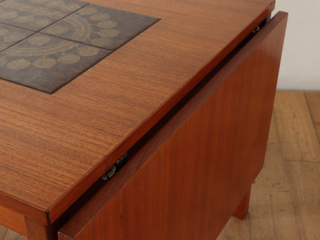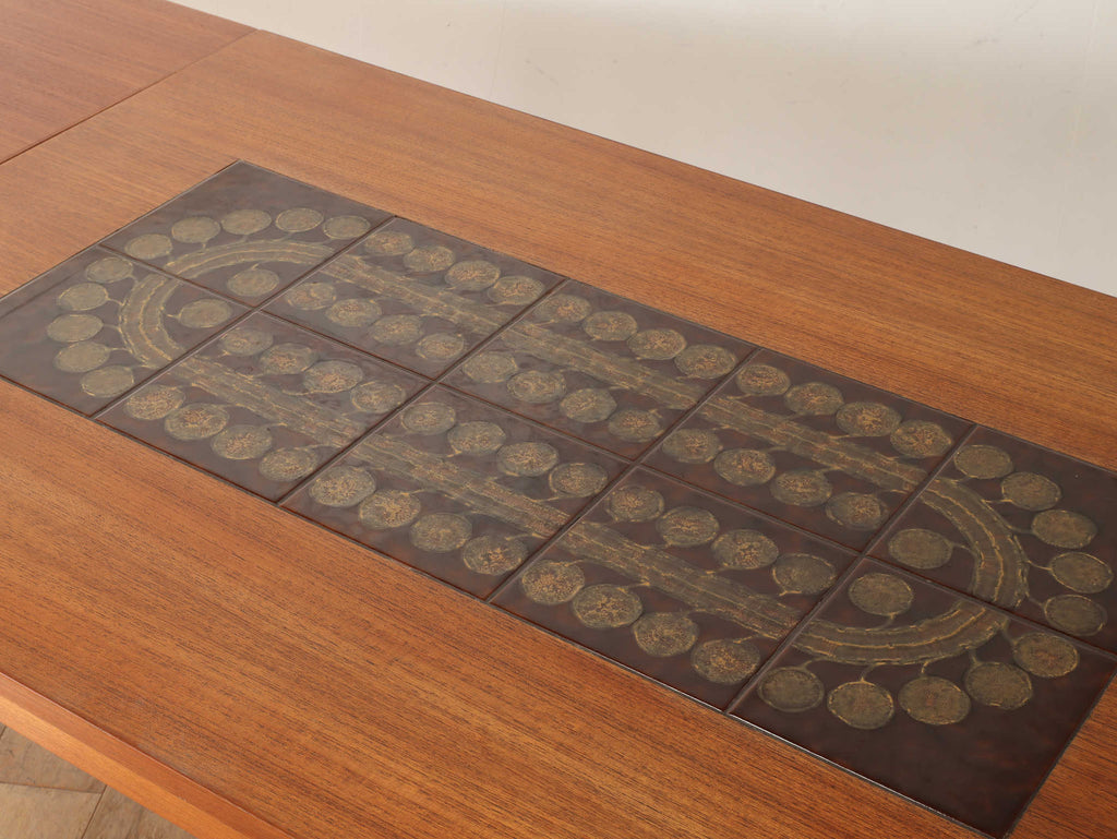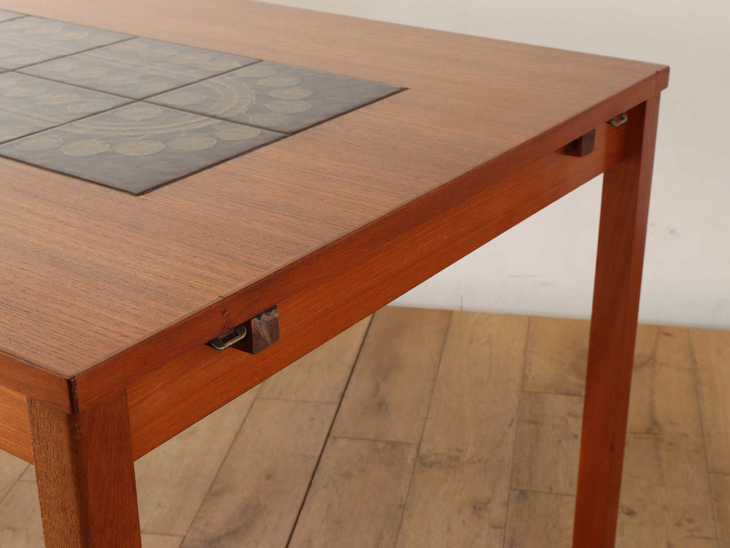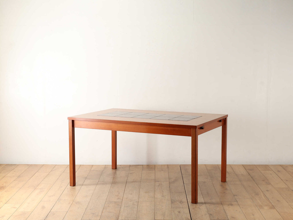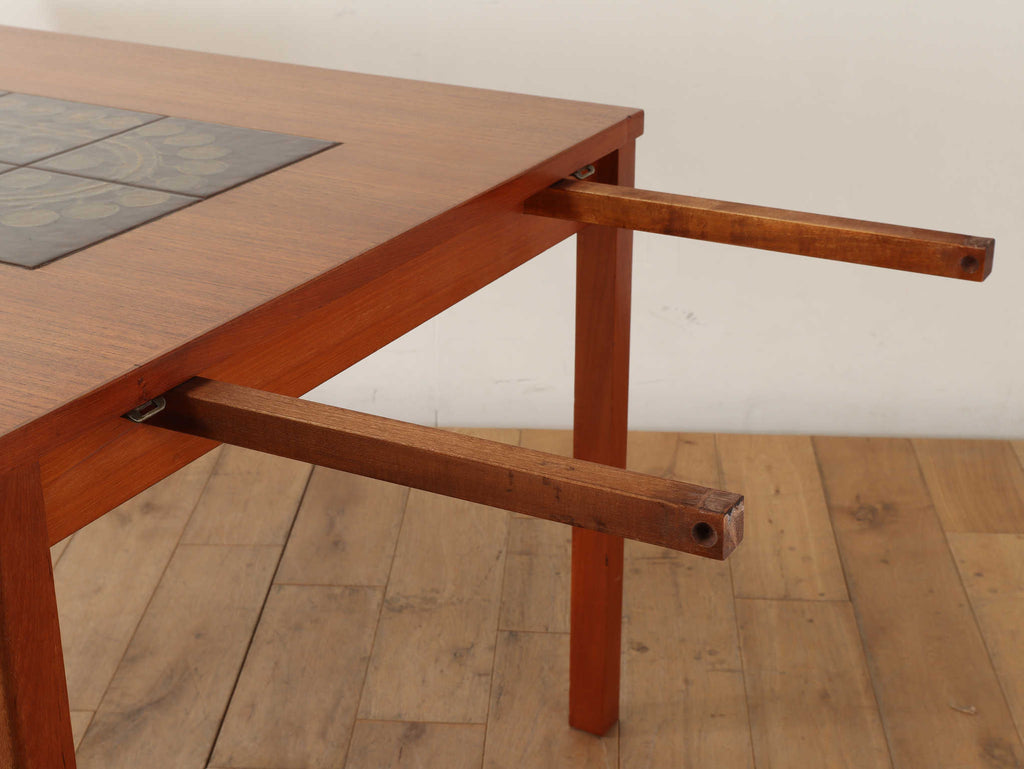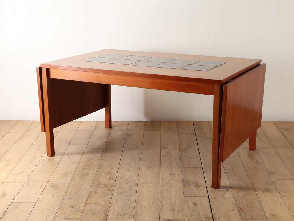 1960年代(推定)のデンマークで作られたタイルトップダイニングテーブル。特徴的なタイルの絵柄に、思わず目を奪われる逸品です。タイル部分は、コップや花瓶など水物を気にせず置くことができ、扱いやすいといったメリットがあります。こちらのテーブルは天板を折りたたむことがき、開くと2400mm、折りたたむと1480mmと人数に合わせちょうどよい大きさでお使いいただけます。タイルトップダイニングテーブルで、食卓を彩ってみてはいかがでしょうか。