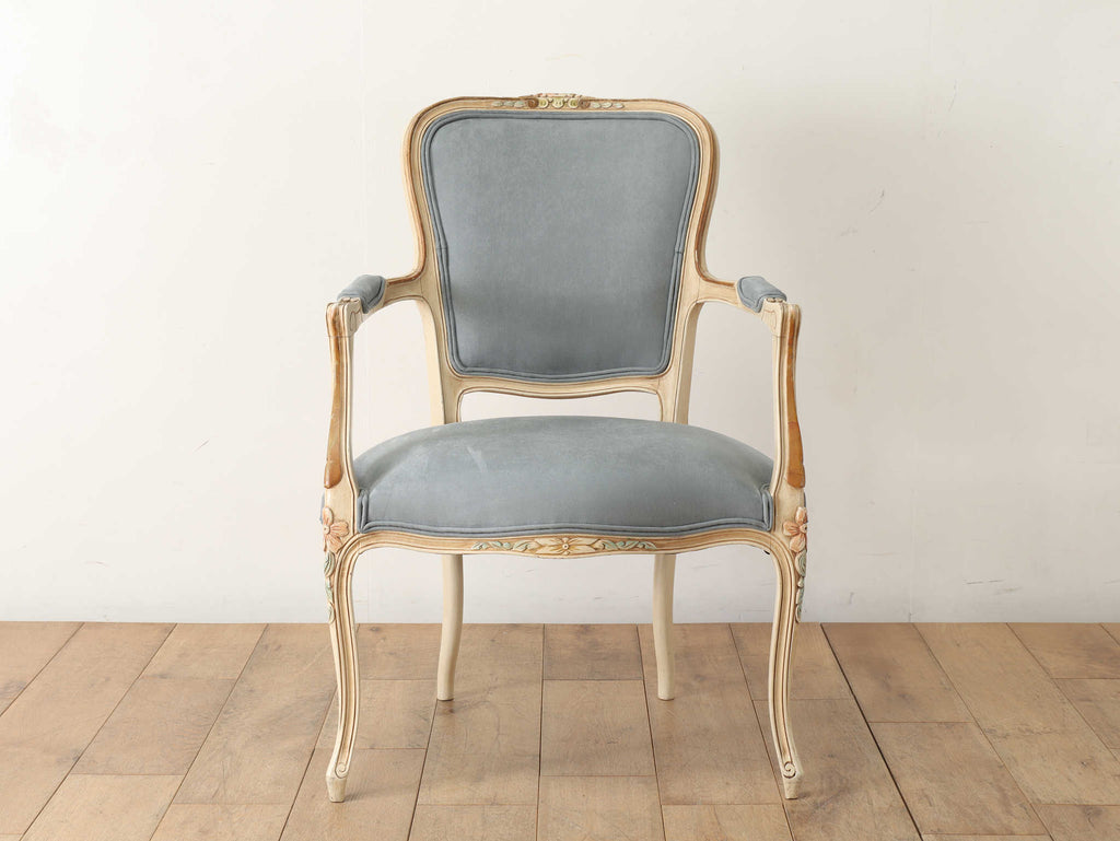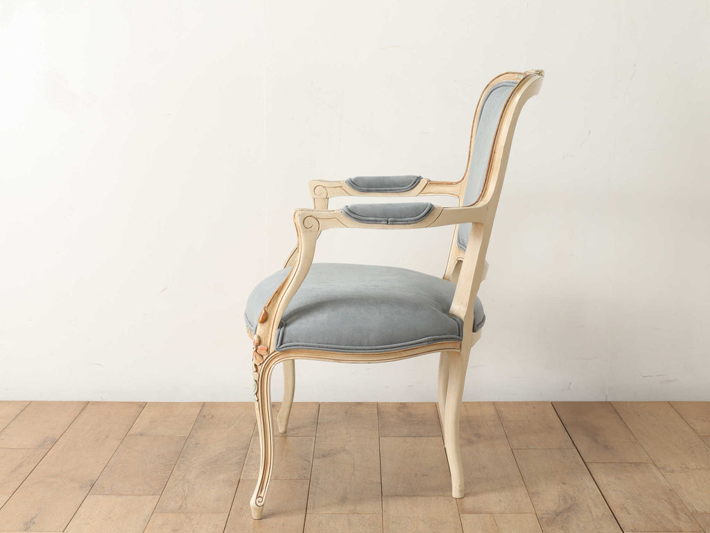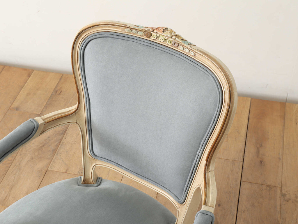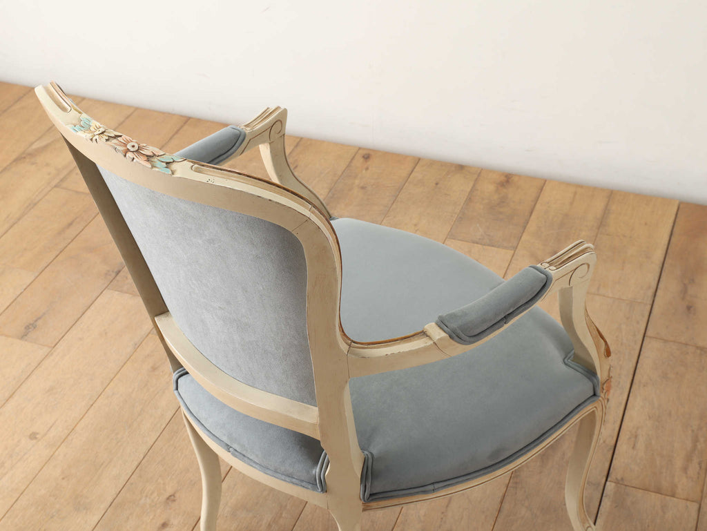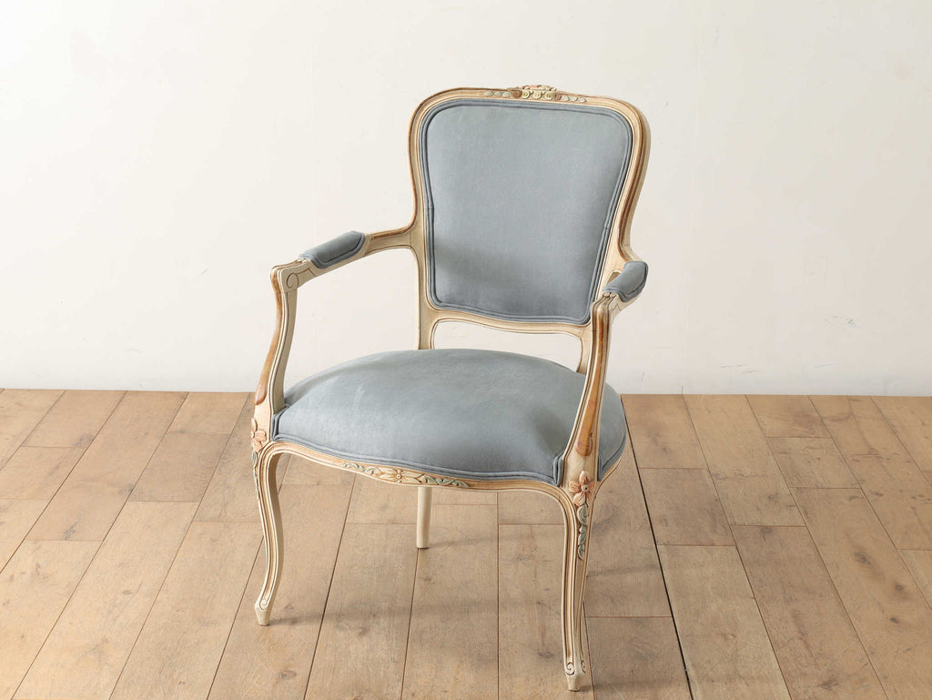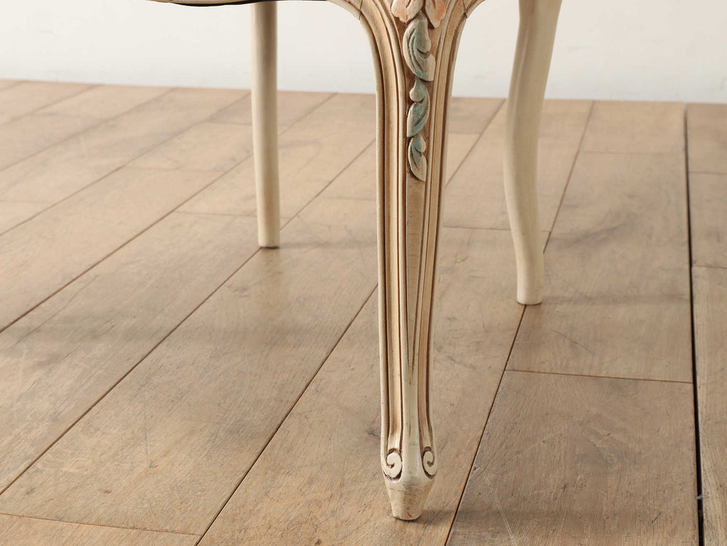 ホワイトペイントフレームに花々が散りばめられた、エレガントな佇まいのフレンチアームチェア。優美なシルエットは大変美しく、そこにあるだけで主役になるチェアです。まるで映画の世界に入り込んだような空間をつくりあげる1脚です。お気に入りのマイチェアとして、インテリアのアクセントとして、お部屋に取り入れてみてはいかがでしょうか。