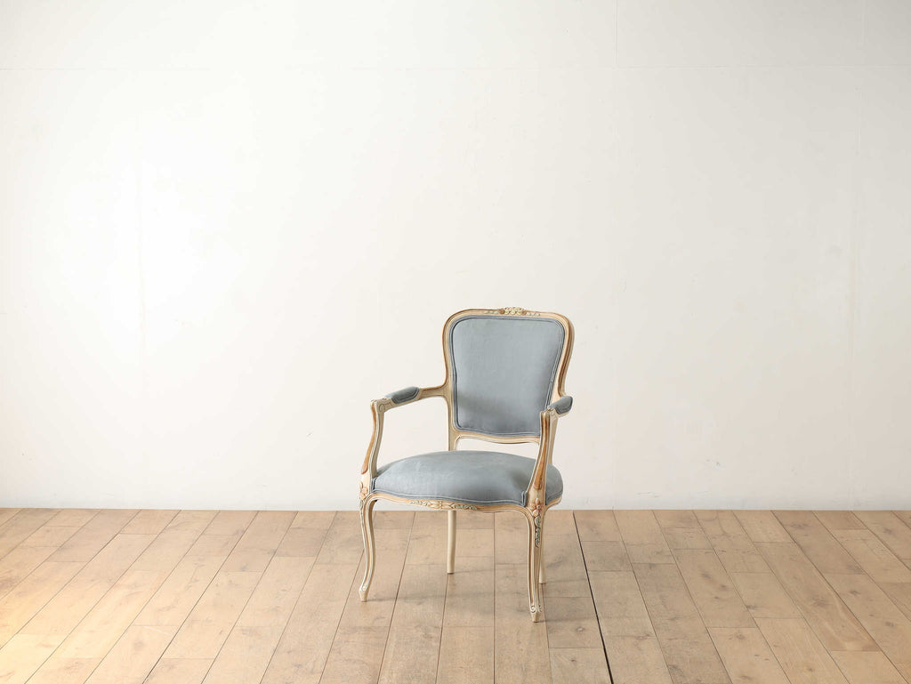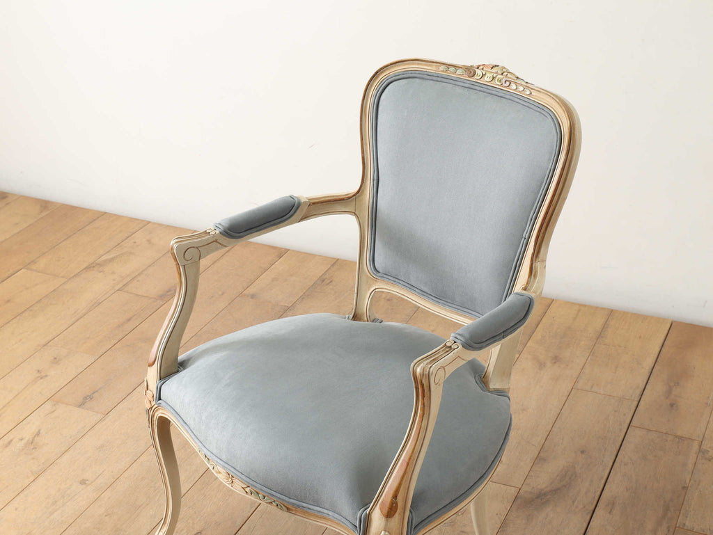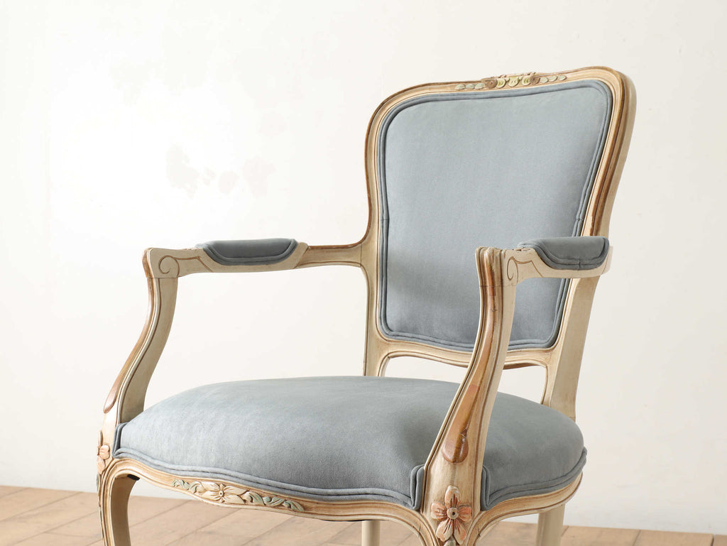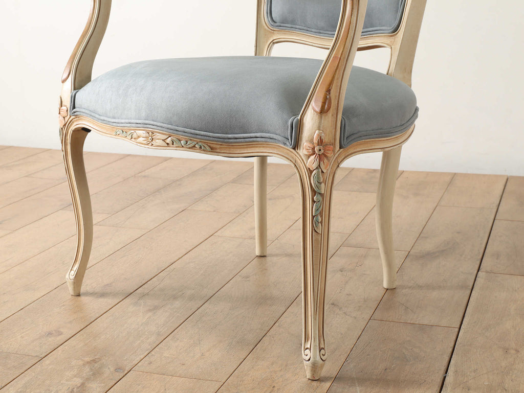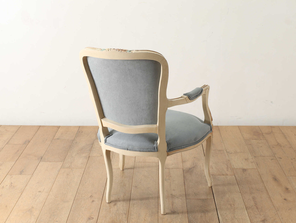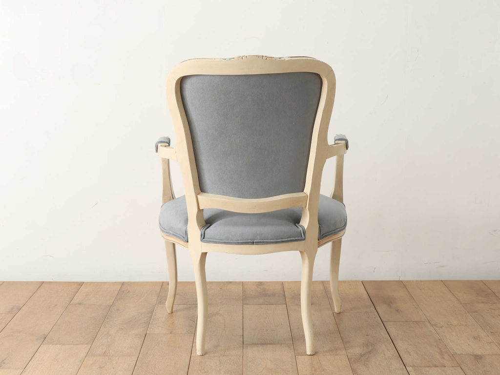 ホワイトペイントフレームに花々が散りばめられた、エレガントな佇まいのフレンチアームチェア。優美なシルエットは大変美しく、そこにあるだけで主役になるチェアです。まるで映画の世界に入り込んだような空間をつくりあげる1脚です。お気に入りのマイチェアとして、インテリアのアクセントとして、お部屋に取り入れてみてはいかがでしょうか。