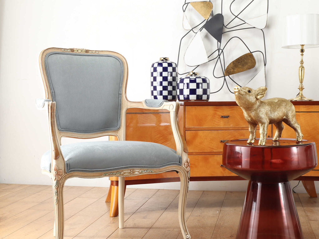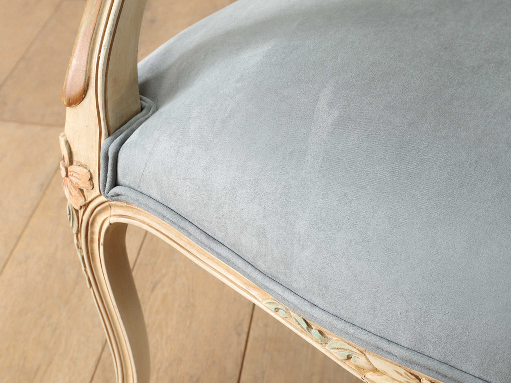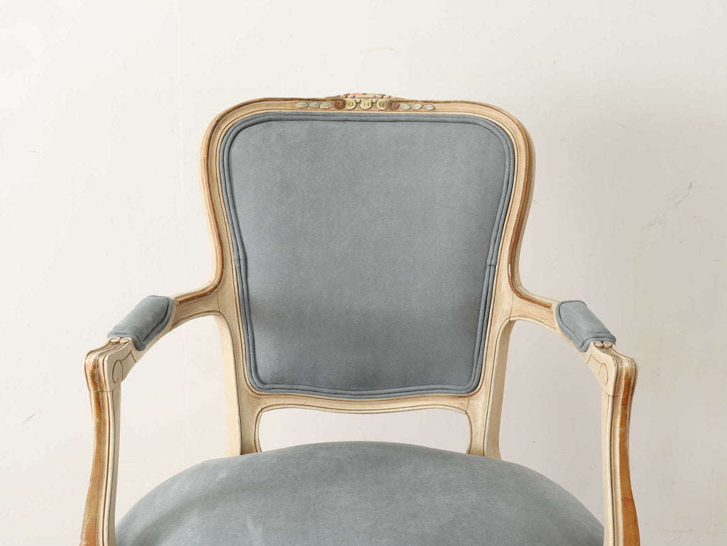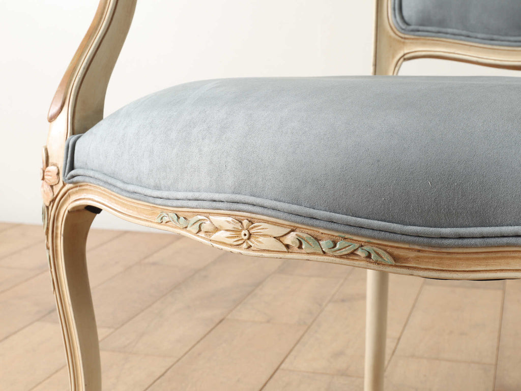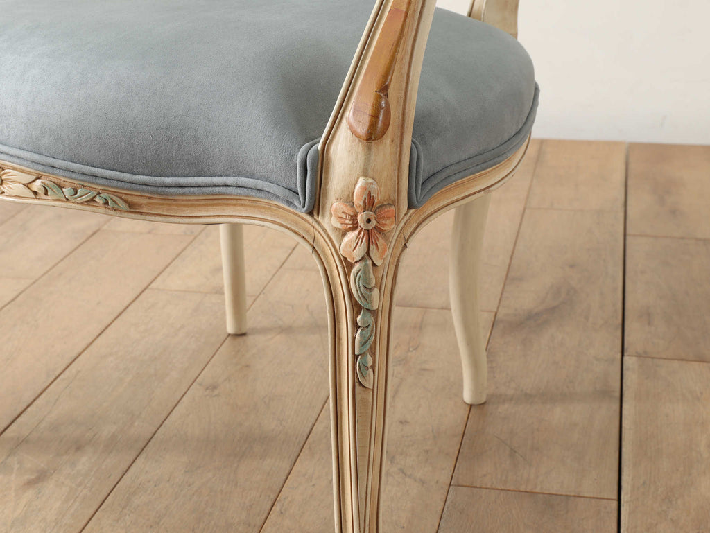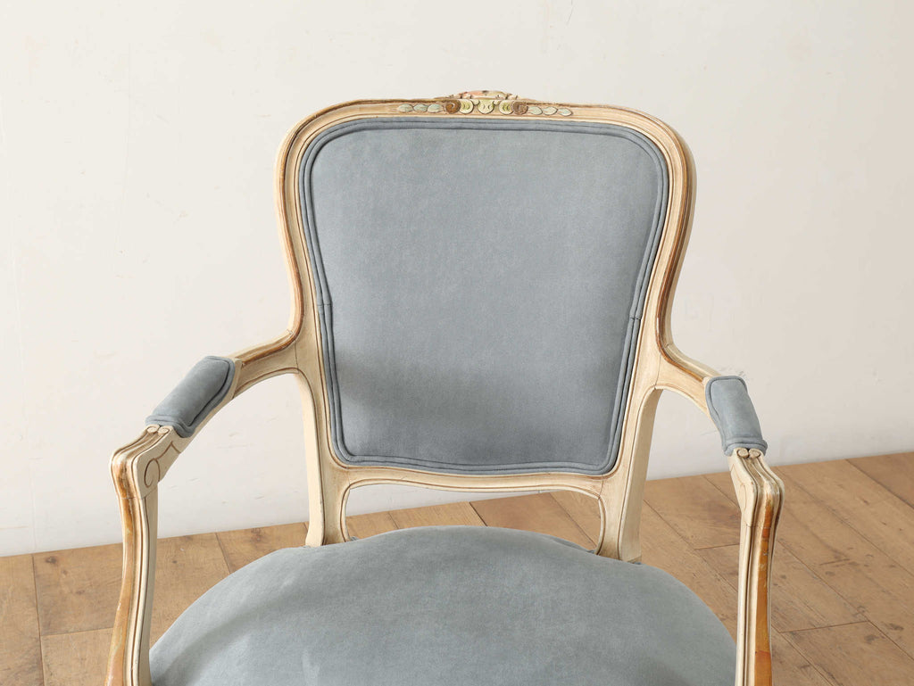 ホワイトペイントフレームに花々が散りばめられた、エレガントな佇まいのフレンチアームチェア。優美なシルエットは大変美しく、そこにあるだけで主役になるチェアです。まるで映画の世界に入り込んだような空間をつくりあげる1脚です。お気に入りのマイチェアとして、インテリアのアクセントとして、お部屋に取り入れてみてはいかがでしょうか。