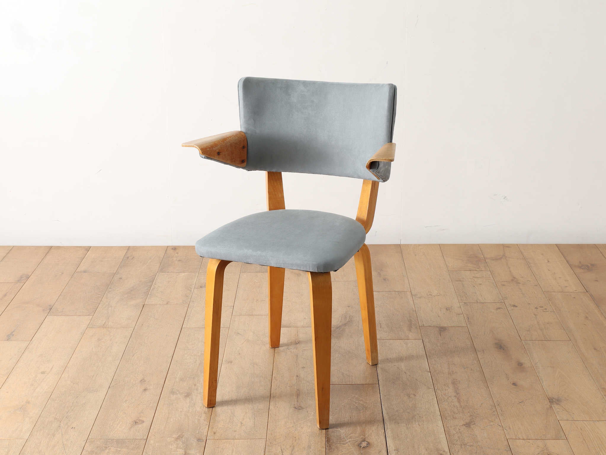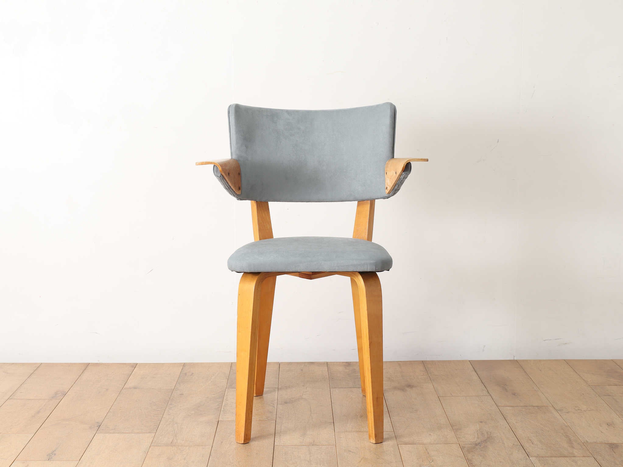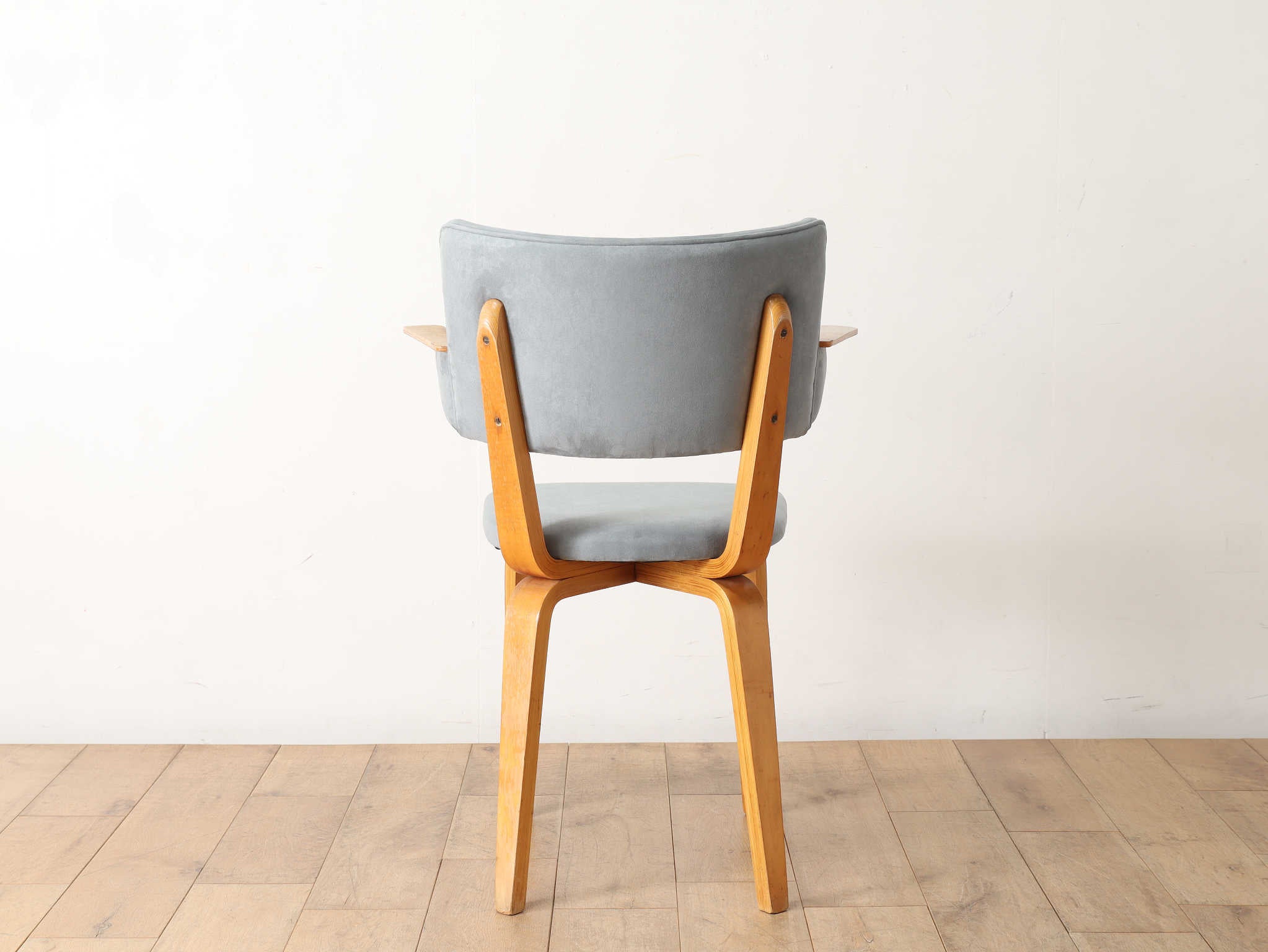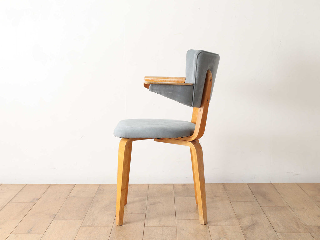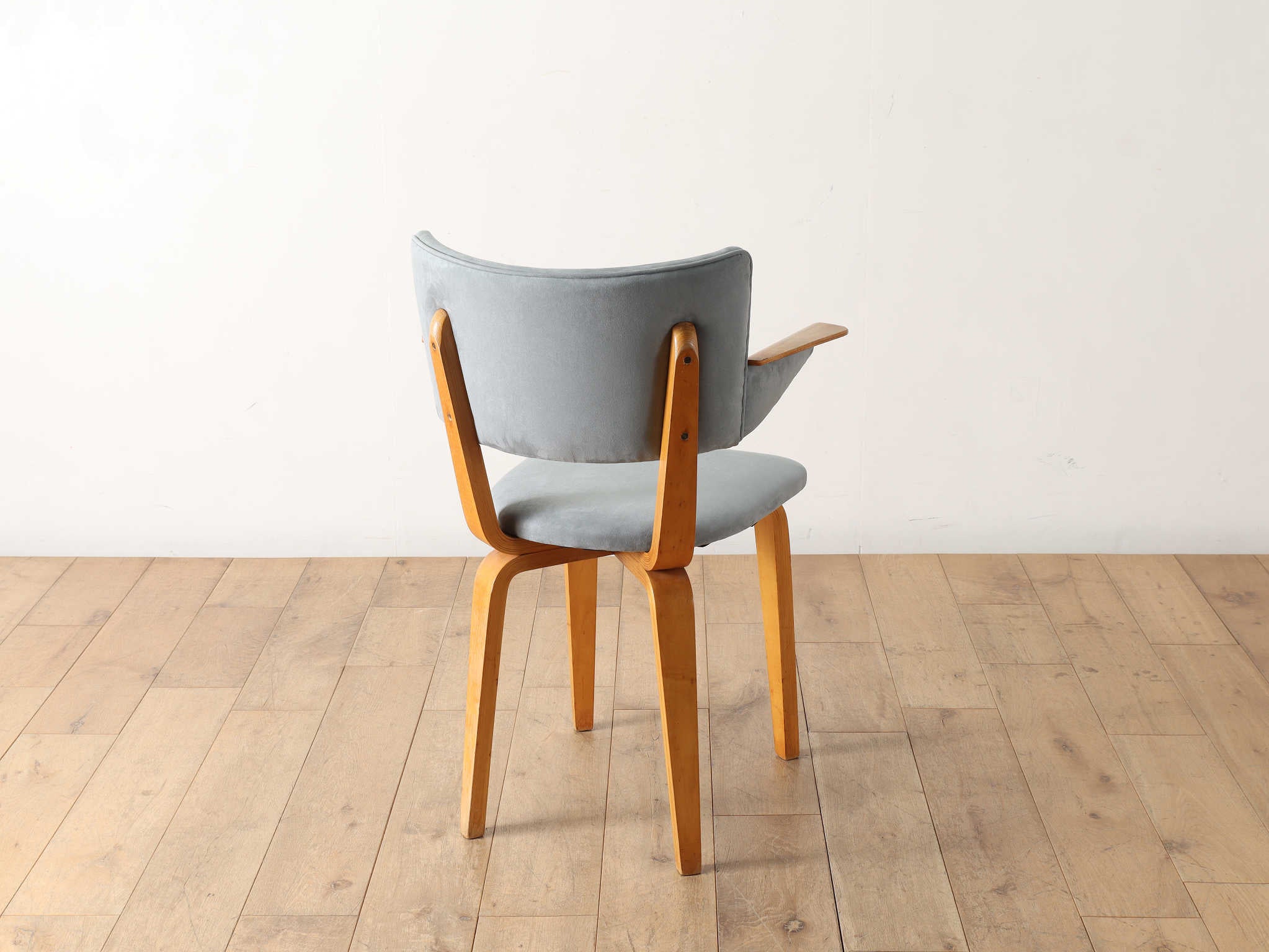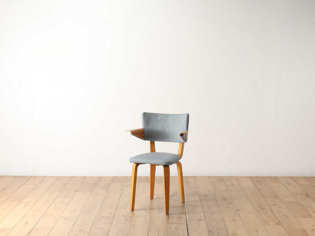 オランダのインテリアデザイナー兼プロダクトデザイナー,Cor Alonsによりデザインされたチェアです。成型合板を使用した構造が彼のアイコン的なデザインを表現しており、どこか素朴さがありながらも実用性に富んだキャラクター性溢れるチェアに仕上がっております。特に、パネル上の板を設置したアーム部分はなんとも可愛らしい印象であり、大袈裟なイージーチェアには劣るとも、安楽性も十分に備えられております。テーブルに合わせた際も、場所を取らず、省スペース化を考えられた機能性もあり、末永くご愛用頂ける事でしょう。