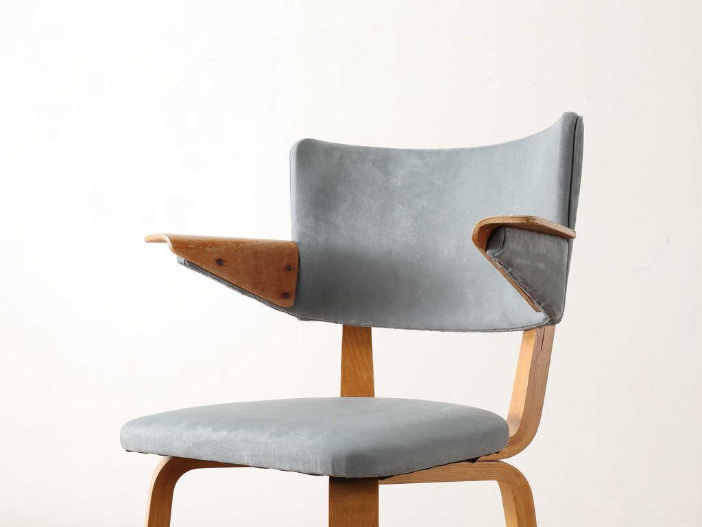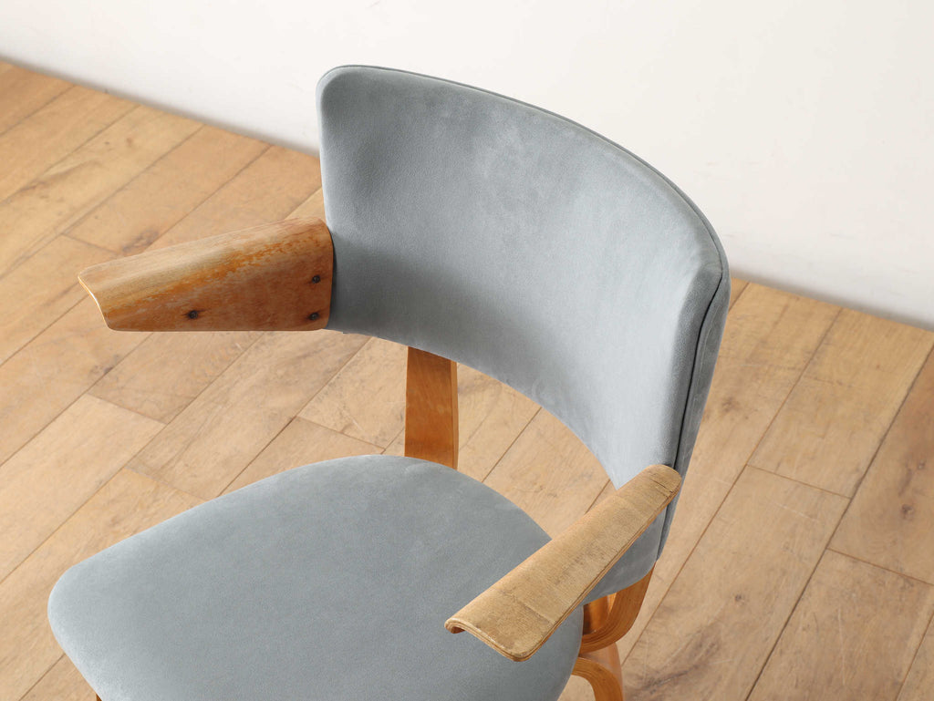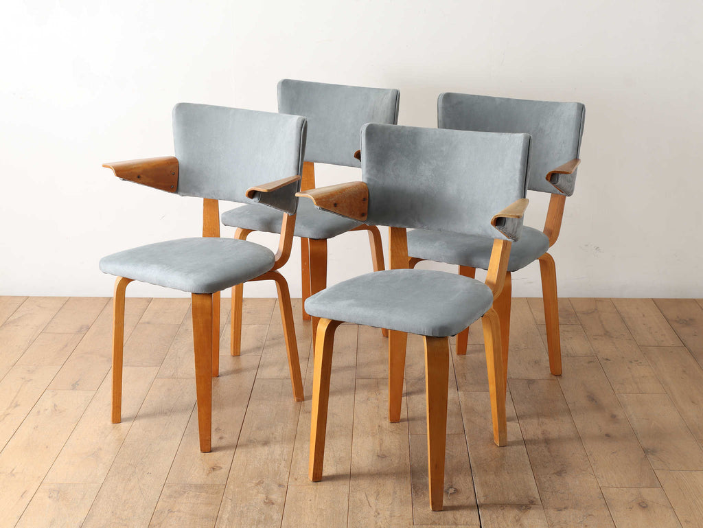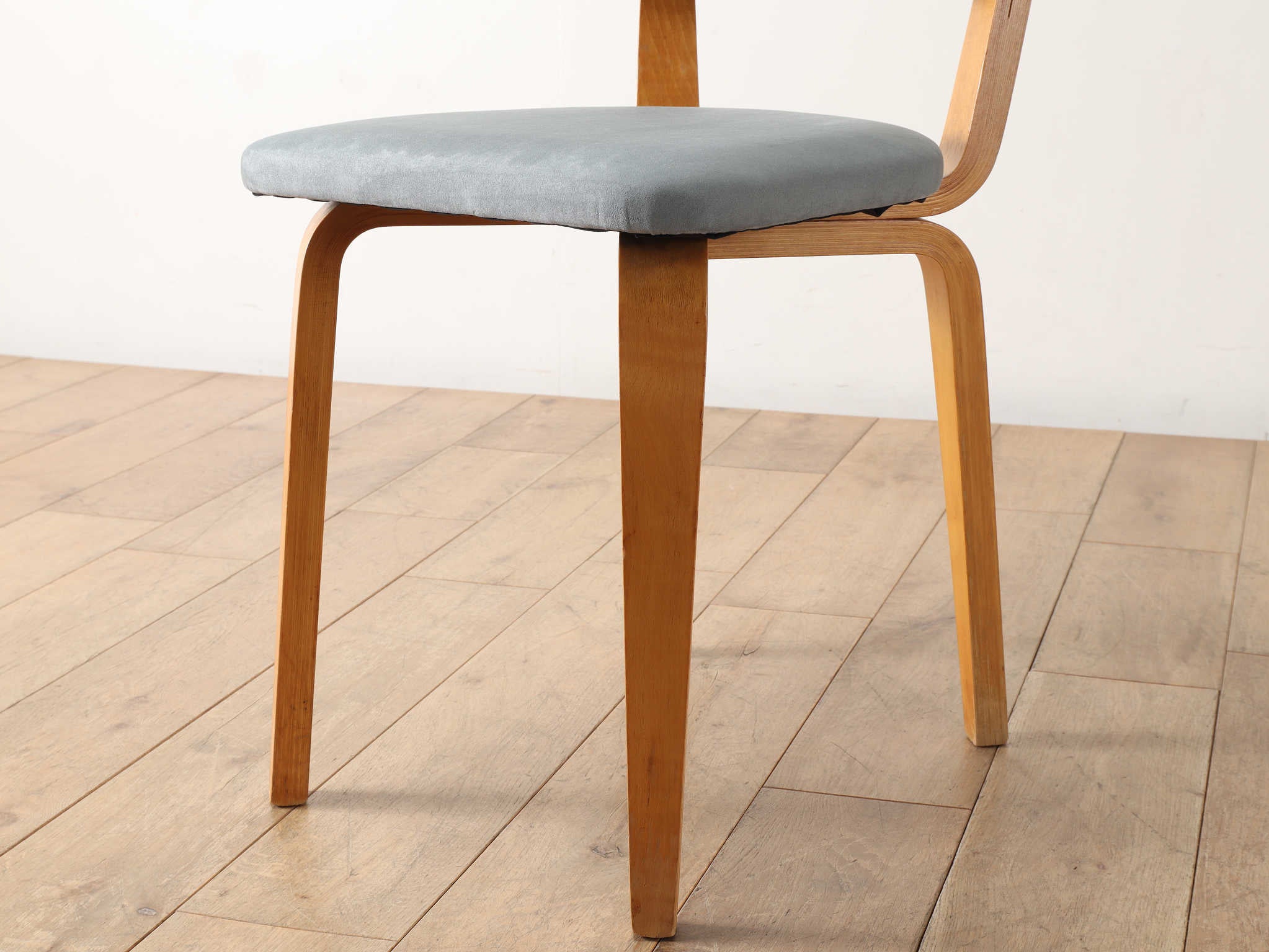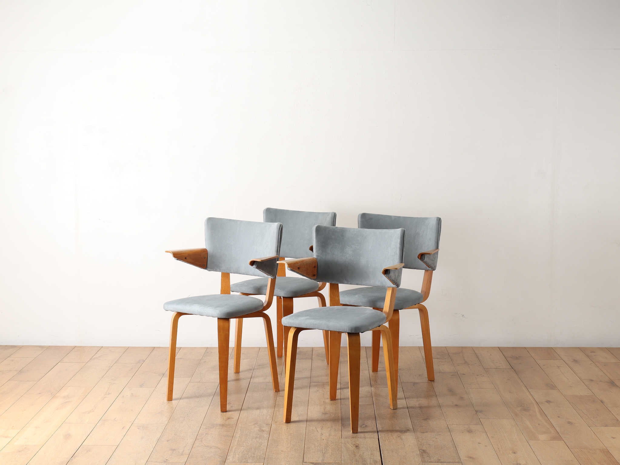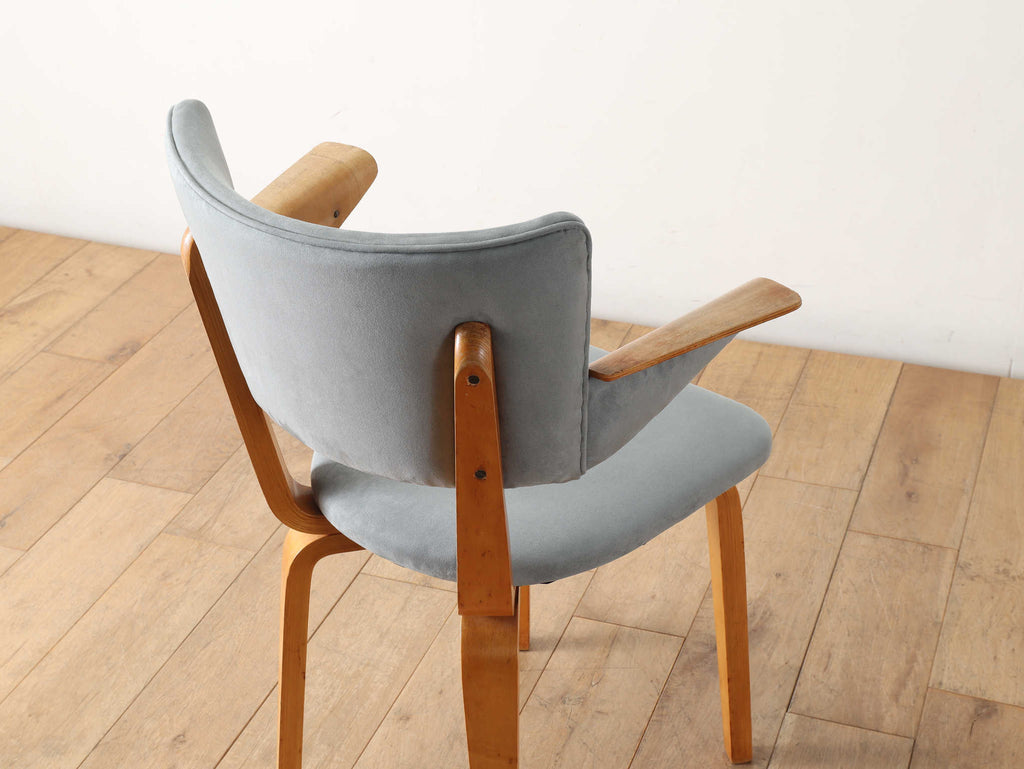 オランダのインテリアデザイナー兼プロダクトデザイナー,Cor Alonsによりデザインされたチェアです。成型合板を使用した構造が彼のアイコン的なデザインを表現しており、どこか素朴さがありながらも実用性に富んだキャラクター性溢れるチェアに仕上がっております。特に、パネル上の板を設置したアーム部分はなんとも可愛らしい印象であり、大袈裟なイージーチェアには劣るとも、安楽性も十分に備えられております。テーブルに合わせた際も、場所を取らず、省スペース化を考えられた機能性もあり、末永くご愛用頂ける事でしょう。