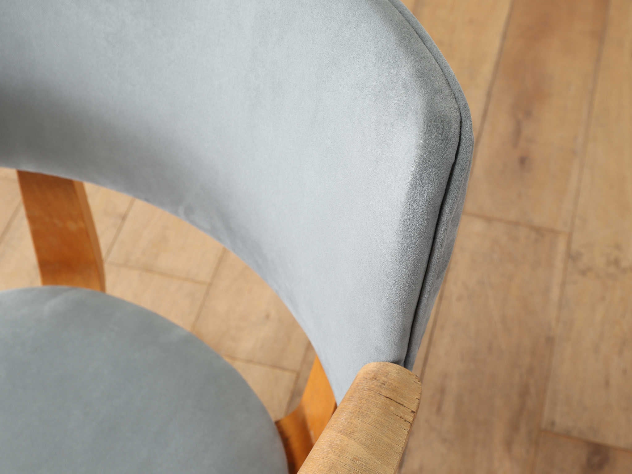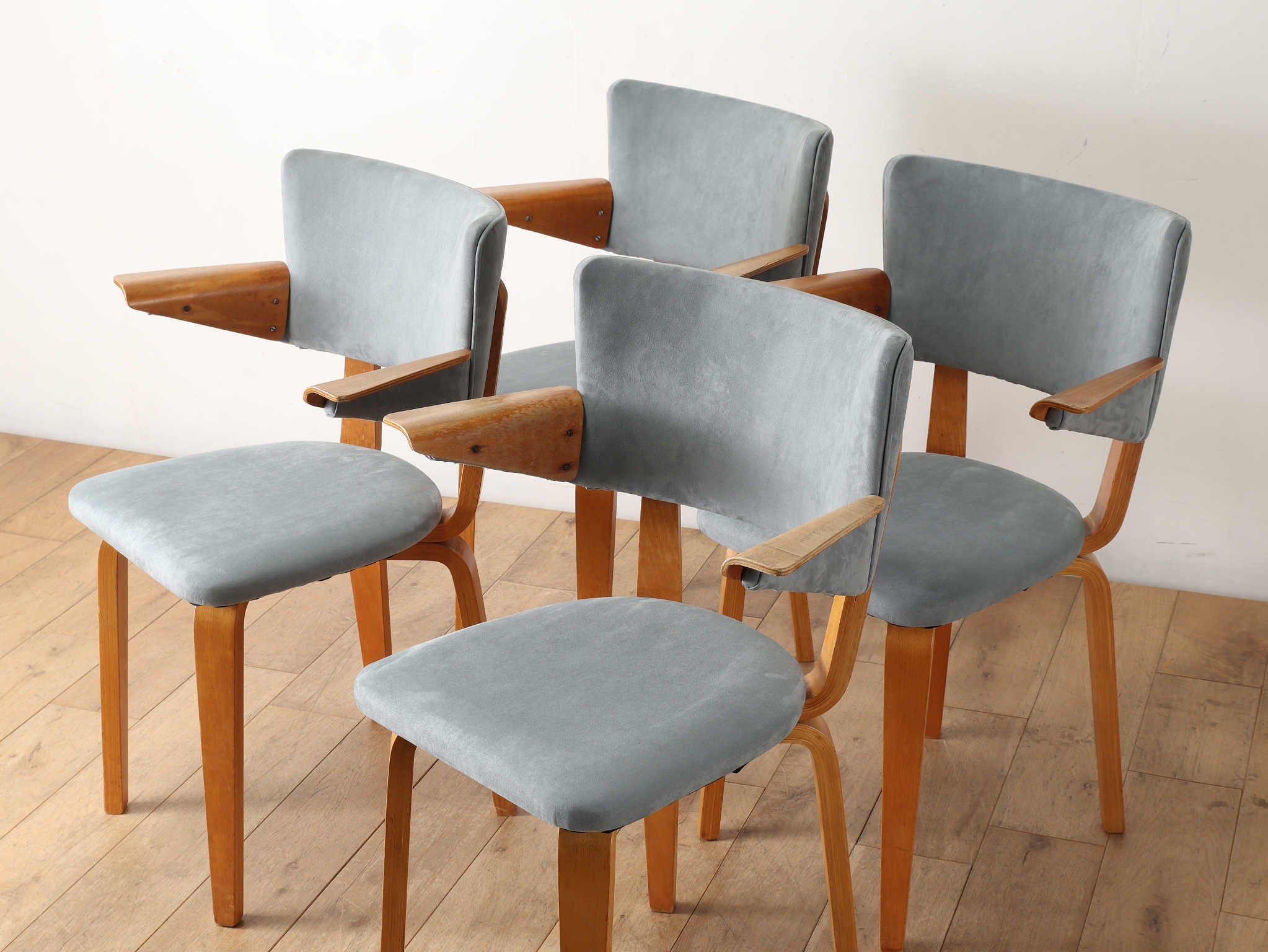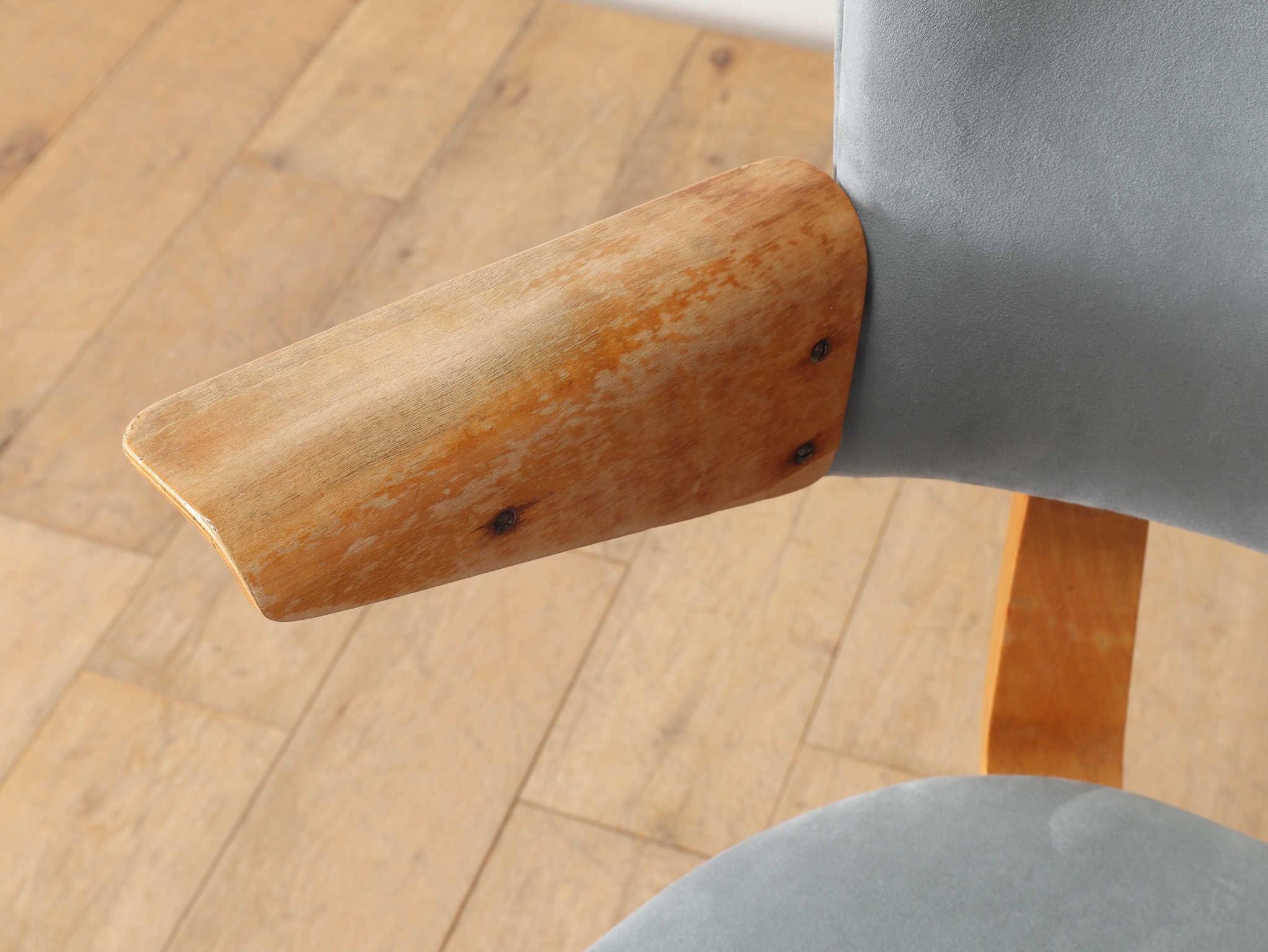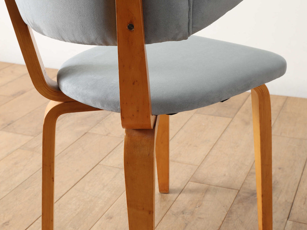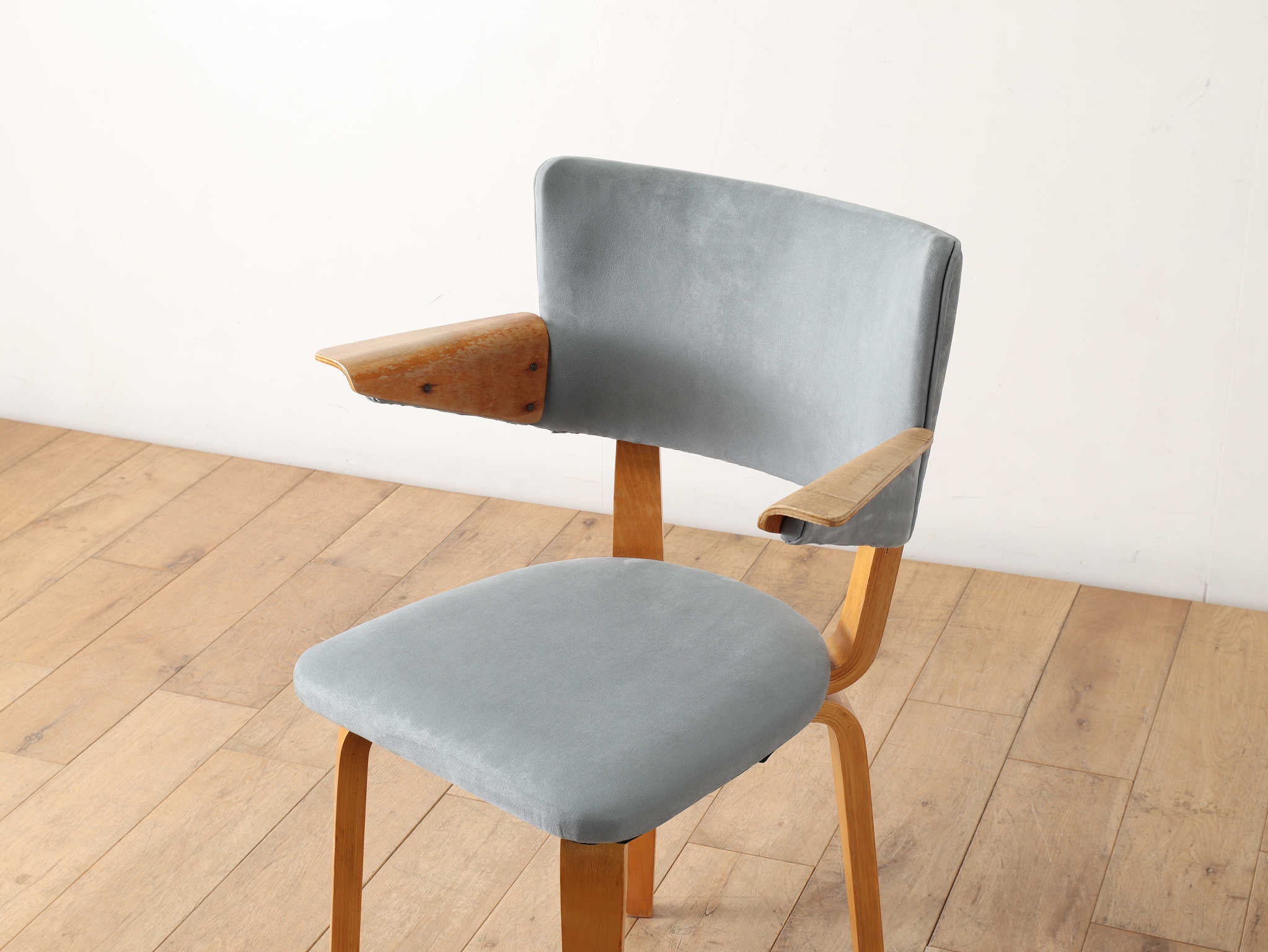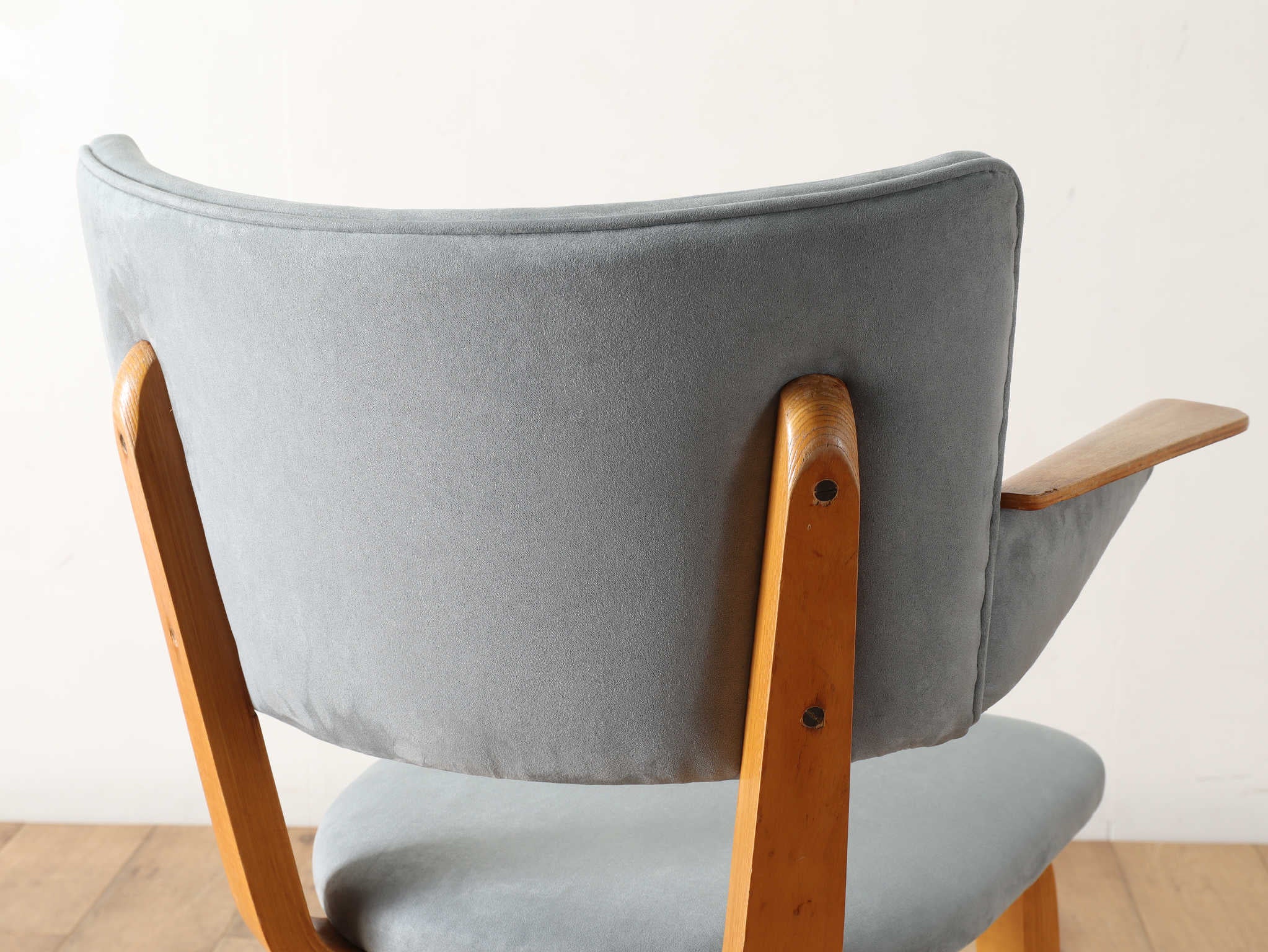 オランダのインテリアデザイナー兼プロダクトデザイナー,Cor Alonsによりデザインされたチェアです。成型合板を使用した構造が彼のアイコン的なデザインを表現しており、どこか素朴さがありながらも実用性に富んだキャラクター性溢れるチェアに仕上がっております。特に、パネル上の板を設置したアーム部分はなんとも可愛らしい印象であり、大袈裟なイージーチェアには劣るとも、安楽性も十分に備えられております。テーブルに合わせた際も、場所を取らず、省スペース化を考えられた機能性もあり、末永くご愛用頂ける事でしょう。